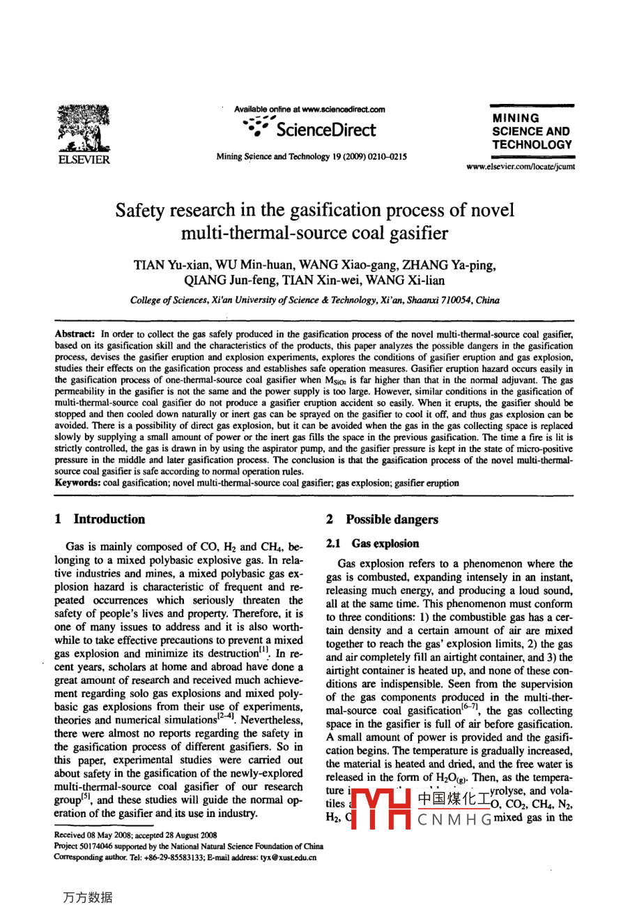 Availableonlineatwww.sciencedirectcomMINING°° ScienceDirectSCIENCE ANDTECHNOLOGYELSEVIERMining Science and Technology 19(2009)0210-0215www.elseviercom/locate/jcumtSafety research in the gasification process of novelmulti-thermal-source coal gasifierTIAN Yu-xian, WU Min-huan, WANG Xiao-gang, ZHANG Ya-ping,QIANG Jun-feng, tiaN Xin-wei, WANG Xi-lianCollege of Sciences, Xi' an University of Science Technology, Xi'an, Shaanxi 710054, ChinaAbstract: In order to collect the gas safely produced in the gasification process of the novel multi thermal-source coal gasifier,based on its gasification skill and the characteristics of the products, this paper analyzes the possible dangers in the gasificationprocess, devises the gasifier eruption and explosion experiments, explores the conditions of gasifier eruption and gas explosion,studies their effects on the gasification process and establishes safe operation measures. Gasifier eruption hazard occurs easily inthe gasification process of one-thermal-source coal gasifier when Msio is far higher than that in the normal adjuvant. the gaspermeability in the gasifier is not the same and the power supply is too large. However, similar conditions in the gasification ofmulti-thermal-source coal gasifier do not produce a gasifier eruption accident so easily. When it erupts, the gasifier shouldstopped and then cooled down naturally or inert gas can be sprayed on the gasifier to cool it off, and thus gas explosion can bevoided. There is a possibility of direct gas explosion, but it can be avoided when the gas in the gas collecting space is replacedslowly by supplying a small amount of power or the inert gas fills the space in the previous gasification. The time a fire is lit isstrictly controlled, the gas is drawn in by using the aspirator pump, and the gasifier pressure is kept in the state of micro-positivepressure in the middle and later gasification process. The conclusion is that the gasification process of the novel multi-thermal-source coal gasifier is safe according to normal operation rulesKeywords: coal gasification; novel multi-thermal-source coal gasifier gas explosion; gasifier eruption1 Introduction2 Possible dangersGas is mainly composed of CO, H2 and CH be- 2.1 Gas explosionlonging to a mixed polybasic explosive gas. In rela- Gas explosion refers to a phenomenon where thetive industries and mines, a mixed polybasic gas ex- gas is combusted, expanding intensely in an instant,plosion hazard is characteristic of frequent and rereleasing much energy, and producing a loud sound,peated occurrences which seriously threaten theall at the same time. This phenomenon must conformsafety of people's lives and property. Therefore, it is to three conditions: 1)the combustible gas has a cer-one of many issues to address and it is also worth- tain density and a certain amount of air are mixedwhile to take effective precautions to prevent a mixedgas explosion and minimize its destruction" In re- and air completely fill an airtight container, and 3)thecent years, scholars at home and abroad have done a airtight container is heated up, and none of these con-great amount of research and received much achieve-ditions are indispensible. Seen from the supervisionment regarding solo gas explosions and mixed polyof the gas components produced in the multi-therbasic gas explosions from their use of experimentmal-source coal gasification -, the gas collectingtheories and numerical simulations 24). Nevertheless, space in the gasifier is full of air before gasification.there were almost no reports regarding the safety in a small amount of power is provided and the gasifi-the gasification process of different gasifiers. So in cation begins. The temperature is gradually increased,this paper, experimental studies were carried outthe material is heated and dried, and the free water isabout safety in the gasification of the newly-explored released in the form of H2Oug. Then, as the temperamulti-thermal-source coal gasifier of our research turegroup5, and these studies will guide the normal optilesH中國煤化工 e, and vola-O, CO, CH4, N2,ration of the gasifier and its use in industCNMHGmixed gas in theroject 50174046 supported by the National Natural Science Foundation of ChinaCorresponding author. Tel: +86-29-85583133: E-mail address: tyx@xust.edu.nTIAN Yu-xian et alSafety research in the gasification process of novel multi-thermal-source coal gasifierspace is air, H2O(g) CO, CO2, CH4, N2, H2, O2 and anyone. Therefore, an experiment about gasifierNH3, whose main components are CO, N2 and O2, eruption in a multi-thermal-source coal gasifier wawith H in a smaller amount, and an even smaller devised specifically to explore the conditions of gasiamount of CH4. Then as time progresses during gasi- fier eruption and their effects on the whole gasificafication, a portion of air is removed, a portion of tioncombustible gas is increased, and the gas produced inthe gasification replaces the air a little at a time. Since 3 Gasifier eruption experimentCO. H2, CH4 are combustible and explosive gases,and their explosion limits(percent by volume)in the 3.1 Experimental planair are I2.5%-76%,8.27%~68.8%and6.3%~12.8%,respectively, even a little carelessness would cause aThe 20% fine quartz sand was added to the quartzwith the graininess of 0-8 mm and the proportion ofBecause the gas produced in the lab is released di- SiO was 98%o, and then it was blended with the anrectly outside the gasifier and burned up, the gasthracite, whose chemical components could be seenshould be collected in regular intervals to analyze its in Table 1. Its graininess was 0-4 mm according tocomponents. It is especially important that the fire beformula of Mc/Msio 0.61, among which Sionlit at just the right moment and the gasifier's pressure was far higher than that in normal adjuvant;and thenbe supervised, both of which should be watched and put into the gasifiers as shown in Fig. I after ball milldocumented carefu