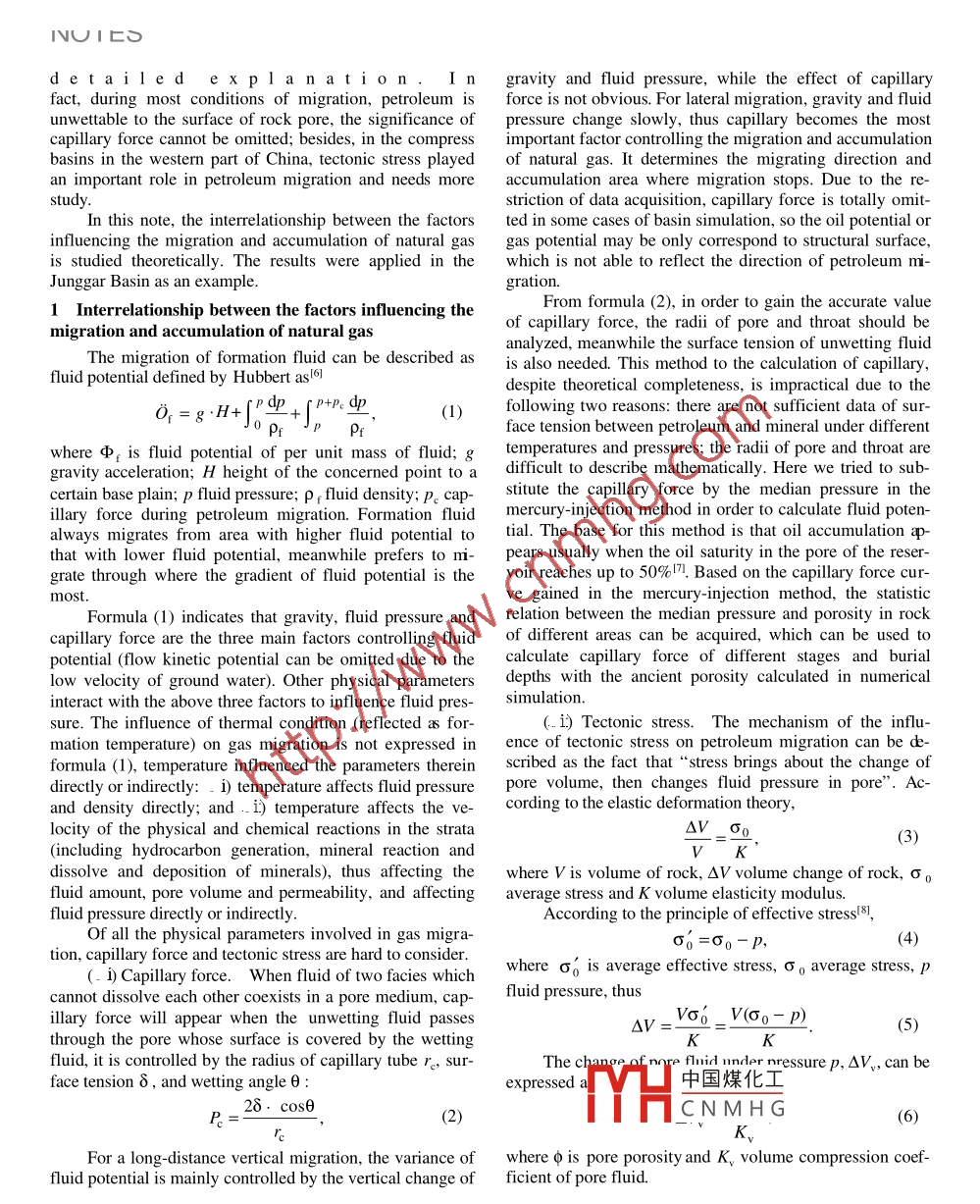 strating that the method of trend analysis of sediment grainsize is fit to the depositional area of fine-grained sedimentson large-scale continental shelf. Constant sampling intervaland suitable comparative distance(Der) are the key to leading grain size trend analysis to be reasonableInteraction of fluid dynamicAcknowledgements This work was supported by the Project of"China- factors in the migrationific Foundation of State Oceanic Administration( Grant No. 97401)and accumulation ofReferencesnatural gas1. Mclaren, P, An interpretation of trends in grain size measurements,Journal of Sedimentary Petrology, 1981, 51: 6112. Mclaren, P, Bowles, D, The effects of sediment transport on grainSONG Yan2, XIA Xinyu, WANG Zhenliang,WANG Yi%& HU Shengbiao53 SIze distribution, Journal of Sedimentary Petrology, 1985, 55: 457t sediment transport patterns inferred from 1. Research Institute of Petroleum Exploration and Development, Beijinggrain-size trends, based upon definition of"transport vectors"-reply,100083 China.Institute of Geochemistry, Chinese Academy of Sciences, Guiyan50002. China4. Gao, S, Collins, M, Analysis of grain size trends, for defining 3. Northwest University, Xi'an 710069, Chinasediment transport pathways in marine environments, Journal 4. Chinese University of Petroleum, Dongying 257062, China;Coastal Research, 1994. 10: 705. Institute of Geology, Chinese Academy of Sciences, Beijing 1000295. Gao Shu, Collins, M, Sediment grain size trend and marine sediment dynamics, Chinese Scientific Foundation(in Chinese), 1998 Correspondence should be addressed to Song Yan(e-mail: sya@ petro-12(4):2416. Cheng Peng, Gao Shu, Characteristics of grain size parameters and Abstract The migration of fluid petroleum gas, describecnet transport trend of seabed sediments in the North Yellow Sea, as fluid potential, depends only on gravity, fluid pressure con-Oceanologia et Limnologia Sinica(in Chinese), 2000, 31(6): 604trolled by depression and capillary force during tectonically7. Qin Yunshan, Zhao Yiyang, Chen Lirong et al., Geology of the stable period; but on tectonic stress during the tectonicallyYellow Sea (in Chinese). Beijing: China Ocean Press, 1989, 65- active period with severe compression. This method is appliedin the junggar Basin, showing that the migration of Jurassic8. Liu Minhou, Wu Shiying, Wang Yongi et al., Late Quaternary gas during Cretaceous and Eocene and the migration of perGeology of the Yellow Sea (in Chinese), Beijing: China Oceanmian gas from Jurassic till the presetermined byPres,1987,24-44;362-70capillary force and fluid pressure (including overpressure)whi-ch is controlled by depression; the migration of jurassic gas9. Zhao Yiyang, Li Fengye, Qin Chaoyang et al., Discussion on the from Eocene till the present and the migration of Permian gassource origins and genesis of the Central Southern Yellow Sea Mud, during Triassic are controlled by tectonic stress10.Park, Y.A., Origin and Distribution patterns of Muddy Deposits in Keywords: petroleum migration, fluid potential, tectonic stress, fluidthe Yellow Sea, Proceedings of the First International Conferencpressure, Junggar Basin.on Asian Marine Geology, Beijing: China Ocean Press, 1990, 335350.Petroleum migration is one of the most significant11. Shen Shunxi, Li Anchun, Yuan Wei, Discovery of the cold water problems in basin analysis and petroleum exploration. Thegyre and channel deposits in the southern Yellow Sea, Oceanologia research of fluid dynamic history is an efficient methodet Limnologia Sinica( in Chinese), 1993. 24(6): 563.study petroleum migration and accumulation l. .Natural12. Tang Yuxiang, Zou Emei, Lee Heungjae, Characteristics of circula- gas migration is influenced directly or indirectly by thetion in the South Yellow Sea, Acta Oceanologia Sinica (in Chinese), following physical conditions of fluid and solid in the strata2000,22(1):1the buoyancy of hydrocarbon, formation water kinetic po13. Hu, D. X. Some striking features of circulation in Huanghai Sea tential, capillary forces, fluid pressure, tectonic stress andd East China Sea, Oceanology of China Sea, 1994, 1: 27elys). Mathematical and physical simulations were applied(Received February 21, 2002) in petroleum migration and accumulation study consideringsome of the above physical parameters in some basins 4.51However中國煤化工rbon buoyancy andfluid pressisSure brougCN MH Grocarbon generationduring depression) are considered in detail while the othertwo important factors of tectonic stress and capillary forceare usually omitted. The interaction of these factors lacksChine丹與數(shù)據(jù)?l∥ tin Vol47No14l?0021207de t ailed eI n gravity and fluid pressure, while the effect of capillaryfact, during most conditions of migration, petroleum is force is not obvious. For lateral migration, gravity and fluidunwettable to the surface of rock pore, the significance of pressure change slowly, thus capillary becomes the mostcapillary force cannot be omitted; besides, in the compress important factor controlling the migration and accumulationbasins in the western part of China, tectonic stress played of natural gas. It determines the migrating direction andan important role in petroleum migration and needs more accumulation area where migration stops. Due to the restriction of data acquisition, capillary force is totally omit-In this note, the interrelationship between the factors ted in some cases of basin simulation, so the oil potential orinfluencing the migration and accumulation of natural gas gas potential may be only correspond to structural surface,is studied theoretically. The results were applied in the which is not able to reflect the direction of petroleum miJunggar Basin as an examplegrationInterrelationship between the factors influencing theFrom formula(2), in order to gain the accurate valuemigration and accumulation of natural gasof capillary force, the radii of pore and throat should beanalyzed, meanwhile the surface tension of unw