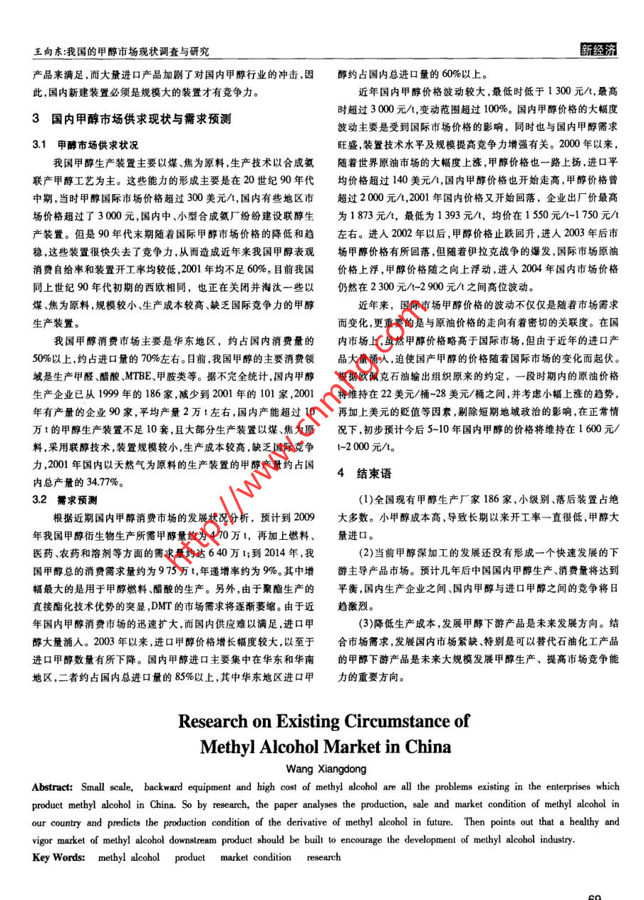 科學之友Friend of Science Amateurs2005年12月B我國的甲醇市場現(xiàn)狀調(diào)查與研究王向東(河曲縣地產(chǎn)開發(fā)公司山西忻州 034000)摘要通過調(diào)查研究分析了國內(nèi)甲醇的生產(chǎn)、銷售及市場現(xiàn)狀,指出我國甲醇的生產(chǎn)企業(yè)現(xiàn)狀是級別小、裝置落后、甲醇成本高,并預測未來我國甲醇衍生物生產(chǎn)狀況,提出我國應形成一個健康有活力的甲醇下游產(chǎn)品市場才能促進甲醇產(chǎn)業(yè)的發(fā)展。關鍵詞甲醇生產(chǎn)市場現(xiàn)狀調(diào)查中團分類號:TQ351.27*4文獻標識碼:A文章編號:1000 -8136(2005)12- 0068-0210/年。甲醇產(chǎn)量440.6t,裝置開工率約78.7%。 消費量573.2t,自1概述給率76.9%。進口甲醇135.91,進口量占國內(nèi)總消費量的23.7%。甲醇既是重要的化工產(chǎn)品及化工原料,又是未來的清潔能由表1可見,國內(nèi)甲醇裝置總能力較大,但開工率嚴重不源之一。作為化工的關鍵產(chǎn)品,甲醇是由天然氣或煤炭生產(chǎn)其他1992-2004年國內(nèi)甲醇市場情況表04化工產(chǎn)品或合成燃料的最佳途徑,其重要性不言而喻。在世界基年份能力產(chǎn)量開工率1%礎有機化工原料中,甲醇消費量僅次于乙烯、丙烯和苯而居第四位。1992106.587.181.78甲醇廣泛用于生產(chǎn)塑料、合成纖維、合成橡膠、染料、涂料、1993118.188.6香料、醫(yī)藥和農(nóng)藥等。目前甲醇主要下游產(chǎn)品有甲醛、醋酸、甲基1994130106.9682.28叔丁基醚(MTBE)、甲胺類、氯甲烷類、對苯二甲酸二甲酯、甲基1995160113.4870.93丙烯酸甲酯、二甲醚等,上述產(chǎn)品又可生成各自的衍生物,由甲醇出發(fā)生產(chǎn)的化工產(chǎn)品達數(shù)百種。甲醇還是一種重要的有機溶1996294141.1948.02劑,在合成燃料和汽油添加劑方面其消費量也很大。甲醇在許多1997334.6174.3351.1潛在領城有著廣闊的應用前景:甲醇可以作為清潔燃料代替汽1998359.9148.8741.36油或與汽油摻混使用;甲醇燃料電池即將投人商業(yè)化運行;用甲368.4179.37醇制取微生物蛋白作為飼料乃至食品添加劑,國外已有工業(yè)化裝置;甲醇制汽油及甲醇制烯烴技術(shù)都有所突破??梢娂状加猛?70198.69 .53.7相當廣泛。2001206.4855.812國內(nèi)甲醇生產(chǎn)與消費現(xiàn)狀200238621153.63國內(nèi)甲醇生產(chǎn)起始于20世紀60年代,以小甲醇起家。到602003298.8771.16年代末,甲醇的生產(chǎn)能力僅為1x10V年左右。80年代,國內(nèi)甲醇2004550440.680.00生產(chǎn)得到了進-步發(fā)展,到80年代末,甲醇的生產(chǎn)能力已達到86x10/年。進入90年代,國內(nèi)甲醇生產(chǎn)得到了較大的發(fā)展,足,1998年開工率僅為41.36% ,2000年市場形勢有所好轉(zhuǎn),開工2004年全國生產(chǎn)能力已達5 60x10V年。率上升到53.7% ,2001年上升到55.8% ,2003年隨著國內(nèi)產(chǎn)能增目前,國內(nèi)煤制甲醇生產(chǎn)裝置近200套,規(guī)模在20x104V年加,開工率又回升到71.2% ,2004年達到了78%。這主要是由于的僅兩套。10x10/年級規(guī)模的有9套。4U/年-10x10/年(不含國內(nèi)聯(lián)醇裝 置能力約占總能力的60%,多數(shù)聯(lián)醇裝置規(guī)模小、并10x10/年)的有22套。其余小甲醇均為聯(lián)醇裝置。在1998 年之且受到主產(chǎn)品化肥銷售的影響導致原料成本高、缺乏競爭力,造前,受國外產(chǎn)品的沖擊,我國甲醇裝置的開工率不斷下降。近年成開工嚴重不足。隨著2003年國內(nèi)甲醇消費市場的快速增長和來,隨著國內(nèi)市場需求的快速增長和產(chǎn)品價格的高位增長,國內(nèi)化肥市場的好轉(zhuǎn),小聯(lián)醇裝置的開工率有所提高。裝置的開工率逐漸回升,到2003年已經(jīng)突破78%。但是由于國內(nèi)小聯(lián)醇裝置規(guī)模小、競爭力不足、造成裝置開2004年,全國甲醇生產(chǎn)企業(yè)近200家,總生產(chǎn)能力560x工率低 ,國內(nèi)甲醇產(chǎn)品供不應求,有相當一部分甲醇市場儒進口68-王向東:我國的甲醇市場現(xiàn)狀調(diào)查與研究新經(jīng)濟.產(chǎn)品來滿足.而大量進口產(chǎn)品加劇了對國內(nèi)甲醇行業(yè)的沖擊,因醇約占國內(nèi)總進口量的60%以上。此,國內(nèi)新建裝置必須是規(guī)模大的裝置才有競爭力。近年國內(nèi)甲醇價格波動較大,最低時低于1 300元/,最高時超過3000元/t,變動范圍超過100%。國內(nèi)甲醇價格的大幅度3國內(nèi)甲醇市場供求現(xiàn)狀與需求預測波動主要是受到國際市場價格的影響,同時也與國內(nèi)甲醇需求3.1甲醇 市場供求狀況旺盛,裝置技術(shù)水平及規(guī)模提高競爭力增強有關。2000年以來,我國甲醇生產(chǎn)裝置主要以煤、焦為原料,生產(chǎn)技術(shù)以合成氨隨著世界原油市場的大幅度上漲,甲醇價格也一路上揚,進口平聯(lián)產(chǎn)甲醇工藝為主。這些能力的形成主要是在20世紀90年代均價格超過140美元/,國內(nèi)甲醇價格也開始走高,甲醇價格曾中期,當時甲醇國際市場價格超過300美元/t,國內(nèi)有些地區(qū)市超過2000元/t,2001年國內(nèi)價格又開始回落,企業(yè)出廠價最高場價格超過了3000元,國內(nèi)中、小型合成氨廠紛紛建設聯(lián)醇生為1873元/t,最低為1393元/t,均價在1 550元/~1750元/t產(chǎn)裝置。但是90年代末期隨著國際甲醇市場價格的降低和趨左右。進入2002年以后,甲醇價格止跌回升,進人2003年后市穩(wěn),這些裝置很快失去了競爭力,從而造成近年來我國甲醇表觀場甲醇價格有所回落,但