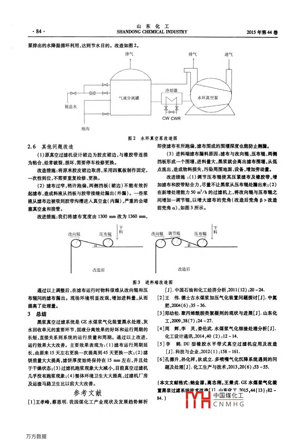 山東化工SHANDONG CHEMICAL INDUSTRY2015年第44卷CE水煤漿氣化裝置黑漿過(guò)濾系統(tǒng)技術(shù)改造鮑金源,高志剛,王秉貞(神華包頭煤化工有限責(zé)任公司,內(nèi)蒙古包頭014010)擒要:文章針對(duì)大型水煤漿氣化帶來(lái)的黑漿真空過(guò)濾系統(tǒng)問(wèn)題詳細(xì)分析通過(guò)采取相應(yīng)技術(shù)改造優(yōu)化操作方式效果良好關(guān)鍵詞:黑漿;過(guò)濾;改造中圖分類號(hào):TQO51文獻(xiàn)標(biāo)識(shí)碼:B文章編號(hào):1008-021X(2015)13-0082-03GE Water Coal Slurry Gasification Plant Black Slurry Filtration TechnologyTransformation SystemBao Jinyuan, Gao Zhigang, Wang BingzhenShenhua Baotou Coal Chemical Co, Ltd, Baotou 014010, China)Abstract: A detailed analysis of the black slurry vacuum filtration system, aiming at the large coal water slurry gasificationthrough the corresponding technical transformation, operation optimization, the effect is goodKey words: black slurry; vacuum filtration; technical transformation我國(guó)能源結(jié)構(gòu)的特點(diǎn)是富煤少油貧氣,發(fā)展煤化工事統(tǒng)經(jīng)過(guò)四級(jí)閃蒸降溫濃縮后在靜態(tài)混合器中與絮凝劑業(yè),以煤為原料生產(chǎn)各類化工產(chǎn)品,是非石油路線生產(chǎn)替代混合后進(jìn)入沉降槽,上層較清灰水溢流至灰水槽返回系統(tǒng)循石油產(chǎn)品的一個(gè)有效途徑。煤氣化技術(shù)作為煤化工生產(chǎn)的環(huán)利用。黑水中的顆粒(黑漿)沉降至底部,通過(guò)泵送至真空龍頭裝置,其安、穩(wěn)、長(zhǎng)、滿、優(yōu)運(yùn)行是煤化工發(fā)展的基柱。GE過(guò)濾系統(tǒng)濾餅(細(xì)渣)外送至渣場(chǎng),分離出的較干凈的水返水煤漿氣化是國(guó)內(nèi)工業(yè)化較為成熟的煤氣化技術(shù)之一,該氣回系統(tǒng)循環(huán)利用。化技術(shù)在近年的運(yùn)行實(shí)踐中積累了豐富的經(jīng)驗(yàn)和教訓(xùn)2。1.2真空過(guò)濾機(jī)構(gòu)造但隨著生產(chǎn)規(guī)模的不斷擴(kuò)大,大規(guī)模GE水煤漿氣化又帶來(lái)黑漿真空過(guò)濾機(jī)是一種固液分離設(shè)備,在氣化裝置中了另一些突出問(wèn)題。在國(guó)內(nèi)某大型煤制烯烴項(xiàng)目中煤氣化用來(lái)處理澄降槽底部排出的含固5%-20%的黑水是渣水裝置設(shè)計(jì)5開2備共7臺(tái)GE氣化爐,單爐投煤量為1500∽處理的關(guān)鍵設(shè)備d高負(fù)荷運(yùn)行的同時(shí),黑漿過(guò)濾處理系統(tǒng)成為了CE水煤漿DU型橡膠水平帶式真空過(guò)濾機(jī)由主機(jī)、管路系統(tǒng)和氣化運(yùn)行穩(wěn)定的關(guān)鍵因素之一。該裝置在運(yùn)行初期數(shù)次因電控系統(tǒng)組成。其中過(guò)濾機(jī)主機(jī)由機(jī)架組件濾布糾偏裝黑漿過(guò)濾系統(tǒng)故障致使處理不掉黑漿排入研磨水池經(jīng)過(guò)置、壓布輥布料裝置、立輥隔板裝置、真空裝置濾布洗滌靜止沉降后送人黑水沉降槽如此形成惡性循環(huán)導(dǎo)致沉降再生裝置、橡膠帶、濾布、驅(qū)動(dòng)輥組件、從動(dòng)輥組件、驅(qū)動(dòng)裝槽攪拌器扭矩過(guò)大聯(lián)軸節(jié)螺栓斷裂嚴(yán)重制約滿負(fù)荷運(yùn)行。置濾餅淋洗裝置濾布張緊裝置卸料裝置各類托輥排氣1黑漿真空過(guò)濾系統(tǒng)簡(jiǎn)介罩、氣水分離器等組成,主要用碳鋼或不銹鋼、SBR橡膠、聚1.1流程簡(jiǎn)介丙稀和超高分子量聚乙烯等各類材料制造,并采取相應(yīng)的防GE水煤漿氣化將氣化爐黑水和洗滌塔黑水排至閃蒸系腐措施。各主要零部件位置示意圖見(jiàn)圖1。加料裝置洗液槽c800c卸料輥從動(dòng)輥真空箱刮刀沖洗管托輥張緊輥糾偏輥過(guò)濾帶改向輥圖1真空過(guò)濾機(jī)結(jié)構(gòu)圖中國(guó)煤化工CNMHG收稿日期:2015-04-26作者簡(jiǎn)介:鮑金源(1988-),安徽廬江人,助理工程師,主要從事水煤漿氣化技術(shù)。第13期鮑金源等:CE水煤漿氣化裝置黑漿過(guò)濾系統(tǒng)技術(shù)改造83·2存在問(wèn)題及技術(shù)改造實(shí)際處理量只有15m3/h,實(shí)際生產(chǎn)中每個(gè)系列產(chǎn)生約122.1處理能力不足m3/h黑漿,共60m3/h,黑漿中含固量20%左右。裝置原設(shè)計(jì)3臺(tái)真空過(guò)濾機(jī)2開1備,單臺(tái)有效過(guò)濾面國(guó)內(nèi)同類型氣化裝置真空過(guò)濾機(jī)使用情況見(jiàn)表1。積25m3,有效過(guò)濾寬度1300mm,最大處理黑水35m3/h,但表1國(guó)內(nèi)同類型氣化裝置真空過(guò)濾機(jī)使用情況表煤種灰有效過(guò)濾設(shè)計(jì)處理能力m3/h)過(guò)濾機(jī)臺(tái)數(shù)實(shí)際處理量/化爐負(fù)荷/過(guò)濾機(jī)能力含量/%面積/m3(m3/h)(m3/h)浩良河化肥廠31*24-161開1備31◆225=1:0.4中石化南化1開1備滿足生產(chǎn)65.7/13.8=1:0.21新奧10-131開1備滿足生產(chǎn)86x236=1:0.21久泰82*32開1備25*282×3/(25×2)=1:0.2伊泰1開1備滿足生產(chǎn)55x2/16=1:0.145本裝量原設(shè)計(jì)2開1備85x5/(15×2)=1:0.071新2舊開本裝置新增后1新1舊備50+15·285·5/(50+15*2)=1改進(jìn)措施新增2臺(tái)處理能力在50m3/h的過(guò)濾機(jī)新機(jī)附著在過(guò)濾機(jī)濾布的孔隙中,油污在濾布空隙上形成油過(guò)濾機(jī)投人運(yùn)行后,采取1新2舊運(yùn)行1新1舊備用沉降過(guò)膜堵塞濾孔,降低水的通過(guò)性影響濾布的再生。濾系統(tǒng)恢復(fù)正常。綜合各家運(yùn)行數(shù)據(jù)可以看出CE水煤漿氣改進(jìn)措施:將真空過(guò)濾機(jī)產(chǎn)生的濾液輸送到沉降槽