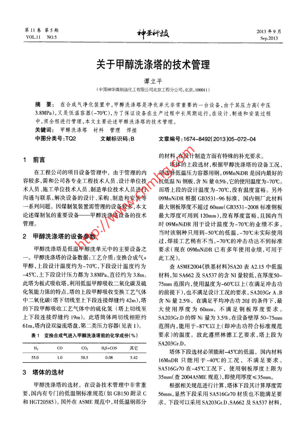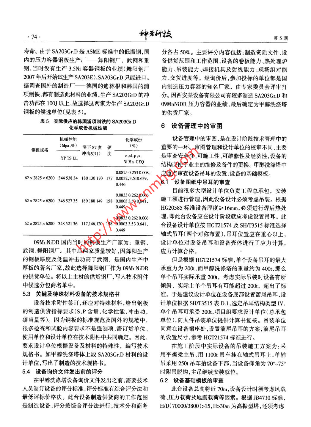 第11卷第5期神華科技2013年9月.VOL1I NO.5Sep.2013關(guān)于甲醇洗滌塔的技術(shù)管理譚立平(中國(guó)神華煤制油化工有限公司北京工程分公司,北京, 10011)摘要: 在合成氣凈化裝置中,甲醇洗滌塔是凈化單元非常重要的一臺(tái)設(shè)備,由于其壓力高(中壓 .3.8MPa),又是低溫容器(-70C),為了保證設(shè)備在生產(chǎn)過(guò)程中長(zhǎng)周期運(yùn)行,在設(shè)計(jì)、制造和安裝過(guò)程中,須全程進(jìn)行管理,本文主要論述甲醇洗滌塔的技術(shù)管理。關(guān)鍵詞:甲醇洗滌塔材料管理焊接中圖分類(lèi)號(hào):TQ2文獻(xiàn)標(biāo)識(shí)碼:B文章編號(hào):1674-8492(2013 )05- -072- -04的材料,在設(shè)計(jì)制造方面有特殊的補(bǔ)充要求。1前言塔體的上段選材,根據(jù)甲醇洗滌塔的設(shè)備工況,在工程公司的項(xiàng)目設(shè)備管理中,由于管理的內(nèi)須選擇低溫壓力容器用鋼。09MnNiDR是國(guó)內(nèi)最好的容較多,需和公司各專(zhuān)業(yè)工程技術(shù)人員、設(shè)計(jì)單位技抗低溫Ni鋼板,含Ni量0.5%,它的使用溫度為-70C。術(shù)人員施工單位技術(shù)人員、制造單位技術(shù)人員進(jìn)行而塔上段的設(shè)計(jì)溫度為-70C,沒(méi)有溫度富裕。另外溝通與聯(lián)系,解決設(shè)備的設(shè)計(jì)、采購(gòu)、.制造和安裝等09MnNiDR根據(jù)GB3531-96標(biāo)準(zhǔn),國(guó)內(nèi)鋼廠此材料一系列問(wèn)題。因煤制氫裝置需管理的設(shè)備較多,本文最大鋼板厚度不超過(guò)60mm( GB3531- -2008標(biāo)準(zhǔn)鋼板論述煤制氫的重要設(shè)備一甲 醇洗滌塔設(shè)備的技術(shù)最大厚度可用到120mm),沒(méi)有厚度富裕,且國(guó)內(nèi)當(dāng)管理。時(shí)09MnNiDR用于設(shè)計(jì)溫度為-70C的業(yè)績(jī)不多。當(dāng)時(shí)該鋼種只用到-50C的低溫,-70C未實(shí)際使用2甲醇洗滌塔的設(shè)備參數(shù)過(guò),焊接工藝稍有不當(dāng),-70C的沖擊功達(dá)不到標(biāo)準(zhǔn)甲醇洗滌塔是低溫甲醇洗單元中的主要設(shè)備之要求(現(xiàn)在09MnNiDR已有多年使用業(yè)績(jī),可用于一。甲醇洗滌塔的設(shè)備數(shù)據(jù):工藝介質(zhì):變換合成氣+此工況)。甲醇,上段設(shè)計(jì)溫度約為- -709C,下段設(shè)計(jì)溫度約為查ASME2004《鐵基材料》SA20表A2.15中低溫-45C,上下段設(shè)計(jì)壓力都為3.8MPa,直徑約為3.8m。材料,知SA662及SA537的含NI量較低,在厚度50~此塔為板式吸收塔,利用低溫甲醇吸收二氧化碳及硫75mm范圍內(nèi),使用溫度為-60以上(在滿足沖擊功化氫能力強(qiáng)的特點(diǎn),塔的上段甲醇吸收變換工藝氣體的前提下),也不滿足設(shè)計(jì)工況的要求。SA203Gr A、B中二氧化碳(塔下切線至上下段連接焊縫約42m),塔含Ni量2.5%,在滿足平均沖擊功20J的條件下,最的下段甲醇吸收工藝氣體中的硫化氫(塔上切線至.大使用厚度為60mm,不滿足鋼板厚度要求。上下段連接焊縫約19m)。此塔筒體兩切線相距約SA203Gr.D的焊Ni量為3.5% ,在設(shè)備壁厚50~75mm61m,塔內(nèi)設(shè)雙溢流塔盤(pán),第二類(lèi)壓力容器(見(jiàn)表1)。范圍內(nèi),能用于-879C以上(即沖擊功符合標(biāo)準(zhǔn)規(guī)范表1變換合成 氣進(jìn)入甲醇洗滌塔前的化學(xué)成份( % )要求)的溫度。故此遵照林德工藝要求,塔上段為SA203Gr.D。HCCO2HS+COS塔體下段選材必須能耐-45C的低溫,國(guó)內(nèi)材料55.0138.50.08 .5.4216MnDR只能用于-40C的工況,不滿足要求。SA516Gr70在-45C工況下,使用鋼板厚度上限為3塔體的選材35mm(查2004ASME規(guī)范),即使用厚度≤35mm。甲醇洗滌塔的選材,在設(shè)備技術(shù)管理中非常重根據(jù)相關(guān)規(guī)范進(jìn)行計(jì)算,塔體下段其計(jì)算厚度需要,國(guó)內(nèi)有專(zhuān)門(mén)的低溫鋼標(biāo)準(zhǔn)規(guī)范(如GB150附錄C56mm,顯然下段采用SA516Gr70材質(zhì)也不能滿足要.和HGT20585)。國(guó)外在ASME規(guī)范中,對(duì)低溫鋼部分求。下段可以采用SA203Gr.D .SA662及SA537材料,.●74.神蕭科技第5期壽命。由于SA203Gr.D是ASME標(biāo)準(zhǔn)中的低溫鋼,國(guó)分各占50%。主要評(píng)分內(nèi)容包括:制造資質(zhì)文件、設(shè)內(nèi)的壓力容器鋼板生產(chǎn)廠一舞陽(yáng)鋼廠 、武鋼和重備供貨范圍和工作范圍、設(shè)備的卷板能力、熱處理爐鋼,當(dāng)時(shí)沒(méi)有生產(chǎn)3.5Ni容器鋼板的業(yè)績(jī)(舞陽(yáng)鋼廠能力、吊裝能力、焊接機(jī)具及射線能力、現(xiàn)場(chǎng)組對(duì)能2007年后開(kāi)始試生產(chǎn)SA203E),SA203Gr:D只能進(jìn)口。力、交貨進(jìn)度等。經(jīng)詢價(jià)后,參加投標(biāo)的單位都是國(guó)據(jù)調(diào)查國(guó)外的制造廠一德國(guó)的迪林根和韓國(guó)的浦內(nèi)制造壓力容器的知名廠家,由專(zhuān)家委員會(huì)評(píng)審打項(xiàng)制鐵,都有制造此材料的業(yè)績(jī),生產(chǎn)SA203GrD的沖分。因西安某設(shè)備有限公司有較多制造SA203Gr.D和擊功都在100J以上,故選擇這兩家為生產(chǎn)SA203Gr.D09MnNiDR壓力容器的業(yè)績(jī),最后確定為甲醇洗滌塔鋼板的候選單位(見(jiàn)表5)。.的供貨廠家。表5實(shí)際供應(yīng)的韓國(guó)浦項(xiàng) 制鐵的SA203Gr.D化學(xué)成份機(jī)械性能6設(shè)備管理 中的審圖機(jī)械性能化學(xué)成份設(shè)備管理中的審圖,是在設(shè)計(jì)階段技術(shù)管理中的Mpa,%)零下87度硬(%)重要的一環(huán)。審圖管理和設(shè)計(jì)單位的校