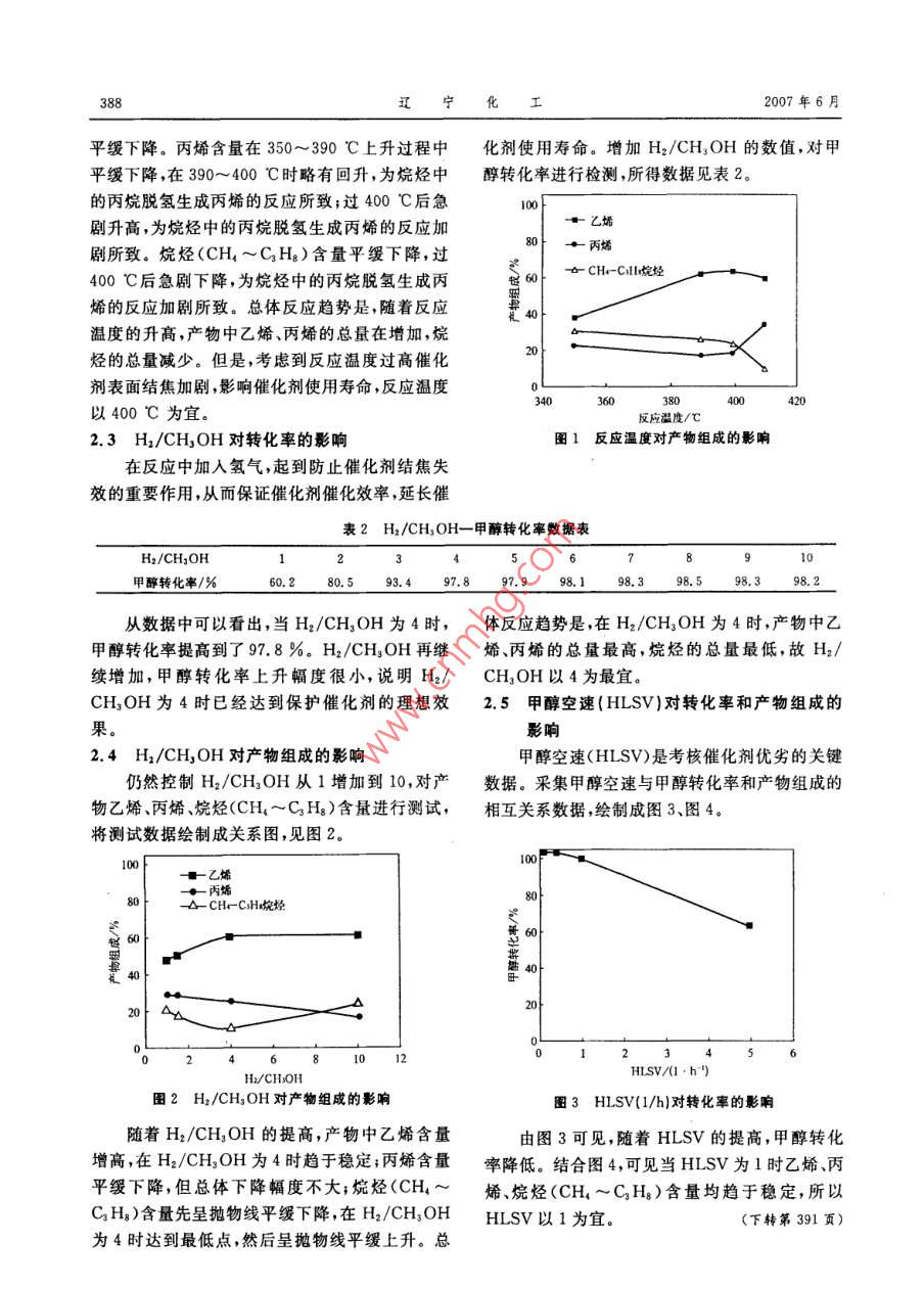 第36卷第6期遼,寧化..工Vol. 36,No. 62007年6月Liaoning Chemical IndustryJune,2007一種低碳烯烴的合成方法薛綠林,李文麾(1.遼寧省產(chǎn)品質(zhì)量監(jiān)督檢驗院,遼寧沈陽10004; 2. 沈陽山高科技有限公司,遼寧沈陽10000)摘要:以甲醇為原料合成低碳烯烴類物質(zhì)提供了-條不依賴石油、天然氣合成乙烯、丙烯的極.具戰(zhàn)略價值和商業(yè)價值的重要的途徑。對使用非均相催化劑(SAC-09)、以甲醇為原料制取低碳烯烴的工藝過程進(jìn)行了研究,并得到最佳工藝條件:反應(yīng)溫度為400 C ,H2/CHzOH=4,HLSV =1.關(guān)鍵詞:甲醇乙烯;丙烯;低碳烯烴中圖分類號: TQ 221.21文獻(xiàn)標(biāo)識碼: A文章編號: 1004 - 0935(2007)06 - 0387 -03低碳烯烴類物質(zhì)(如乙烯、丙烯等)是當(dāng)代化2結(jié)果數(shù)據(jù)與分析學(xué)工業(yè)的重要基本原料。隨著石油、天然氣資源的日益枯竭,依賴于石油、天然氣為原料的傳統(tǒng)方2.1 反應(yīng)溫度對轉(zhuǎn)化率的影響法合成的低碳烯烴越來越受到來自產(chǎn)品產(chǎn)業(yè)鏈安反應(yīng)溫度設(shè)定在350~410 C之間,溫度每升全的嚴(yán)重威脅。煤制甲醇和化肥工業(yè)的副產(chǎn)品甲高10 C對甲醇轉(zhuǎn)化率測定1次。反應(yīng)溫度與甲醇,具有非常豐富的原料來源。由甲醇高效率地醇轉(zhuǎn)化率的數(shù)據(jù)關(guān)系表1。制取低碳烯烴,為乙烯、丙烯的工業(yè)化生產(chǎn)開辟出表1反應(yīng)溫度一 甲醇轉(zhuǎn)化率數(shù)據(jù)表一條重要途徑,將極大地緩解石油、天然氣資源問反應(yīng)溫度/C350 360 370 380 390 400 410甲醇轉(zhuǎn)化事/% 20.5 40.0 58.0 70.0 85.2 98.5 98.8題帶來的原料危機(jī)。本文采用甲醇在非均相催化劑(SAC-09)的存在下合成了低碳烯烴(乙烯、丙從數(shù)據(jù)中可以看出,甲醇轉(zhuǎn)化率隨著反應(yīng)溫烯) ,同時對工藝條件進(jìn)行了研究。度的升高而大幅度升高,直至400C時出現(xiàn)拐點(diǎn),1實(shí)驗部分400 C后趨于平緩穩(wěn)定。本反應(yīng)為雙向可逆反應(yīng),在400C時基本達(dá)到平衡狀態(tài)。1.1催化劑2.2反應(yīng)溫度對產(chǎn)物組成的影響沈陽山高科技有限公司非均相催化劑,型號:本反應(yīng)的生成物有乙烯、丙烯、烷烴(CH,~SAC- 09 ,填充量5 mL。Cs H)和重碳組分,其中乙烯、丙烯和烷烴的含量1.2 反應(yīng)器在97%以上,重碳組分可以作為焦油殘渣,在工全自動精密反應(yīng)器,直徑6 mm,多點(diǎn)溫度自.藝中不予考慮。動控制,反應(yīng)物物料甲醇由微量進(jìn)樣泵進(jìn)行控制反應(yīng)溫度設(shè)定在350~410C之間,溫度每升進(jìn)料,物料氫氣由氫氣流量控制器控制進(jìn)料,反應(yīng)高10 C對乙烯、丙烯、烷烴(CH,~C,Hz)測定1系統(tǒng)壓力控制在1. 0 MPa.次。將取得的數(shù)據(jù)繪制成關(guān)系圖,反應(yīng)溫度與產(chǎn)1.3 檢測儀器.物組成關(guān)系見圖1.美國安捷倫氣相色譜儀,型號6890N。隨著反應(yīng)溫度的升高,產(chǎn)物中乙烯含量增高,1.4數(shù)據(jù)處理過390 C后增高平緩,至400 C達(dá)到最高點(diǎn),然后安捷倫化學(xué)工作站采集分析,校正后用面積2007-03-09歸一化法計算。作者簡介:薛綠林(1964-),男,高級工程師。388寧化2007年6月平緩下降。丙烯含量在350~390 C上升過程中化劑使用壽命。增加H2/CH3OH的數(shù)值,對甲平緩下降,在390~400 C時略有回升,為烷烴中.醇轉(zhuǎn)化率進(jìn)行檢測,所得數(shù)據(jù)見表2。的丙烷脫氫生成丙烯的反應(yīng)所致;過400 C后急100一乙烯劇升高,為烷烴中的丙烷脫氫生成丙烯的反應(yīng)加30f +丙烯劇所致。烷烴(CH,~CjHg)含量平緩下降,過400 C后急劇下降,為烷烴中的丙烷脫氫生成丙母6古CH-CHIr烷烴烯的反應(yīng)加劇所致??傮w反應(yīng)趨勢是,隨著反應(yīng)溫度的升高,產(chǎn)物中乙烯、丙烯的總量在增加,烷20烴的總量減少。但是,考慮到反應(yīng)溫度過高催化劑表面結(jié)焦加劇,影響催化劑使用壽命,反應(yīng)溫度34060380420以400C為宜。反應(yīng)溫度/C2.3 H2/CH,OH 對轉(zhuǎn)化率的影響圖1反應(yīng)溫度對產(chǎn)物組成的影響在反應(yīng)中加人氫氣,起到防止催化劑結(jié)焦失效的重要作用,從而保證催化劑催化效率,延長催表2 H2/CH,OH-甲 醇轉(zhuǎn)化率數(shù)據(jù)表H2/CHsOH2467891甲醇轉(zhuǎn)化率/%60. 280. 597. 897.998.198. 398.598.3從數(shù)據(jù)中可以看出,當(dāng)H2/CHzOH為4時,體反應(yīng)趨勢 是,在H2/CHzOH為4時,產(chǎn)物中乙甲醇轉(zhuǎn)化率提高到了97.8 %。H2/CHzOH再繼烯、丙烯的總量最高,烷烴的總量最低,故H2/續(xù)增加,甲醇轉(zhuǎn)化率上升幅度很小,說明H2/CH,OH以4為最宜。CH,OH為4時巳經(jīng)達(dá)到保護(hù)催化劑的理想效2.5甲醇空 速(HLSV)對轉(zhuǎn)化率和產(chǎn)物組成的果。影響2.4 H2/CH,OH 對產(chǎn)物組成的影響甲醇空速(HLSV)是考核催化劑優(yōu)劣的關(guān)鍵仍然控制H2/CH3OH從1增加到10,對產(chǎn)數(shù)據(jù)。采集甲醇空速與甲醇轉(zhuǎn)化率和產(chǎn)物組成的物乙烯、丙烯、烷烴(CH,~CHg)含量進(jìn)行測試,相互關(guān)系 數(shù)據(jù),繪制成圖3、圖4。將測試數(shù)據(jù)繪制成關(guān)系圖,見圖2。00 f+.乙烯十丙烯30}30 t- A- CH-CsH烷烴40 |20}一一。6810HLSV/(1.h")H2/CHoOH圖2 H2/CHsOH 對產(chǎn)物組成的影響圖3 HLSV(1/h)對轉(zhuǎn)化率的影響隨著H2/CHzOH的提高,產(chǎn)物中乙烯含量由圖3可見,隨著HLSV的提高,甲醇轉(zhuǎn)化增高,在H2/CH,OH為4時趨于