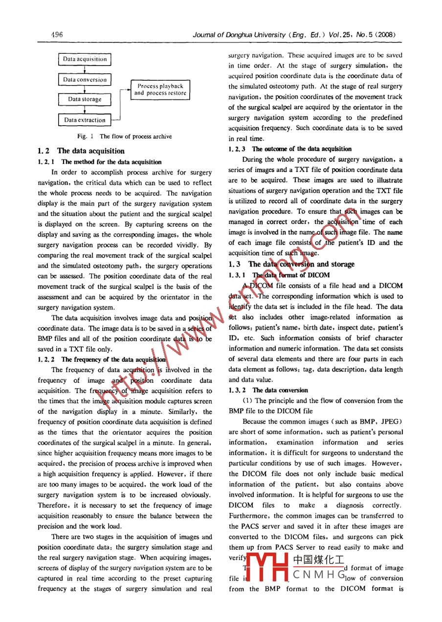 Joumal of Donghua University (Eng. Ed.) Vol. 25, No.5 (2008) 495Research about Process Archive of Computerized Surgery NavigationBased on PACSDENG Hong(鄧宏)" , CHEN Li(陳笠), CHEN Xiao-jun (陳曉軍), WANG Cheng-tao (王成燾)Institute of Mechanical and Pouer Engineering , Shanghai Jiaotong University, Shanghai 20030, ChinaAbstract: Since the process of the surgery navigation isand the relative position relationship between the surgicalan operation-sensitive process, it is important to recordscalpel and the surgery region; secondly, because theand archive the whole process. In this paper, some keyrefresh frequency of the video recording device is lowertechnologies are introduced to accomplish processthan that one of the display of the navigation system, it isarchive of computerized surgery navigation based on theimpossible to reproduce the real condition of thepicture archiving and communication system( PACS).navigation system and surgeon's operations in real time;Firstly, the images and track data are acquired by thefinally, since the video recording files can't be supportedscreen captured tool and the navigation software.by PACS or the hospital information system ( HIS),Secondly, these image and data files are converted tosurgeons aren't able to access PACS or HIS in bospital tothe digital imaging and communications in medicineread such files for evaluation.(DICOM) files supported by PACS and transferred intoAccording to the above deficiency and defect, somethe database in PACS. The process of surgerytechnologies for process archive are introduced in thisnavigation is recorded and archived. Finally, theoriginal data of process archive is acquired from PACS,paper. Firstly, by interfacing with the navigationand this data is used to play back and restore thesystem,the data acquisition module collects images andprocess of surgery navigation.position coordinate data from the procedure of surgeryKey words: process archive; computerized surgerynavigation in real time; secondly, these images andnarigatiom; PACS; process playback; process restoreordinate data are converted to the corresponding DICOMCLC umber: TP 391Document code: Afiles which can be supported by PACS in hospitals andArticle D: 1672 - 5220(2008)05 - 0495 - 0then transferred to PACS; finally, after finishingrecording the procedure of surgery navigation, thisprocedure can be replayed and restored according to theIntroductionabove images and ordinate data. The procedure ofsurgery navigation can be evaluated qualitatively anThe technology of computerized surgery navigation isquantitatively based on process archive of surgeryutilized to provide instructions for surgery operation tonavigation.surgeons and can be used to aid those surgeons who areshort of practical surgical experience to accomplish their1 The Flow of Process Archive and Its Keysurgeries and aid common surgeons to finish complicatedTechnologiessurgeries that require high precisionlr.However,during the course of surgery navigation, although surgery1.1 The flow of process archivenavigation system can be utilized to guide surgeonsThere are two stages in the flow of process archive.continuously, there is possibility for surgeons to takeThe first stage is to collect data from the procedure ofwrong operations to cause injury to the patient and lead tothe failure of the surgery. Therefore, it is of criticalsurgery navigation by using relevant hardware andclinical importance to record the whole surgery process insoftware of navigation system in real time, then thesereal time for evaluation of surgery process and failuredata are to be converted to the DICOM file anddiagnose in the future. The general method to recordsubsequently transferred to the PACS system. The secondsurgery process is video capture. This recording methodstage is to pick up the archived data from the PACSof surgery process has some deficiency and defect assystem and the procedure of surgery navigation is to befollows: firstly, video recording can't be used to preciselyreplayed and restored based on these data. The flow isdescribe the real movement track of the surgical sealpelillustr中國(guó)煤化工YHCNMHGReceived date: 2007-09 - 13* Correspondence should be addressed to DENG Hong, E-mail; denghongdh@126. com496Joumal of Donghua University (Eng. Ed.) Vol.25, No. 5 (2008)surgery navigation. These acquired images are to be siavedData acquisitionin time order. At the stage of surgery simulation, theData conversionacquired position coordinate data is the coordinate data ofProccss play backthe simulated osteotomy path. At the stage of real surgeryand process restoreData storagenavigation, the position coordinates of the movement trackof the surgical scalpel are acquired by the orientator in theData extractionsurgery navigation system according to the predefinedacquisition frequency. Such coordinate data is to be savedFig. 1 The flow of process archivein real time.1.2 The data acquisition1. 2.3 The outcome of the data acqulsition1.2. 1 The method for the data acquisitionDuring the whole procedure of surgery navigation, a .In order to accomplish process archive for surgeryseries of images and a TXT file of position coordinate datanavigation, the critical data which can be used to reflectare to be acquired. These images are used to ilustratethe whole process needs to be acquired. The navigationsituations of surgery navigation operation and the TXT filedisplay is the main part of the surgery navigation systemis utilized to record all of coordinate data in the surgeryand the situation about the patient and the surgical scalpelnavigation procedure. To ensure that such images can beis displayed on the screen. By capturing screens on themanaged in correct order, the acquisition time of eachdisplay and saving as the corresponding images, the wholeimage is involved in the name of such image file. The namesurgery navigation process can be recorded vividly. Byof each image file consists of the patient's ID and the