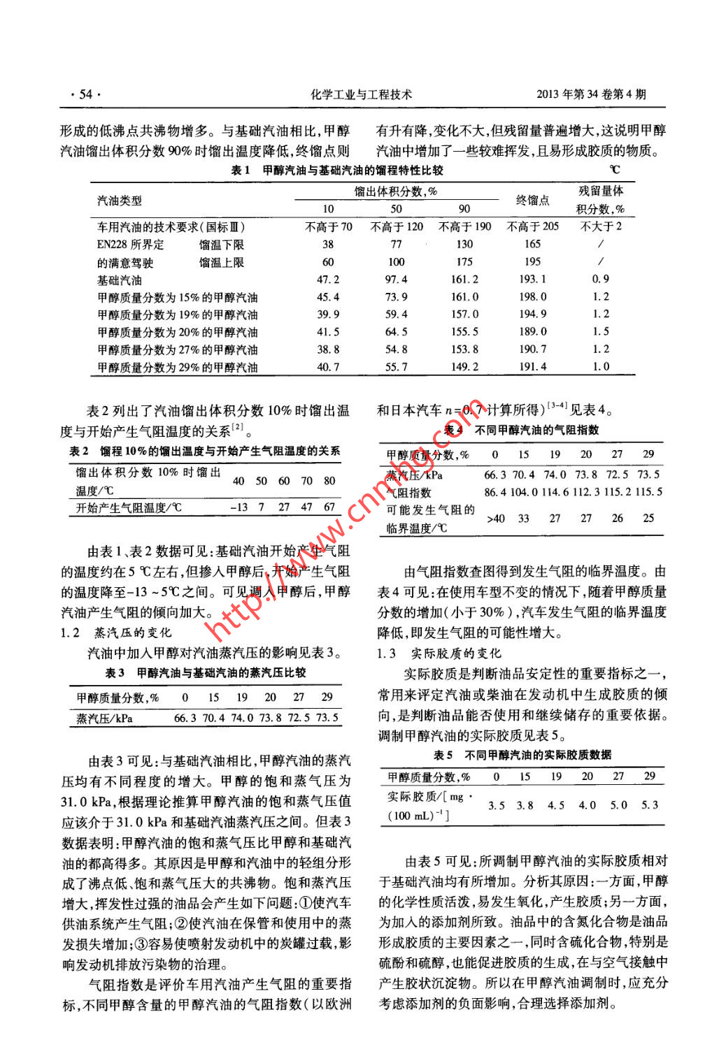 第34卷第4期化學工業(yè)與工程技術Vol. 34 No.42013 年8月Journal of Chemical Industry & EngineeringAug., 2013甲醇汽油的理化性能研究劉曉霞',張娟利”,楊天華2(1.陜西延長石油(集團)有限責任公司,陜西西安710075 ;2.陜西延長石油(集團)有限責任公司研究院,陜西西安710075)摘要:通過對甲醇汽油餾程、蒸汽壓、實際膠質、抗相分離性能等關鍵理化性質的進--步分析,提出了目前調制甲醇汽油所存在的主要技術問題。關鍵詞:甲醇汽油理化性能分析中圖分類號: TE626文獻標識碼:A 文章編號 :1006 -7906(2013 )04-0053-04Study on the physical and chemical properties of methanol gasolineLIU Xiaoxia' , ZHANG Juani2 , YANG Tianhua2(1. Shaanxi Yanchang Petroleum ( Group) Corp. Ltd. , Xian 710075, China;2. Shaanxi Yanchang Petroleum (Group) Corp. Lld. Research Institute, Xian 710075, China)Abstract: The key physical and chemical properties of the methanol gasoline including boiling range, vapour pressure, existentgum, anti-phase separation and so on are analyzed, the main problem existed in the modulating process of the methanol gasoline is pro-posed.Key words :Methanol gasoline; Physical and chemical properties; Analysis當前石油資源8益匱乏,甲醇作為來源充分、價積分數(shù)為10%,50%,90%時的餾出溫度均有不同格低廉的可代用燃料具有良好的發(fā)展前景,研究開程度的降低,其中50%點餾出溫度降低的幅度最發(fā)甲醇的摻燒技術對于緩解目前的石油供需矛盾具大,為42.6C;甲醇汽油中的甲醇含量越高,其餾程有十分重要的意義,而甲醇汽油的調配技術已成為數(shù)據(jù)偏離基礎汽油越遠。甲醇汽油餾出體積分數(shù)目前國內研究的熱點。50%時餾出溫度降低,說明甲醇汽油的平均蒸發(fā)性能1甲醇汽油的理化性質變化分析汽油中加入甲醇后,其物理性質的變化主要集好,因而發(fā)動機的加速性能好,反應靈敏,運轉平穩(wěn)。中在餾程、蒸汽壓、實際膠質、抗相分離性能以及氧為了進一步評價甲醇汽油餾程特性的優(yōu)劣,將含量上?;A汽油、甲醇汽油及具有滿意駕駛特性的汽油餾1.1餾程的變化.程特性上、下限數(shù)據(jù)列于表1川。不同甲醇汽油與基礎汽油的餾程數(shù)據(jù)對比見由表1可見:基礎汽油與不同甲醇汽油的餾程圖1。數(shù)據(jù)均符合GB 17930- -2006《 車用無鉛汽油》對汽油餾程的技術要求;基礎汽油的餾程數(shù)據(jù)均在滿意50駕駛特性的汽油餾程溫度范圍內,但所列甲醇汽油200 t一含甲醇20%的甲醇汽油含甲醇30%的甲醇汽油的餾出體積分數(shù)50%時餾出溫度普遍低于滿意駕霜1駛特性的77 C餾溫下限,同時也低于64.5 C的甲e 100醇沸點。分析其原因,主要是由于甲醇與汽油形成了大量低沸點的共沸物,而且隨著甲醇含量的增大,105?0終餾點餾出體積分數(shù),%收稿日期:2013-05-14。圖1甲醇汽油與基礎汽油的餾程數(shù)據(jù)對比曲線作者簡介:劉曉霞(1978- -) ,女,陜西延安人,碩士,工程師,現(xiàn)主要從事石油化工科技管理工作。由圖1可見:與基礎汽油相比,甲醇汽油餾出體Email:13363918323@ 163. com。.●54●化學工業(yè)與工程技術2013年第34卷第4期形成的低沸點共沸物增多。與基礎汽油相比,甲醇有升有降,變化不大,但殘留量普遍增大,這說明甲醇汽油餾出體積分數(shù)90%時餾出溫度降低,終餾點則汽油中增加了一-些較難揮發(fā),且易形成膠質的物質。表1甲醇汽油 與基礎汽油的餾程特性比較餾出體積分數(shù),%殘留量體汽油類型50)0終餾點積分數(shù),%車用汽油的技術要求(國標M )不高于70不高于 120不高于 190不高于 205不大于2EN228所界定餾溫下限37730165的滿意駕駛餾溫上限6(100175195 ./基礎汽油47. 297.4161.2193. 10.9甲醇質量分數(shù)為15%的甲醇汽油45.473. 9161.0198. C1.2甲醇質量分數(shù)為19%的甲醇汽油39. 959. 4157. 0194. 9.甲醇質量分數(shù)為20%的甲醇汽油41.564. 5155. 5189.01.5甲醇質量分數(shù)為27%的甲醇汽油38.8153. 8190. 7甲醇質量分數(shù)為29%的甲醇汽油40.755. 7149. 291.41.0表2列出了汽油餾出體積分數(shù)10%時餾出溫和日本汽車n=0.7計算所得)3-41見表4。度與開始產(chǎn)生氣阻溫度的關系(2]。表4不同甲醇汽油的氣阻指數(shù)表2餾程10% 的餾出溫度與開始產(chǎn)生氣阻溫度的關系甲醇質量分數(shù),%015192()272S餾出體積分數(shù)10%時餾出4050607080蒸汽壓/kPa66.3 70.4 74.0 73.8 72.5 73.5溫度/C氣阻指數(shù)86.4 104.0114.6 112.3 115.2 115. 5開始產(chǎn)生氣阻溫度/C-137274767可能發(fā)生氣阻的>40 33 2772625臨界溫度/C .由表1表2數(shù)據(jù)可見:基礎汽油開始產(chǎn)生氣阻的溫度約在5 C左右,但摻人甲醇后,開始產(chǎn)生氣阻由氣阻指數(shù)查圖得到發(fā)生氣阻的臨界溫度。由的溫度降至-13~5C之間??梢娬{人甲醇后,甲醇表4可見:在使用車型不變的情況下,隨著甲醇質量汽油產(chǎn)生氣阻的傾向加大。分數(shù)的增加(小于30% ) ,汽車發(fā)生氣阻的臨界溫度1.2 蒸汽壓的變化.降低,即發(fā)生氣阻的可能性增大。汽油中加人甲醇對汽油蒸汽壓的影響見表3。1.3實 際膠質的變化表3甲醇汽油與基礎汽油 的蒸汽壓比較實際膠質是判斷油品安定性的重要指標之--,甲醇質量分數(shù),% 0 15 1920 27 29常用來評定汽油或柴油在發(fā)動機中生成膠質的傾向,是判斷油品能否使用和繼續(xù)儲存的重要依據(jù)。調制甲醇汽油的實際膠質見表5。由表3可見:與基礎汽油相比,甲醇汽油的蒸汽表5不同甲醇汽油 的實際膠質數(shù)據(jù)壓均有不同程度的增大。甲醇的飽和蒸氣壓為