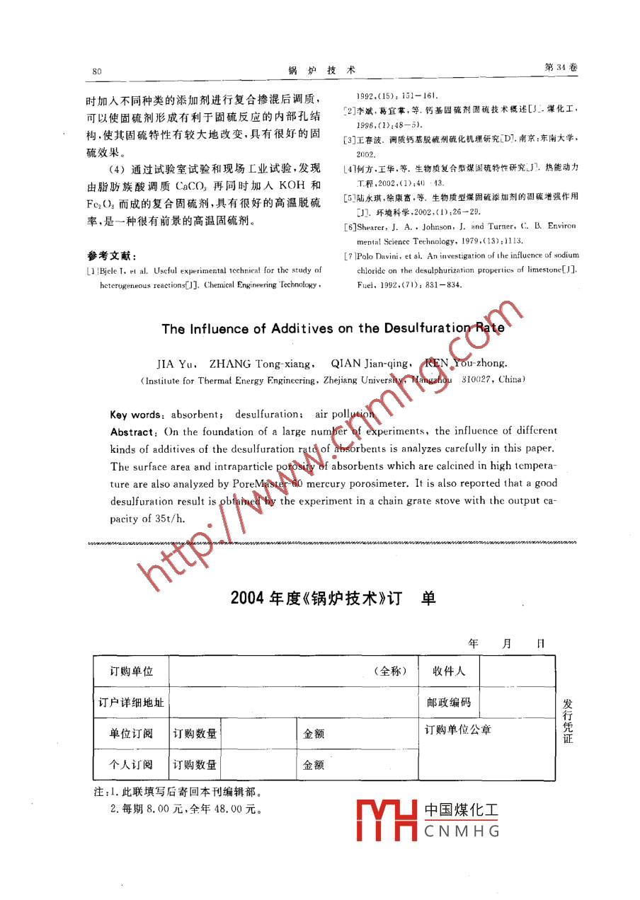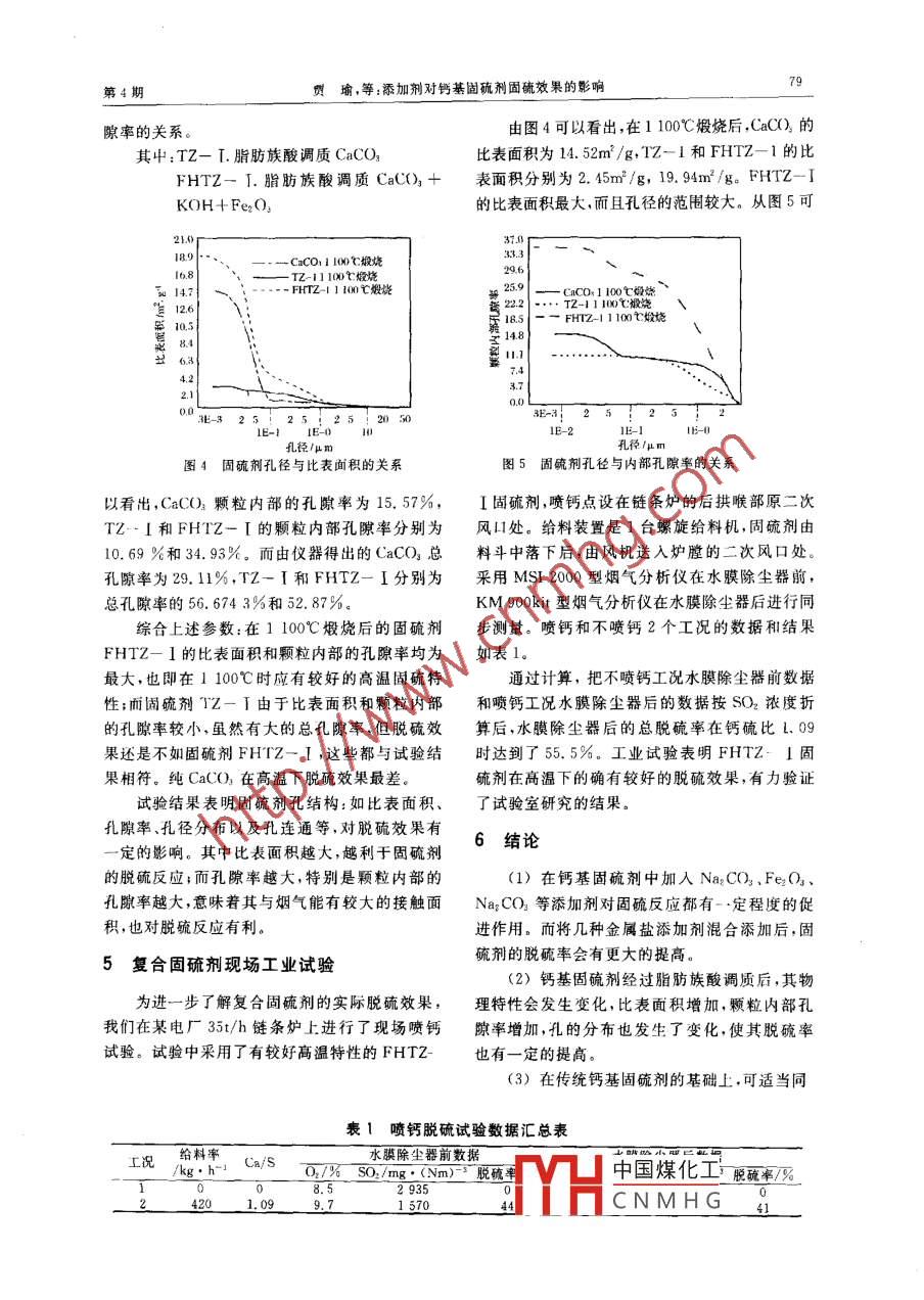 第34卷第4期鍋爐技術Vol. 34,No.42003年7月BOILER TECHNOLOGYJul.,2003文章編號: CN31 : 1508(2003)04 - 0077 - 04添加劑對鈣基固硫劑固硫效果的影響賈瑜,張同翔,錢劍青,任有中(浙江大學熱能工程研究所,浙江杭州310027)關鍵詞:固硫劑; 脫硫;大氣污染摘要:在大量的試驗研究的基礎上,探討了各種舔加劑對鈣基固硫劑脫硫率的影響。并通過壓汞試驗,分析了高溫煆燒之后的復合固硫劑的孔歐率及比表面積的變化。還在35/h鏈條爐上選用-種復合固硫劑進行了現(xiàn)場試驗,得到較好的脫硫效果。中圖分類號: TQ047.1 .文獻標識碼: ACaSO3要發(fā)生分解,且會出現(xiàn)固硫劑高溫燒結和1前言多孔結構堵塞,致使顆粒的比表面積急劇下降;固硫劑是脫硫技術中的關鍵,但傳統(tǒng)的鈣基而且在實際反應中,由于含硫氣體首先與固硫劑固硫劑普遍存在鈣基利用率低,脫硫率不高的缺表面反應形成CaSO/CaSO。致密層,使固硫劑點,尤其是在高溫條件下,脫硫效果更差。隨著表面被覆蓋,造成空洞堵塞,從而影響了固硫劑燃燒技術及表面科學的發(fā)展,發(fā)現(xiàn)傳統(tǒng)鈣基固硫中心與含硫氣體的反應。劑脫硫效果差的主要原因是:在燃燒過程中固硫王春波的論文中認為在CaCO, 中添加劑的活性很低'";而通過在鈣基固硫劑中添加金:Na2CO,[8可以增加反應活性,加速CaCO,的分屬化合物或者一些化學溶液而成的復合固硫劑,解促進脫硫反應的進行。而何方等認為FeO[uJ可以有效地提高傳統(tǒng)鈣基固硫劑的活性,提高其的加入,可以使CaSO,的分解溫度有一定的提脫硫率。東南大學王春波的博士學位論文專門高,加快CaSO,的氧化反應,同時可有效降低脫就復合固硫劑硫化效果得以改善的機理進行了硫反應的活化能,使反應能更加容易地進行。此深人地研究。本文除了通過實驗室大量實驗,分外Al2O35l添加也可以抑制固硫產(chǎn)物的高溫分析了各種不同的添加劑對脫硫率的綜合影響,還解,同時可以形成具有高熱穩(wěn)定性的CaSO,,CaO對各種復合固硫劑在高溫煅燒后進行壓汞試驗,和Al2O3的復鹽,且此產(chǎn)物可以覆蓋或包裹從孔隙率及比表面積的變化,對復合固硫劑的物CaSO,晶體的表面,抑制CaSO,分解,也可有效理特性進行研究。此外,我們還選取在試驗室試提高固硫效果。驗中脫硫效果較好的復合固硫劑在某35t/h鏈條在實驗室試驗中我們選取Na2CO.FeO、爐進行了現(xiàn)場試驗,得到了良好的實際脫硫效Al2O還有其它幾種金屬化合物添加劑與CaCO3果。按一定比例的配方摻混后,在ZCS- 1智能定硫2添加不同金屬化合物后對固硫效果影儀上與純CaCO2固硫劑的脫硫效果作對比實驗。煤樣為含硫量1.335%的工業(yè)混煤,鈣硫比都選響擇為1.5。圖1給出了在1.5鈣硫比下添加不同研究表明:在采用純CaCO3作為固硫劑時,單一金屬化合物與純CaCO,脫硫效果的比較。鈣基利用率低,脫硫率不高。造成這種情況的主圖2給出了在1.5鈣硫比下多種添加劑按不同的要原因L2!是由于在高溫下,有機硫的析出速度大配比同時添加后的脫硫效果比較。大快于CaCO;的分解速率,使得含硫氣體未能及實驗設備采用ZCS- I智能定硫儀1臺,分時與固硫劑反應就已溢出;同時高溫下CaSO,/析天中國煤化工備。收稿日期:2002 -09- 26YHCNMHG作者簡介:賈瑜.男,浙江大學熱能工程研究所研究生。71鍋爐技術第34卷其中:固硫劑I . CaCO, + Fe20,+ Na,CO, +從圖1中可以看出:加入各種添加劑后固硫效MgCO,+ V:O,果都能有一定程度的提高,其中添加FeO3及固硫劑I. CaCO% +Fe2Q,+Na,CO, +Al2O, 后的固硫劑在900~1 000C之間有較好的.MgCO, + NaCl固硫率,而固硫效果最好的是添加NaCO, ,其在各固硫劑IM. CaCO, + Fe:(), +Na2C02 +溫度段的固硫率都有明顯地提高。可能堿金屬的MgC03+ AL(添加會對固硫反應有一定催化作用。從圖2中可以303u211sCaCD- MnO,進21- - AlO,量150)1000 1100HU900 1000 T 100溫度/心:溫度1:圖1添加單一添加劑時固硫劑的脫硫效果圖2添加多種添 加劑的脫硫效果看出,同時添加幾種添加劑,可使固硫劑的脫硫+ FHTZ- T率有比較明顯地提高,而且反映到高溫特性上,+.FHTz-I對溫度的變化不再那么敏感。其中固硫劑I的.+FHIZ-1高溫特性最佳,而低于1 100C時, 固硫劑Il效果......-日- HTZ- W最好。這提醒我們對于金屬化合物添加劑可以考慮一定配比進行混合添加,這樣會對固硫率的.5045..提高有更明顯的作用。3添加化學溶液進行復合調(diào)質(zhì)對 固硫效溫度/C果的影晌圖3(a/S=1.5時復合調(diào)質(zhì)固硫劑的脫碗曲線Shearer, J等認為:使用化學溶液調(diào)質(zhì)CaCON后,可使固硫劑在調(diào)質(zhì)過程中發(fā)生膨脹,孔徑分固硫率甚至達到了70%。面固硫劑FHTZ- I布發(fā)生變化,提高脫硫效果。因此我們在溶液調(diào)隨著溫度的升高,脫硫率在實驗范圍內(nèi)一直保持質(zhì)后又添加了不同的金屬化合物進行了復合調(diào)上升,雖然其低溢脫硫效果不是很好,但其在質(zhì)。圖3給出復合調(diào)質(zhì)后固硫劑脫硫效果對比。1 100C的高溫下已達到50%以上的脫硫率,是其中:FHTZ- I. 脂肪族酸調(diào)質(zhì)CaCO, +一種較好的高溫問硫劑。KOH+ Fe2O,FHTZ- I.脂肪族酸調(diào)質(zhì)CaCO, +4復合固硫劑高溫煅燒后壓汞試驗研究K0H+ Na2CO, + Al2O,為了研究固硫劑進行復合調(diào)質(zhì)可以改善其脫FHTZ-M.脂肪族酸調(diào)質(zhì)CaCO,+硫效果的原因.我們選取脂肪族酸調(diào)質(zhì)CaCO,、脂KOH肪族酸調(diào)質(zhì)CaCO,并添加KOH及FeO,和純FHTZ- IV. 脂肪族酸調(diào)