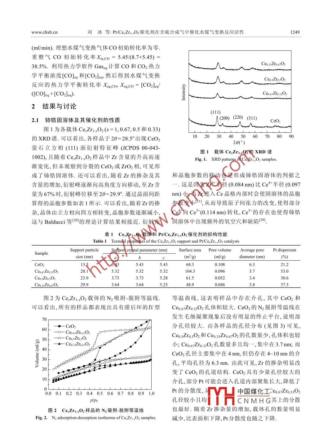Pt/CexZr1-xO2催化劑在含硫合成氣中催化水煤氣變換反應(yīng)活性