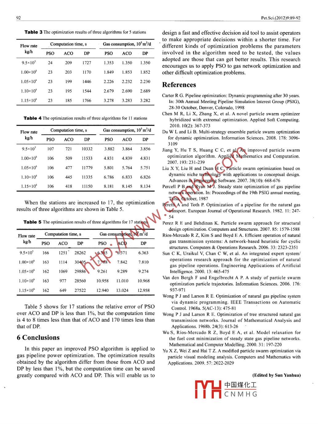 Pet. Sci(2012)9:89-92DOI10.1007/s12182-0120187-8Power optimization of gas pipelines via an improvedparticle swarm optimization algorithmZheng zhiwei and wu Changchun*Beijing Key Laboratory of Urban Oil and Gas Distribution Technology, China University of Petroleum, Beijing 102249,c China University of Petroleum(Beijing)and Springer-Verlag Berlin Heidelberg 2012Abstract: In past decades dynamic programming, genetic algorithms, ant colony optimization algorithmsand some gradient algorithms have been applied to power optimization of gas pipelines. In this paper apower optimization model for gas pipelines is developed and an improved particle swarm optimizationalgorithm is applied. Based on the testing of the parameters involved in the algorithm which need to bedefined artificially, the values of these parameters have been recommended which can make the algorithmreach efficiently the approximate optimum solution with required accuracy. Some examples have shownthat the relative error of the particle swarm optimization over ant colony optimization and dynamicprogramming is less than 1% and the computation time is much less than that of ant colony optimizationand dynamic programmingKey words: Gas pipeline, operation, optimization, particle swarm optimization algorithm1 Introductiongeneration. Because the convergence of PSo is fast and theaccuracy is high, the researchers pay much attention to theCompressors provide the pressure necessary to transport PSO. It is one of the most popular optimization algorithmsnatural gas via a pipeline. The prime mover consumes muchpresently (Van den Bergh and Engelbrecht, 2006; Liu et alpower when driving the compressor. So power optimization is 2007; Perez and Behdinan, 2007; Chen et al, 2010)very important for improying the operational economy of gasIn this paper an improved PSo is introduced. BecaupipelinesThe objective function of power optimization is northe colony information is very important, after evolution forone generation, the best position of the particle swarm willlinear and non-convex. Many constraints are non-linear. be sought again n times around itself. If a better positionIt is difficult to solve this kind of optimization problems. can be found, it will be the new best position of the particleDynamic programming DP)(Wong and Larson, 1968a; swarm. If no betteter position can be found, the best position1968b; Peretti and Toth, 1982; Carter, 1998; Rios-Mercado of the particle swarm will not be changed. It is good foret al, 2006), artificial intelligence(Sun et al, 2000)and some the algorithm to avoid local solutions effectively and thegradient algorithms(Percell and Ryan, 1987; Wu et al, 2000) accuracy can be improved. The improved PSO is applied tohave been applied to power optimization of gas pipelines. the power optimization of gas pipelines. Some parametersThese methods are effective. However, the application range of the algorithm are tested in order to get the most fittingof traditional algorithms is limited and the computation values for the power optimization. Some cases show that thetime is long. Particle swarm optimization(PSO)algorithm computation time can be significantly saved compared to antis a colony intelligence calculation technique developed bycolony optimization(ACO)and DP.Kennedy and Eberhart in 1995. It is inspired by the socialbehavior of organisms such as bird flocking(Yu et al, 2009). 2 Power optimization model of gas pipelinesThe Pso belongs to evolution algorithms. Like genetialgorithm it also begins with some random solutions andIn power optimization of a gas pipeline (as shown insearches for the optimum solution by iterative computation. FIig. 1), the objective function is minimizing the total energyThe pSo also evaluates solutions by the fitness function, but consumed by all the compressor units and the decisionit does not have the process of crossover and mutation. The variables are the discharge pressures of compressor stationsPSO searches for the optimum solution by tracking the best The constraint中國煤化--aints and thermalpositions of individual and colony after evolution for one constraints ofof compressorCN MH Discharge pressureand the minimum allowable suction pressure of compressorCorresponding author. email: wuchangchun @vip. sina. corstations, the minimum allowable delivery pressure at theReceived April 15, 2011delivery terminal, the flow rate and speed limits of every90Ptsi(20129992online compressor, etc. The problem can be formulated as compressor units in each compressor station; Q is the volumefollowsflow rate in the pipeline, m /s; m is the gas adiabatic indexR is the gas constant, kJ/(kmol K); P, is the density of theminm=(∑∑Qpnatural gas at the suction condition of station i, kg/m; Z isRZ, I ((a)m-1)/na/n, )/Emin the gas compressibility factor; T is the gas temperature at thesuction condition of the stations. K: h is the adiabatic headkJ/kg; ik represents the adiabatic efficiency of compressork in station i;n, represents the efficiency of the gas turbine;Emin is the low calorific value of gas, kJ/m; Pa and Ps are theP4≤Pmsdischarge pressure and the suction pressure of a compressormini pstation,Pa;Pe is the end pressure of a pipe segment betweencompressor stations, Pa; Delivery is the supply pressure atPmin2≤Pthe delivery terminal, Pa; Pmax is the maximum allowableHn=a1(")2+a1Q"+adischarge pressure of a compressor station, Pa; Pmint is the(1) minimum allowable suction pressure of a compressor stationPa; Pmin? is the minimum allowable delivery pressure at then=bo+b,0-0+b, 0(0)2delivery terminal, Pa; f represents the resistance ofpipesegments between compressor stations; ao, aI, a,, bo, b,,b2Q-n≤Q4sgnare coefficients of characteristic equations for a centrifugalcompressor; nok and n k represent the rated speed and theactual speed of compressor k in station i, respectively, rpmnmin, i and nmax. k are the minimum speed and the maximumspeed of compressor k in station i, rpm; @minJk and @max&