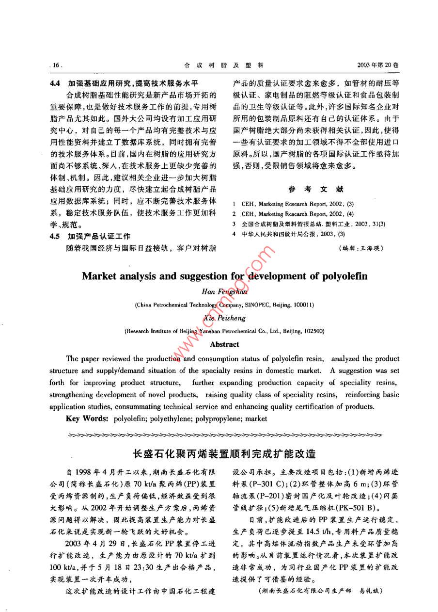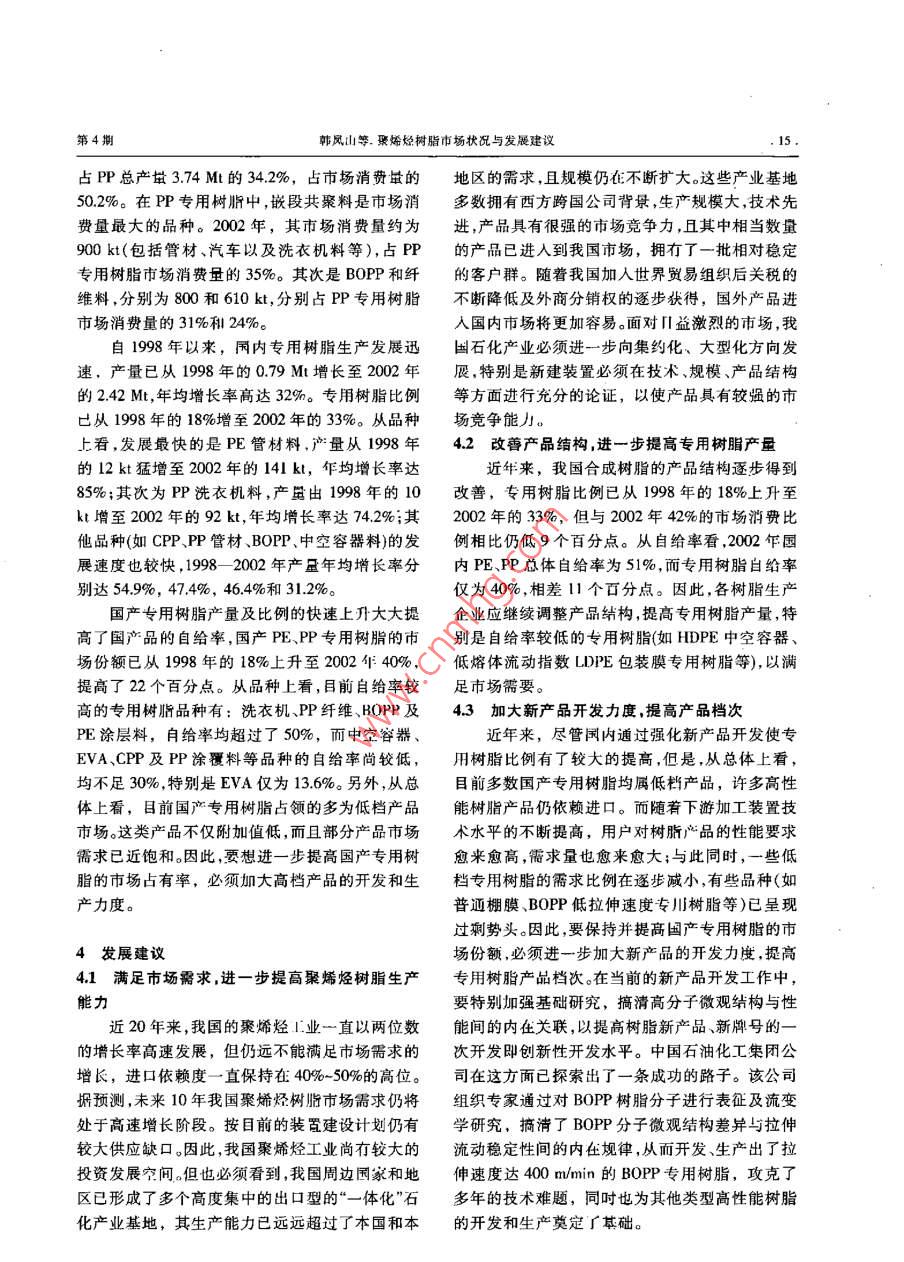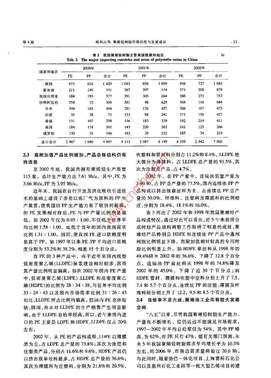 合成樹脂及黻料2003年第20卷表11997--2002年我國(guó)聚媚烴樹脂供需狀況Tab. 1 The situation of supply and demand of polyolcefin resins in donmestic mararket during the years 1997- 20021997- -2001 年2002/2001年項(xiàng)目1997年1998年 1999年 2000年 2001年 2002年年均增長(zhǎng)率,%增長(zhǎng)率. %產(chǎn)量/Mt PE2.152.292.753.003.083.55).415.32.082.693.243.343.7415.412.0合計(jì)4.034.375.446.246.427.2912.313.6進(jìn)口 量/MI P2.282.462.602.974.114.565.9PP1.251.55 .1.471.64 2.09 2.4416.73.534.014.074.616.207.0013.0出口量/Mu PE0.0300.035 0.011 0.009 0.0070.011-30.257.10.0190.028 0.009 0.0100.0090.01-16.644.40.0490.063 0.020 0.0190.0160.024-23.950.0表觀消費(fèi)冊(cè)/Mt PE4.44.725.345.96 .7.188.1012.83.604.154.875.426.1714.87.58.329.49 10.83 12.6014.2713.813.自給率,% PI48948.551.550.342.943.860.57.864.866.5 61.6 60.6聚烯烴樹脂53.652.557.357.651.0注:表觀消費(fèi)量=產(chǎn)量+進(jìn)口量-出口訊。2.2產(chǎn)量與進(jìn)口量同步增長(zhǎng)乙烯裝置的投產(chǎn),新加坡向我國(guó)出口聚烯烴樹脂自80年代以來,我國(guó)聚烯烴樹脂產(chǎn)量一直快的數(shù)量也快速增加,在2001年出口比2000年增速增長(zhǎng),1997- -2001 年期間年均增長(zhǎng)率為12.3%。長(zhǎng)63.5%的基礎(chǔ)上,2002年又比2001年增長(zhǎng)了2002年,隨著北京燕化石油化工股份有限公司、53.1%。目前,新加坡已成為我國(guó)第二大聚烯烴樹揚(yáng)子石油化工股份有限公司和上海石油化工股份脂供應(yīng)國(guó)。米自沙特阿拉伯和我國(guó)臺(tái)灣省的聚烯有限公司等乙烯裝置改擴(kuò)建工程的完工,國(guó)內(nèi)聚烴樹脂在經(jīng)過2000年和2001年大幅增長(zhǎng)之后,烯烴樹脂生產(chǎn)能力又有了較大幅度的增長(zhǎng)。全年2002年增長(zhǎng)減緩,分別增長(zhǎng)了8.7%和8.5%。近年聚烯烴產(chǎn)量達(dá)7.29 Mt,比2001年增長(zhǎng)了13.6%,來,日本向我國(guó)出口的聚烯烴樹脂數(shù)量呈逐年下其中,PE、PP分別增長(zhǎng)了15.3%和12.0%。降趨勢(shì),其占我國(guó)進(jìn)口比例已從1999年的14.2%盡管國(guó)內(nèi)聚烯烴樹脂產(chǎn)量在逐年快速增長(zhǎng),下降到2002年的6.8%,主要原因是日本產(chǎn)品的但仍趕不上市場(chǎng)需求的增長(zhǎng)速度。1997--2002年,生產(chǎn)成本居高不下,致使其通用樹脂在我國(guó)市場(chǎng)聚烯烴樹脂的進(jìn)口量以年均14.6%的速度遞增。的競(jìng)爭(zhēng)力日趨減弱。目前,來自日本的樹脂產(chǎn)品以2002年已達(dá)7.0 Mt,比2001年增長(zhǎng)了13.0%,其價(jià)格相對(duì)較高的專用料居多,如2002年其PE、PP中,PE、PP分別增加了10.9%和16.7%。平均到岸價(jià)比韓國(guó)產(chǎn)品分別高出14.2%和從海關(guān)統(tǒng)計(jì)情況看,近幾年我國(guó)進(jìn)口的聚烯13.8%。烴樹脂主要來自韓國(guó)、新加坡我國(guó)臺(tái)灣省、沙特值得注意的是,隨著印度石化工業(yè)的快速發(fā)阿拉伯及日本。2002 年,來自上述5個(gè)國(guó)家和地展,其聚烯烴供需結(jié)構(gòu)已從內(nèi)符型向出口型轉(zhuǎn)變,區(qū)的聚烯烴樹脂分別占聚烯烴進(jìn)口總量的而其目標(biāo)市場(chǎng)也已鎖定了中國(guó)。因此,近年來,24.1%, 12.6% , 10.8% ,9.8%和6.8% ,累計(jì)占63.9%。印度向我國(guó)出口的聚烯烴樹脂迅速增加,已從從品種上看,PE主要來自韓國(guó)、新加坡、沙特阿拉2000年的73kt猛增至2002年的427kt,年均增伯和我國(guó)臺(tái)灣省,2002年分別占PE進(jìn)口總量的長(zhǎng)率高達(dá)67%,占我國(guó)進(jìn)口市場(chǎng)的份額由2000年20.8% ,12.5% ,12.5%和8.3%;PP主要來自韓國(guó)、的1.6%升至2002年的6.1%。隨肴一批新裝置的我國(guó)臺(tái)灣省、新加坡和泰國(guó),分別占PP進(jìn)口總量建設(shè)投產(chǎn),估計(jì)印度聚烯烴樹脂在我國(guó)的市場(chǎng)份的30.2% , 15.3%, 12.6%和9.0%。額還會(huì)增大。2002年,向我國(guó)出口聚烯烴樹脂增長(zhǎng)最多的表2為我國(guó)聚烯烴樹脂的主要來源國(guó)家和地是新加坡。隨著Exxon公司在新加坡的800kta區(qū)。第4期韓風(fēng)山等聚烯烴樹脂市場(chǎng)狀況與發(fā)展建議.13.表2我國(guó)聚烯烴樹脂主要來源國(guó)家和地區(qū)Tab.2 The major importing countries and areas of polyolefin resins in China2000年2001年2002年國(guó)家和地區(qū)rEPI合計(jì)PEPPP韓國(guó)6141 4291 0436561 699487371 685新加坡211140351367207574308879我國(guó)臺(tái)灣省9337739130948037375沙特阿拉伯29412306S8162968116日本3098549428117645706167473873153871156427131672981833399221941美國(guó)183021432263125266俄羅斯130161463922234進(jìn)口合計(jì)2 9671 6404 60)741132 0876 1994 5592 4427 0022.3高附加值產(chǎn)品比例增加,產(chǎn)晶總體結(jié)構(gòu)仍有吹塑料和管材料分別占11.2%和8.4%。ILDPE絕待改善大部分為薄膜料,占LLDPE總產(chǎn)量的91.5%,其至2002年底,我國(guó)共擁有聚烯烴生產(chǎn)裝置次為注塑類產(chǎn)品,占4.7%。115套,總計(jì)生產(chǎn)能力達(dá)7.61 Mta, 其中,PE為2002年,在PP產(chǎn)量中,連續(xù)法裝置產(chǎn)量為3.66 M/a ,PP為3.95 Mva。2.90 Mt,占PP總產(chǎn)量的77.5%。國(guó)內(nèi)連續(xù)法PP產(chǎn)近年米,我國(guó)在自行開發(fā)及消化吸收引進(jìn)技品構(gòu)成以擠出級(jí)扁絲料為主,占連續(xù)法PP總產(chǎn)術(shù)的基礎(chǔ)上建設(shè)了多套以煉廠氣為原料的PP生量的50.0%,纖維料、注塑料及薄膜料的比例相產(chǎn)裝置,使我國(guó)的PP生產(chǎn)能力有了較快的提高。近,分別為18.4%, 18.1%