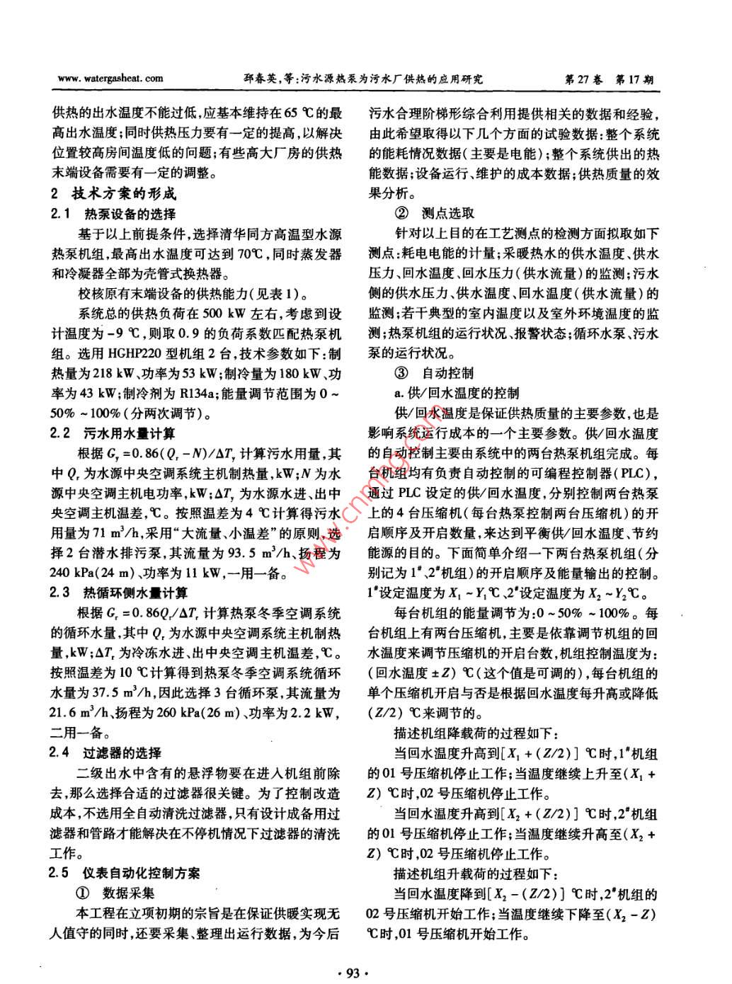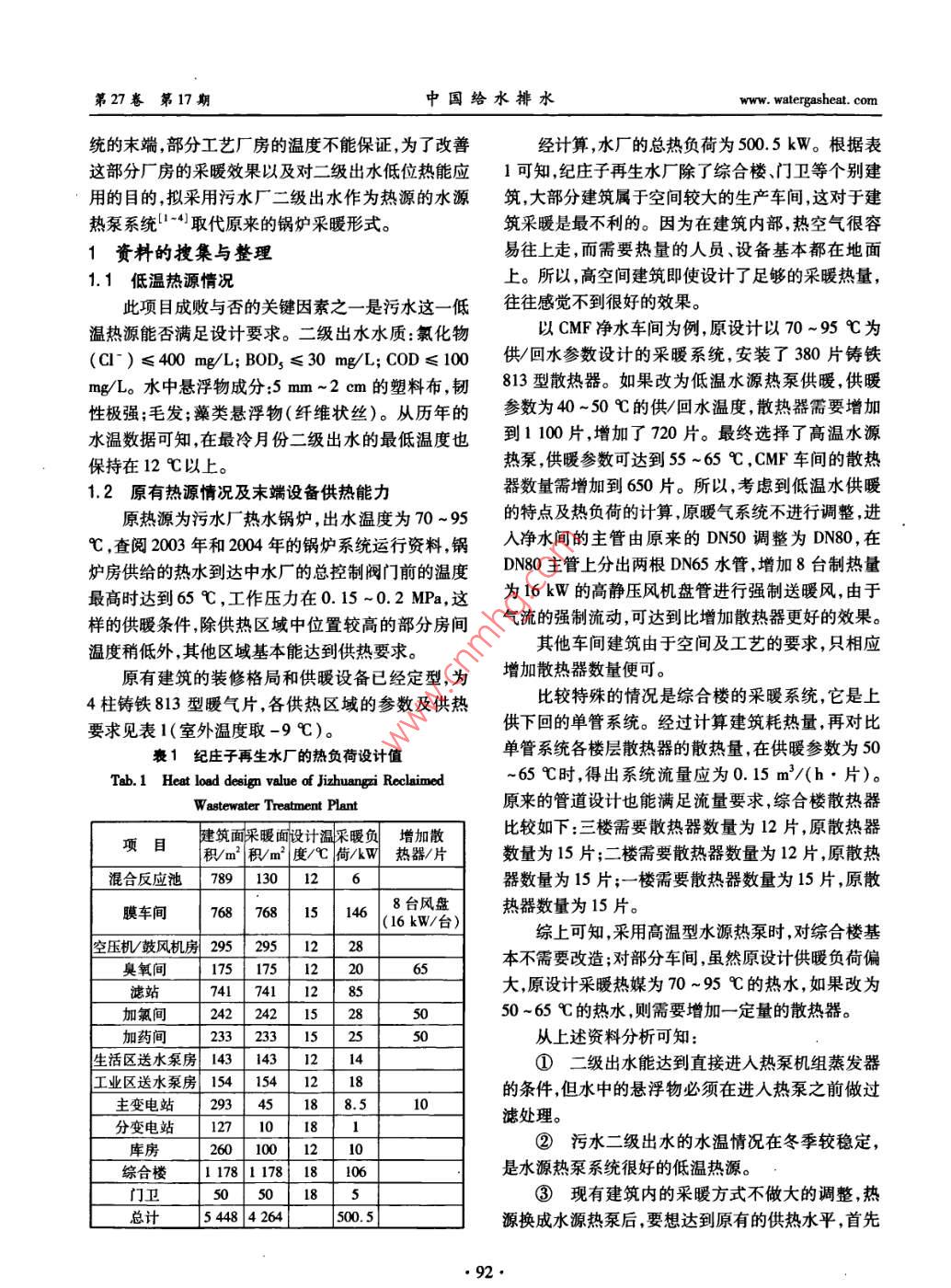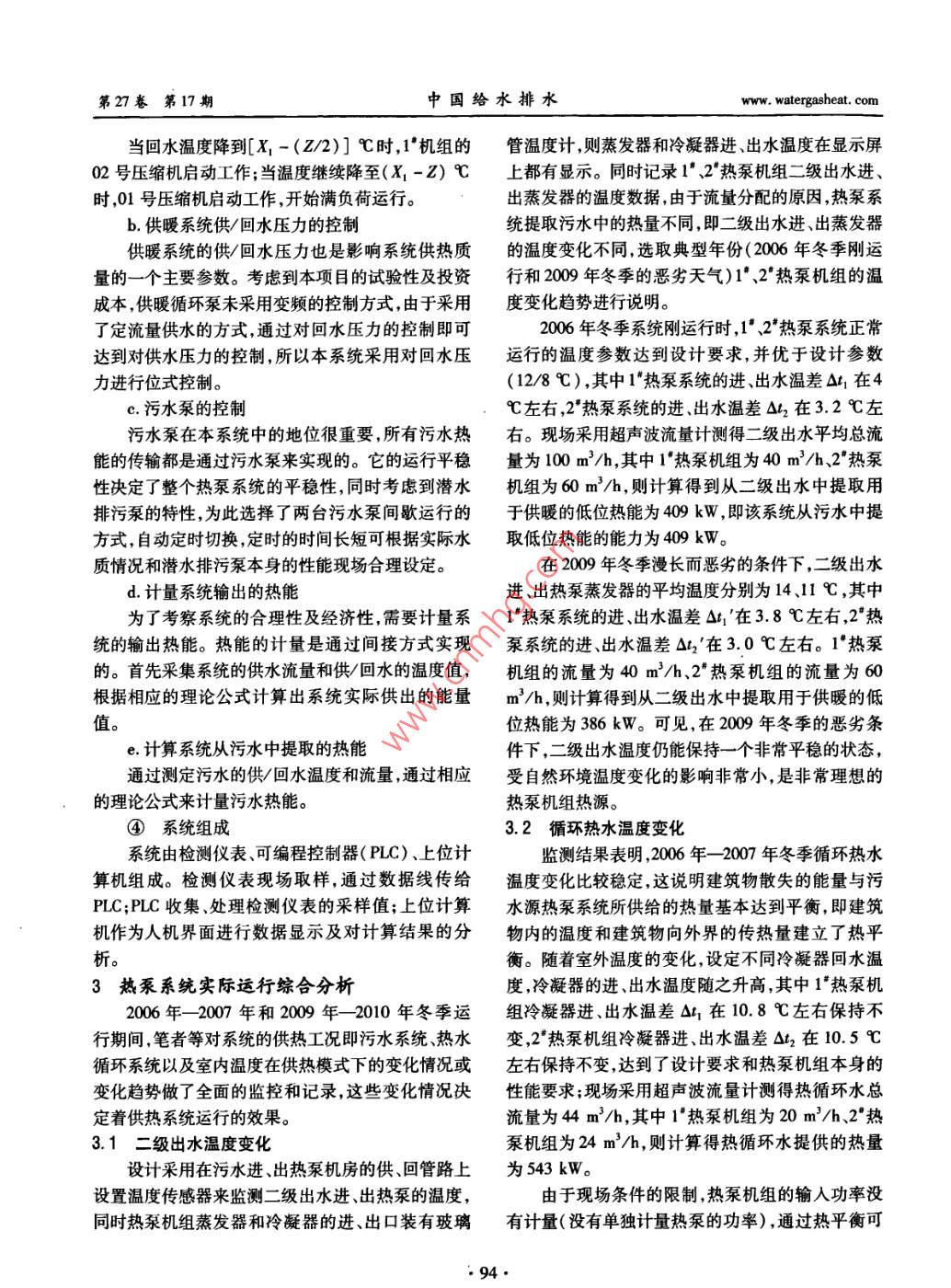 第27卷第17期中國給水排水Vol 27 No. 1720L1年9月CHINA WATER WASTEWATERSep 2011污水源熱泵為污水廠供熱的應(yīng)用研究邳春英,劉康,鄭杰,黃登躍,高文寶2,李育宏2(1.中天環(huán)能<天津>工程技術(shù)有限公司,天津300191;2.天津中水有限公司,天津300190)摘要:城市污水中蘊含著大量的低品位熱能,近年來熱泵技術(shù)的發(fā)展為提取這些低品位能源提供了直接條件。對天津紀(jì)莊子再生水廠的采暖系統(tǒng)進行了改造,改造目的主要是:改善原有采暖系統(tǒng)的供熱效果;為二級處理出水應(yīng)用于熱泵采暖系統(tǒng)積累數(shù)據(jù),以便于將來的大規(guī)模推廣應(yīng)用。此次改造采用高溫型熱泵機組替代原有的采暖鍋爐,并對末端及機房設(shè)備加以部分調(diào)整。改造后采暖效果相比鍋爐采暖明顯得到改善。同時監(jiān)測記錄了全年的二級處理出水水溫,為熱泵系統(tǒng)在城市污水領(lǐng)域的應(yīng)用提供了基礎(chǔ)數(shù)據(jù)。關(guān)鍵詞:二級處理出水;污水源熱泵;采暖改造中圖分類號:X703文獻標(biāo)識碼:C文章編號:1000-4602(2011)17-0091-05Application Research of Sewage Source Heat Pump for Heating of WWTPPI Chun-ying, LIU Kang, ZHENG Jie, HUANG Deng-yue,GAO Wen-bao2LI Yu-hong1. Zhongtian Environment and Energy Tianjin> Technology Co. Ltd, Tianjin 300191, China;2. Tianjin Reclaimed Water Co. Lid, Tianyin 300190, ChinaAbstract Municipal sewage contains a lot of low quality thermal energy, the development of heatpump technology has facilitated the use of it in the past years. In order to improve the efficiency of exist-ing heating system, collect data for application of secondary effluent in heat pump system and apply thistechnology widely in the future, the heating system of Jizhuangzi Reclaimed Wastewater Treatment Plantin Tianjin was reconstructed. In this project, the original heating boiler is replaced by high-temperatureheat pump unit, and some terminal devices and air-handling units are changed. The heating efficiency isimproved significantly compared with boiler heating. Meanwhile, the temperature of the secondary effluent was monitored for a whole year, which provides foundational data for the application of heat pump sys-tem in municipal sewage fieldKey words: secondary effluent; sewage source heat pump: heating reconstruction紀(jì)莊子污水廠是天津市大型生活污水處理廠,管,接自紀(jì)莊子污水廠的供暖熱網(wǎng),接口處壓力為由于工業(yè)污水量少,污水水質(zhì)相對穩(wěn)定,這就為其在0.3~04MPa。再生水廠總建筑面積為5448m2水源熱泵方面的利用提供了良好前提。再生水廠是其中綜合辦公樓的面積為1178m2、廠房車間的面為污水廠二級出水做進一步處理的獨立單位,工藝積為4329m2。由于再生水廠的處理工藝要求,為廠房的溫度有各自的要求,原采暖系統(tǒng)熱源是污水保證產(chǎn)水水量,在冬季對工藝廠房的溫度有一定要廠燃氣鍋爐,熱媒為70~95℃的熱水,末端為4柱求,比如辦公樓和值班室設(shè)計溫度應(yīng)為18℃,加氯鑄鐵813型散熱器,采用上供下回式采暖系統(tǒng)。供和加藥間、臭氧車間和CMF凈水間溫度為15℃,其熱管道的埋深為0.8~1.0m,采用直埋式預(yù)制保溫他工藝車間溫度為12℃。因為再生水廠為采暖系·91·第27卷第17期中國給水排水www.watergasheat.com統(tǒng)的末端,部分工藝廠房的溫度不能保證,為了改善經(jīng)計算,水廠的總熱負荷為500.5kW。根據(jù)表這部分廠房的采暖效果以及對二級出水低位熱能應(yīng)1可知紀(jì)莊子再生水廠除了綜合樓門衛(wèi)等個別建用的目的,擬采用污水廠二級出水作為熱源的水源筑,大部分建筑屬于空間較大的生產(chǎn)車間,這對于建熱泵系統(tǒng)4取代原來的鍋爐采暖形式。筑采暖是最不利的。因為在建筑內(nèi)部,熱空氣很容1資料的搜集與整理易往上走,而需要熱量的人員、設(shè)備基本都在地面1.1低溫?zé)嵩辞闆r上。所以,高空間建筑即使設(shè)計了足夠的采暖熱量此項目成敗與否的關(guān)鍵因素之一是污水這一低往往感覺不到很好的效果。溫?zé)嵩茨芊駶M足設(shè)計要求。二級出水水質(zhì):氯化物以CMF凈水車間為例,原設(shè)計以70~95℃為(C)≤400mg/L;BOD3≤30mg/L;COD≤100供/回水參數(shù)設(shè)計的采暖系統(tǒng),安裝了380片鑄鐵mgLo水中懸浮物成分:5mm~2cm的塑料布,韌813型散熱器。如果改為低溫水源熱泵供暖,供暖性極強;毛發(fā);藻類懸浮物(纖維狀絲)。從歷年的參數(shù)為40~50℃的供回水溫度,散熱器需要增加水溫數(shù)據(jù)可知,在最冷月份二級出水的最低溫度也到110片,增加了720片。最終選擇了高溫水源保持在12℃以上。熱泵,供暖參數(shù)可達到55~65℃,CMF車間的散熱1.2原有熱源情況及末端設(shè)備供熱能力器數(shù)量需增加到650片。所以,考慮到低溫水供暖原熱源為污水廠熱水鍋爐,出水溫度為70~95的特點及熱負荷的計算原暖氣系統(tǒng)不進行調(diào)整進℃,查閱2003年和204年的鍋爐系統(tǒng)運行資料鍋凈水間的主管由原來的DN50調(diào)整為DN80,在爐房供給的熱水到達中水廠的總控制閥門前的溫度DN80主管上分出兩根DN65水管增加8臺制熱量最高時達到65℃,工作壓力在0.15-0.2MPa,這為16kW的高靜壓風(fēng)機盤管進行強制送暖風(fēng),由于樣的供暖條件,除供熱區(qū)域中位置較高的部分房間氣流的強制流動,可達到比增加散熱器更好的效果。溫度稍低外,其他區(qū)域基本能達到供熱要求。其他車間建筑由于空間及工藝的要求,只相應(yīng)原有建筑的