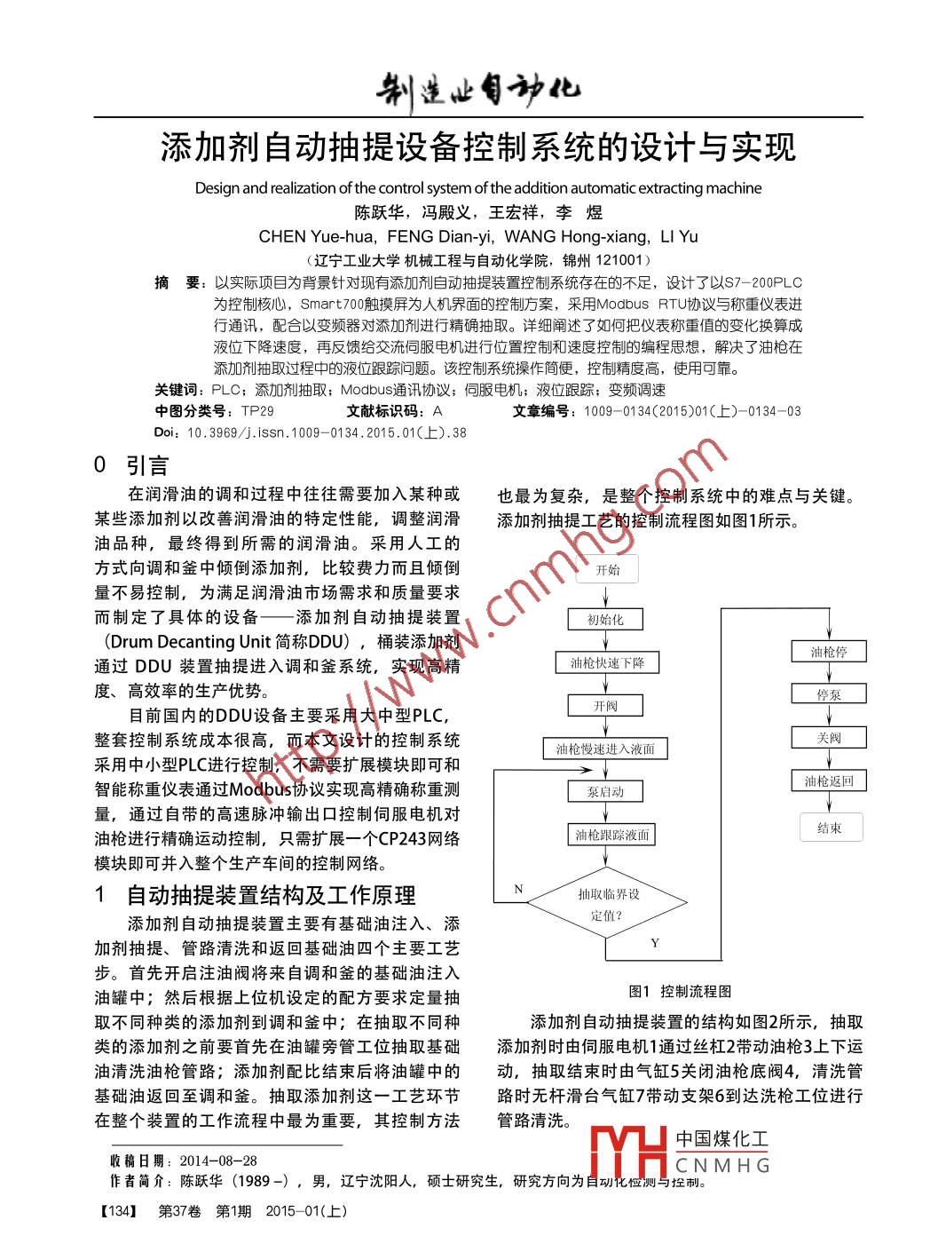 制造止自動(dòng)化添加劑自動(dòng)抽提設(shè)備控制系統(tǒng)的設(shè)計(jì)與實(shí)現(xiàn)Design and realization of the control system of the addition automatic extracting machine陳躍華,馮殿義,王宏祥,李煜CHEN Yue-hua, FENG Dian-yi, WANG Hong-xiang, LI Yu(遼寧工業(yè)大學(xué)機(jī)械工程與自動(dòng)化學(xué)院,錦州121001)摘要:以實(shí)際項(xiàng)目為背景針對(duì)現(xiàn)有添加劑自動(dòng)抽提裝置控制系統(tǒng)存在的不足,設(shè)計(jì)了以S7-200PLC為控制核心,Smart700觸摸屏為人機(jī)界面的控制方案,采用Modbus RTU協(xié)議與稱重儀表進(jìn)行通訊,配合以變頻器對(duì)添加劑進(jìn)行精確抽取。詳細(xì)闡述了如何把儀表稱重值的變化換算成液位下降速度,再反饋給交流伺服電機(jī)進(jìn)行位置控制和速度控制的編程思想,解決了油槍在添加劑抽取過程中的液位跟蹤問題。該控制系統(tǒng)操作簡便,控制精度高,使用可靠。關(guān)鍵詞: PLC;添加劑抽取; Modbus通訊協(xié)議;伺服電機(jī);液位跟蹤;變頻調(diào)速中圖分類號(hào): TP29文獻(xiàn)標(biāo)識(shí)碼: A文章編號(hào): 1009-0134(2015)01( 上)-0134-03)oi: 10.3969/j. issn. 1009- -0134. 2015.01(上).380引言在潤滑油的調(diào)和過程中往往需要加入某種或也最為復(fù)雜,是整個(gè)控制系統(tǒng)中的難點(diǎn)與關(guān)鍵。某些添加劑以改善潤滑油的特定性能,調(diào)整潤滑添加劑抽提工藝的控制流程圖如圖1所示。油品種,最終得到所需的潤滑油。采用人工的方式向調(diào)和釜中傾倒添加劑,比較費(fèi)力而且傾倒開始量不易控制,為滿足潤滑油市場需求和質(zhì)量要求↓而制定了具體的設(shè)備一添加劑自動(dòng)抽提裝置初始化(Drum Decanting Unit 簡稱DDU),桶裝添加劑油槍停通過DDU裝置抽提進(jìn)入調(diào)和釜系統(tǒng),實(shí)現(xiàn)高精油槍快速下降度、高效率的生產(chǎn)優(yōu)勢(shì)。停泵目前國內(nèi)的DDU設(shè)備主要采用大中型PLC,整套控制系統(tǒng)成本很高,而本文設(shè)計(jì)的控制系統(tǒng)油槍慢速進(jìn)入液面采用中小型PLC進(jìn)行控制,不需要擴(kuò)展模塊即可和》↓油槍返回智能稱重儀表通過Modbus協(xié)議實(shí)現(xiàn)高精確稱重測泵啟動(dòng)量,通過自帶的高速脈沖輸出口控制伺服電機(jī)對(duì)廠結(jié)束油槍進(jìn)行精確運(yùn)動(dòng)控制,只需擴(kuò)展一個(gè)CP243網(wǎng)絡(luò)油槍跟蹤液面模塊即可并入整個(gè)生產(chǎn)車間的控制網(wǎng)絡(luò)。1自動(dòng)抽提裝置結(jié)構(gòu)及工作原理抽取臨界設(shè)定值?添加劑自動(dòng)抽提裝置主要有基礎(chǔ)油注入、添加劑抽提、管路清洗和返回基礎(chǔ)油四個(gè)主要工藝步。首先開啟注油閥將來自調(diào)和釜的基礎(chǔ)油注入圖1控制流程圖油罐中;然后根據(jù)上位機(jī)設(shè)定的配方要求定量抽取不同種類的添加劑到調(diào)和釜中;在抽取不同種添加劑自動(dòng)抽提裝置的結(jié)構(gòu)如圖2所示,抽取類的添加劑之前要首先在油罐旁管工位抽取基礎(chǔ)添加劑時(shí)由伺服電機(jī)1通過絲杠2帶動(dòng)油槍3上下運(yùn)油清洗油槍管路;添加劑配比結(jié)束后將油罐中的動(dòng),抽取結(jié)束時(shí)由氣缸5關(guān)閉油槍底閥4,清洗管基礎(chǔ)油返回至調(diào)和釜。抽取添加劑這一工藝環(huán)節(jié)路時(shí)無桿滑臺(tái)氣缸7帶動(dòng)支架6到達(dá)洗槍工位進(jìn)行在整個(gè)裝置的工作流程中最為重要,其控制方法管路清洗。中國煤化工收稿日期:2014-08-28.YHCNMH G作者簡介:陳躍華(1989-) ,男,遼寧沈陽人,碩士研究生, 研究方向?yàn)樽詣?dòng)化位測與控制。[134]第37卷 第1期 2015- -01(上)制造止訇動(dòng)化2.2程序結(jié)構(gòu)概述系統(tǒng)程序由一個(gè)主程序和若干子程序組成,包括通訊程序、系統(tǒng)初始化程序,手動(dòng)調(diào)試程序,自動(dòng)運(yùn)行程序、定時(shí)中斷程序和帶參數(shù)的(變頻器調(diào)用子程序等;程序結(jié)構(gòu)采用SCR順序控制,在設(shè)備上電后首先執(zhí)行初始化,設(shè)定各參數(shù)初值,伺服電機(jī)和閥門返回初始位置,當(dāng)各初始位傳感器給出反饋信號(hào)后進(jìn)入自動(dòng)運(yùn)行狀態(tài),自動(dòng)運(yùn)行程序包含4個(gè)工藝步子程序;當(dāng)切換到手動(dòng)調(diào)試模式時(shí),自動(dòng)運(yùn)行停止,手動(dòng)操作電機(jī)和閥門;點(diǎn)擊自動(dòng)運(yùn)行,系統(tǒng)重新執(zhí)行初始化后進(jìn)入自動(dòng)運(yùn)行程序。2.3添加劑精確抽取控制策略1.伺服電機(jī); 2.導(dǎo)軌絲杠; 3.油槍; 4.油槍底閥;5.封口氣缸; 6.支架; 7.滑臺(tái)氣缸在添加劑的抽取過程中,為提高工作效率,首先使用較大速度對(duì)添加劑進(jìn)行抽取,當(dāng)距離設(shè)圖2裝置 結(jié)構(gòu)圖定量還剩20%時(shí),PLC記錄 下儀表此時(shí)采集的添加2控制系統(tǒng)設(shè)計(jì)劑重量VD658,然后減去后續(xù)抽取過程中添加劑2.1控制系統(tǒng)硬件配置的實(shí)時(shí)重量VD646,得到該時(shí)刻已抽重量LD12,PLC作為整個(gè)控制系統(tǒng)的核心用來完成現(xiàn)場再用設(shè)定值VD662的20%減去已抽重量LD12,得設(shè)備的實(shí)時(shí)控制,根據(jù)控制方案及點(diǎn)數(shù)選擇西門到距離設(shè)定量的差值LD16,PLC會(huì)隨著設(shè)定量子公司的CPU224XP晶體管型PLC,上面 帶有2個(gè)的臨:近