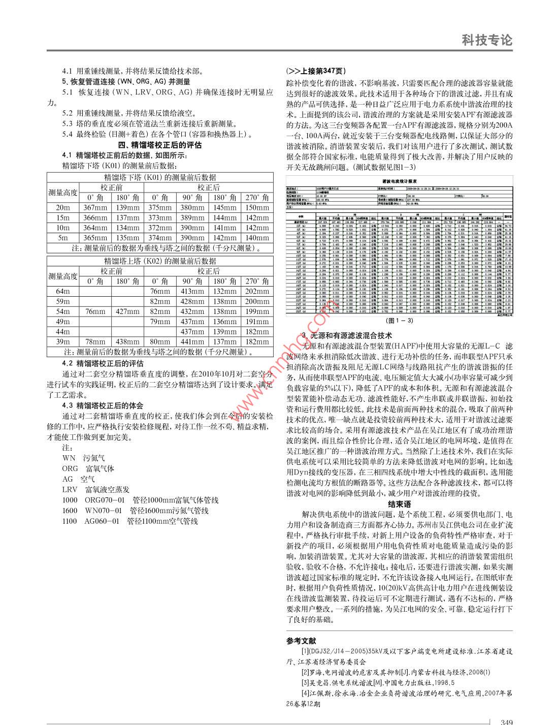 科技專論空分精餾塔安裝后垂直度校正的淺析黃建蕭神華寧煤烯烴公司寧夏寧東750411【摘要】本文通過神華寧煤烯烴公司二套空分裝置中精餾塔在安裝是否有腳手架與主塔接觸(應無接觸)。后垂直度的校正進行了淺析,針對具體實施方案進行了重點闌述。1.4用垂線方式重新測量K01、K02的垂直度【關鍵詞】精餾塔;垂直度;校正2、松開地腳螺栓和KQ2的拉桿,并檢查是否有腳手架與主塔(κO1前言松開下塔(K01)神華寧煤烯烴公司現(xiàn)有法液空生產的90000Nm3h煤化工型底部的地腳螺栓和上塔空分裝置二套,二套空分裝置于2010年10月投產,裝置加工能力為(K02)上的拉桿,并檢9000Nm3/h(O),主要產品為5.9MPa高壓氮氣750Nm3/h,0.86MPa查是否有腳手架與主塔低壓氮氣27000Nm03/h,液氮1250Nm3/h(氣態(tài)),液氧1250Nm3/h270l/K02)接觸(氣態(tài))。該裝置特點為采用空氣循環(huán)雙泵內壓縮、下塔抽取壓力氮氣3、檢查大管道上的再增壓的流程,該裝置精餾塔高度7411mm粗壓塔高72158mm,精餾所有導向支架塔的低壓塔(K0Ⅰ)和中壓塔(K02)都采用雙級規(guī)整填料塔,該精餾塔檢查WN、ORG和阻力小、節(jié)能且分離效率高。在精餾系統(tǒng)中設置氬增效塔(K10)以提高1600070-01LRV管上的導向支架氧提取率??垂茏优c支架之間是否垂直度調整的因素有間隙,如沒有,松開攴架上的螺栓,調整支架確保有螺栓鑒于一套空分精餾塔(K0Ⅰ/K02)安裝結束對垂直度進行了測量4.設置干斤頂發(fā)現(xiàn)有一定的傾斜,但該傾斜度在設計范圍內?,F(xiàn)場千斤頂?shù)姆胖梦恢萌缦聢D所示,千斤頂共三個,每個100T,共10年6月29日,二套空分精餾塔安裝結束,對精餾塔(KOl/K02)300T,1個100T放于WN管道下方,其余的放在兩側的垂直度進行了測試,顯示測量數(shù)據(jù)超出設計范圍三、精餾塔垂直度校正的實施塔垂直度測量的方案1、工裝的制作與K01底部裙座的加強測量基于精餾塔上所有大口徑管道已經連接,沒有外力影響(例如工裝具體形式如下圖所示,厚按20mm,在裙座上的焊接位置與千起重器、吊車等),測量的鉛垂線滿足液空規(guī)定斤頂放置位置一一對應主塔在無管道(WN、LFV.ORG)連接狀態(tài)下的垂直度測量裙座加強筋如右下圖所示,具體為20#碳鋼槽鋼,間斷焊(焊2001.1脫開主塔(K01/K02)與壓塔的連接(如圖一)。隔200)與裙座內側與工裝位置相對應,若遇人孔等,加強方式按右下圖隔斷1000ORG070-01、移除FV1712和HV170法蘭上靠近執(zhí)行,人孔中用200mm寬不銹鋼槽鋼,不銹鋼槽鋼在垂直度調整完成后的螺栓(如圖二)。拆除,在裙座底部壓環(huán)和基礎之間須用20mm厚的碳鋼加強觴,位置與千斤頂位置對應1.2脫開主塔(K01/K02)與換熱器(E01/E03)的連接(如圖L Enlg移除1600wN070-01與換熱器(E03)連接法蘭上的螺栓。移2、加載除l100在加載前,安排人員監(jiān)視K02上基準塊水平度,加載時,要保證加載PIC. 3AG060-速度緩慢,并保證3個千斤頂同步,加載值的測量以地面基礎為參照。0l與換熱器2.1開始,所有千斤頂同時加載2mm停止,在此過程中檢查裙座有(E01)連接無變形或異常,如有異常應立即停止。法蘭上的螺2.2確認無異常后,等待15min,再加載2mm。栓2.3接下來每隔15min加載一次,每次lmm1.3拆2.4調整墊鐵,用錘子將墊鐵固定除主冷箱2.5卸載,并確保水平以上水泡無明顯變化。頂部安全閥3.靜置出口管和入鎖定千斤頂,并靜置12小時口管上的導3.1檢查主塔(K0l/K02)有無異常,拉桿是否松弛≡向支架,確3.2檢查主塔是否與腳手架等有接觸。保這些管道3.3檢査安全閥出口管與入口管、鋼結構支架是否有接觸。Remove the bolts處于自由狀4測量態(tài),并檢査測量需在早上無陽光直射下或者傍晚進行??萍紝U?用重錘線測量,并將結果反饋給技術部。(>>上接第347頁5、恢復管道連接(WN、ORG、AG)并測量蹤補償變化著的諧波,不影響基波,只需要匹配合理的濾波器容量就能5.Ⅰ恢復連接(wN、LRV、ORG、AG)并確保連接時無明顯應達到很好的濾波效果。此技術適用于各種場合下的諧波過濾,并且有成力。熟的產品可供選擇,是一種日益廣泛應用于電力系系統(tǒng)中諧波治理的技5.2用重錘線測量,并將結果反饋給液空。術。上面提到的該公司,諧波治理的方案就是采用安裝APF有源濾波器5.3塔的垂直度必須在管道法蘭重新連接后重新測的方法。為這三臺變頻器各配置一臺APF有源濾波器,規(guī)格分別為200A5.4最終檢驗(目測+著色)在各個管口(容器和換熱器上)。臺、100A兩臺,就近安裝于三臺變頻器配電線路側,以保證大部分的四、精餾塔校正后的評估諧波被消除。消諧裝置安裝后,我們對該用戶進行了多次測試,測試數(shù)4.1精餾塔校正前后的數(shù)據(jù),如圖所示據(jù)全部符合國家標準,電能質量得到了極大改善,并解決了用戶反映的精餾塔下塔(K0l)的測量前后數(shù)據(jù)開關無故跳閘問題。(測試數(shù)據(jù)見圖1-3精餾塔下塔(Ko的測量前后數(shù)據(jù)故電流綻計報表測量高度校正前校正后0角180°角0°角90°角180°角270°角20m367mm139mm375mm380mm145mm150mm5m366m137mm373mm389mm144mm142mm10m364mm34mm372mm390mm14mm142m5m365mm135mm374mm390mm142mm140注:測量前后的數(shù)據(jù)為垂線與塔之間的數(shù)據(jù)(千分尺測量)。精餾塔上塔(K02)的測量前后數(shù)據(jù)測量高度校正前校正后0°角180°角0角90°角180角270°角76m413mm132mm202mm54m 76mm 427mm82mm432mm138mm199mm49m79mm 437mm136mm191mm437mm139mm182mm3、無源和有源濾波混合技術438mm80mm44lmm137mm182mm注:測量前后的數(