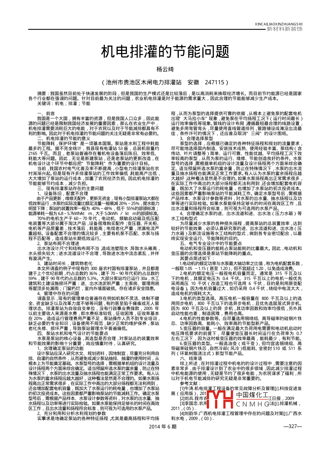 XINCAILIAOX H新材料新裝飾機(jī)電排灌的節(jié)能問題楊云綺池州市貴池區(qū)木閘電力排灌站安徽247115)目前處于快速發(fā)展的階段,但是我國的生產(chǎn)模式還是比較落后,是以高消耗來換取經(jīng)濟(jì)增長。而目前節(jié)約能源已經(jīng)是國家各個行業(yè)都問題題。針對目前最為關(guān)注的問題,農(nóng)業(yè)杋電排灌是對于能源的需求量大,因此合理的節(jié)能能夠減少生產(chǎn)成本。關(guān)鍵詞:機(jī)電;排灌;節(jié)能前言程,從而為泵型的選擇提供可靠的依據(jù),從根本上避免泵的配套電機(jī)我囯是一個大國,擁有豐富的資源,但是我國人口眾多,因此能出現(xiàn)大馬拉小車”現(xiàn)象,避免泵在平均揚(yáng)程工況下(運行時間最長)運行效率偏低等現(xiàn)象。管線的設(shè)計布局遵循最短最合理的線路設(shè)置機(jī)電排灌需要消耗巨大的電能,對于農(nóng)民以及對于節(jié)能減排都具有不避免多用彎管彎頭,盡量使用直線管道排列,管路鋪設(shè)成淹沒岀流最利的影響。因此對于機(jī)電排濯的節(jié)能問題的關(guān)注無疑是非常有必要的佳,條件許可的情況下,還應(yīng)普及取消〃三閥”的設(shè)計圖紙、機(jī)電排灌的節(jié)能的意義3、合理選擇泵型節(jié)能降耗,保護(hù)環(huán)境″是一項基本國策。泵站是水利工程中耗能泵型的選擇,應(yīng)根據(jù)已確定的各種特征揚(yáng)程和規(guī)劃的流量要求最多的工程。據(jù)不完全統(tǒng)計,我縣現(xiàn)有電灌站53座,總裝機(jī)容量約盡可能地選擇國內(nèi)制造、安裝技術(shù)成熟、使用經(jīng)驗豐富、泵結(jié)構(gòu)2165千瓦。而且,老泵站普遍存在著機(jī)電設(shè)備落后陳舊、效率低、傳動、葉片調(diào)整等)簡單、運行可靠、性能優(yōu)越、平均揚(yáng)程工況下效耗能大等問題。因此,無論是新建泵站,還是老泵站的更新改造,在率較高的泵型,從而為泵的運行、維修、節(jié)能創(chuàng)造良好的條件。水泵機(jī)電設(shè)計這個環(huán)節(jié)中都應(yīng)把“節(jié)能降耗”作為重要的設(shè)計目標(biāo)型號的選擇需根據(jù)單機(jī)組的設(shè)計流量及設(shè)計揚(yáng)程兩個方面來綜合確前,我國農(nóng)村電氣化普及率不斷提高,小型電力排灌泵站在農(nóng)定。適當(dāng)預(yù)留所選水泵的富余量,防止在特殊情況下,水泵的出水流漸漸興起。但是現(xiàn)有許多排灌泵站的工作效率偏低耗能高產(chǎn)出低量及抽水揚(yáng)程也能滿足正常工作要求。有人認(rèn)為水泵的富余揚(yáng)程應(yīng)越大增加了泵站的運行成本,加重了農(nóng)民經(jīng)濟(jì)負(fù)擔(dān)。因此機(jī)電排灌的大越好這種看法顯然是不合理的。如果水泵揚(yáng)程髙岀正常需求很多節(jié)能能夠節(jié)約成本,減少負(fù)擔(dān)在實際工作中高出的大部分揚(yáng)程都無法利用到還會增加配套電機(jī)容現(xiàn)有排灌泵站存在的主要問題量,既加大了水泵運行的耗電量,也增加了水泵站的初次投資成本設(shè)備陳舊,配套不合理這些因素都嚴(yán)重影響泵站的節(jié)能減耗工作。確定水泵型號后,需根據(jù)產(chǎn)品更新,維修無配件,更新無資金,現(xiàn)有小型排灌泵站大都在產(chǎn)品樣本、水泵設(shè)計參數(shù)等資料,對水泵的出水量、抽水揚(yáng)程以及功低效率運行,水泵的實際流量比額定流量一般袞減20%~25%,提水能力明顯下降;泵站的裝置效率一般為40%-48%,低于5%的部頒標(biāo)準(zhǔn)出水流量和揚(yáng)程符合標(biāo)準(zhǔn),則可視為可選用的水泵產(chǎn)品能源單耗一般為68~57 Wh/t n,大于50kWh/ktm的部頒標(biāo)準(zhǔn)4、合理確定水泵的進(jìn)、出水流道和進(jìn)、出水池(壓力水箱)等70%的電機(jī)生產(chǎn)于60~70年代,電動機(jī)、頻敏啟動箱及低壓配水工結(jié)構(gòu)型式電裝置等大部分屬于淘汰產(chǎn)品,設(shè)備很難購買配件;變壓器、開關(guān)柜、為盡量減少水泵的各種損失揚(yáng)程,提高泵站的總裝置效率,達(dá)到電機(jī)等產(chǎn)品質(zhì)量差,技術(shù)落后,耗能高;電纜老化嚴(yán)重,泄漏電流嚴(yán)較好的節(jié)能效果,必須認(rèn)真研究泵的進(jìn)、出水流道和進(jìn)、出水池(莊重超標(biāo)。設(shè)備配套不合理的情況較多,主要有機(jī)泵不匹配、水泵與揚(yáng)力水箱)及斷流設(shè)施等水工結(jié)構(gòu)的型式,做到各專業(yè)密切配合,以最程不匹配等,造成泵站長期低效運行。終實現(xiàn)安全運行、節(jié)能降耗的目的2、泵站布局不合理進(jìn)五、電氣專業(yè)設(shè)計中的節(jié)能要點出水池設(shè)計尺寸和結(jié)構(gòu)布局不當(dāng)造成池壁阻水導(dǎo)致水頭雍高電動機(jī)和變壓器的能耗占泵站能耗的比重最大。因此,電動機(jī)和水頭損失較大;進(jìn)水流道設(shè)計不合理,導(dǎo)致進(jìn)水池中流態(tài)紊亂,并伴變壓器的合理選擇是泵站節(jié)能降耗的重有漩渦產(chǎn)生其要點簡述如下建站時間長,建筑物老化1電動機(jī)的額定功率與水泵最大軸功率之比值,稱為電機(jī)配套系數(shù)本文所調(diào)查的例子中現(xiàn)有的300座農(nóng)村國有排灌泵站,并且都是一般取105-115(甚至1.20),但不宜超過1.20,以免造成浪費建于上個世紀(jì)前期,約占總數(shù)的36%,建于70~90年代初的占總數(shù)的2.電機(jī)的額定電壓一般視電機(jī)容量