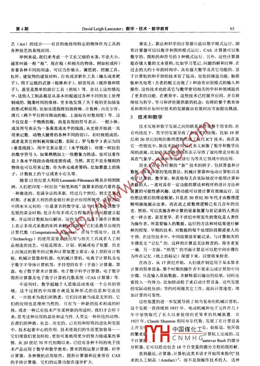 第13卷第4期數(shù)學(xué)教育學(xué)報(bào)Vol.13, No.42004年11月JOURNAL OF MATHEMATICS EDUCATIONNov, 2004數(shù)學(xué)●技術(shù)●數(shù)學(xué)教育David Leigh-Lancaster(維多利亞州課程和評(píng)價(jià)局,澳大利亞)摘要:數(shù)學(xué)可以部分地理解為是對(duì)數(shù)、邏輯、空間和結(jié)構(gòu)的功能和模式的研究.技術(shù)發(fā)展和數(shù)學(xué)發(fā)展之間的聯(lián)系貫穿整個(gè)歷史.無(wú)論是以手持還是以計(jì)算機(jī)操作平臺(tái)為基礎(chǔ),類似電子制表、動(dòng)態(tài)幾何系統(tǒng)、統(tǒng)計(jì)分析系統(tǒng)以及計(jì)算機(jī)代數(shù)系統(tǒng)等技術(shù)都提出了關(guān)于數(shù)學(xué)活動(dòng)本質(zhì)的問(wèn)題.在廣泛應(yīng)用新技術(shù)以促進(jìn)數(shù)學(xué)學(xué)習(xí)的準(zhǔn)備中,有兩個(gè)實(shí)際問(wèn)題需要解決:教師的專業(yè)發(fā)展和恰當(dāng)?shù)慕虒W(xué)資源的獲得.關(guān)鍵詞:數(shù)學(xué);數(shù)學(xué)教育:技術(shù):數(shù)學(xué)課程中圖分類號(hào): G434文獻(xiàn)標(biāo)識(shí)碼: A文章編號(hào): 1004 -9894 ( 2004) 040062 -05為確保學(xué)生獲得一定的方法、使用技術(shù)理解數(shù)學(xué)的過(guò)程,在1簡(jiǎn)介給定情景下所有可能應(yīng)用的方法和工具中進(jìn)行理智選擇,學(xué)本文考慮了學(xué)校數(shù)學(xué)課程中諸如計(jì)算器和其它信息交生智力和動(dòng)手技能的健全發(fā)展是必不可少的.學(xué)生需要發(fā)展流技術(shù)(ICT)等應(yīng)用中的- -些原則性和實(shí)踐性的問(wèn)題,以.種對(duì)所得結(jié)果是否合理的強(qiáng)烈意識(shí),不管有沒(méi)有借助于技及趨勢(shì)及策略.從維多利亞的角度出發(fā),考察了高中的數(shù)學(xué)術(shù),并且能夠識(shí)別一種數(shù)學(xué)表示的不同表達(dá)形式.這些是不課程.對(duì)這些問(wèn)題所作的全面、綜合的思考,是基于對(duì)以下同階段的課程中做數(shù)學(xué)的補(bǔ)充部分,并且合理地理解相關(guān)概幾個(gè)方面的研究:數(shù)學(xué)、數(shù)學(xué)教育和技術(shù)之間歷史與現(xiàn)實(shí)的念、技能和過(guò)程將鞏固它們?cè)诓煌碚摵蛯?shí)踐背景下的有效關(guān)系,數(shù)學(xué)和數(shù)學(xué)教育的歷史和哲學(xué),權(quán)威機(jī)構(gòu)、委員會(huì)、應(yīng)用這項(xiàng)工作將集中在數(shù)學(xué)關(guān)鍵方面:推理和表達(dá)、解答、理事會(huì)以及政府部門(mén)在歷史.上和目前所進(jìn)行的工作,這些部解釋和交流.其中,技術(shù)將在解決問(wèn)題和交流方面起到最大門(mén)是有關(guān)教學(xué)、課程和評(píng)價(jià)中計(jì)算器和其它ICT作用和應(yīng)的協(xié)助作用.用的.維多利亞課程和評(píng)價(jià)權(quán)威機(jī)構(gòu)(VCAA)是法定的機(jī)2技術(shù)構(gòu),負(fù)責(zé)從學(xué)前到12年級(jí)的課程和評(píng)價(jià).數(shù)學(xué)可以部分地理解為是對(duì)數(shù)、邏輯、空間和結(jié)構(gòu)的功Mathematics的詞根是Math,意思是Learn. Technology能和模式的研究.它提供了一種思考的結(jié)構(gòu)以及一種符號(hào)交對(duì)應(yīng)的詞根是Tekhne,意思是技藝(Ar)或者技能(Skill).技流的形式,這種結(jié)構(gòu)和符號(hào)形式是強(qiáng)大的、富有邏輯的、簡(jiǎn)術(shù)可以看作是技巧或技能(Tekhne)的系統(tǒng)應(yīng)用(Logia).拉明的、精確的,是一種人們可以借助于理解和處理周圍環(huán)境丁詞中同義詞Ars來(lái)源于英文單詞Art,現(xiàn)在的意思是“...的方式.基本的數(shù)學(xué)活動(dòng)包括計(jì)算、抽象、假設(shè)(猜想)、的技藝(the Artof)”.實(shí)際上,古英語(yǔ)Arte或者Artes常常證明、應(yīng)用、驗(yàn)證、建模和提出并解決問(wèn)題.在維多利亞,用在歷史文獻(xiàn)中,表示做某事的方法.例如Roberte Recorde從學(xué)前到12年級(jí)的數(shù)學(xué)課程的設(shè)計(jì),為學(xué)生提供了有價(jià)值的16世紀(jì)的算術(shù)課本名字是The Grounde of Artes--這是的、富有挑戰(zhàn)性的數(shù)學(xué)學(xué)習(xí)的途徑,它們?cè)谀撤N程度上考慮最早出現(xiàn)的用英語(yǔ)寫(xiě)作的文獻(xiàn),因此更加接近于普通大到了更廣泛學(xué)生的需要.同時(shí),課程的設(shè)計(jì)還促進(jìn)學(xué)生認(rèn)識(shí)眾.有意思的是,公元前1世紀(jì),古老的中國(guó)數(shù)學(xué)課本的名到在技術(shù)社會(huì)的日常生活中數(shù)學(xué)的重要性,以及提高學(xué)生有字叫做《九章算術(shù)》(Nine Chapters on the Mathematical效地使用數(shù)學(xué)思想、技術(shù)和方法處理問(wèn)題的自信心.Art),也是用的Art, 與前面提到的涵義相同.牛津詞典中課程設(shè)計(jì)的根本原則是所有學(xué)生將從事以下的數(shù)學(xué)活把“Art”解釋為“技能,不同于自然的人類的技能”,也解動(dòng): (I) 應(yīng)用知識(shí)和技能:通過(guò)學(xué)習(xí)和實(shí)踐數(shù)學(xué)的算法、程釋為“作為某種更高級(jí)學(xué)習(xí)的智力工具的某個(gè)知識(shí)門(mén)類”。比序和技巧,并使用它們找到解決問(wèn)題的方法來(lái)學(xué)習(xí)和掌握已較接近的一一個(gè)詞是“Artefact"人工制品,在字典上描述為經(jīng)存在的數(shù)學(xué)知識(shí)的不同方面: (2)建模、 研究和解決問(wèn)題:“經(jīng)過(guò)人類加工制作的
