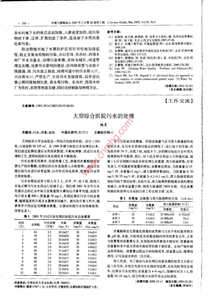 環(huán)境與健康雜忐20年5月第20卷第3期 J Environ health.Msy200,vu.20,w3表水向地下水的垂直運動加強,人滲速度加快,給污染參考文獻物的下滲、遷移、擴散創(chuàng)造了條件,造成地下水質的惡11宋燕燕張丹清薛燕萍澤世界衛(wèi)牛組織編飲用水的質量標準M].第3版.北京:人民衛(wèi)生出版社19974748化和污染。2]奚旦立.環(huán)境工程手冊.環(huán)境監(jiān)測卷M)北京高等教育出版社,防治措施對地下水源防護區(qū)有針對性地加強監(jiān)3」余德輝,城市污水處理及污染防治投術指南(M].北京:中國環(huán)境管,防止含氮有機物的污染:并以首體東冉村、酉郊木科學出版社.2001.127-133材廠井水為重點,治理污染來源,首體為城區(qū),河道管「4]張?zhí)婆?韓建國,譯.朱莉斯托弗(英),著.水危機M].北京科出版補2000123-128理是關鍵,完善污水管網的建設,沿河排放要與市政十5!孔景翔環(huán)境生物學M)等教育出版社,200.276-283線接通,雨污水獨立排放,封堵河道中的污水排人口4118-133只存雨水凵,嚴禁生產、生活污水直接排放,沿岸居民[7 Dahab MF. Lee YW. Rogardi L. A rule hased fuzzy set approachrisk analysis of nitrute-contaminated ground water (I). Water Sci禁止順河坡傾倒垃圾、糞水等污物。東冉村、西郊木材Technol.1994,4555廠為農村,農肥管理是關鍵,同時應研制新型種植方法。(收稿日期:2002-10本文編輯:陸麗敏【工作交流】文章編號:1001-5914(2003)0301600大型綜合醫(yī)院污水的處理魏青關鍵詞:污水;消毒;醫(yī)院中圖分類號:R1233文獻標識碼:C天津醫(yī)科大學總醫(yī)院是一所綜合性臨床醫(yī)院,床位102為了分析最佳投氯址,控制余氯量與殺滅糞大腸菌群的效張,占地面積50335m2從1988年建立醫(yī)院污水處理站以來,果和關系,在污水水質相對穩(wěn)定的情況下,進行如下的實驗我們通過監(jiān)測處理后水質排放數據,不斷地調整、改進污水處先取水樣24個,分成3組,每組8個,分別測出每組污水中糞大埋的工藝,使該醫(yī)院的污水處理技術不斷提高腸群的平均數值然后,對3組水樣分別加人不同量的氯,接污水處理采用調節(jié)、沉淀消毒工藝,消毒用次氯酸鈉發(fā)生觸1h后分別測出每組水樣處理后余氯量糞大腸菌群數,結果器生產的次氯酸,處理后的污水直接排入市政管網。通過對處見表2可見隨著投氯壁的增加,余氯坻也增加。當投氯量為25理后的污水進行經常監(jiān)測,以評價其凈化效果,使排放污水符mg/時,余氯量<2mg/,糞大腸菌群數超標。當投氯為30合排放標準。mL和35m1時,余氯量為4211,糞大腸菌群數的污水處理站設有々職人員5人,分早、中、夜3班,值班人指標均低于規(guī)定標準。由此可見,糞大腸菌群數隨著余氯的增加員每天填寫污水水質運行處理日志。我們將200年全年污水而減少,如果余氯豆合格,則糞大腸菌群00合格,用總余處理日志的記錄中每月余氯量按日累加后計算平均值醫(yī)院平檢測結果指導污水站的囗常工作比較方便實用均口排水量8001,投氯量30mg/1,發(fā)現(xiàn)處理后污水中的余氯量,隨著溫度的升高及水量增多而減少。提示在日常工作中,隨表2投氯余氯量與糞大腸菌群的關系(n=8,)著季節(jié)不同應適當調整加氯量,以保證醫(yī)院污水的消毒效果。樣品投氯余氯最糞大腸菌群數(個/結果見表l。mg/L) (mg/)水樣1表12001年不同月份處理后醫(yī)院污水總余氯量15±0.223900±1056332+6水樣224000±86污水處理水溫投氯量余氯時間水樣數(萬噸)(x±,℃)(mg/1)(x,mgL)6.ltO.l24000±92.220.30.73056±04次氯酸鈉發(fā)生器氯化消毒的效果除與污水中有機懸浮物含120.8±0.83054±0.5量pH值、水溫、污染程度及消毒接觸時間等因素有關外,主要2208305203與投氯量和余氯情有關,在其他相關因素基本穩(wěn)定時投氯和余氯量的多少成為消毒殺菌效果的最士要因素,必繃嚴格控制2531407304103這兩項指標。投氯量過低達不到消毒效果,投氯過高,既增加34.3±0.33.1+0.2345±03303.2±0,1費用,又可造成水體的次污染。綜上所述,為了保證污水處理后消毒殺菌的效果又不致引39x04起二次污染,并充分考慮污水處理的用鹽量、水電消耗等綜合成本,應保證污水處理后余氯量為46mg/L,接觸時間為h,投氯量30-35mg/L綜合醫(yī)院污水即可完全達標排放作者單位:天津醫(yī)科大學天神300052)(收稿日期:2021211修回日期:20030328)1作者簡介:魏青1967),女大本學歷,主管技師從事醫(yī)院環(huán)境保護工作。本文編輯:李國玲