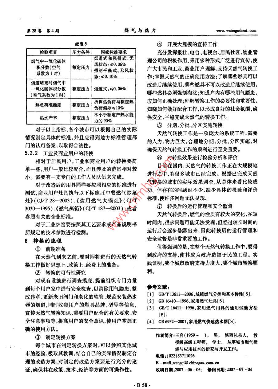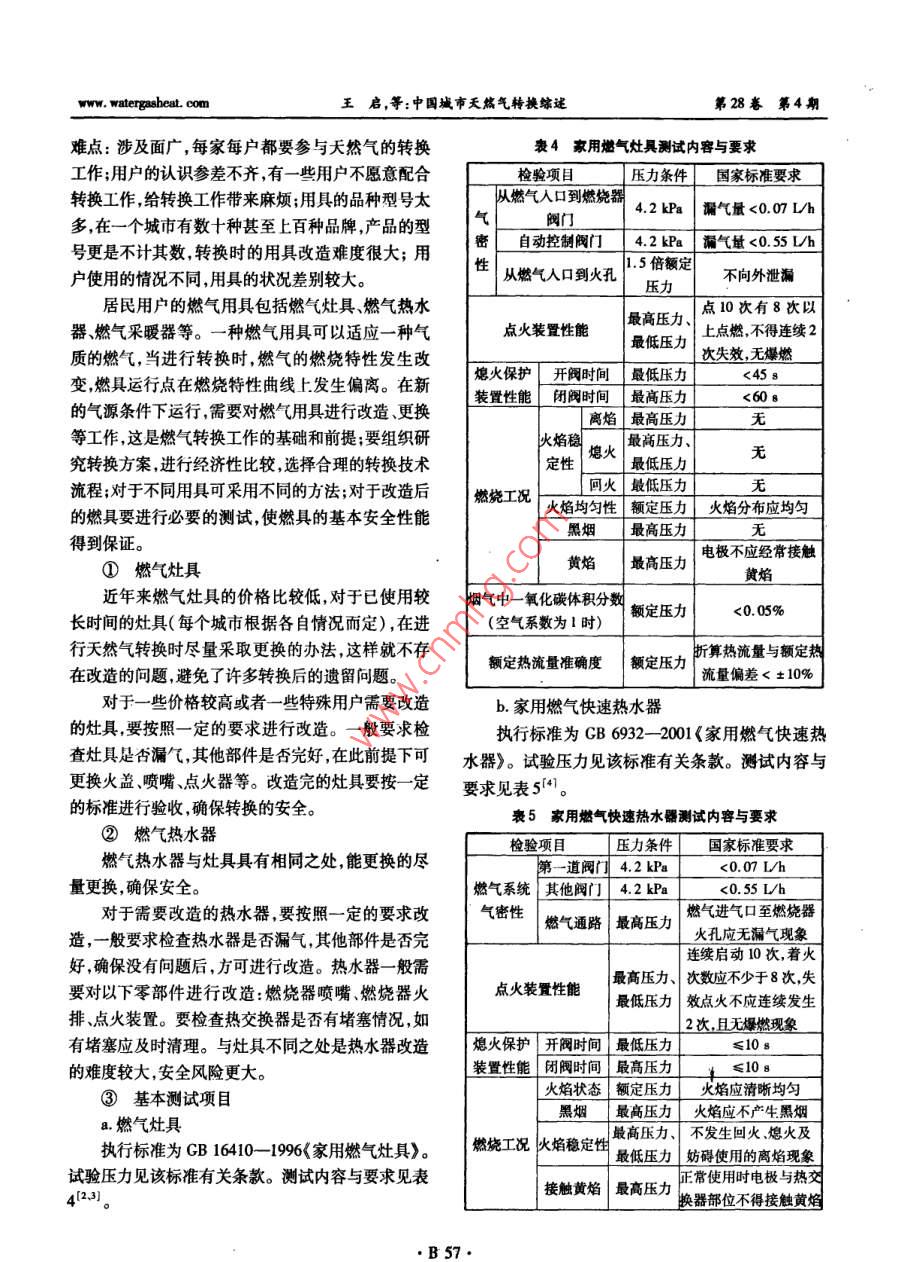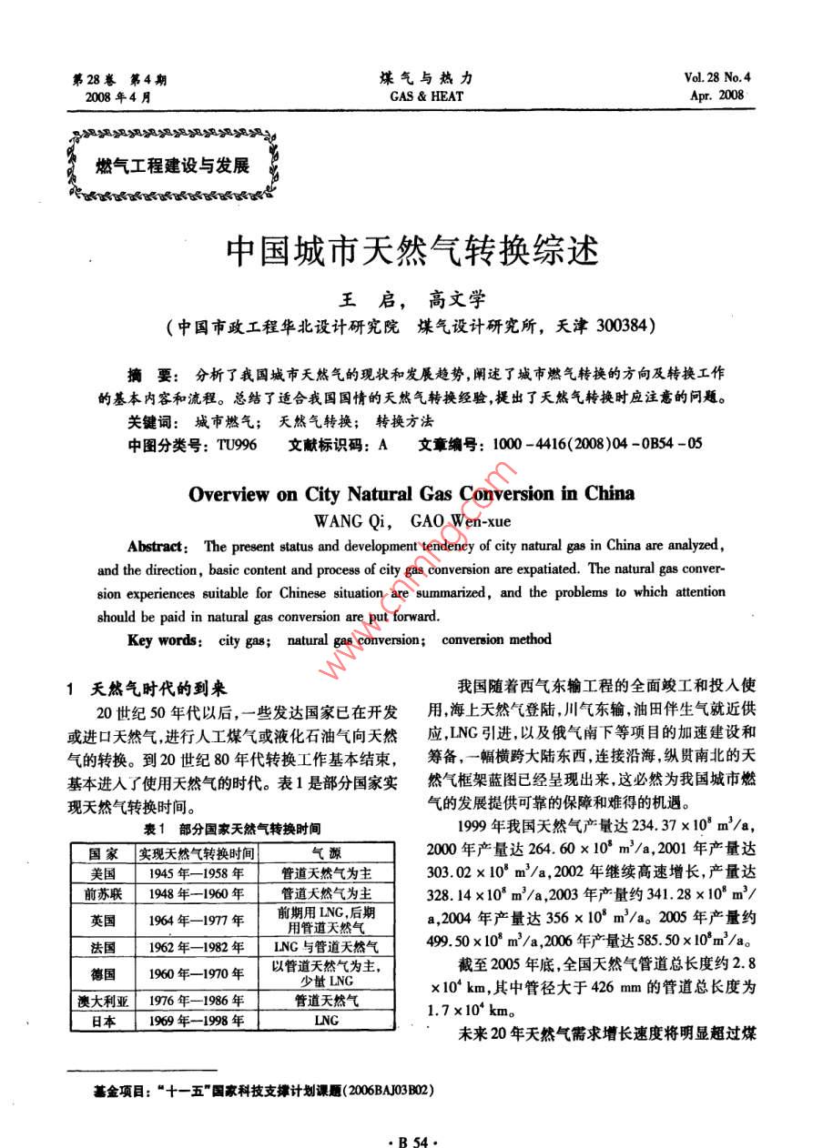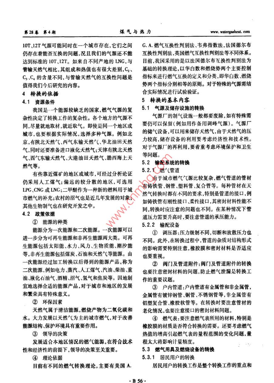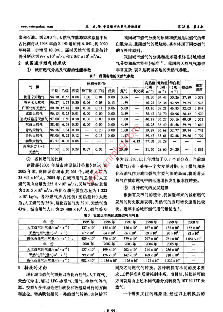第28卷第4期煤氣與熱力Vol. 28 No.42008年4月GAS & HEATApr.2008燃氣工程建設(shè)與發(fā)展中國城市天然氣轉(zhuǎn)換綜述王啟,高文學(xué)(中國市政工程華北設(shè)計研究院煤 氣設(shè)計研究所,天津300384)摘要:分析了我國城市天然氣的現(xiàn)狀和發(fā)展趨勢,闡述了城市燃氣轉(zhuǎn)換的方向及轉(zhuǎn)換工作的基本內(nèi)容和流程??偨Y(jié)了適合我國國情的天然氣轉(zhuǎn)換經(jīng)驗,提出了天然氣轉(zhuǎn)換時應(yīng)注意的問題。關(guān)鍵詞:城市燃氣; 天然氣轉(zhuǎn)換; 轉(zhuǎn)換方法中圖分類號: TU996文獻標識碼: A文靖 編號: 1000 - 4416(2008)04 -0B54 -05Overview on City Natural Gas Conversion in ChinaWANG Qi,GAO Wen-xueAbstract: The present status and development tendency of city natural gas in China are analyzed,and the direction, basic content and process of city gas conversion are expatiated. The natural gas conver-sion experiences suitable for Chinese situation are summarized, and the problems to which attentionshould be paid in natural gas conversion are put forward.Key words: ceity gas; natural gas conversion; conversion method1天然氣時代的到來我國隨著西氣東輸工程的全面竣工和投入使20世紀50年代以后,一些發(fā)達國家已在開發(fā)用,海上天然氣登陸,川氣東輸,油田伴生氣就近供或進口天然氣,進行人工煤氣或液化石油氣向天然應(yīng),LNG引進,以及俄氣南下等項目的加速建設(shè)和氣的轉(zhuǎn)換。到20世紀80年代轉(zhuǎn)換工作基本結(jié)束,籌備,一幅橫跨大陸東西,連接沿海,縱貫?zāi)媳钡奶旎具M入了使用天然氣的時代。表1是部分國家實然氣框架藍圖已經(jīng)呈現(xiàn)出來,這必然為我國城市燃現(xiàn)天然氣轉(zhuǎn)換時間。氣的發(fā)展提供可靠的保障和難得的機遇。表1部分國家天然氣轉(zhuǎn)換時間1999年我國天然氣產(chǎn)量達234.37 x 10* m'/a,國家實現(xiàn)天然氣轉(zhuǎn)換時間氣源2000年產(chǎn)量達264. 60x 10* m'/a,2001年產(chǎn)量達美國1945年一1958年管道天然氣為主303.02 x10* m'/a, 2002年繼續(xù)高速增長,產(chǎn)量達前蘇聯(lián)1948年一1960年328.14 x10* m'/a 2003年產(chǎn)量約341. 28x 10* m'/英國1964年-1977年前期用LNG后期a,2004年產(chǎn)量達356x 10* m/ao 2005 年產(chǎn)量約用管道天然氣法國1962年- -1982 年LNG與管道天然氣499. 50 x 10* m'/a ,2006年產(chǎn)量達585. 50 x 10*m'/a。德國1960年- -1970 年以管道天然氣為主,截至2005年底,全國天然氣管道總長度約2.8少量LNGx10* km,其中管徑大于426 mm的管道總長度為| 澳大利亞1976年一-1986 年管道天然氣1.7 x 10* km。日本1969年-1998年LNG .未來20年天然氣需求增長速度將明顯超過煤基金項目:“+-五”國家科技支撐計劃課題(2006BAJ03B02)●B54.www. watengaeheat. com王啟,等:中國城市天然氣轉(zhuǎn)換綜迷第28春第4期炭和石油。到2010年,天然氣在能源需求總量中所我國城市燃氣分類的原則和依據(jù)是以燃氣的華占比例將從1998年的2.1%增加到6.0%,到2020白數(shù)為主,兼顧燃氣的燃燒勢,基本體現(xiàn)了同類燃氣年將進-步增至10.0%。屆時天然氣需求量估計的互換性原則。將分別達到938 x 10* m'/a和2 037 x 10* m'/a。我國城市燃氣的分類和技術(shù)要求詳見《城鎮(zhèn)燃2我國城市燃氣的現(xiàn)狀氣分類和基本特性》標準"。我國的天然氣氣源也①城市燃氣分類及氣源的性能參數(shù)非常復(fù)雜,表2是我國各地的天然氣參數(shù)。表2我國各地的天然氣參數(shù)體積分數(shù)/%高熱值低熱值華白數(shù)氣源/(MJ. Y (MJ.(MJ●燃燒勢相對甲烷乙烷丙烷異丁烷正丁烷烷氮氣三氧化碳m2)|m2)|m)密度陜甘寧天然氣94.70 0.550.08 | 1.00 0.01 0.00 3.6638.20 34.47 50.26 37.89 0.578塔里木天然氣96.27 1.77 0.300.06 0.08 0.13 1.3940.27 36.36 52.99 | 39.85 I 0.578廣西北海天然氣80.38 12.481.80 0.08 0.11 0.06 5.0943.16 39.21 46.85 32.03 0.849成都天然氣96.15 0.250.01 0.00 0.00[ 0.00 3.5938.47 34.70 50.96 38.42 0.570忠武線輸送天然氣97.00 1.500.50 0.00 0.00 0.001.0040.18 36.27 53.16 | 40.09 0.571東海天然氣88.48 6.680.35 0.00 0.00 I 0.00 4.4940.28 36.40 I 51.58 39.39 0.610青島天然氣96.56 1.34 0.300.20 0.00 1.6039.89 36.68 52.77 39.74 0.742昌邑天然氣98.06 0.220.10.13 0.00 1.4739.47 35.61 52.58 39.56 0.729渤海大然氣83.57 8.08 | 0.084.14 4.13 37.02 | 33.29南海東方1-177.52 1.50 0.29| 0.07 0.03一20.5931.70 28.60 34.20一0. 862天然氣②各種燃氣的比例率為82.2% ,比上年增加了0.7個百分點。當前城建設(shè)部<2005年城市建設(shè)統(tǒng)計公報》顯示:到市燃氣行業(yè)正處在一個大發(fā)展時期,人工煤氣和液2005年末,我國設(shè)市城市共661個,城市人口為化石油氣作為城市燃氣主要氣源的局面,將隨著天35 894x10*人。2005 年,在城市用氣總量中,人工然氣在城市燃氣中的迅速增長發(fā)生根本性轉(zhuǎn)變。煤氣供應(yīng)總量為255.8x 10* m/a,天然氣供應(yīng)總量③各種燃氣的發(fā)展趨勢為210.5x 10* m/a,液化石油氣供應(yīng)總量為1222x10* kg/a。各種燃氣所占比例(按熱量計)大致根據(jù)有關(guān)部門的統(tǒng)計,我國近年來的城市燃氣為:人工煤氣為25% ,液化石油氣為32% ,天然氣為發(fā)展的歷史數(shù)據(jù)表明,天然氣的應(yīng)用增長速度比較43%。城市用氣人口為29 488x10*人,燃氣普及快。近年來的城市燃氣用氣量見表3。衰3我國近年來的城市燃氣用氣 t1995年1996年1997年1998年1999年2000年人工煤氣用氣量/(m’●al)127 x 10*135 x 10*126 x 10*167 x 10*132 x10152 x10*天然氣用氣量(m'●aI .67x10*64x10*66x10*69 x 10*80x 10*82 x10液化
