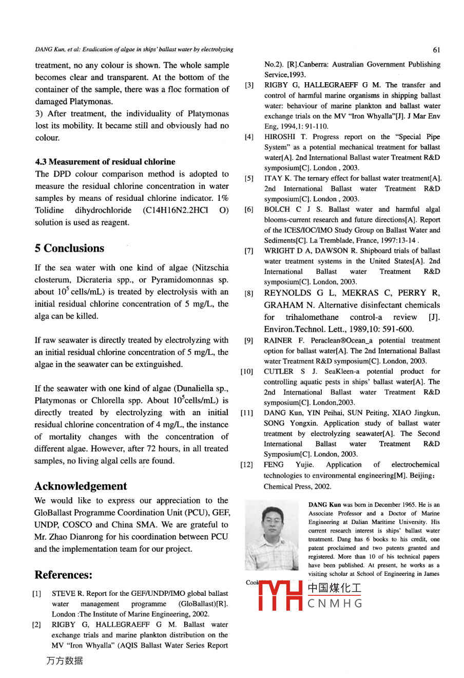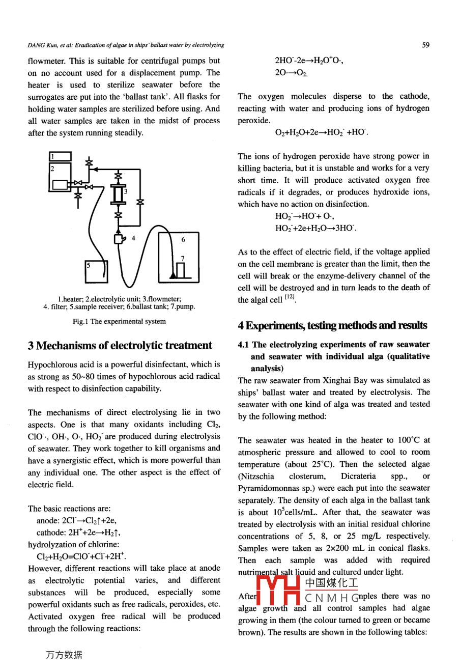 Joumal of Marine Science and Application, VolL.5, No.4, December 2006, pp.58-61Eradication of algae in ships' ballast water by electrolyzingDANG Kun', SUN Pei-ting', XIAO Jing-kun', and SONG Yong-xin'1. Marine Engineering College, Dalian Maritime University, Dalian 116026,China2. Environmental Science and Technology College, Dalian Maritime Universit, Dalian 116026,ChinaAbstract: In order to verify the effectiveness of electrolytic treatment on ships’ ballast water,experiments are carried out by a pilot system in laboratory. The raw seawater and seawater with differentconcentrations of different algae are simulated as ships' ballast water. The algae in the raw seawater canbe klled if it is treated by electrolysis with an initial residual chlorine concentration of5 mg/L. If theseawater with one kind of algae Nitzschia closterum, Dicrateria spp, or Pyramidomonnassp.10Cell/mL) is treated by electrolysis with an initial residual chlorine concentration of 5 mg/L, thealga can be sterilized. If the seawater with one kind of algae (Dunalella sp.. Platymonas or Chlorella spp.)is directly treated by electrolyzing with an initial residual chlorine concentration of 4 mg/L, the instantmortality changes with the concentration of dfiferent algac. However, after 72 hours, in all treatedsamples, there are no live algal cells found.Keywords: ships' ballast water; electrolysis; algacCLC number: U664.5 Document code: AArticle ID: 1671-9433(2006)04-058-041 Introductionseawater with different concentrations of Artemiasalinal".The introduction of invasive marine species into newenvironments by ships' ballast water, attached to2 Experimental systemships' hulls and via other vectors, has been identifiedby the Global Environment Facility (GEF) as one ofThe experimental system is ilustrated in Fig.1. Thehe four greatest threats to the world's oceans". Theexperimental system mainly consists of:other three are land-based sources of marine pollution,1) One storage tank 2.0 mx1.0 mx1.0 m;over-exploitation of living marine resources an2) One electrolytic unit. AC 440V, 50A (Applied DCphysical alteration/destruction of marine habitat.0V~12V), rated treatment capacity 2.5 m'/h.3) One portable submerged pump, centrifugal type,There are many technologies underdeveloped to treatwith a rated capacity of 3.0m'/h and a rated waterships ballast water, such as exchange at seal2 ,head of 2.5m;filtration(4,5),. heatingo, UV treatment', O3 treatment8!4) One floater type flowmeter with a measurementPeraclean@ Ocean treatment9), Seakleen treatment [10.scale of 0.1~3.0 m'/h;The work presented in this paper is from item 1B4C5) Large barrels, 4x120 L;(Electrolytic Treatment of Ships' Ballast Water and the6) Sample receivers.Development of a Ballast Water Treatment Unit) ofChina activities as part of Global Ballast WaterWhen experiments are being carried out, the seawaterManagementProgramme(GloBallastwill be pumped into the system by the submergedhtp://globallat.imo.org). The Project 1B4C waspump in the large barrel (simulated as ballast tank). Infinancially supported by GloBallast and China Oceanord'1e concentration, two中國(guó)煤化工、Shipping Company (COSCO Group). Before thmregulate the appliedpaper presented here, some experiments had beenvolYHCNMHGandthereare4gearsdone by directly electrolyzing raw seawater andon the control panel, which can be adjusted andregulated with applied voltage from 0V to 12V. AndReceived date: 2006-07-28.Foundation item: Supported by GloBallast. China Ilem 1B4C.another is to throttle the outlet valve before theDANG Kun, et al: Eradication of algae in ships' ballast water by electrolyzing59flowmeter. This is suitable for centrifugal pumps but2HO 2e- >H2o*o,on no account used for a displacement pump. The20- +O2.heater is used to sterilize seawater before thesurrogates are put into the ballast tank'. AIll flasks forThe oxygen molecules disperse to the cathode,holding water samples are sterilized before using. Andreacting with water and producing ions of hydrogenall water samples are taken in the midst of processperoxide.after the system running steadily.O2+H2O+2e- +HO2" +HO.The ions of hydrogen peroxide have strong power in*killing bacteria, but it is unstable and works for a very空short time. It will produce activated oxygen freeradicals if it degrades, or produces hydroxide ions,which have no action on disinfection.HO2*- +HO+ O,HO2* +2e+H2O- +3HO.6As to the effect of electric field, if the voltage appliedon the cell membrane is greater than the limit, then thecell will break or the enzyme delivery channel of the[]cell will be destroyed and in turn leads to the death of1.heater; 2ectrolytic unit; 3.flowmeter;the algal cell [121.4. filter; 5.sample receiver; 6.ballast tank; 7.pump.Fig.1 The experimental system4 Experiments, testing methods and results3 Mechanisms of electrolytic treatment4.1 The electrolyzing experiments of raw seawaterand seawater with individual alga (qualitativeHypochlorous acid is a powerful disinfectant, which isanalysis)as strong as 50~80 times of hypochlorous acid radicalThe raw seawater from Xinghai Bay was simulated aswith respect to disinfection capability.ships' ballast water and treated by electrolysis. Theseawater with one kind of alga was treated and testedThe mechanisms of direct electrolysing lie in twoby the following method:aspects. One is that many oxidants including Cl2,CIO*, OH, O, HO2 are produced during electrolysisThe seawater was heated in the heater to 100°C atof seawater. They work together to kill organisms andatmospheric pressure and allowed to cool to roomhave a synergistic effect, which is more powerful thantemperature (about 25°C). Then the selected algaeany individual one. The other aspect is the effect of(Nitzschiaclosterum,DicrateriaSPP., orelectric field.Pyramidomonnas sp.) were each put into the seawaterseparately. The density of each alga in the ballast tankThe basic reactions are:is about 10'cells/mL. After that, the seawater wasanode: 2CI-