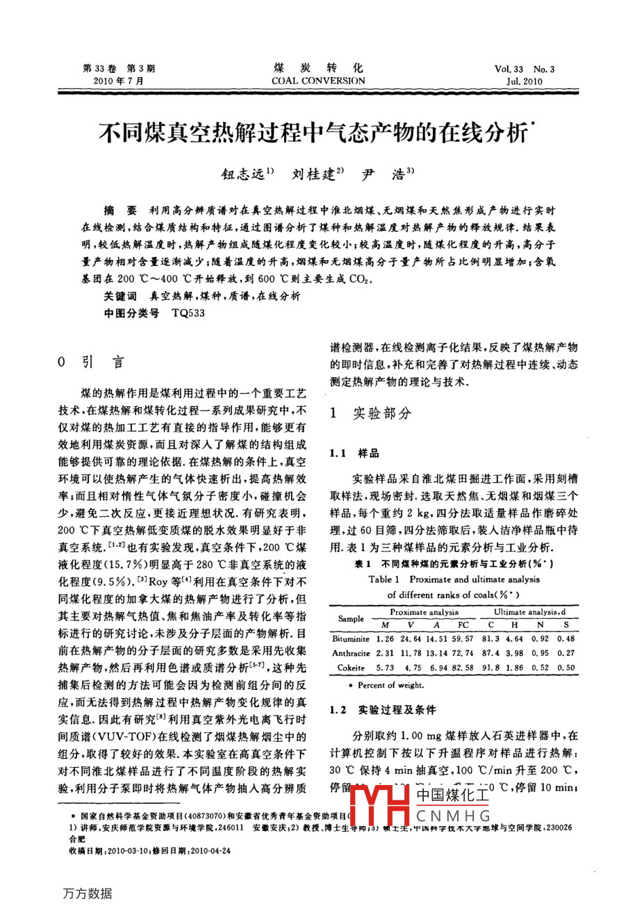 第33卷第3期煤炭轉(zhuǎn)化Vol 33 No. 32010年7月COAL CONVERSIONJul.2010不同煤真空熱解過(guò)程中氣態(tài)產(chǎn)物的在線分析鈕志遠(yuǎn)》劉桂建2尹浩3摘要利用高分辨質(zhì)譜對(duì)在真空熱解過(guò)程中淮北煙煤、無(wú)煙煤和天然焦形成產(chǎn)物進(jìn)行實(shí)時(shí)在線檢測(cè),結(jié)合煤質(zhì)結(jié)構(gòu)和特征,通過(guò)圖譜分析了煤種和熱解溫度對(duì)熱解產(chǎn)物的釋放規(guī)律.結(jié)果表明,較低熱解溫度時(shí),熱解產(chǎn)物組成隨煤化程度變化較小;較高溫度時(shí),隨煤化程度的升高,高分子量產(chǎn)物相對(duì)含量逐漸減少;隨著溫度的升高,煙煤和無(wú)煙煤高分子量產(chǎn)物所占比例明顯增加;含氧基團(tuán)在200℃~400℃開(kāi)始釋放,到600℃則主要生成CO2關(guān)鍵詞真空熱解,煤種,質(zhì)譜,在線分析中圖分類號(hào)TQ533譜檢測(cè)器,在線檢測(cè)離子化結(jié)果,反映了煤熱解產(chǎn)物0引言的即時(shí)信息,補(bǔ)充和完善了對(duì)熱解過(guò)程中連續(xù)、動(dòng)態(tài)測(cè)定熱解產(chǎn)物的理論與技術(shù)煤的熱解作用是煤利用過(guò)程中的一個(gè)重要工藝技術(shù),在煤熱解和媒轉(zhuǎn)化過(guò)程一系列成果研究中,不1實(shí)驗(yàn)部分僅對(duì)煤的熱加工工藝有直接的指導(dǎo)作用,能夠更有效地利用煤炭資源,而且對(duì)深入了解煤的結(jié)構(gòu)組成能夠提供可靠的理論依據(jù)在煤熱解的條件上,真空1.1樣品環(huán)境可以使熱解產(chǎn)生的氣體快速析出,提高熱解效實(shí)驗(yàn)樣品采自淮北煤田掘進(jìn)工作面,采用刻槽率;而且相對(duì)惰性氣體氣氛分子密度小,碰撞機(jī)會(huì)取樣法,現(xiàn)場(chǎng)密封.選取天然焦、無(wú)煙煤和煙煤三個(gè)少,避免二次反應(yīng),更接近理想狀況.有研究表明,樣品,每個(gè)重約2kg,四分法取適量樣品作磨碎處200℃下真空熱解低變質(zhì)煤的脫水效果明顯好于非理,過(guò)60目篩,四分法篩取后,裝人潔凈樣品瓶中待真空系統(tǒng).2也有實(shí)驗(yàn)發(fā)現(xiàn),真空條件下,200℃煤用表1為三種煤樣品的元素分析與工業(yè)分析液化程度(15.7%)明顯高于280℃非真空系統(tǒng)的液表1不同煤種煤的元素分析與工業(yè)分析(%”化程度(9.5%).3Roy等利用在真空條件下對(duì)不Table 1 Proximate and ultimate analysis同煤化程度的加拿大煤的熱解產(chǎn)物進(jìn)行了分析,但of different ranks of coals(%.)其主要對(duì)熱解氣熱值、焦和焦油產(chǎn)率及轉(zhuǎn)化率等指Proximate analysisUltimate analysis, d標(biāo)進(jìn)行的研究討論,未涉及分子層面的產(chǎn)物解析.目Bituminite1.2624.6414.5159.5781.34.640.920.48前在熱解產(chǎn)物的分子層面的研究多數(shù)是采用先收集 Anthracite2.3l1.7813.14727487.43.980.950.27熱解產(chǎn)物,然后再利用色譜或質(zhì)譜分析,這種先 Cokeit5.734.756.9482.5891.81.860.520.50捕集后檢測(cè)的方法可能會(huì)因?yàn)闄z測(cè)前組分間的反應(yīng),而無(wú)法得到熱解過(guò)程中熱解產(chǎn)物變化規(guī)律的真實(shí)信息因此有研究利用真空紫外光電離飛行時(shí)1.2實(shí)驗(yàn)過(guò)程及條件間質(zhì)譜( VUV-TOF)在線檢測(cè)了煙煤熱解煙塵中的分別取約1.00mg煤樣放入石英進(jìn)樣器中,在組分,取得了較好的效果.本實(shí)驗(yàn)室在高真空條件下計(jì)算機(jī)控制下按以下升溫程序?qū)悠愤M(jìn)行熱解:對(duì)不同淮北煤樣品進(jìn)行了不同溫度階段的熱解實(shí)30℃保持4min抽真空,100℃/min升至200℃驗(yàn),利用分子泵即時(shí)將熱解氣體產(chǎn)物抽入高分辨質(zhì)停中國(guó)煤化工0℃,停留國(guó)家自然科學(xué)基金資助項(xiàng)目(40873070)和安徽省優(yōu)秀青年基金資助項(xiàng)目CNMHG1)講師安慶師范學(xué)院資源與環(huán)境學(xué)院,246011安徽安慶;2)教授博土生導(dǎo)卿5中國(guó)科字不大手地球與空間學(xué)院,230026合肥收稿日期:201003-10修回日期:20100424煤炭轉(zhuǎn)化2010年100℃/min升至600℃,停留10min,總計(jì)39.7min利用分子泵即時(shí)將熱解氣體產(chǎn)物抽入高分辨質(zhì)譜檢測(cè)器,經(jīng)離子化,得到混合物質(zhì)荷(質(zhì)量/電荷)比的質(zhì)譜圖,根據(jù)精確質(zhì)量數(shù)對(duì)熱解產(chǎn)物進(jìn)行定性分析,通過(guò)總離子流量圖峰強(qiáng)度進(jìn)行半定量分析實(shí)驗(yàn)在中國(guó)科學(xué)技術(shù)大學(xué)合肥微尺度物質(zhì)科學(xué)systemproceas syste國(guó)家實(shí)驗(yàn)室完成.實(shí)驗(yàn)裝置見(jiàn)圖1.熱解體系真空度控制在7.34ePSI(0.5e-MPa)以下.質(zhì)譜型號(hào)圖1熱解實(shí)驗(yàn)裝置和工作條件見(jiàn)表2.Fig 1 Device of pyrolysis experiment表2質(zhì)譜測(cè)試條件Table 2 Parameter of mass spectrographModelMass range/Da1/z deviation/SensitivityAccuracy/Micromass250El(70 ev)1500El:l pg HCB>5000FwHM·)Full wave at half maximum.1.3質(zhì)量控制空白實(shí)驗(yàn)只檢測(cè)到背景物質(zhì)以及少量空氣的分50010001500200025.003000350040004500子離子峰,滿足真空度小于7.34e-PsI的實(shí)驗(yàn)要求同一樣品的5次重復(fù)實(shí)驗(yàn)結(jié)果分子離子峰強(qiáng)度差距最大不超過(guò)9%.以上結(jié)果表明,實(shí)驗(yàn)數(shù)據(jù)精確500100015002000250030003500可靠,為本次研究和分析提供了保障Time/min2結(jié)果與討論2.1不同煤化程度對(duì)熱解產(chǎn)物的影響圖2熱解總離子流量煤