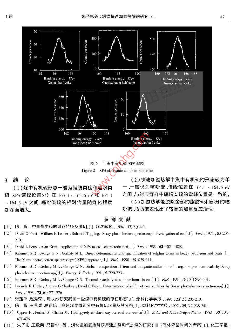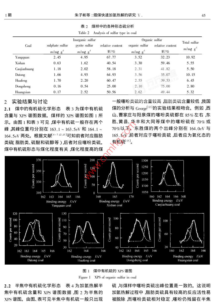 第29卷第1期燃料化學(xué)學(xué)報(bào)Vol, 29 No I201年2月JOURNAL OF FUEL CHEMISTRY AND TECHNOLOGYFeb. 2001文章編號(hào):0253-240X2001)1004405煙煤快速加氬熱解的研究Ⅴ.煤和半焦中有機(jī)硫化學(xué)形態(tài)剖析朱子彬,朱宏斌,吳勇強(qiáng),唐黎華,陳玲君,徐志剛(華東理工大學(xué),上海200237)摘要∶采用ⅹ技術(shù)分析了我國(guó)以煙煤為主的七種煤樣以及對(duì)應(yīng)的快速加氬熱解半焦中有機(jī)硫的化學(xué)形態(tài)。煤中有機(jī)硫一般為脂肪類硫與噻吩類硫其譜峰位置分別在163.1-163.5V和164.~-164.5V之間。噻吩類硫的相對(duì)含量隨煤化程度而増大。半焦中一般只殘留噻吩類硫溍峰位置在164.1-164.5-與對(duì)應(yīng)煤中噻吩硫的譜峰位置是一致的。在加氫熱解過(guò)程中全部脂眆類硫和部分噻吩類硫被脫除脂眆類硫表現(xiàn)岀很髙旳加氫反應(yīng)活性關(guān)鍵詞:煤;快速加氫熱解;硫形態(tài);ⅹ中圖分類號(hào):TQ530.2文獻(xiàn)標(biāo)識(shí)碼:A研究煤中有機(jī)硫的形態(tài)對(duì)于控制煤燃燒所引加氬熱解過(guò)程中的變化規(guī)律。起的硫氧化物污染具有重要意文。將電子能譜XPs X-ray Photoelectron Spectros運(yùn)用到煤的分1實(shí)驗(yàn)部分1.1實(shí)驗(yàn)裝置與分析方法煤快速加氫熱解的實(shí)析上為煤中有機(jī)硫的化學(xué)形態(tài)非破壞性分析提供驗(yàn)裝置見(jiàn)文獻(xiàn)11對(duì)煤樣和半焦進(jìn)行XFS分析了一種新的手段。Fm「2最早采用XPS分析了煤中采用PH5300FSCA譜儀使用MgKa為發(fā)射源,步硫的化學(xué)形態(tài)。Pem31研究的X譜圖中硫有兩長(zhǎng)O.leV,最低分辨率為0.1%粉末樣使用 Scotch峰分別對(duì)應(yīng)為有機(jī)硫與硫酸鹽硫。 Kelemen[4-6]帶固定采用C,284.6eV為內(nèi)標(biāo)校正荷電位移并采的研究表明煤中有機(jī)硫分別為脂肪類硫與噻吩類硫。Hit!φ對(duì)煤酸洗脫灰處理未改變煤中有杋硫用orin軟件根據(jù)優(yōu)化算法對(duì)岀峰進(jìn)行Gaus擬合。ⅹS出峰位置,并消除了無(wú)機(jī)硫的影響。國(guó)內(nèi)學(xué)者1.2試樣選用我國(guó)煤化程度不同的七種煤樣亦對(duì)我國(guó)煤中有機(jī)硫形態(tài)進(jìn)行了分柝3。煤的快其樣品粉碎到60~80目對(duì)其進(jìn)行快速加氫熱解。速加氫熱解是潔凈煤利用新技術(shù),該工藝具有顯著為避免無(wú)機(jī)硫與有機(jī)硫同時(shí)岀峰對(duì)有機(jī)硫ⅹS譜圖的脫硫效果"。本文運(yùn)用ⅹPS分析了我國(guó)以煙煤的干擾本實(shí)驗(yàn)對(duì)所得半焦與煤樣在ⅫS分析前粉碎為主的七種煤并同時(shí)分析了加氫熱解后所得半焦至200目進(jìn)行酸洗脫灰份處理以。煤樣的元素分析中的有機(jī)硫以考察我國(guó)煤中有機(jī)硫的形態(tài)以及在與工業(yè)分析見(jiàn)表1各種形態(tài)硫的分析見(jiàn)表2。表1煤樣的工業(yè)分析和元素分析Table 1 analysis data of coalProximate analysis W/% dry H/CUltimate analysis w/% dafatom) CHS12.6229.6357.750.52486.263.821.511.556.8613.5819.2214.6171.550.7185.195.031.560.647.588.7364.940.77182,794.651.081.1110.3732.409.0258.580.79481.595.401.820.7110.4833.568.8257.620.72375.074.541.250.3118.8huangxian41.299.4149.301.10775.016.881570.591595關(guān) by difference收稿日期:20005-22;修回日期:20008-121期朱子彬等:煙煤快速加氫熱解的研究Ⅴ45表2煤樣中的各種形態(tài)硫分析Table 2 Analysis of sulfur type in coalInorganic sulfuOrganic sulfurTotal sulfurCoalsulphate sulfur pyrite sulfur relative content organic sulfur relative contentW/%W/%2.4567.773.5232.2310.920.631.6240.543.301.182.0258.182.3164.933.5635.0710.151.702.2060,472.5539.530.160.542.102,800.1749.442實(shí)驗(yàn)結(jié)果與討論般噻吩類硫的含量較高脂肪類硫含量較低我國(guó)2.1煤中的有機(jī)硫化學(xué)形態(tài)表3為煤中有機(jī)硫煤的分析與 george!的實(shí)驗(yàn)結(jié)果相吻合。例如西含量與XPS譜圖數(shù)據(jù)。煤樣的ⅹ譜圖如圖1所山、曹家莊與陽(yáng)泉煤的噻吩類硫都在85%左右,東示。由圖1和表3可見(jiàn)煤中有機(jī)硫一般存在兩個(gè)勝、黃縣、華豐和大同等煤中的噻吩硫在70%或峰其峰位置均分別在163.1~163.5eV和164.1~70%以下。東勝煤的兩個(gè)出峰分別在164.0eV與164.5cV兩處。根據(jù)文獻(xiàn)←1B3可知前者對(duì)應(yīng)脂肪165.leV前者對(duì)應(yīng)于噻吩類硫,后者應(yīng)為氧化態(tài)的類硫脂肪類、硫醚和硫醇等)后者對(duì)應(yīng)噻吩類硫。有機(jī)硫。煤中有杋硫形態(tài)與煤化程度有關(guān)煤化程度高的煤370105062163164165166160706016264166168Binding energy E/evBinding energy E/eVBinding cncrgy E/cVtshan coaCaojiazhuang coal8016640160162164166rgy ElevBinding encrgy E/cVBinding cnergy F/eVBinding energy evHuangxian coal圖1煤中有機(jī)硫的XFS譜圖Figure 1 XPs of organic sulfur in coal2.2半焦中有機(jī)硫化學(xué)形態(tài)表4為加氫熱解半硫與煤樣中噻吩類硫?qū)绶逦恢檬且恢碌?。這說(shuō)明焦中有機(jī)硫含量和ⅹⅣS譜圖數(shù)據(jù),圖2為半焦的加氫熱解過(guò)程中脂肪類硫具有較高的反應(yīng)活性易XⅣSs譜圖。由圖、表可見(jiàn)半焦中有機(jī)硫一般只岀現(xiàn)被脫除而噻吩類硫相對(duì)穩(wěn)定,噻吩仍殘留在半焦燃料化學(xué)學(xué)報(bào)卷脂肪類硫的存在。本研究在快速加氬條件下進(jìn)行,右。由表4可見(jiàn),半焦中存在的主要是噻吩類硫。我國(guó)七種煤中的脂肪類硫被全部地脫除噻吩硫化物非常穩(wěn)定,難