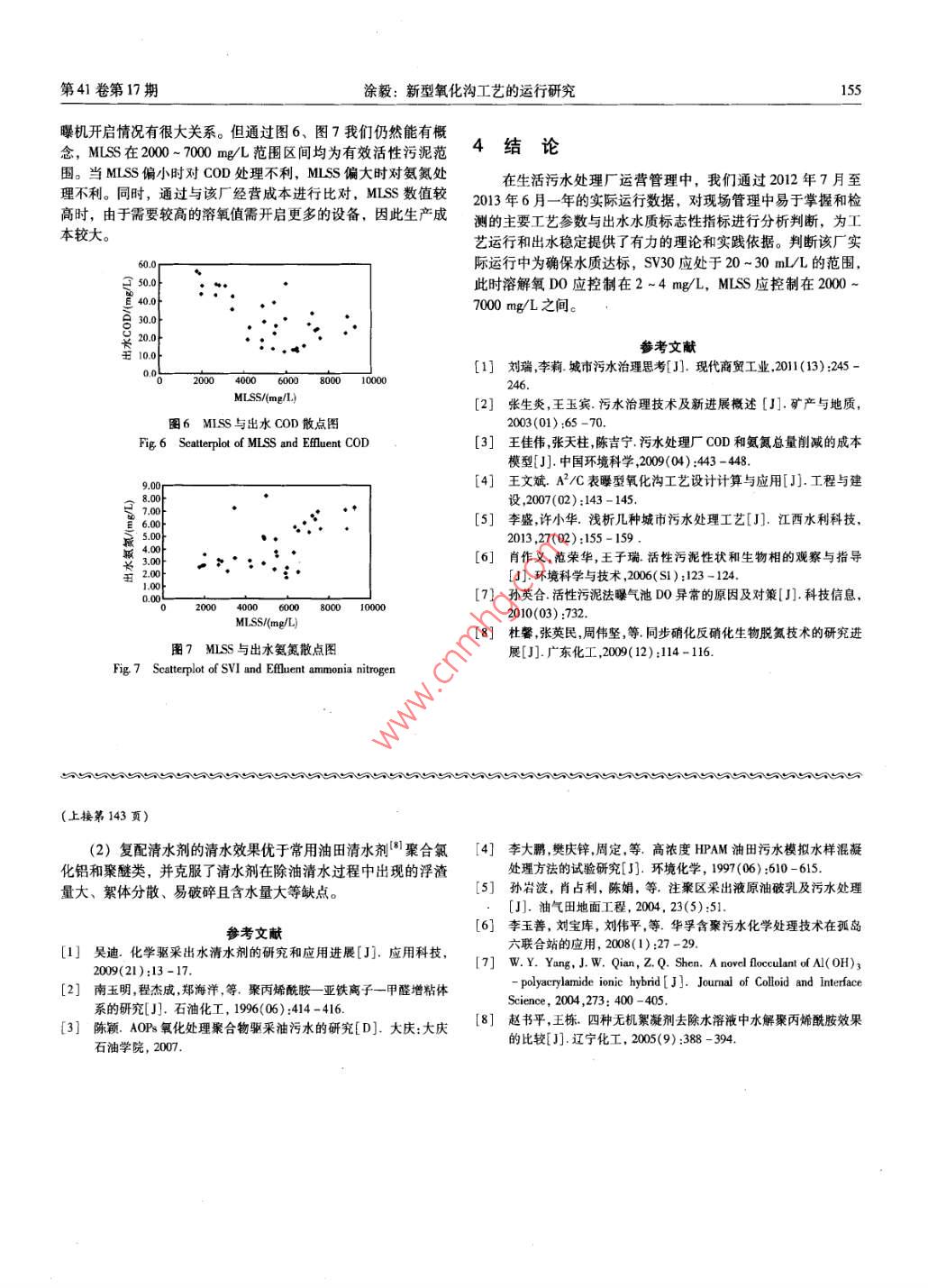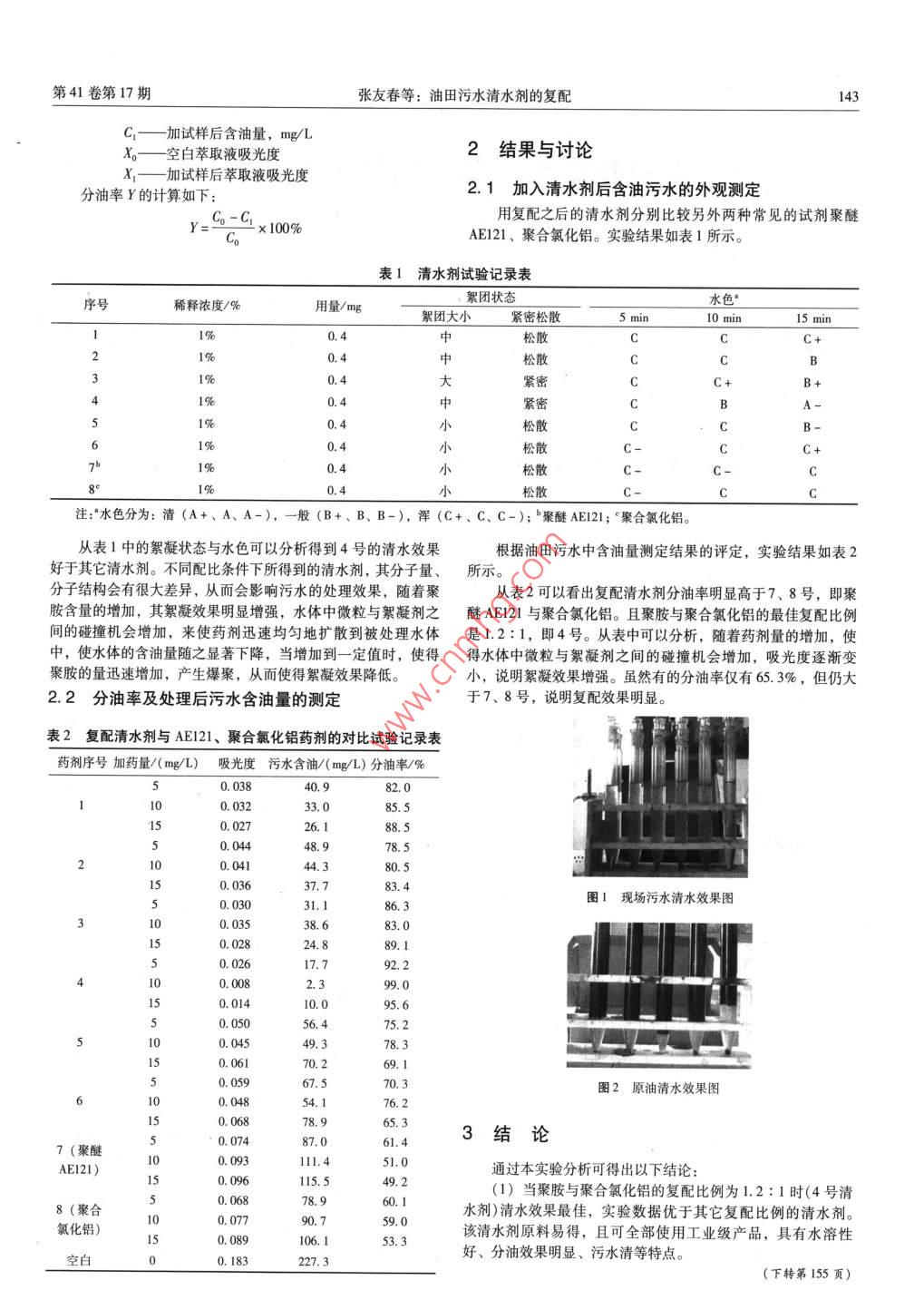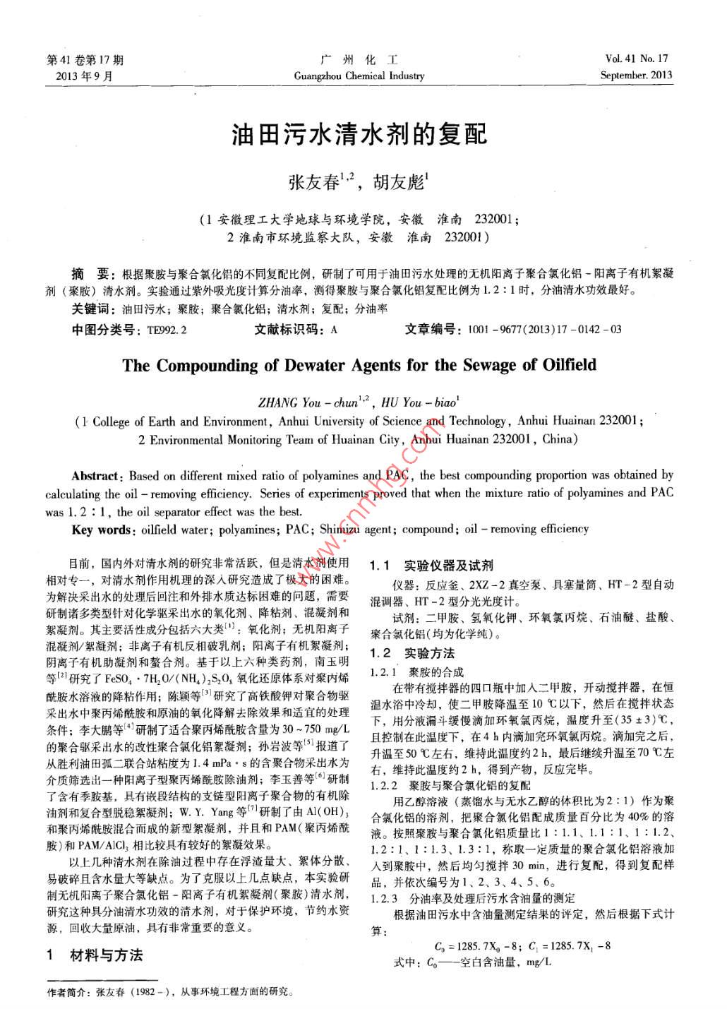 第41卷第17期廣州化工Vol.41 No. 172013年9月Guangzhou Chemical IndustrySeptember. 2013油田污水清水劑的復(fù)配張友春,胡友彪'(1安徽理工大學(xué)地球與環(huán)境學(xué)院,安徽淮南232001;2淮南市環(huán)境監(jiān)察大隊(duì),安徽淮南232001)摘要:根據(jù)聚胺與聚合氯化鋁的不同復(fù)配比例,研制了可用于油田污水處理的無(wú)機(jī)陽(yáng)離子聚合氯化鋁-陽(yáng)離子有機(jī)絮凝劑(聚胺)清水劑。實(shí)驗(yàn)通過(guò)紫外吸光度計(jì)算分油率,測(cè)得聚胺與聚合氯化鋁復(fù)配比例為1.2:1時(shí),分油清水功效最好。關(guān)鍵詞:油田污水;聚胺;聚合氯化鋁;清水劑;復(fù)配;分油率中圖分類號(hào): TE992. 2文獻(xiàn)標(biāo)識(shí)碼: A文章編號(hào): 1001 -9677(2013)17 -0142 -03The Compounding of Dewater Agents for the Sewage of OilfieldZHANG You - chun'r, HU You - biao'(1 Collge of Earth and Environment, Anhui Univrsity of Science and Technology , Anhui Huainan 232001;2 Environmental Monitoring Team of Huainan City ,Anhui Huainan 232001, China)Abstract: Based on different mixed ratio of polyamines and PAC, the best compounding proportion was obtained bycalculating the oil - removing fficiency. Series of experiments proved that when the mixture ratio of polyamines and PACwas 1.2 : 1, the oil separator effect was the best.Key words: oilfield water; polyamines; PAC; Shimizu agent; compound; oil - removing efficiency目前,國(guó)內(nèi)外對(duì)清水劑的研究非常活躍,但是清水劑使用1.1實(shí)驗(yàn)儀器及試劑相對(duì)專一,對(duì)清水劑作用機(jī)理的深入研究造成了極大的困難。儀器:反應(yīng)釜、2XZ.-2真空泵、具塞量簡(jiǎn)、HT-2型自動(dòng)為解決采出水的處理后回注和外排水質(zhì)達(dá)標(biāo)困難的問(wèn)題,需要混調(diào)器、HT-2型分光光度計(jì)。研制諸多類型針對(duì)化學(xué)驅(qū)采出水的氧化劑、降粘劑、混凝劑和試劑:二甲胺、氫氧化鉀、環(huán)氣氯丙烷、石油醚、鹽酸、絮凝劑。其主要活性成分包括六大類”:氧化劑;無(wú)機(jī)陽(yáng)離子聚合氯化鋁(均為化學(xué)純)?;炷齽?絮凝劑;非離子有機(jī)反相破乳劑;陽(yáng)離子有機(jī)絮凝劑;1.2 實(shí)驗(yàn)方法陰離子有機(jī)助凝劑和螯合劑。基于以上六種類藥劑,南玉明1.2.1聚胺的合成等[21研究了FeSO, . 7H20/(NH4)2SO,氧化還原體系對(duì)聚內(nèi)烯在帶有攪拌器的四口瓶中加入二甲胺,開(kāi)動(dòng)攪拌器,在恒酰胺水溶液的降粘作用;陳穎等(研究了高鐵酸鉀對(duì)聚合物驅(qū)溫水浴中冷卻,使二甲胺降溫至10 C以下,然后在攪拌狀態(tài)采出水中聚丙烯酰胺和原油的氧化降解去除效果和適宜的處理下,用分液漏斗緩慢滴加環(huán)氧氯丙烷,溫度升至(35士3)C,條件;李大鵬等4研制了適合聚丙烯酰胺含量為30 ~750 mg/L且控制在此溫度下,在4 h內(nèi)滴加完環(huán)氧氯丙烷。滴加完之后,的聚合驅(qū)采出水的改性聚合氯化鋁絮凝劑;孫巖波等[5 報(bào)道了升溫至50 C左右,維持此溫度約2 h,最后繼續(xù)升溫至70 C左從勝利油田孤二聯(lián)合站粘度為1. 4 mPa .s的含聚合物采出水為右,維持此溫度約2h,得到產(chǎn)物,反應(yīng)完畢。介質(zhì)篩選出一種陽(yáng)離子型聚丙烯酰胺除油劑;李玉善等(6]研制1.2.2聚胺與聚合氣化鋁的復(fù)配了含有季胺基,具有嵌段結(jié)構(gòu)的支鏈型陽(yáng)離子聚合物的有機(jī)除用乙醇溶液(蒸餾水與無(wú)水乙醇的體積比為2:1)作為聚油劑和復(fù)合型脫穩(wěn)絮凝劑; w. Y. Yang 等1]研制了由Al( 0H);合氯化鋁的溶劑,把聚合氯化鋁配成質(zhì)量百分比為40%的溶和聚丙烯酰胺混合而成的新型絮凝劑,并且和PAM(聚丙烯酰液。按照聚胺與聚合氯化鋁質(zhì)量比1 :1.1、1.1 :1. 1 : 1.2、胺)和PAM/AIC,相比較具有較好的絮凝效果。1.2:1、1:1.3、1.3:1,稱取一定質(zhì)量的聚合氣化鋁溶液加以上幾種清水劑在除油過(guò)程中存在浮渣量大、絮體分散、人到聚胺中,然后均勻攪拌30 min,進(jìn)行復(fù)配,得到復(fù)配樣易破碎且含水量大等缺點(diǎn)。為了克服以上幾點(diǎn)缺點(diǎn),本實(shí)驗(yàn)研品,并依次編號(hào)為1、2、3、4、5、6。制無(wú)機(jī)陽(yáng)離子聚合氯化鋁-陽(yáng)離子有機(jī)絮凝劑(聚胺)清水劑,1.2.3分油率及處理后污水含油量的測(cè)定研究這種具分油清水功效的清水劑,對(duì)于保護(hù)環(huán)境,節(jié)約水資根據(jù)油田污水中含油量測(cè)定結(jié)果的評(píng)定,然后根據(jù)下式計(jì)源,回收大量原油,具有非常重要的意義。算:Cg=1285.7X。-8; C =1285.7X -81材料與方法式中: C。--空白含油量, mg/L作者簡(jiǎn)介:張友春(1982 -),從事環(huán)境工程方面的研究。第41卷第17期張友春等:油田污水清水劑的復(fù)配143加試樣后含油量,mg/LX。一空白萃取液吸光度2結(jié)果與討論X一-加試樣后萃取液吸光度分油率Y的計(jì)算如下:2.1加入清水劑后 含油污水的外觀測(cè)定Y=Co-C-x 100%用復(fù)配之后的清水劑分別比較另外兩種常見(jiàn)的試劑聚醚CAEI21、聚合氯化鋁。實(shí)驗(yàn)結(jié)果如表1所示。表1清水劑試驗(yàn)記錄表序號(hào)稀釋濃度/%用量/mg絮團(tuán)狀態(tài)水色絮團(tuán)大小緊密松散5 min10 min15 min%0.4中C+松散緊密+BB-70小C-注:"水色分為:清(A+、A、A-),一般(B+、B、B-),渾(C+、C、C-); "聚醚AEI21; °聚合氯化鋁。從表1中的絮凝狀態(tài)與水色可以分析得到4號(hào)的清水效果根據(jù)油田污水中含油量測(cè)定結(ji
