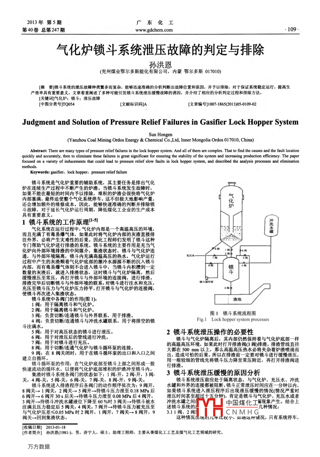 2013年第5期廣東化工第40卷總第247期www.gdchem.com109氣化爐鎖斗系統(tǒng)泄壓故障的判定與排除孫洪恩(兗州煤業(yè)鄂爾多斯能化有限公司,內(nèi)蒙鄂爾多斯017010)[摘要鎖斗系統(tǒng)的泄壓故障種類繁多而復(fù)雜,能夠迅速準(zhǔn)確的分析判斷出故障位置和原因,并予以排除,對于保證系統(tǒng)穩(wěn)定運(yùn)行,提高生產(chǎn)效率具有重要意義。文章著重闡述了多種可能引發(fā)鎖斗系統(tǒng)泄壓緩慢故障的誘因,并介紹了相應(yīng)的分析判定過程和排除方法。[關(guān)鍵詞]氣化爐;鎖斗:泄壓故障[中圖分類號TQ054[文獻(xiàn)標(biāo)識碼]A[文章編號]1007-1865(2013)05010902Judgment and Solution of Pressure Relief Failures in Gasifier Lock Hopper SystemSun Honger(Yanzhou Coal Mining Ordos Energy Chemical Co, Ltd, Inner Mongolia Ordos 017010, ChinaAbstract: There are many types of pressure relief failures in the lock hopper system. And all of them are complex. That to find the causes and the fault lodquickly and accurately, then to eliminate these failures is great significant for ensuring the stability of the system and increasing production efficiency. Thefocused on a variety of inducements that could lead to pressure relief slow faults in lock hopper system, and described the analysis processes and eliminationmethodsKeywords: gasifier: lock hopper: pressure relief failure爐在連續(xù)生產(chǎn)過程中不斷產(chǎn)生的爐渣。當(dāng)鎖斗系統(tǒng)發(fā)生故障時(shí)如果不能在最短的時(shí)間內(nèi)予以排除,堆積的爐渣會(huì)很快將氣化爐內(nèi)部塞滿,最終迫使整個(gè)氣化系統(tǒng)停車,這不但極大地影響產(chǎn)量,還會(huì)增加額外的維修成本。因此,能夠快速準(zhǔn)確的判斷并排除鎖斗故障,對于延長氣化爐運(yùn)行周期,降低煤化工企業(yè)的生產(chǎn)成本具有重要意義1鎖斗系統(tǒng)的工作原理5氣化系統(tǒng)在運(yùn)行過程中,氣化爐內(nèi)部是一個(gè)高溫高壓的環(huán)境,而且充滿了有毒易爆氣體,如果此時(shí)將氣化爐內(nèi)部的灰渣直接排往外界,必將產(chǎn)生災(zāi)難性的后果。因此工程師們發(fā)明了鎖斗這種門幫助氣化爐進(jìn)行排渣的系統(tǒng)。鎖斗系統(tǒng)的主要作用是充化爐向外部環(huán)境排渣的中間媒介,集渣狀態(tài)時(shí),鎖斗與氣化爐連通,與外部環(huán)境隔離,鎖斗內(nèi)充滿高溫髙壓的熱水,氣化爐運(yùn)行過程中產(chǎn)生的灰渣順著氣化爐底部的激冷水源源不斷的沉入鎖斗內(nèi)部,而有毒易爆氣體則不會(huì)進(jìn)入鎖斗中,當(dāng)鎖斗內(nèi)積攢到一定量的灰渣后,就進(jìn)入排渣狀態(tài),這時(shí)鎖斗與氣化爐隔離,然后緩慢泄壓至常壓,再打開鎖斗與外部環(huán)境的連接閥,進(jìn)行排渣排渣完畢后切斷鎖斗與外部環(huán)境的聯(lián)系,對鎖斗進(jìn)行注水和充壓,充壓至鎖斗壓力與氣化爐壓力持平,打開鎖斗與氣化爐的連接閥,使鎖斗再次進(jìn)入集渣狀態(tài)。鎖斗系統(tǒng)中各閥門的作用(圖1)渣池1閥:用于隔離鎖斗和氣化爐2閥:用于隔離鎖斗和氣化爐。3閥:負(fù)責(zé)切斷連通鎖斗與外界聯(lián)系,用于排渣。圖1鎖斗系統(tǒng)流程圖閥:負(fù)責(zé)切斷/連通鎖斗與沖洗水罐聯(lián)系,用于將排空的鎖Fig. I Lock hopper system processes斗注滿水。5閥:用于對高壓狀態(tài)的鎖斗進(jìn)行泄壓2鎖斗系統(tǒng)泄壓操作的必要性6閥:用于對泄壓后的管線進(jìn)行沖洗7閥:用于對鎖斗進(jìn)行充壓鎖斗與氣化爐隔離后,其內(nèi)部仍然保持著與氣化爐底部一樣8閥:用于切斷/連通氣化爐與鎖斗循環(huán)泵的連接。的高溫高壓環(huán)境,如果此時(shí)打開排渣閥(3閥)排渣,排渣管線直徑大都在500mm以上,那么高溫高壓熱水必將夾雜著爐渣噴涌而在8閥關(guān)閉時(shí),用于在鎖斗循環(huán)泵的出口和入口之間鎖斗循環(huán)泵的作用:在氣化爐底部至鎖斗上部之間形成一股行材會(huì)可怕的后果。所以在排渣前一定要對鎖斗進(jìn)行緩慢泄壓,出,造成建立自循集渣時(shí)鎖斗系統(tǒng)各閥門的狀態(tài)如下:1閥開,2閥開,3閥3鎖斗系統(tǒng)泄壓緩慢的原因分析關(guān),4閥關(guān),5閥關(guān),6閥關(guān),7閥-關(guān),8閥-開,9閥關(guān)鎖斗系統(tǒng)泄壓前應(yīng)處于隔離狀態(tài),與氣化爐、充壓水、沖洗鎖斗系統(tǒng)進(jìn)入排渣程序后各閥門的動(dòng)作順序依次為:9閥開,水罐和外界的連接都被阻斷。鎖斗正常泄壓時(shí)間應(yīng)在一分鐘以內(nèi)8閥關(guān)→1閥關(guān),2閥關(guān)→5閥開→待鎖斗壓力泄至018MPa后如果鎖斗系統(tǒng)進(jìn)入泄壓程序后出現(xiàn)泄壓緩慢的情況(情況嚴(yán)重時(shí)6閥開→6閥開30s后關(guān)→待鎖斗壓力泄至008MPa后4閥開,泄壓時(shí)間甚至超過十五分鐘),肯定是鎖斗與氣化爐、充壓水或者3閥開→待鎖斗沖洗水罐液位下降至60%時(shí)3閥關(guān)→待鎖斗被水沖洗水罐之間中國煤化工現(xiàn)象產(chǎn)生。結(jié)合上注滿且壓力穩(wěn)定后5閥關(guān),4閥關(guān),7閥開→待鎖斗壓力被充壓至述鎖斗系統(tǒng)的幾種情況:與氣化爐壓差≤005MPa時(shí)2閥開,1閥開,7閥關(guān)→8閥開,93.11閥、2CNMH閥關(guān)→回到集渣狀態(tài)這種情況出現(xiàn)的兒平比牧小,如週送秤情況,只有系統(tǒng)停車,[收稿日期]201301-18[作者簡介」孫洪恩(1981),男,濟(jì)寧人,碩士,助理工程師,主要從事煤化工工藝及煤氣化工藝領(lǐng)域的研究廣東