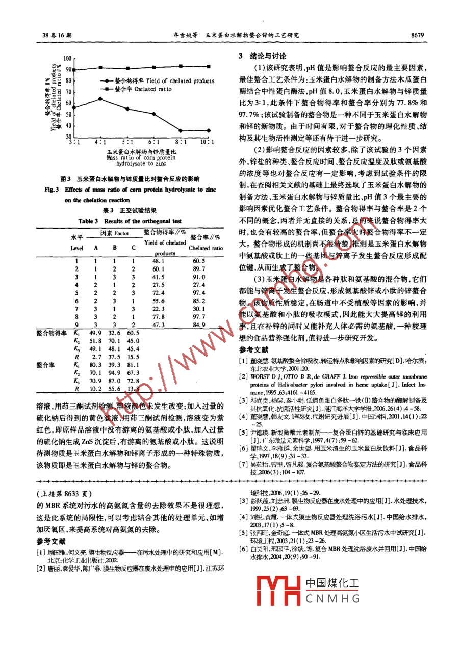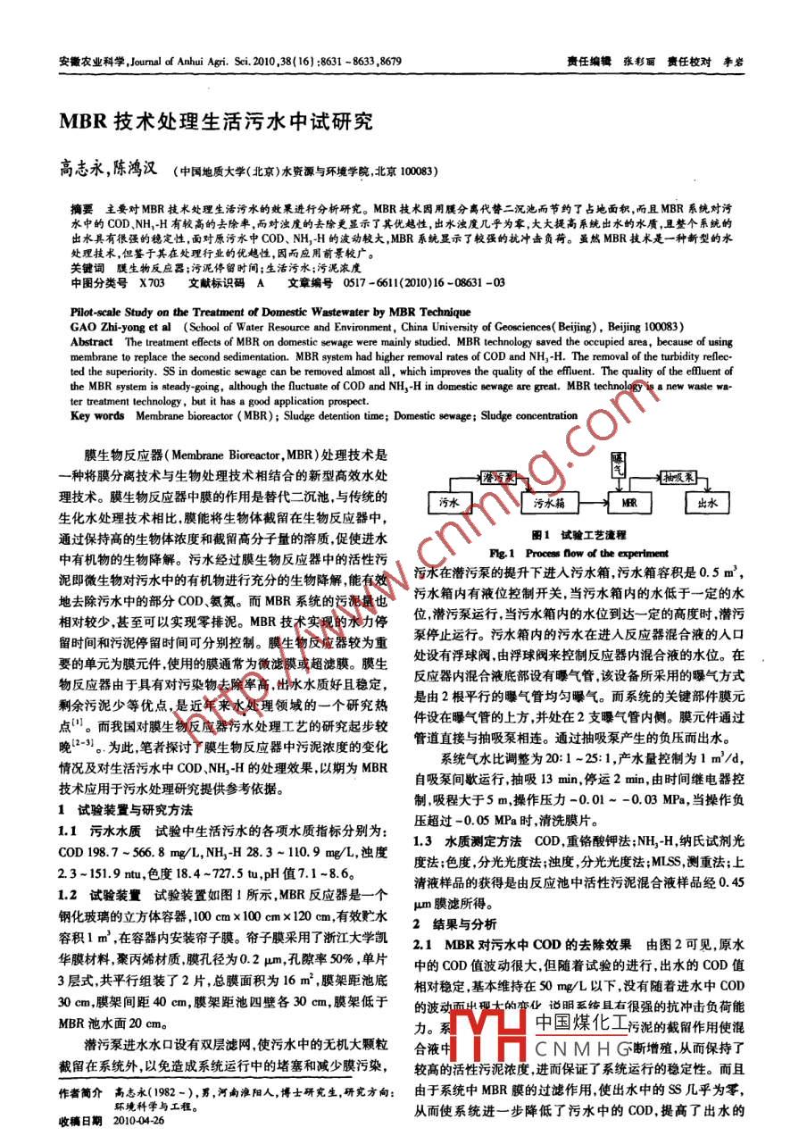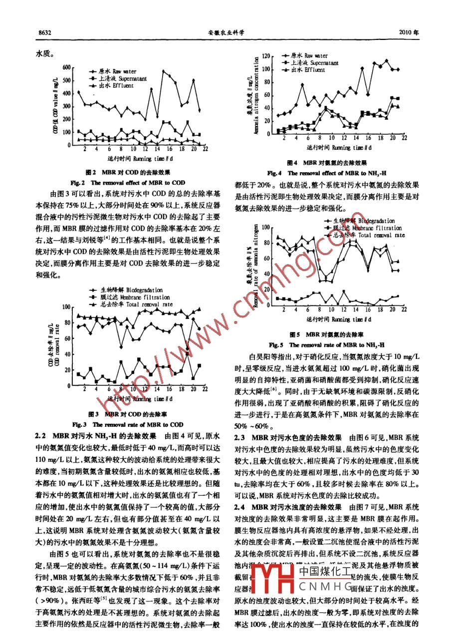 安徽農(nóng)業(yè)科學(xué),Jourmal of Anhui Agri. Sci. 2010 ,38( 16) :8631 -8633 ,8679責(zé)任編輯張彩麗 責(zé)任校對(duì)李巖MBR技術(shù)處理生活污水中試研究高志永,陳鴻漢(中國(guó)地質(zhì)大學(xué)(北京)水資源 與環(huán)境學(xué)院,北京1000摘要主要對(duì) MBR技術(shù)處理生活污水的效果進(jìn)行分析研究。MBR技術(shù)因用膜分離代替二沉池而節(jié)約了占地面積,而且MBR系統(tǒng)對(duì)污水中的COD ,NH,-H有較高的去除率,而對(duì)濁度的去除更顯示了其優(yōu)越性,出水濁度幾乎為霉,大大提高系統(tǒng)出水的水質(zhì),且整個(gè)系統(tǒng)的出水具有很強(qiáng)的穩(wěn)定性,面對(duì)原污水中COD. NH,-H的波動(dòng)較大, MBR系統(tǒng)顯示了較強(qiáng)的抗沖擊負(fù)荷。雖然MBR技術(shù)是一種新型的水處理技術(shù),但鑒于其在處理行業(yè)的優(yōu)越性,因而應(yīng)用前景較廣。關(guān)鍵詞膜生物反應(yīng) 器;污泥停留時(shí)間;生活污水;污泥濃度中團(tuán)分類號(hào)X703文獻(xiàn)標(biāo)識(shí)碼A文章編號(hào) 0517 -6611(2010)16 -08631 -03Pilot-scale Study on the Treatment of Domestic Wastewater by MBR TechniqueGAO hi-yong et al (School of Water Resource and Environment , China University of Geoscience( Beijig) , Beijing 10083)Abstract The treatment effects of MBR on domestic sewage were mainly studied. MBR technology saved the occupied area, because of usingmembrane to replace the second sedimentation. MBR system had higher removal rates of COD and NHz-H. The removal of the turbidity reflec-ted the superoriy. ss in domestic sewage can be removed almost all , which improves the quality of the efluent. The quality of the effluent ofthe MBR system is steady-going, although the fluctuate of COD and NH-H in domestic sewage are great. MBR technology is 8 new waste wa-ter treatment technology , but it has a good application prospect.Key words Membrane bioreactor ( MBR); Sludge detention time; Domnestic sewage; Sludge concentration膜生物反應(yīng)器( Membrane Bioreactor ,MBR)處理技術(shù)是一種將膜分離技術(shù)與生物處理技術(shù)相結(jié)合的新型高效水處一潛污家h,曲吸圖h理技術(shù)。膜生物反應(yīng)器中膜的作用是替代二沉池,與傳統(tǒng)的虧水污水箱-出水生化水處理技術(shù)相比,膜能將生物體截留在生物反應(yīng)器中,通過保持高的生物體濃度和截留高分子量的溶質(zhì),促使進(jìn)水圈1試驗(yàn)工藝潼程FIg.1 Process fow of the experiment中有機(jī)物的生物降解。污水經(jīng)過膜生物反應(yīng)器中的活性污污水在潛污泵的提升下進(jìn)入污水箱,污水箱容積是0.5 m',泥即微生物對(duì)污水中的有機(jī)物進(jìn)行充分的生物降解,能有效污水箱內(nèi)有液位控制開關(guān),當(dāng)污水箱內(nèi)的水低于- -定的水地去除污水中的部分COD、氨氮。而MBR系統(tǒng)的污泥量也位,潛污泵運(yùn)行,當(dāng)污水箱內(nèi)的水位到達(dá)- -定 的高度時(shí),潛污相對(duì)較少,甚至可以實(shí)現(xiàn)零排泥。MBR 技術(shù)實(shí)現(xiàn)的水力停泵停止運(yùn)行。污水箱內(nèi)的污水在進(jìn)人反應(yīng)器混合液的人口留時(shí)間和污泥停留時(shí)間可分別控制。膜生物反應(yīng)器較為重處設(shè)有浮球閥,由浮球閥來控制反應(yīng)器內(nèi)混合液的水位。在要的單元為膜元件,使用的膜通常為微濾膜或超濾膜。膜生反應(yīng)器內(nèi)混合液底部設(shè)有曝氣管,該設(shè)備所采用的曝氣方式物反應(yīng)器由于具有對(duì)污染物去除率高,出水水質(zhì)好且穩(wěn)定,是由2根平行的曝氣管均勻曝氣。而系統(tǒng)的關(guān)鍵部件膜元剩余污泥少等優(yōu)點(diǎn),是近年來水處理領(lǐng)域的一個(gè)研究熱件設(shè)在曝氣管的上方,并處在2支曝氣管內(nèi)側(cè)。膜元件通過點(diǎn)"。而我國(guó)對(duì)膜生物反應(yīng)器污水處理工藝的研究起步較管道直接與抽吸泵相連。通過抽吸泵產(chǎn)生的負(fù)壓而出水。晚l2-31。.為此,筆者探討了膜生物反應(yīng)器中污泥濃度的變化情況及對(duì)生活污水中COD .NH-H的處理效果,以期為MBR系統(tǒng)氣水比調(diào)整為20:1 ~25:1,產(chǎn)水量控制為1 m'/d,自吸泵間歇運(yùn)行,抽吸13 min, 停運(yùn)2 min,由時(shí)間繼電器控技術(shù)應(yīng)用于污水處理研究提供參考依據(jù)。制,吸程大于5 m,操作壓力-0.01~ -0. 03 MPa,當(dāng)操作負(fù)1試驗(yàn)裝置與研究方法1.1污水水質(zhì)試驗(yàn)中生活污水的各 項(xiàng)水質(zhì)指標(biāo)分別為:壓超過-0.05 MPa時(shí),清洗膜片。.3 水質(zhì)測(cè)定方法COD,重鉻酸鉀法;NH,-H,納氏試劑光COD 198.7 ~566. 8 mg/L, NH,-H 28.3~ 110.9 mg/L,濁度度法;色度,分光光度法;濁度,分光光度法;MILSS,測(cè)重法;上2.3~151.9 ntu,色度18.4 ~727.5 tu,pH 值7.1 -8.6。1.2試驗(yàn)裝量t試驗(yàn)裝置如圖1所示,MBR反應(yīng)器是-一個(gè)清液樣品的獲得是由反應(yīng)池中活性污泥混合液樣品經(jīng)0. 45鋼化玻璃的立方體容器,100 cm x 100 cm x 120 cm,有效貯水μm膜濾所得。容積1 m' ,在容器內(nèi)安裝簾子膜。簾子膜采用了浙江大學(xué)凱2結(jié)果與分析2.1 MBR對(duì)污水中COD的去除效果 由圖2可見,原水華膜材料,聚丙烯材質(zhì),膜孔徑為0.2 um,孔隙率50% ,單片中的COD值波動(dòng)很大,但隨著試驗(yàn)的進(jìn)行,出水的COD值3層式,共平行組裝了2片,總膜面積為16 m2 ,膜架距池底相對(duì)穩(wěn)定,基本維持在50 mg/L以下,沒有隨著進(jìn)