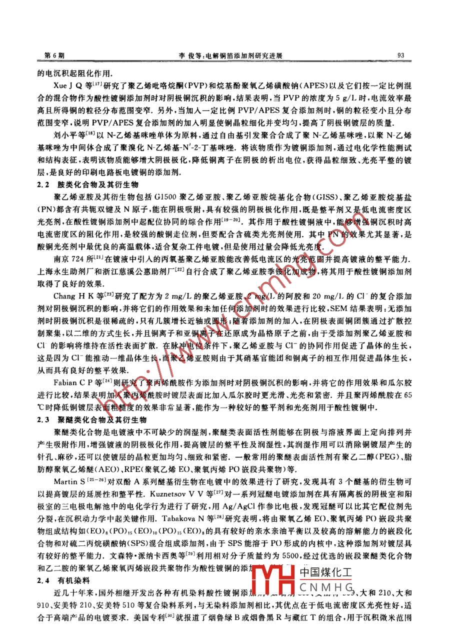 第21卷第6期化學(xué)研究中國科技核心期刊2010年11月CHEMICAL RESEARCHhxyj@ henu. edu. cn電解銅箔添加劑研究進(jìn)展李俊,張震"(華南理工大學(xué)化學(xué)與化工學(xué)院,廣東省高等學(xué)校新能源技術(shù)重點(diǎn)實(shí)驗(yàn)室,廣東廣州510640)摘要:介紹了 電解制箔添加劑的研究現(xiàn)狀和進(jìn)展;指出隨著信息產(chǎn)業(yè)的不斷發(fā)展,對(duì)電子產(chǎn)晶印刷電路板(PCB)制作的要求不斷提高,而對(duì)關(guān)鍵的電解銅箔技術(shù)所用的添加劑的要求也8益苛刻.同時(shí)就電解銅箔添加劑的發(fā)展趨勢(shì)進(jìn)行了展櫬,以期為今后國內(nèi)電解銅箔行業(yè)的發(fā)展提供參考.關(guān)鍵詞:電解銅箱;添加劑;研究進(jìn)展中圈分類號(hào):TQ 153文獻(xiàn)標(biāo)識(shí)碼:A文章編號(hào):1008 - 1011(2010)06-0091-05Research Progress of Additives for Electrolyzing Copper FoilLI Jun, ZHANG Zhen"(School of Chemistry and Chemical Engineering, Key Laboralory of New Energy Technology for GuangdongUniversities, South China University of Technology, Guangzhou 510640, Guangdong, China)Abstract:A review is given about the current status and research progress of additives for elec-trolyzing copper foil. It is pointed out that with continuous development of information indus-try, the requirements for printing circuit board (PCB) in electronics are becoming increasinglystrict, so are the requirements for the additives used for electrolyzing Cu foil--the key tech-nology of manufacturing PCB. At the same time, perspectives are suggested concerning the de-velopment trend of the additives for electrolyzing Cu foil, which, hopefully, is to contribute tothe advance of domestic Cu foil electrolysis industry.Keywords : electrolyzing copper foil; additive; research progress隨著印刷電路板(PCB)向高密度互連技術(shù)為主體的“密、薄、平"方向發(fā)展,電解銅箔的厚度也由35μm向18μm,12 μm以及9 pm以下的超薄化發(fā)展,18 pμm銅箔所占比例迅速提高,12 μm,9 μm銅箔的需求漸增,而這對(duì)電解銅箔添加劑也提出了更高的要求.本文介紹了電解銅箔添加劑的研究現(xiàn)狀,以期為今后國內(nèi)電解銅箔添加劑的發(fā)展提供參考.1發(fā)展歷程酸性鍍銅操作條件易于控制,廢水處理簡(jiǎn)單,如果選擇合適的添加劑就可以得到好的銅沉積層、電解銅箔采用的是硫酸鹽酸性鍍銅工藝,而其添加劑的研究則可以追溯到1940年,硫酸鹽鍍銅用于工業(yè)生產(chǎn)已有140多年.第一個(gè)電鍍銅的專利是于1840 年申請(qǐng)的1.國外在20世紀(jì)40年代首先提出用硫脲及其衍生物作為中國煤化工硫氰酸胺產(chǎn)物,導(dǎo)收稿日期:2010-08- 03.YHCNMHG基金項(xiàng)目:廣東省教自部產(chǎn)學(xué)研合作項(xiàng)(200909020006);廣東省科技計(jì)劃高新技術(shù)產(chǎn)業(yè)化項(xiàng)目02009010100009).作者簡(jiǎn)介:李俊(1985 - ),男,碩士生,研究方向:制的電沉積. .通訊聯(lián)系人. E-mail:chzzhang@ scut. edu, cn.92化學(xué)研究2010年致鍍層變脆,實(shí)用價(jià)值不大.為了改善鍍層的性能,曾采用兩個(gè)途徑,一是改用硫脲衍生物(如乙酰硫脲、磺.化乙酰硫脲和磺化取代硫脲等),另一個(gè)途徑是加人降低鍍層脆性的添加劑(如甘油、萘二磺酸鈉等),但均未能很好地解決上述問題.20世紀(jì)70年代初,美.英、日、德等國開發(fā)了不少新型光亮劑,可以獲得光亮、高整平性和韌性好的鍍層,但是這些光亮劑在超過30心時(shí).鍍層便產(chǎn)生白霧、發(fā)暗和整平性能下降等缺點(diǎn).70到80年代,中、美、日、德、英等國成功研制了不少性能優(yōu)良的添加劑,主要目的在于擴(kuò)大低電流區(qū)的光亮范圍,改善鍍層的綜合性能.德國BlasbergoberflachentenikG.M.B.H公司2在1988年世界表面處理會(huì)議上提出的商品名為Cuprostar 的單一無硫添加劑.是添加劑向單一化發(fā)展的一個(gè)大的飛躍.20世紀(jì)后期,染料添加劑的研究發(fā)展加快,國外相繼開發(fā)出瑞期869.安麗特869、大和210、大和910、安美特210、安美特510等復(fù)合染料.染料分子雖然對(duì)光亮、整平性能有很大的改善,但是它同時(shí)也增加了鍍層的內(nèi)應(yīng)力和脆性,并且給電鍍工藝的后處理帶來不便.進(jìn)入21世紀(jì)后,對(duì)電子產(chǎn)品的要求越來越高,人們又開始致力于非染料添加劑的研究和開發(fā),目前,美國的EPI系列在非染料系中取得了迄今最好的效果,可以與目前最好的染料添加劑相媲美,而且在高端產(chǎn)品中已經(jīng)獲得了廣泛應(yīng)用.2國內(nèi)外研究現(xiàn)狀近20多年來,通過對(duì)有機(jī)多硫化物,表面活性劑,染料以及改性有機(jī)物和稀土添加劑等成分的逐步篩選和組合,獲得了高光亮和整平性能好的鍍層,大大提升了酸性鍍銅工藝的技術(shù)水平,也為電解銅箔工藝的改善提供了條件.酸性鍍銅添加劑主要由有機(jī)多硫化物.有機(jī)染料.表面活性劑及改性有機(jī)物和稀土添加劑等組合而成.現(xiàn)分別介紹這幾類化合物在酸性鍍銅中的應(yīng)用與性能.2.1含硫有機(jī)物傳統(tǒng)MN型系列為M(2巰基苯并咪唑)、N(乙撐硫脲)、SP(聚二硫二丙烷磺酸鈉)、P(聚乙二醇,分子量4000~6000)的組合.該工藝常見問題叮以歸結(jié)為:光亮范圍窄、出光慢、整平性差、特別是低電流密度區(qū)光亮度差、有麻砂和光亮整平性不足".通過對(duì)此配方進(jìn)行改進(jìn),在MN型系列中引進(jìn)了一種或多種有機(jī)物(一般都含有N,S.0等雜原子和