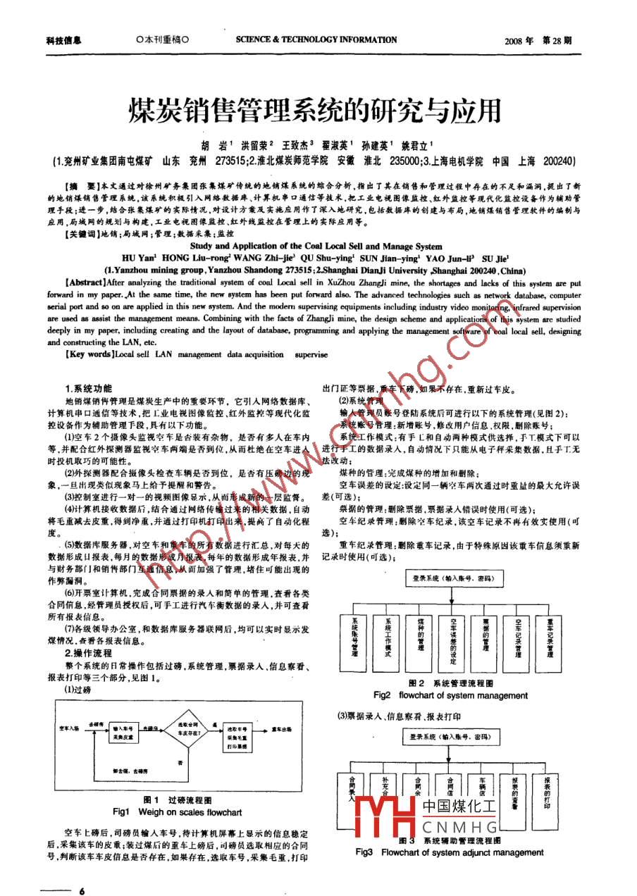 科技僧息.O本刊重稿OSCIENCE & TECHNOLOGY INFORMATION2008年第28期煤炭銷售管理系統(tǒng)的研究與應(yīng)用胡巖'洪留榮2王致杰3翟淑英'孫建英'姚君立1(1.兗州礦業(yè)集團南屯煤礦山東兗州273515;2.淮北煤炭師范學院 安徽淮北235000;3. 上海電機學院中國上海200240)摘要]本文通過對徐州礦務(wù)集團張集煤礦傳統(tǒng)的地鋪煤系統(tǒng)的綜合分析,指出了其在銷售和管理過程中存在的不足和漏洞,提出了新的地銷煤銷售管理系統(tǒng),該系統(tǒng)積極引入網(wǎng)絡(luò)數(shù)據(jù)庫、計算機串口通信等技術(shù),把工業(yè)電視團像監(jiān)控、虹外監(jiān)控等現(xiàn)代化監(jiān)控設(shè)備作為輔助管理手段;進一步,結(jié)合張集煤礦的實際情況,對設(shè)計方案及實施應(yīng)用作了深入地研究,包括數(shù)據(jù)庫的創(chuàng)建與布局,地鋪煤銷售管理軟件的編制與應(yīng)用,局域網(wǎng)的規(guī)劃與構(gòu)建,工業(yè)電視圖像監(jiān)控、紅外線監(jiān)控在管理上的實際應(yīng)用等。[關(guān)鍵詞]地銷;局城網(wǎng);管理;數(shù)據(jù)采集;監(jiān)控Study and Application of the Coal Local Sell and Manage SystemHU Yan' HONG Liu -rong' WANG Zhi-jie' QU Shu -ying' SUN Jian -ying' YAO Jun-IP su Je'(1.Yanzhou mining group, Yanzhou Shandong 273515; 2.Shanghai DianJi University ,Shanghai 200240, China)[Abstract]After analyzing the taditional system of coul Local sell in XxuZhou Zhangli mine, the shortages and lacks of this sytem are putforward in my paper.At the same time, the new Bystem has been put forward also. The advanced technologies such as network database, computerserial port and B0 on are applied in this new system. And the moderm supervising equipments including industry video monitoring, infrared supervisionare used昭asist the management meane. Combining with the facts of Zhangi mine, the deign scheme and aplications of this sytem are studieddeeply in my paper, ineluding creating and the layout of database, programming and applying the management sofware of coal loceal ell,, desigingand constructing the LAN, etc.[Key words]Local sell LAN managenent dala acquisition supervise1.系統(tǒng)功能出門證等票據(jù),重車下磅,如果不存在.重新過車皮。地銷煤銷傳管理是煤炭生產(chǎn)中的重要環(huán)節(jié),它引入網(wǎng)絡(luò)數(shù)據(jù)庫、(2)系統(tǒng)管理計算機串口通信等技術(shù),把工業(yè)電視圖像監(jiān)控、紅外監(jiān)控等現(xiàn)代化監(jiān)輸人管理員賬號登陸系統(tǒng)后可進行以下的系統(tǒng)管理(見圖2): .控設(shè)備作為輔助管理下段,具有以下功能。系統(tǒng)賬號管理:新增賬號,修改用戶信息.權(quán)限,刪除賬號:(1)空車2個攝像頭監(jiān)視空車是否裝有雜物,是否有多人在車內(nèi)系統(tǒng)工作模式:有手L和自動兩種模式供選擇,手T.模式下可以等,并配合紅外探測器監(jiān)視空車兩端是否到位,從而杜絕在空車進入進行 手工的數(shù)據(jù)錄人,自動情況下只能從電子秤采集數(shù)據(jù),且乎T.無時投機取巧的可能性。法改動:(2)外探測器配合攝像頭檢在車輛是否到位,是否有壓磅邊的現(xiàn)煤種的管哩:完成煤種的增加和刪除;象,一旦出現(xiàn)類似現(xiàn)象馬上給予提醒和警告??哲囌`差的設(shè)定:設(shè)定同一輛空車兩次通過時重址的最大允許誤(3)控制室進行一對-的視頻圖像顯示,從而形成新的一層監(jiān)骨。差(可選);(4)計算機接收數(shù)據(jù)后,結(jié)合逋過網(wǎng)絡(luò)傳輸過來的相關(guān)數(shù)據(jù),自動票據(jù)的管理:刪除票據(jù).票據(jù)錄人錯誤時使用(可選);將毛重減去皮重,得到凈重,并通過打印機打印出來,提高了自動化程空車紀錄管理:刪除空車紀錄.該空車記錄不再有效文使用(可(5)數(shù)據(jù)庫服務(wù)器,對空車和重車的所有數(shù)據(jù)進行匯總,對每犬的重車紀錄管理:剿除重車記錄,由于特殊原因該重車信息須重新數(shù)據(jù)形成口報表,每月的數(shù)據(jù)形成月報表,每年的數(shù)據(jù)形成年報表,并記求時使用(可 選);與財務(wù)部門]和銷件部門互通信息.從面加強了管理.堵住可能出現(xiàn)的作弊溜洞。壹錄系境 (輸入脹號、密鶴)(6)開票室計算機.完成合同票據(jù)的錄人和簡單的管理,在看各類合同信息,經(jīng)管理員授權(quán)后,可手工進行汽車衡數(shù)據(jù)的錄入,并可查看所有報表信息。(7)各級領(lǐng)導辦公室,和數(shù)據(jù)庫服務(wù)器聯(lián)網(wǎng)后,均可以實時顯示發(fā)煤情況,奮看各報表信息。|2.操作流程武|整個系統(tǒng)的日常操作包括過磅.系統(tǒng)管理,票據(jù)錄入、信息察看、報表打印等三個部分,見圖1。圖2系統(tǒng)管理流程圈(1)過磅Fig2 flowchart of system management(3票據(jù)錄入、信息察看、報衣打印車入場,輸入車號精3+<年度在型速取$車出腸采舞毛宣壹錄系統(tǒng)(輸入賬號。密碼) .打印集提畜||圈1過磅流程圈中國煤化工品ig1 Weigh on scales flowchart空車上磅后,司磅員輸人車號,待計算機屏幕上顯示的信息穩(wěn)定TYHCNMHG圖3系統(tǒng)輔助管理流程圜后,采集該車的皮重;裝過煤后的重車上確后.問磅員選取相應(yīng)的合同F(xiàn)ig3 Flowchart of system adjunct management號,判斷該車車皮信息是否存在.如果存在,選取車號,采集毛重,打印科技信息.O本刊重稿OSCTENCE & TECHNOLOGY INFORMATION2008年第28期輸人操作員賬號登陸系統(tǒng)后可進行合同的最人,補充合同的承人,合問余址的刪除,合同.車輛信總的查看,