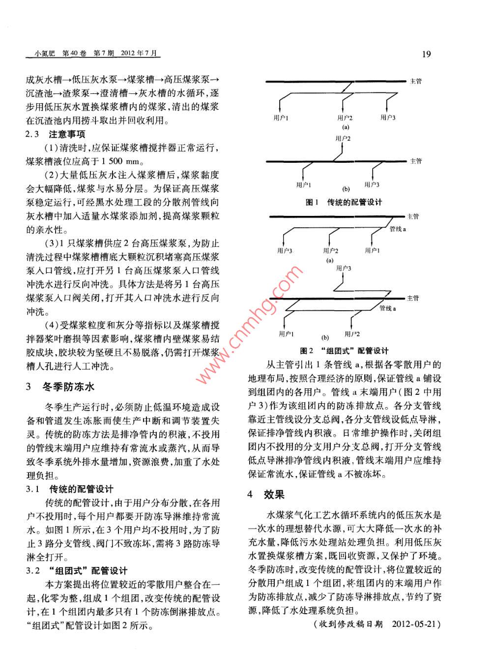 小氮肥第40卷第7期2012年7月水煤漿氣化工藝降低系統(tǒng)水消耗方案周杰柏月波(山東兗礦集團(tuán)國(guó)宏化工有限責(zé)任公司山東鄒城273512)1水煤漿氣化工藝水平衡備工段磨煤水的水源。(4)系統(tǒng)清潔所用沖洗水也為一次水。水煤漿氣化工藝生產(chǎn)系統(tǒng)主要包括煤漿制備1.2低壓灰水代替一次水工段氣化工段、黑水閃蒸處理工段、變換工段。為減少系統(tǒng)補(bǔ)充水量,提出用水循環(huán)系統(tǒng)內(nèi)系統(tǒng)水循環(huán)流程為:氣化爐、煤氣洗滌塔(黑水)的水源代替公用工程水源。經(jīng)分析,灰水槽內(nèi)的→各級(jí)閃蒸罐→澄清槽→灰水槽(灰水)→低壓低壓灰水所含灰渣較少,水溫45℃左右,壓力與灰水泵→除氧器→高壓灰水泵→煤氣洗滌塔→激次水相近,且打量充足。因此,清潔所用沖洗冷水泵→氣化爐,其中,低壓灰水泵配1路管線去水、煤漿管線沖洗水、澄清槽底泵管線沖洗水和磨污水處理站。全系統(tǒng)的廢水經(jīng)地溝排入沉渣池,煤用水都可用低壓灰水泵的低壓灰水代替,可大沉渣池內(nèi)的水澄清后經(jīng)渣漿泵打人澄清槽。大減少系統(tǒng)一次水的補(bǔ)水量,同時(shí)減少氣化系統(tǒng)根據(jù)氣化系統(tǒng)的運(yùn)行情況,系統(tǒng)補(bǔ)充水水量:排至污水處理站的水量。熱密封水25th,冷密封水20th,一次水5t/h,脫鹽水25th,絮凝劑、分散劑的稀釋水2U/h;合2煤漿槽清洗時(shí)節(jié)能降耗成工段冷凝液10υh;熱密封水和冷密封水為離2.1煤漿槽清洗時(shí)存在問(wèn)題心泵的泵密封水。為了維持氣化系統(tǒng)的水平衡,系統(tǒng)長(zhǎng)周期運(yùn)行后,煤漿中的大顆粒物易沉需要向污水處理站輸送水87th。降、膠結(jié)成塊,為保證開(kāi)車(chē)后高壓煤漿泵穩(wěn)定運(yùn)1.1系統(tǒng)水平衡存在的問(wèn)題行,通常要對(duì)煤漿槽進(jìn)行清洗。傳統(tǒng)的清洗方法實(shí)際生產(chǎn)運(yùn)行時(shí),一次水的正常用量只有是將高壓煤漿泵入口盲板拆開(kāi),將煤漿槽人孔打5th,但在以下不正常工況,一次水的用量遠(yuǎn)超開(kāi),用低壓灰水進(jìn)行沖洗。沖洗出來(lái)的大量煤漿過(guò)5th排至地溝,造成在地溝內(nèi)沉積,不易回收利用,既(1)系統(tǒng)開(kāi)、停車(chē)時(shí),開(kāi)、停高低壓煤漿泵都造成資源浪費(fèi),又影響環(huán)境清潔。要用一次水沖洗煤漿管線,確保煤漿管線暢通。2.2低壓灰水置換煤漿槽(2)澄清槽底泵所輸送介質(zhì)的含灰渣量大根據(jù)實(shí)際情況,提出在高壓煤漿泵出口閥前管線又易磨損,開(kāi)、停泵也需要一次水來(lái)置換管導(dǎo)淋閥后配管(低壓管)至沉渣池,開(kāi)啟高壓煤漿線,確保管線暢通。泵經(jīng)新配管線將煤漿打至沉渣池。為保證流量充(3)在系統(tǒng)開(kāi)車(chē)初期,一次水還作為煤漿制足,管徑應(yīng)與高壓煤漿泵出口管的管徑相近。形②必必必必必必必必必必必必必沒(méi)有反沖洗裝置,使煙氣中沒(méi)被洗滌凈的污垢附著大氣溫度比較低,煙氣出口溫度降得比較低,導(dǎo)致在除霧器出口上,隨時(shí)間推延造成除霧器壓差增煙氣析出的水分太多,煙道與煙囪連接處滲水比較大,必須進(jìn)行人工沖洗。建議在除霧器出口上增加嚴(yán)重,有時(shí)煙道里面還有儲(chǔ)水除霧器壓差迅速增1套反沖洗裝置,避免煙氣帶出物堵塞除霧器大,嚴(yán)重時(shí)會(huì)導(dǎo)致系統(tǒng)停運(yùn)。因此,煙氣再熱系統(tǒng)(3)煙氣抬升高度。脫硫塔煙氣出口為60℃在冬季就顯得非常重要。建議保證出口SO2含量左右,沒(méi)有設(shè)計(jì)煙氣再熱裝置。外界溫度高的時(shí)達(dá)到排放標(biāo)準(zhǔn)前提下,利用原煙氣加熱凈煙氣候,煙氣抬升高度符合要求,但在冬季或雨天,由于(收到修改稿日期2011-10-11)小氮肥第40卷第7期2012年7月19成灰水槽→低壓灰水泵→煤漿槽→高壓煤漿泵→沉渣池→渣漿泵→澄清槽→灰水槽的水循環(huán),逐步用低壓灰水置換煤漿槽內(nèi)的煤漿,清出的煤漿在沉渣池內(nèi)用撈斗取出并回收利用。用戶1用戶用戶32.3注意事項(xiàng)用戶(1)清洗時(shí),應(yīng)保證煤漿槽攪拌器正常運(yùn)行煤漿槽液位應(yīng)高于1500mm(2)大量低壓灰水注人煤漿槽后,煤漿黏度會(huì)大幅降低,煤漿與水易分層。為保證高壓煤漿用戶1泵穩(wěn)定運(yùn)行,可經(jīng)黑水處理工段的分散劑管線向圖1傳統(tǒng)的配管設(shè)計(jì)灰水槽中加入適量水煤漿添加劑,提高煤漿顆粒的親水性。管線a3)1只煤漿槽供應(yīng)2臺(tái)高壓煤漿泵,為防止用戶1清洗過(guò)程中煤漿槽槽底大顆粒沉積堵塞高壓煤漿泵入口管線,應(yīng)打開(kāi)另1臺(tái)高壓煤漿泵入口管線用戶3沖洗水進(jìn)行反向沖洗。具體方法是將另1臺(tái)高壓煤漿泵入口閥關(guān)閉,打開(kāi)其入口沖洗水進(jìn)行反向沖洗。(4)受煤漿粒度和灰分等指標(biāo)以及煤漿槽攪拌器槳葉磨損等因素影響,煤漿槽內(nèi)壁煤漿易結(jié)膠成塊,膠塊較為堅(jiān)硬且不易脫落,仍需打開(kāi)煤漿圖2“組團(tuán)式”配管設(shè)計(jì)槽人孔進(jìn)行人工沖洗。從主管引出1條管線a,根據(jù)各零散用戶的地理布局,按照合理經(jīng)濟(jì)的原則,保證管線a鋪設(shè)3冬季防凍水到組團(tuán)內(nèi)的各用戶。管線a末端用戶(圖2中用冬季生產(chǎn)運(yùn)行時(shí),必須防止低溫環(huán)境造成設(shè)戶3)