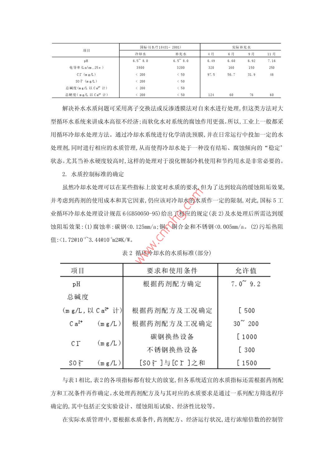 溴化鋰制冷機(jī)的循環(huán)水處理李慶廣河北定州市旭陽焦化有限公司一車間河北定州073000摘要:20世紀(jì)90年代以來,以溴化鋰水溶液為工質(zhì)的吸收式機(jī)組,以運(yùn)行平穩(wěn),噪音低,能量調(diào)節(jié)范圍廣,自動化程度高操作簡便,無環(huán)境污染,被廣泛應(yīng)用于紡織、化纖、焦化、醫(yī)藥、煙草、賓館、醫(yī)院、影劇院、辦公大樓等。關(guān)鍵詞:溴化鋰制冷機(jī)、循環(huán)水、經(jīng)濟(jì)效益中圖分類號:P339文獻(xiàn)標(biāo)識碼:A文章編號、前言溴化鋰制冷機(jī)在中央空調(diào)系統(tǒng)中有著廣泛的應(yīng)用。就循環(huán)水量而言,制冷機(jī)的用水量遠(yuǎn)大于其它用水設(shè)備的用水量。因此,著重針對制冷機(jī)冷卻水系統(tǒng)進(jìn)行研究,認(rèn)識循環(huán)冷卻水處理的重要性。循環(huán)冷卻水系統(tǒng)概述本文中筆者以某廠中央空調(diào)為例,配備的是4臺雙效溴化鋰吸收式制冷機(jī),循環(huán)冷卻水的補(bǔ)水采用市政自來水。當(dāng)時,由于技術(shù)條件和認(rèn)識上的局限性,未對循環(huán)冷卻水進(jìn)行相應(yīng)的水質(zhì)管理和加藥處理。因此,冷卻水系統(tǒng)在運(yùn)行中發(fā)現(xiàn)管道和設(shè)備結(jié)垢、腐蝕和冷卻水渾濁等現(xiàn)象。在每年制冷機(jī)維護(hù)保養(yǎng)中,發(fā)現(xiàn)制冷機(jī)冷凝器等過水設(shè)備內(nèi)壁普遍有污垢沉積,厚度達(dá)0.5m以上,有的銅管內(nèi)甚至完全堵塞。垢樣分析主要成份有CaCO3、MgCO3、菌藻殘骸及灰沙等。造成機(jī)組制冷效率下降,嚴(yán)重影響生產(chǎn)。三、循環(huán)冷卻水處理水質(zhì)要求與水處理為了防止冷凝器等換熱設(shè)備的冷卻水側(cè)產(chǎn)生結(jié)垢、降低機(jī)組的制冷效率,國標(biāo)5蒸汽和熱水型溴化鋰吸收式冷水機(jī)組6(GB/T18431-2001)對冷卻水和補(bǔ)水的水質(zhì)提出了一定的要求如表1,該標(biāo)準(zhǔn)雖然允許循環(huán)冷卻水的濃縮倍數(shù)達(dá)到4倍,符合節(jié)水的要求,但對比該廠自來水的水質(zhì)分析結(jié)果(表1)不難發(fā)現(xiàn),國標(biāo)對補(bǔ)水的要比較高,如就總硬度而言,當(dāng)?shù)氐淖詠硭汲^國標(biāo)補(bǔ)水的要求。表1冷卻水、補(bǔ)水的水質(zhì)要求及實(shí)際補(bǔ)充水水質(zhì)項(xiàng)目國標(biāo)(GB/T18431-2001)實(shí)際補(bǔ)充水補(bǔ)充水11月6.5-8.07.16電導(dǎo)率(Ls/cm,25e)CI (m g/L)200200總堿度(mg幾L以Ca2”計(jì))200總硬度(mg/幾L以Ca2*計(jì))解決補(bǔ)水水質(zhì)問題可采用離子交換法或反滲透膜法對自來水進(jìn)行處理,但這類方法對大型循環(huán)水系統(tǒng)來講成本高很不經(jīng)濟(jì);而軟化水對系統(tǒng)的腐蝕作用更強(qiáng)。所以,工業(yè)上一般都采用循環(huán)冷卻水處理方法。通過冷卻水系統(tǒng)進(jìn)行化學(xué)清洗預(yù)膜,并在日常運(yùn)行中投加一定的水處理劑,同時進(jìn)行相應(yīng)的水質(zhì)管理,從而使得冷卻水處于一種沒有結(jié)垢、腐蝕傾向的“穩(wěn)定狀態(tài)。尤其當(dāng)補(bǔ)水硬度較高時,這樣的處理對于溴化鋰制冷機(jī)使用和節(jié)約用水是非常必要的。2.水質(zhì)控制標(biāo)準(zhǔn)的確定雖然冷卻水處理可以在某些指標(biāo)上放寬對水質(zhì)的要求,但為了達(dá)到較高的緩蝕阻垢效果,并考慮到藥劑的使用成本和其它因素,仍應(yīng)該對冷卻水的水質(zhì)作一定的限制,對此,國標(biāo)5工業(yè)循環(huán)冷卻水處理設(shè)計(jì)規(guī)范6(GB50050-95)給出了相應(yīng)的規(guī)定(表2)及水處理后所需達(dá)到緩蝕阻垢效果:(1)腐蝕率:碳鋼<0.125mm/a;銅、銅合金和不銹鋼<0.005mm/a。(2)污垢熱阻值:<1.72@103.44@10m2#K/表2循環(huán)冷卻水的水質(zhì)標(biāo)準(zhǔn)(部分)項(xiàng)目要求和使用條件允許值H根據(jù)藥劑配方確定7.09.2總堿度(mg/L,以Ca計(jì)川根據(jù)藥劑配方及工況確定[500Ca2(mg幾L)根據(jù)藥劑配方及工況確定30200碳鋼換熱設(shè)備[1000cI(m g/L)不銹鋼換熱設(shè)備[300S0(mg/L)[s0]與[cr]之和[1500與表1相比,表2的各項(xiàng)指標(biāo)都有較大的放寬,但各系統(tǒng)適宜的水質(zhì)指標(biāo)還需根據(jù)藥劑配方和工況條件再作確定。水處理藥劑配方及與其對應(yīng)的水質(zhì)要求是通過一系列配方篩選程序確定的,其中包括正交實(shí)驗(yàn)設(shè)計(jì)、緩蝕阻垢試驗(yàn)、經(jīng)濟(jì)性比較等。在實(shí)際水質(zhì)管理中,要根據(jù)水質(zhì)條件,藥劑配方、經(jīng)濟(jì)運(yùn)行狀況,進(jìn)行濃縮倍數(shù)的控制管3.循環(huán)冷卻水的濃縮倍數(shù)管理在實(shí)驗(yàn)室篩選的最佳配方要取得期望的實(shí)用效果,除了要對冷卻水系統(tǒng)進(jìn)行化學(xué)清洗和預(yù)膜處理外,確保日常運(yùn)行中冷卻水水質(zhì)(包括藥劑濃度)的達(dá)標(biāo)和穩(wěn)定是非常必要的,其關(guān)鍵是排污方法和排污量的控制,為此,需要充分認(rèn)識冷卻水系統(tǒng)的濃縮特征。對于循環(huán)水量為Rωm/h)、保有水量為Ⅴ(m)的冷卻水系統(tǒng),在系統(tǒng)開始運(yùn)行(濃縮倍數(shù)NO)經(jīng)過一定時間t(h)后,其冷卻水濃縮倍數(shù)Nt可由系統(tǒng)在[t,t+dt]微分時段內(nèi)的水量平衡計(jì)算得到:(國標(biāo)GB50050-95)N+=-M-+(Wo~~MB+ WB+W)exp(-B+M=E+B+ W式中E、B、W分別是冷卻水的蒸發(fā)量、排污量和飛散量(m3/