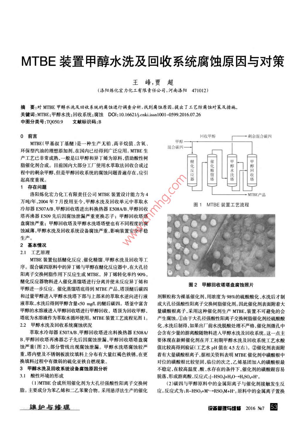 MTBE裝置甲醇水洗及回收系統(tǒng)腐蝕原因與對策