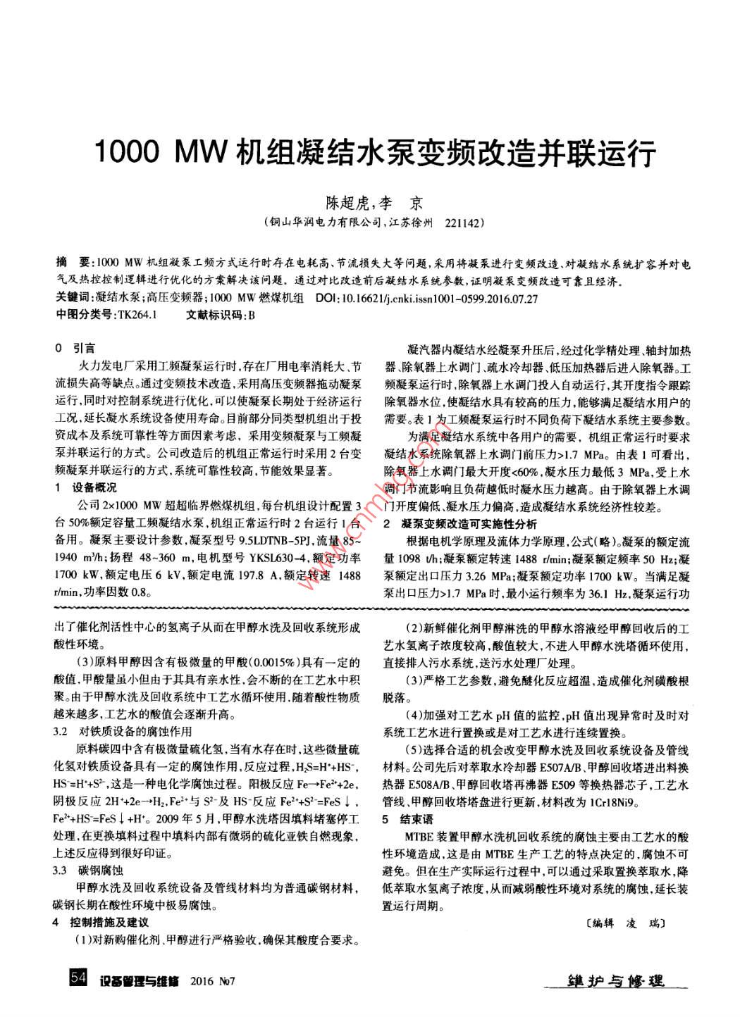 MTBE裝置甲醇水洗及回收系統(tǒng)腐蝕原因與對策王峰,賈超(洛陽煉化宏力化工有限責(zé)任公司,河南洛陽471012)摘要:對MTBE甲醇水洗及回收系統(tǒng)的腐蝕進(jìn)行調(diào)查分析,找到腐蝕原因,提出了工藝防腐蝕對策及措施關(guān)鍵詞:MTBE;甲醇水洗;回收系統(tǒng);腐蝕DO:10.1662lj- cnki. issn01-05992016.07.26中圖分類號:TQ050.9文獻(xiàn)標(biāo)識碼B0前言叫收甲醇剩余混合碳四MTBE(甲基叔丁基醚)是一種生產(chǎn)無鉛、高辛烷值、含氧甲醇環(huán)保型汽油的理想添加劑,在國內(nèi)已經(jīng)得到廣泛應(yīng)用。MTBE生混合碳四產(chǎn)工藝已非常成熟,一般是以甲醇和異丁烯為原料,借助酸性樹脂催化劑合成。目前國內(nèi)大部分工廠使用水萃取法回收合成過程中的剩余甲醇,但是甲醇回收系統(tǒng)的腐蝕問題普遍存在,應(yīng)引起高度重視器醇回收塔1存在問題洛陽煉化宏力化工有限責(zé)任公司MTBE裝置設(shè)計能力為4MTBE產(chǎn)品萬噸/年,2004年7月投用至今,甲醇水洗及回收單元中萃取水圖1MTBE裝置工藝流程冷卻器E507AB、甲醇回收塔進(jìn)出料換熱器E508A/B、甲醇回收塔再沸器E509先后因腐蝕泄漏嚴(yán)重更換芯子;甲醇回收塔塔盤腐蝕嚴(yán)重;甲醇回收塔及甲醇水洗塔塔壁也有不同程度的腐蝕減薄。甲醇水洗及回收系統(tǒng)設(shè)備腐蝕嚴(yán)重影響裝置安全平穩(wěn)生產(chǎn)?;厩闆r21工藝原理MTBE裝置包括醚化反應(yīng)、催化精餾、甲醇水洗及回收等工序。混合碳四原料中的異丁烯與甲醇在醚化反應(yīng)器中,在大孔徑陽離子交換樹脂作用下反應(yīng)生成MTBE,異丁烯轉(zhuǎn)化率約90%,醚化反應(yīng)器物料進(jìn)入催化蒸餾塔進(jìn)行分離并使未反應(yīng)異丁烯和圖2甲醇回收塔塔盤腐蝕照片甲醇進(jìn)一步反應(yīng)。催化蒸餾塔底得到MTBE產(chǎn)品,塔頂醚后碳四和過量甲醇進(jìn)入甲醇水洗塔下部與上部來的萃取水逆向進(jìn)行液劑顆粒稱為裸基催化劑,用濃度為98%的硫酸酸化、水洗后才制液萃取水洗后得到甲醇含量<50mg的醚后碳四。塔釜中富含成大孔徑強(qiáng)酸性陽離子交換樹脂催化劑。因此催化劑表面附著大甲醇的水溶液進(jìn)入甲醇回收塔進(jìn)行甲醇回收,塔頂為回收甲醇,量磺酸根離子,采用這種催化劑生產(chǎn)MTBE,裝置不可避免的會塔底為水溶液作為萃取水循環(huán)使用。MTBE裝置工藝流程見圖1。產(chǎn)生腐蝕。①由于大孔徑強(qiáng)酸性陽離子交換樹脂催化劑經(jīng)硫酸酸22甲醇水洗及回收系統(tǒng)腐蝕狀況化、水洗后制得,如果出廠前水洗脫酸處理不嚴(yán)格,催化劑微孔中萃取水冷卻器E507A/B、甲醇回收塔進(jìn)出料換熱器E508M會含有少量的游離酸隨物料進(jìn)入甲醇水洗及回收系統(tǒng)。這一點主B、甲醇回收塔再沸器芯子先后因腐蝕泄漏,甲醇回收塔塔盤腐要體現(xiàn)在新鮮催化劑在開工初期甲醇水洗及回收系統(tǒng)工藝水酸蝕嚴(yán)重(圖2),部分管線出現(xiàn)腐蝕泄漏。甲醇水洗塔腐蝕較嚴(yán)值比較高得到驗證(工藝水pH值在45左右)。②催化劑表面附重塔內(nèi)壁及不銹鋼板波紋填料上分布有大量紅褐色鐵銹,在更著有大量磺酸根離子據(jù)相關(guān)資料表明MTBE催化劑中磺酸根中換填料過程中有微弱的硫化亞鐵自燃現(xiàn)象。對位的磺酸根比較堅固,臨位的次之,乙烯基團(tuán)加入的磺酸根最3甲醇水洗及回收系統(tǒng)設(shè)備腐蝕原因分析不穩(wěn)定,在較高溫度酸、水存在的條件下,催化劑的磺酸跟容易3.1酸性環(huán)境的形成脫落形成游離酸,反應(yīng)式:[-HSO3H+HO+HSO+H(1)MTBE合成所用催化劑為大孔徑強(qiáng)酸性陽離子交換樹(2)碳四與甲醇原料中的金屬陽離子與催化劑接觸發(fā)生反脂。主要成分為苯乙烯和二乙苯聚合物。采用懸浮法生產(chǎn)的催化應(yīng)。反應(yīng)式為R-HSO+M→RSOM+H。原料中的金屬離子置換維護(hù)與修理設(shè)基理與維修2016M7圖31000MW機(jī)組凝結(jié)水泵變頻改造并聯(lián)運行陳超虎,李京(銅山華潤電力有限公司,江蘇徐州221142摘要:10Mw機(jī)組凝泵工頻方式運行時存在電耗高、節(jié)流損失大等問題,釆用將凝泵進(jìn)行變頻改造、對凝結(jié)水系統(tǒng)擴(kuò)容并對電氣及熱控控制邏輯進(jìn)行優(yōu)化的方案解決該問題,通過對比改造前后凝結(jié)水系統(tǒng)參數(shù),證明凝泵變頻改造可靠且經(jīng)濟(jì)關(guān)鍵詞:凝結(jié)水泵;高壓變頻器;100Mw燃煤機(jī)組Do:10.16621/ cnki. issn1001-059920160727中圖分類號:TK264文獻(xiàn)標(biāo)識碼:B0引言凝汽器內(nèi)凝結(jié)水經(jīng)凝泵升壓后,經(jīng)過化學(xué)精處理、軸封加熱火力發(fā)電廠采用工頻凝泵運行時,存在廠用電率消耗大、節(jié)器除氧器上水調(diào)門、疏水冷卻器低壓加熱器后進(jìn)入除氧器。工流損失高等缺點。通過變頻技術(shù)改造,釆用高壓變頻器拖動凝泵頻凝泵運行時除氧器上水調(diào)門投入自動運行,其開度指令跟蹤運行,同時對控制系統(tǒng)進(jìn)行優(yōu)化,可以使凝泵長期處于經(jīng)濟(jì)運行除氧器水位,使凝結(jié)水具有較高的壓力能夠滿足凝結(jié)水用戶的工況,延長凝水系統(tǒng)設(shè)備使用壽命。目前部分同類型機(jī)組出于投需要。表1為工頻凝泵運行時不同負(fù)荷下凝結(jié)水系統(tǒng)主要參數(shù)。資成本及系統(tǒng)可靠性等方面因素考慮,采用變頻凝泵