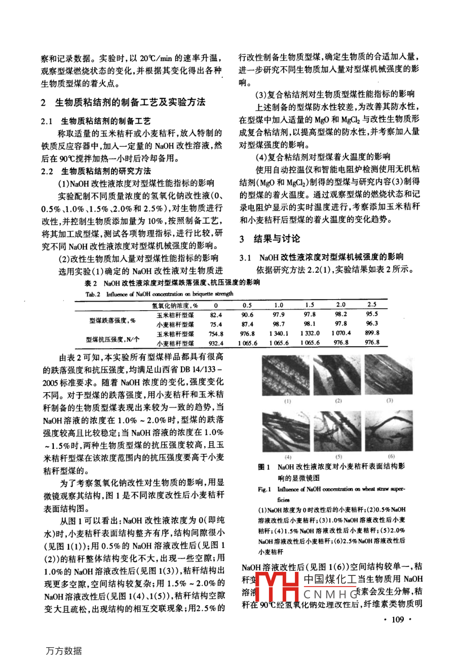 第26卷,總第148節(jié)能技術(shù)》Vol 26. Sum. No. 1452008年3月,第2期ENERGY CONSERVATION TECHNOLOGYMar 2008. No. 2生物質(zhì)秸稈作為型煤粘結(jié)劑的研究路廣軍,郭彥霞,程芳琴,李瑩英,張寧(山西大學(xué)環(huán)境與資源學(xué)院,山西太原03000摘要:本研究探討了用氫氧化鈉改性生物質(zhì)秸稈作為型煤粘結(jié)劑的可行性,考察了NaOH溶液濃度對生物質(zhì)改性的影響以及生物質(zhì)添加量、無機(jī)物(Mg0和Mg2)添加量對型煤機(jī)械強(qiáng)度、防水性能和著火溫度的影響。研究結(jié)果表明NaOH改性液的濃度為1.0%~2.0%時,制得的生物質(zhì)型煤有較高的機(jī)械強(qiáng)度;生物質(zhì)添加量在2%~20%范圍內(nèi)時,隨生物質(zhì)量的增加,機(jī)械強(qiáng)度增加,著火溫度降低,但防水性較差;而在生物質(zhì)型煤中加入適量無機(jī)粘結(jié)劑(Mg0和MgCl2)后,型煤有很高的浸水強(qiáng)度,表現(xiàn)出優(yōu)越的防水性能;最后得出各項(xiàng)性能指標(biāo)優(yōu)異的改性生物質(zhì)粘結(jié)劑的配方。關(guān)鍵詞:生物質(zhì)型煤;強(qiáng)度;防水性;著火溫度中圖分類號:TK6文獻(xiàn)標(biāo)識碼:A文章編號:1002-6339(2008)02-0107-05Study on the Biomass Used as Briquette BinderLU Guang-jun, GUO Yan-xia, CHENG Fang-qin, LI Ying-ying, ZHANG NingSchool of Environment and Resource, Shanxi University, Taiyuan 030006, ChinAbstract: Using denatured biomass as briquette binder in the laboratory, the influence of NaOH solutionbiomass quantity and composite material additives( MgO and MgCh) on briquette strength, waterproofing prop-erty and igmition temperature was studied. The result shows when NaOH solution concentration is 1.0%2.0%, biomass briquette has higher mechanical strength; when biomass quantity is 2%-20%, with thebiomass quantity increasing, the mechanical strength increases, and ignition temperature reduces, but water-proofing property becomes bad; when composite material additives( MgO and MgCl)are added, waterproofingproperty would be improved significantlyKey words: biomass briquette; strength of briquette; waterproofing property; ignition temperature大氣污染。據(jù)統(tǒng)計(jì),我國200年SO2排放量達(dá)25940前言萬噸,煙塵排放量達(dá)182萬噸,其中80%源于燃煤煤炭是我國的第一能源其中80%用于直接燃在這些燃煤污染源中,由于我國中小燃煤工業(yè)鍋爐燒這不僅造成能源利用率低同時也造成了嚴(yán)重的耗煤量大(年耗煤量約占燃煤總量的1/3),且以燃用散煤為主燃煤污染非常嚴(yán)重但又因其數(shù)量眾多收稿日期2008-03-06修訂稿日期200-08-20(占鍋爐總量的70%~80%)和分布面廣,很難對其基金項(xiàng)目:國家科技支撐計(jì)劃項(xiàng)目編號:20BAB24BO1;山西省進(jìn)中國煤化工電廠之后的第二大科技攻關(guān)項(xiàng)目編日:2014原市大學(xué)生創(chuàng)新難創(chuàng)業(yè)計(jì)劃項(xiàng)目:編號:0701079重點(diǎn)YHCNMHG術(shù)是潔凈煤技術(shù)的作者簡介:路廣軍(1983-),男,在讀碩士研究生。浮麻、曰散煤可以減少SO2排放40%~70%,減少煙塵排放70%-90%,減少(3)原料配煤:榆次無煙煤和寧武煙煤混合煤NO450%~60%,而且投資小、見效快,從我國的經(jīng)(配煤比例3:1),用破碎機(jī)破碎至3m以下,備用;濟(jì)發(fā)展水平和鍋爐燃煤的實(shí)際來看,使用潔凈型煤(4)添加劑:氧化鎂(分析純)(北京市通廣精細(xì)代替散煤可以很好地解決這些中小鍋爐燃煤污染問化工公司),氯化鎂(分析純)(天津市化學(xué)試劑三題。我國從二十世紀(jì)60年代、70年代就已經(jīng)開廠)始進(jìn)行型煤技術(shù)的開發(fā)研究但適合于中小噸位燃12煤和秸稈的工業(yè)分析煤鍋爐的潔凈型煤技術(shù)并未取得有效進(jìn)展,工業(yè)化實(shí)驗(yàn)所用原煤和秸稈采用CT5000A型多用熱程進(jìn)仍然很慢2-3。其原因主要是型煤質(zhì)量不能保量測定儀(中國礦業(yè)大學(xué)研制),CTM300型自動控溫證,性能差如型煤強(qiáng)度低熱穩(wěn)定性差燃燒性能儀(中國礦業(yè)大學(xué)研制),WDL-9微機(jī)漢顯快速測差使其不易點(diǎn)燃、燃燒不完全等,此外型煤粘結(jié)劑硫儀(鶴壁科力測控技術(shù)有限公司)進(jìn)行工業(yè)分析檢價(jià)格貴也是主要原因之一。測,檢測結(jié)果見表1。生物質(zhì)型煤是近年來發(fā)展起來的新技術(shù),通過1煤和秸稈工業(yè)分析節(jié)煤和生物質(zhì)代煤的雙重作用減少溫室氣體CO2Tab 1 Proximate analysis of coal and straw和燃煤SO2的排放,有利于緩解氣候變暖和酸雨污d A Va S, Q, (k/kg)染,對保護(hù)環(huán)境和節(jié)約能源均具有重大意義,是型煤榆次無煙煤676268117012.0427642寧武煙煤63226.332.86技術(shù)發(fā)展的一個重要方向6-8。而且我國生物質(zhì)能玉米秸稈3.564.5271.951554源豐富每年農(nóng)業(yè)產(chǎn)生的生物質(zhì)秸稈可達(dá)7億噸這小麥秸稈40196673715371些生物質(zhì)大部分被簡單焚燒,造成嚴(yán)重的環(huán)境污1.3型煤的物理性能測試方法染9。中國工程院院士郝吉明認(rèn)為0,生物質(zhì)型煤改性生物質(zhì)粘結(jié)劑的性能通過型煤物理性能來技術(shù)是開發(fā)利用煤和生物質(zhì)能的新途徑,它充分利體現(xiàn)和衡量,主要包括抗壓強(qiáng)度、跌落強(qiáng)度、浸水強(qiáng)用了煤和生物質(zhì)自身的優(yōu)勢,便于保證燃料熱值,利度和復(fù)干強(qiáng)度,其測定方法如下:于克服常規(guī)型煤性能的不足,更重要的是生物質(zhì)纖(1)抗壓強(qiáng)度:在XY-01型型煤液壓抗壓強(qi