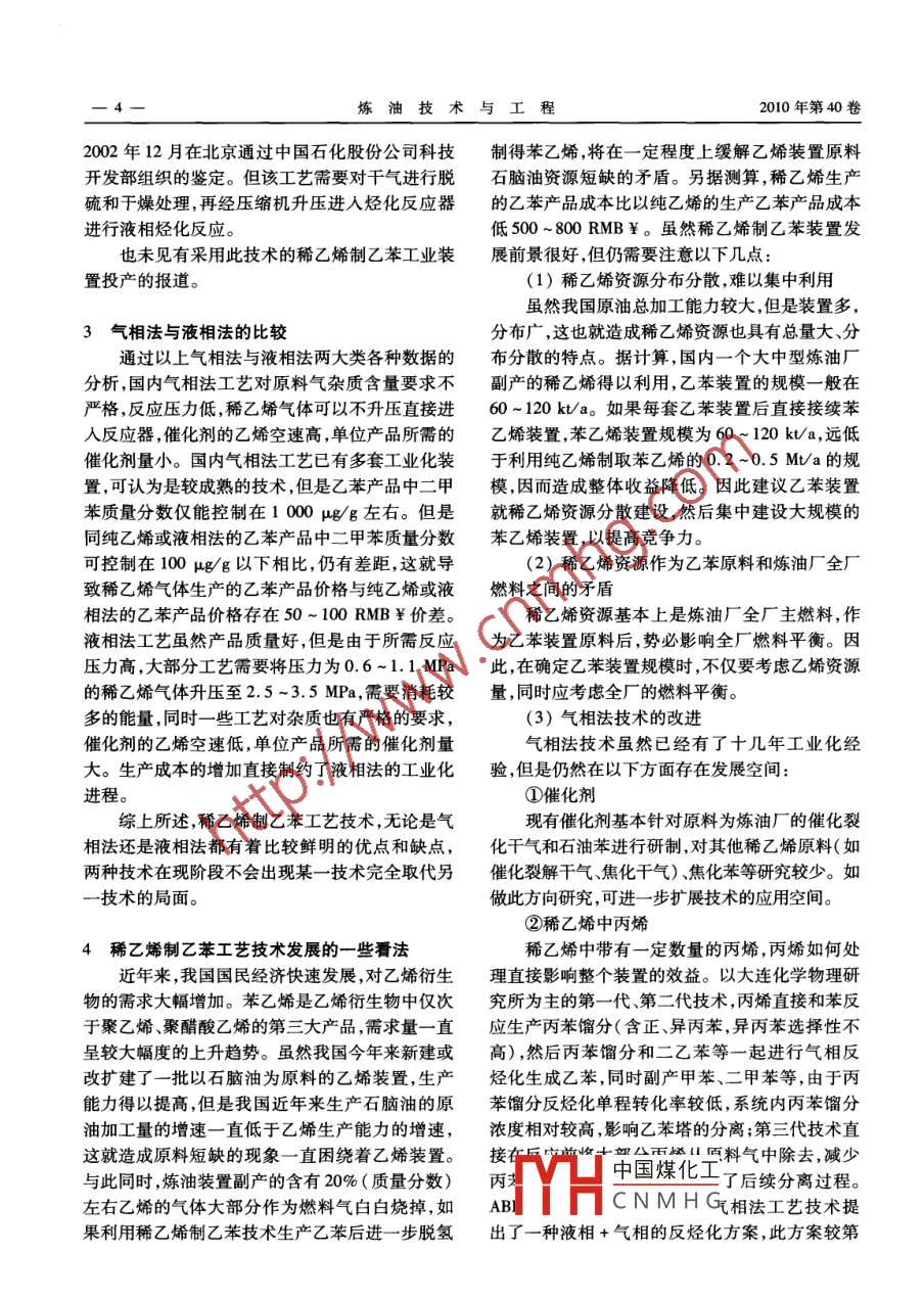 煉油技術(shù)與工程2010年5月PETROLEUM REFINERY ENGINEERING第40卷第5期綜述稀乙烯制乙苯工藝技術(shù)綜述李淑紅中國石化集團(tuán)洛陽石油化工工程公司(河南省洛陽市471003)摘要:介紹了國內(nèi)外氣相法和液相法稀乙烯制乙苯工藝技術(shù),如Mobil/Badger公司的氣相法的成套工藝技術(shù);中國科學(xué)院大連化學(xué)物理研究所為主開發(fā)的氣相法成套工藝技術(shù);中國石化上海石油化工研究院為主開發(fā)的氣相法催化劑;ABB拉默斯環(huán)球有限公司的氣相法工藝技術(shù);UOP公司的Alkar 工藝;CDTech公司的催化精餾工藝;Monsanto/Lummus公司改良的AICl,法;大連化學(xué)物理研究所為主開發(fā)的液相法技術(shù);北京服裝學(xué)院為主開發(fā)的液相法技術(shù)等。對氣相法與液相法工藝進(jìn)行了比較,展望了稀乙烯制乙苯工藝技術(shù)的發(fā)展?fàn)顩r。關(guān)鍵詞:稀乙烯乙苯氣相法液相法綜述乙苯主要用于生產(chǎn)苯乙烯,目前工業(yè)上用的相反應(yīng)類型,這一-點是稀乙烯工藝和純乙烯工藝乙苯,90%以上是用乙烯和苯烷基化制得,少量由最主要的差別)。由于催化反應(yīng)機(jī)理的不同,這石油煉制過程中Cg芳烴分離所得。乙烯和苯烷兩大類技術(shù)在烴化反應(yīng)部分是相對獨立存在的,基化制取乙苯的技術(shù)分為兩大類,一類以聚合級沒有傳承關(guān)系。一個專利商可能同時擁有這兩大乙烯為原料,另一類以稀乙烯為原料。 以聚合級.類技術(shù),但它的這兩大類技術(shù)也是獨立存在,沒有乙烯為原料的技術(shù)種類繁多,主要有:催化蒸餾傳承關(guān)系,也沒有替代關(guān)系。法、氣相分子篩法、液相分子篩法、均相液相法和傳統(tǒng)液相法,這些技術(shù)在世界范圍內(nèi)均廣泛應(yīng)用。1國內(nèi)外氣相法稀乙烯制乙苯工藝技術(shù)而以稀乙烯為原料的技術(shù)則比較少,實現(xiàn)工業(yè)化1.1 Mobil Badger氣相法成套工藝技術(shù)的很少。有些聚合級乙烯制乙苯專利擁有者聲稱Mobil/Badger氣相法稀乙烯制乙苯工藝以其專利同樣適用于稀乙烯原料,但沒有見到工業(yè)ZSM-5高硅沸石為催化劑,1977年建成16 kVa化報道。由于國內(nèi)乙烯資源匱乏,很多科研單位乙苯工業(yè)化試驗裝置,并于1992年在英國Stan-一直在進(jìn)行稀乙烯制乙苯技術(shù)的攻關(guān)工作,但多l(xiāng)ow建成投產(chǎn)了160 kV/a的第-套大型工業(yè)化裝數(shù)以催化劑研制、實驗室小試和中試為主,真正進(jìn)置。該工藝適用于乙烯質(zhì)量分?jǐn)?shù)為10% ~ 100%人工業(yè)化試驗和已經(jīng)工業(yè)化的技術(shù)則很少。純乙的原料氣, 烴化反應(yīng)壓力約2. 2 MPa,反應(yīng)溫度為烯制乙苯技術(shù)發(fā)展歷史較長,國內(nèi)外已有比較成390 ~428 C,乙烯空速為0.5 h-' ,原料單耗相對熟的技術(shù)。本文重點探討稀乙烯制乙苯工藝較低,苯單耗0.749 Vt,乙烯單耗為0.268 Vt。.技術(shù)。但該工藝對原料氣中其它雜質(zhì)如:丙烯、硫、水、氧稀乙烯制乙苯工藝技術(shù)按照反應(yīng)原料苯在烴等含量要求極其嚴(yán)格,均為百萬分之幾級,需對原化反應(yīng)器中存在的相態(tài)劃分為氣相法和液相法兩料氣進(jìn)行嚴(yán)格精制,稀乙烯氣體升壓至2.9 MPa大類。氣相法是較早開發(fā)成功和工業(yè)應(yīng)用的- -種后脫硫、脫水、脫氧和深冷分離脫除丙烯,其結(jié)果技術(shù),使用固體催化劑,反應(yīng)原料以氣態(tài)形式在催雖然催化劑單程壽命延長,但裝置投資和能耗相化劑.上接觸反應(yīng),屬于氣固兩相反應(yīng)類型。液相對較高。法是在一-種固體催化劑存在下,借助較高壓力使收稿日期:2010 -02 -08。反應(yīng)原料苯處于液態(tài),稀乙烯原料仍以氣體形式中國煤化工年畢業(yè)于天津大學(xué)化學(xué)存在,氣態(tài)烯烴和液態(tài)苯在催化劑上接觸反應(yīng),屬工作?,F(xiàn)任該公司技術(shù)于氣-液-固三相反應(yīng)類型(純乙烯液相法工藝中,YHC N M H G79- 6887,T1純乙烯以液相形態(tài)存在于反應(yīng)器中,屬于液-固兩lishh@ lpe. com. cn煉油技術(shù)與工程2010年第40卷.2 中國科學(xué)院大連化學(xué)物理研究所為主開發(fā)于丙苯餾分不能進(jìn)行液相反烴化,因此該部分改的氣相法成套工藝技術(shù)造也包括了增設(shè)丙苯塔,以保證改造效果。開車該技術(shù)的研究開發(fā)工作始于1985年末,經(jīng)過一次成功 ,效果良好,乙苯產(chǎn)品中二甲苯的質(zhì)量分催化劑研制和小試、中試工藝研究,取得了比較明數(shù)降到1 000 μg/g以下。由于2001年改造的目顯的效果。在上述研究的基礎(chǔ)上,1990年在當(dāng)時的僅是就液相反烴化反應(yīng)器進(jìn)行工業(yè)試驗,取得中國石化總公司發(fā)展部的組織下,成立了由撫順工業(yè)試驗數(shù)據(jù),并不需要整個裝置長期在改造后石油二廠、中國科學(xué)院大連化學(xué)物理研究所和洛的狀態(tài)下操作,非試驗階段仍按改造前流程操作,陽石油化工工程公司組成的催化裂化干氣與苯烴因此并未就全流程進(jìn)行優(yōu)化,整個流程不能稱之化制取乙苯工藝技術(shù)聯(lián)合開發(fā)體,對該項工藝技.為第三代技術(shù)。2003年在此裝置基礎(chǔ)上進(jìn)行了術(shù)進(jìn)行工程開發(fā),并于1992年7月由洛陽石油化30kV/a到60kV/a的擴(kuò)能改造,烴化反應(yīng)部分的工工程公司完成了撫順石油二廠30 kU/a 乙