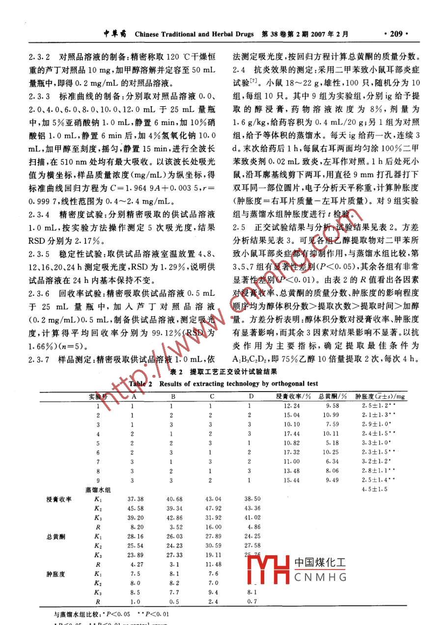 208中草藥 Chinese Traditional and Herbal Drugs第38卷第2期2007年2月正交試驗(yàn)優(yōu)選了哥王的提取工藝陳爽,邵曼莉,楊振宇,杜智敏(哈爾濱醫(yī)科大學(xué)附屬二院臨床藥物研究所,黑龍江哈爾濱150086)摘要:目的研究影響了哥王提取的各種因素,確定最佳提取工藝。方法采用正交試驗(yàn),考察乙醇提取次數(shù)、加醇量、醇體積分?jǐn)?shù)、提取時(shí)間4個(gè)因素的影響,以乙醇浸膏收率、總黃酮的質(zhì)量分?jǐn)?shù)、抗炎效果為指標(biāo)優(yōu)選了哥王的乙醇提取工藝。結(jié)果在所考察的因素中,對(duì)乙醇浸膏收率、總黃酮的質(zhì)量分?jǐn)?shù)、抗炎效果影響程度均為醇體積分?jǐn)?shù)>提取次數(shù)>提取時(shí)間>加醇量。3方面因素,以抗炎效果為主要指標(biāo),確定最佳提取工藝為A1BC2D2,即75%乙醇10倍量提取2次,每次4h。結(jié)論本實(shí)驗(yàn)采用的方法和指標(biāo)適合于了哥王的提取關(guān)鍵詞:了哥王;總黃酮;抗炎;正交試驗(yàn)中圖分類號(hào):R284.1文獻(xiàn)標(biāo)識(shí)碼:A文章編號(hào):0253-2670(2007)02-0208-03Optimum extracting technology of wikstroemia indica by orthogonal testCHEN Shuang, SHAO Man-li, YANG Zhen-yu, dU Zhi-min(Institute of Clinical Pharmacy, the Second Affiliated Hospital of Harbin Medical University, Harbin 150086, ChinaKey words: Wikstroemia indica (L.Meyer; total flavones; antiinflammation; orthogonal test了哥王 Wikstroemia indica(L.)C.A. Meyer恒溫干燥箱(上海市躍進(jìn)醫(yī)療器械一廠)。始載于《嶺南采藥錄》,為瑞香料蕘花屬植物,苦寒、昆明小鼠(哈爾濱醫(yī)科大學(xué)動(dòng)物中心)。微辛、有毒,清熱解毒、化痰散結(jié)、通經(jīng)利水,可用于2方法與結(jié)果治療扁桃體炎、腮腺炎、淋巴結(jié)炎、支氣管炎、哮喘、2.1因素水平的確定:采用L(3)設(shè)計(jì)實(shí)驗(yàn),以不肺炎、風(fēng)濕性關(guān)節(jié)炎、跌打損傷、麻風(fēng)、閉經(jīng)、水腫等同倍數(shù)的乙醇、提取次數(shù)、醇體積分?jǐn)?shù)、提取時(shí)間為疾病1)。了哥王含有小麥黃素羥基芫花素酸性樹指標(biāo)進(jìn)行比較,因素水平安排見表1。脂、揮發(fā)油、皂苷、多糖類、黃酮類等成分。其中黃酮表1因素水平類成分有抗菌、抗炎、鎮(zhèn)痛等作用2;)。目前文獻(xiàn)報(bào)道Table 1 Factors and levels了哥王提取溶劑有水、石油醚、乙醇、甲醇等。了因素哥王對(duì)二甲苯所致小鼠耳部炎癥有抑制作用1。為水平A醇提次數(shù)B加醇量C醇體積分D提取時(shí)間探索藥材有效成分提取的最大化,本實(shí)驗(yàn)用乙醇提/次/h取,乙醇浸膏收率、總黃酮質(zhì)量分?jǐn)?shù)、抗炎效果為指4標(biāo),考察影響了哥王提取的主要因素,尋求最佳的提取工藝條件。2.2乙醇浸膏收率的測(cè)定:取了哥王粗粉50g,按1材料、試劑與儀器正交表中規(guī)定的條件進(jìn)行回流提取,提取液濾過(guò),回了哥王購(gòu)自安徽亳州敬德藥業(yè)公司,經(jīng)哈爾濱收乙醇,濃縮成稠膏狀,干燥至恒重,得干膏,稱質(zhì)醫(yī)科大學(xué)附屬二院臨床藥物研究所金瑞教授鑒定為量,計(jì)算醇浸膏收率。瑞香科蕘花屬植物了哥王W. indica(L.)C.A.2.3總黃酮的測(cè)定Meyer,取莖干燥粉碎后備用。蘆丁對(duì)照品購(gòu)自中國(guó)2.3.1供試品溶液制備:精密稱取正交試驗(yàn)下的干膏藥品生物制品檢定所。其余試劑均為分析純。1g置錐形瓶中,用石油醚超聲脫脂3次,每次2h,棄紫外可見分光光度計(jì)(日本島津UV-2201去石油層。剩余殘?jiān)鼡]干溶劑加入甲醇45mL密型);超聲波儀(昆山市超聲儀器有限公司KQ2200E閉放中國(guó)煤化上放冷,濾過(guò)濾液置于型);電子分析天平(日本島津AEU-210型);電熱50mCNMHG得供試品溶液收稿日期:2006-04-12作者簡(jiǎn)介:陳爽(1980—),女,河南鶴壁人,碩士研究方向:新藥研發(fā)與藥代動(dòng)力學(xué)通訊作者杜智敏Tel:(0451)86605353 E-mail:dzm1956@126,com中草嘴 Chinese Traditional and Herbal Drugs第38卷第2期2007年2月2.3.2對(duì)照品溶液的制備:精密稱取120C干燥恒法測(cè)定吸光度,按回歸方程計(jì)算總黃酮的質(zhì)量分?jǐn)?shù)重的蘆丁對(duì)照品10mg,加甲醇溶解并定容至50mL2.4抗炎效果的測(cè)定:采用二甲苯致小鼠耳部炎癥量瓶中,即得0.2mg/mL的對(duì)照品溶液試驗(yàn)?。小鼠18~22g,雄性,100只,隨機(jī)分為102.3.3標(biāo)準(zhǔn)曲線的制備:分別取對(duì)照品溶液組,每組10只。其中9組為實(shí)驗(yàn)組,分別ig給予提2.0、4.0、6.0、8.0、10.0、12.0mL于25mL量瓶取的醇浸膏,藥物溶液濃度為8%,劑量為中,加5%亞硝酸鈉1.0mL,靜置6min,加10%硝1.6g/kg,給藥容積為0.4mL/20g;另1組為對(duì)照酸鋁1.0mL,靜置6min后,加4%氫氧化鈉10.0組,給予等體積的蒸餾水。每天謳g給藥一次,連續(xù)mL,加甲醇至刻度,搖勻,靜置15min,進(jìn)行全波長(zhǎng)d。末次給藥后1h,每鼠右耳兩面均勻涂100%二甲掃描,在510m處均有最大吸收。以該波長(zhǎng)處吸光苯致炎劑0.02mL致炎,左耳作對(duì)照。1h后處死小值為橫坐標(biāo),樣品質(zhì)量濃度(mg/mL)為縱坐標(biāo),得鼠,沿耳廓基線剪下兩耳,用直徑9mm打孔器打下標(biāo)準(zhǔn)曲線回歸方程為C=1.9649A+0.0035雙耳同一部位圓片,電子分析天平稱重,計(jì)算腫脹度0.9997,線性范圍為0.4~2.4mg/mL(腫脹度=右耳片質(zhì)量一左耳片質(zhì)量)。對(duì)9組實(shí)驗(yàn)2.34精密度試驗(yàn):分別精密吸取的供試品溶液組與蒸餾水組腫脹度進(jìn)
