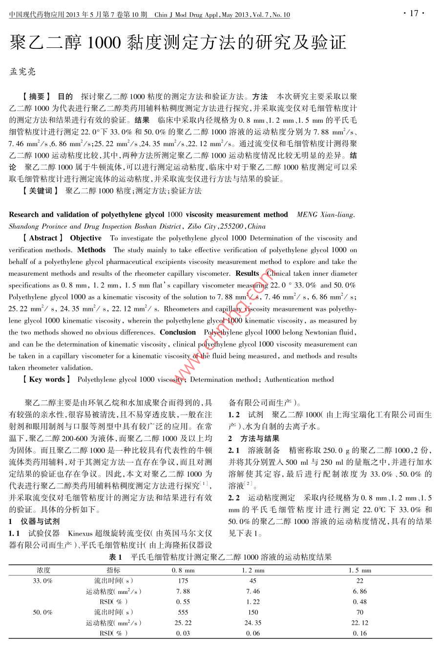 中國現(xiàn)代藥物應(yīng)用2013年5月第7卷第10期 Chin J Mod Drug Appl,May2013,vol.7,No,10聚乙二醇1000黏度測(cè)定方法的研究及驗(yàn)證孟憲亮【摘要】目的探討聚乙二醇1000粘度的測(cè)定方法和驗(yàn)證方法。方法本次研究主要采取以聚乙二醇1000為代表進(jìn)行聚乙二醇類藥用輔料粘稠度測(cè)定方法進(jìn)行探究,并采取流變儀對(duì)毛細(xì)管粘度計(jì)的測(cè)定方法和結(jié)果進(jìn)行有效的驗(yàn)證。結(jié)果臨床中采取內(nèi)徑規(guī)格為0.8mm、1.2mm、1.5mm的平氏毛細(xì)管粘度計(jì)進(jìn)行測(cè)定220下33.0%和50.0%的聚乙二醇1000溶液的運(yùn)動(dòng)粘度分別為7.88mm2/s、7.46mm2/s、6.86mm2/s;25.22mm2/s、24.35mm2/s、22.12mm2/s。通過流變儀和毛細(xì)管粘度計(jì)測(cè)得聚乙二醇1000運(yùn)動(dòng)粘度比較,其中,兩種方法所測(cè)定聚乙二醇1000運(yùn)動(dòng)粘度情況比較無明顯的差異。結(jié)論聚乙二醇1000屬于牛頓流體,可以進(jìn)行測(cè)定運(yùn)動(dòng)粘度,臨床中對(duì)于聚乙二醇1000粘度測(cè)定可以采取毛細(xì)管粘度計(jì)進(jìn)行測(cè)定流體的運(yùn)動(dòng)粘度,并采取流變儀進(jìn)行方法與結(jié)果的驗(yàn)證【關(guān)鍵詞】聚乙二醇1000粘度;測(cè)定方法;驗(yàn)證方法Research and validation of polyethylene glycol 1000 viscosity measurement method MENG Xian-liangShandong Province and Drug Inspection Boshan District, Zibo City, 255200, ChinaAbstract] Objective To investigate the polyethylene glycol 1000 Determination of the viscosity andverification methods. Methods The study mainly to take effective verification of polyethylene glycol 1000 onbehalf of a polyethylene glycol pharmaceutical excipients viscosity measurement method to explore and take themeasurement methods and results of the rheometer capillary viscometer. Results Clinical taken inner diameterpecifications as 0. 8 mm, 1. 2 mm, 1. 5 mm flat s capillary viscometer measuring 22. 033. 0% and 50. 0%Polyethylene glycol 1000 as a kinematic viscosity of the solution to 7. 88 mm/s, 7. 46 mm /s, 6. 86 mm/s25. 22 mm/s, 24 35 mm/s, 22. 12 mm/s, Rheometers and capillary viscosity measurement was polyethylene glycol 1000 kinematic viscosity, wherein the polyethylene glycol 1000 kinematic viscosity, as measured bythe two methods showed no obvious differences. Conclusion Polyethylene glycol 1000 belong Newtonian fluidand can be the determination of kinematic viscosity, clinical polyethylene glycol 1000 viscosity measurement canbe taken in a capillary viscometer for a kinematic viscosity of the fluid being measured, and methods and resultstaken rheometer validationKey words] Polyethylene glycol 1000 viscosity; Determination method; Authentication method聚乙二醇主要是由環(huán)氧乙烷和水加成聚合而得到的,具備有限公司而生產(chǎn))有較強(qiáng)的親水性,很容易被清洗,且不易穿透皮膚,一般在注1.2試劑聚乙二醇1000由上海寶瑞化工有限公司而生射劑和眼用制劑與口服等劑型中具有較廣泛的應(yīng)用。在常產(chǎn))、水為自制的去離子水。溫下,聚乙二醇200-600為液體,而聚乙二醇1000及以上均2方法與結(jié)果為固體。而且聚乙二醇1000是一種比較具有代表性的牛頓2.1溶液制備精密稱取250.0g的聚乙二醇1000,2份,流體類藥用輔料,對(duì)于其測(cè)定方法一直存在爭(zhēng)議,而且對(duì)測(cè)并將其分別置入500ml與250ml的量瓶之中,并進(jìn)行加水定結(jié)果的驗(yàn)證也存在爭(zhēng)議。因此,本文對(duì)聚乙二醇1000為溶解使其定容,最后進(jìn)行配制濃度為33.0%、50.0%的代表進(jìn)行聚乙二醇類藥用輔料粘稠度測(cè)定方法進(jìn)行探究溶液2。并采取流變儀對(duì)毛細(xì)管粘度計(jì)的測(cè)定方法和結(jié)果進(jìn)行有效2.2運(yùn)動(dòng)粘度測(cè)定采取內(nèi)徑規(guī)格為0.8mm、1.2mm、1.5的驗(yàn)證。具體的分析如下。mm的平氏毛細(xì)管粘度計(jì)進(jìn)行測(cè)定22.0℃下33.0%和1儀器與試劑50.0%的聚乙二醇1000溶液的運(yùn)動(dòng)粘度情況,具有的結(jié)果1.1試驗(yàn)儀器 Kinexus超級(jí)旋轉(zhuǎn)流變儀(由英國馬爾文儀見下表1。器有限公司而生產(chǎn))、平氏毛細(xì)管粘度計(jì)(由上海隆拓儀器設(shè)表1平氏毛細(xì)管粘度計(jì)測(cè)定聚乙二醇1000溶液的運(yùn)動(dòng)粘度結(jié)果濃度指標(biāo)0.81.2mm1.5mm流出時(shí)間(s)運(yùn)動(dòng)粘度(mm2/s)7.887.466.86RDX %0.551.220.48流出時(shí)間(s運(yùn)動(dòng)粘度(mm2/s)RSI %O0.030.1618中國現(xiàn)代藥物應(yīng)用2013年5月第7卷第10期 Chin J Mod Drug Appl,May2013,Vdl7,No,102.3方法與結(jié)果驗(yàn)證33.0%和50.0%的聚乙二醇1000溶液,并分析在20℃和25℃及40℃溫度下的剪切速率、剪切應(yīng)力和動(dòng)力粘度之間的曲線關(guān)系(下圖1與圖2),以及各溫度下的動(dòng)力粘度測(cè)定結(jié)果(下表2)。圖233.0%聚乙二醇1000溶液在20℃和25℃及40℃溫度下動(dòng)力粘度曲線圖133.0%聚乙二醇10液在20℃和25℃及40℃溫度下2.3.2相對(duì)密度測(cè)定對(duì)于聚乙二醇1000溶液的濃度測(cè)剪切應(yīng)力曲線和動(dòng)力粘度曲線定主要依據(jù)ChP2010二部中附錄部分ⅥIA的方法進(jìn)行操作并且在20℃條件下測(cè)定33.0%和50.0%的聚乙二醇1000s05溶液的相對(duì)密度分別為1.0622和1.07833。23.3動(dòng)力與運(yùn)動(dòng)粘度的分析依據(jù)v=Bp,=vp公式進(jìn)行動(dòng)力粘度和運(yùn)動(dòng)粘度的轉(zhuǎn)換3,33.0%和50.0%的聚乙醇1000溶液的運(yùn)動(dòng)粘度分別為8.121mm2/s和25.503因延率/4