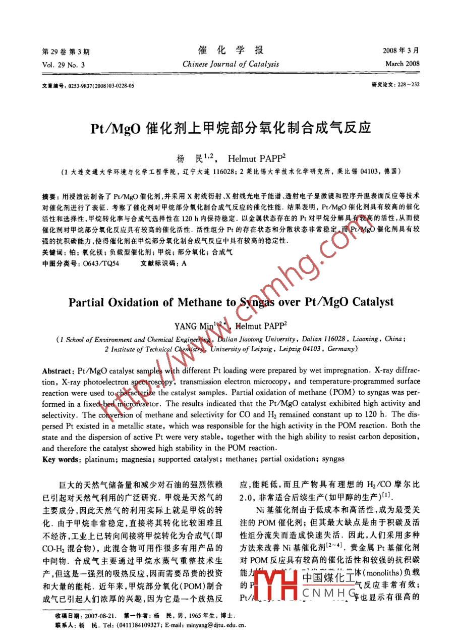 Pt/MgO 催化劑上甲烷部分氧化制合成氣反應(yīng)