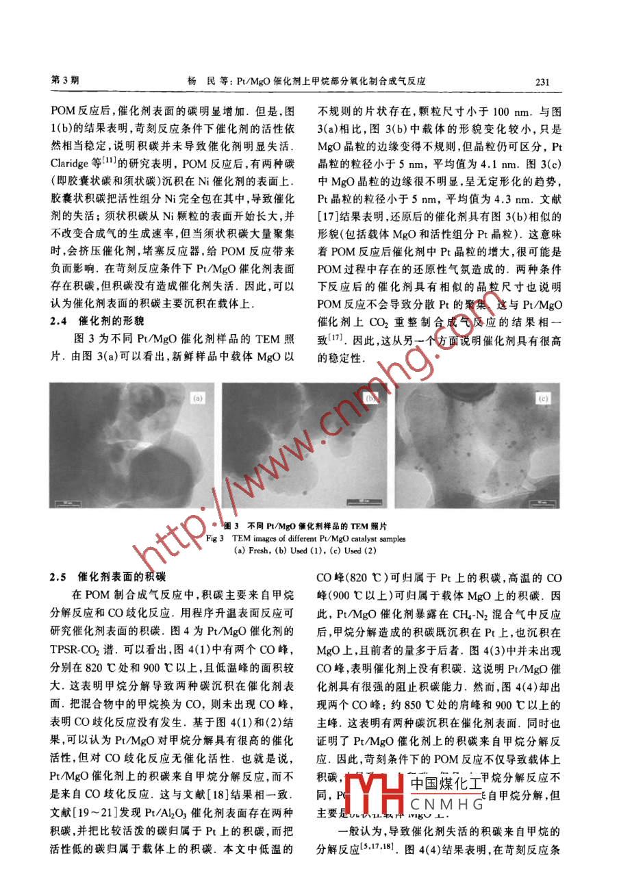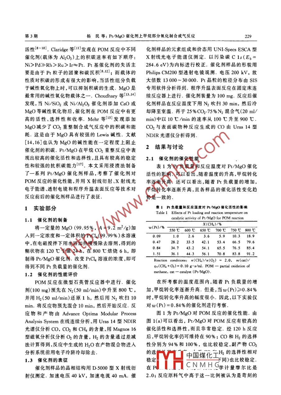 第29卷第3期催化學(xué)報2008年3月Vol. 29 No. 3Chinese journal of catalysisMarch 2008文章雄號:02539837(2008)03022805研究論文:228~232P/MgO催化劑上甲烷部分氧化制合成氣反應(yīng)楊民12, Helmut papp(1大連交通大學(xué)環(huán)境與化學(xué)工程學(xué)院,遼寧大連116028;2萊比錫大學(xué)技術(shù)化學(xué)研究所,萊比錫04103,德國)摘要:用浸漬法制備了PMgO催化劑,并采用X射線衍射X射線光電子能譜、透射電子顯微鏡和程序升溫表面反應(yīng)等技術(shù)對催化劑進行了表征.考察了催化劑對甲烷部分氧化制合成氣反應(yīng)的催化性能.結(jié)果表明,Pt/MgO催化劑具有較高的催化活性和選擇性,甲烷轉(zhuǎn)化率與合成氣選擇性在120h內(nèi)保持穩(wěn)定.以金屬狀態(tài)存在的Pt對甲烷分解具有較高的活性,從而使催化劑對甲烷部分氧化反應(yīng)具有較高的催化活性,活性組分Pt的存在狀態(tài)和分散狀態(tài)非常穩(wěn)定,而Pt/MgO催化劑具有較強的抗積碳能力,使得催化劑在甲烷部分氧化制合成氣反應(yīng)中具有較高的穩(wěn)定性關(guān)鍵詞:鉑;氧化鎂;負(fù)載型催化劑;甲烷;部分氧化;合成氣中圖分類號:0643/TQ54文獻標(biāo)識碼:APartial Oxidation of Methane to Syngas over Pt/MgO catalystMin22“, Helmut papp2(1 School of Environment and Chemical Engineering, Dalian Jiaotong Uniuersity, Dalian 116028, Liaoning, China;2 Institute of Technical Chemistry, University of Leipzig, Leipzig 04103, GermanyAbstract Pt/Mgo catalyst samples with different Pt loading were prepared by wet impregnation. X-ray diffraction, X-ray photoelectron spectroscopy, transmission electron microcopy, and temperature-programmed surfacereaction were used to characterize the catalyst samples. Partial oxidation of methane(POM)to syngas was per-formed in a fixed-bed microreactor. The results indicated that the Pt/Mgo catalyst exhibited high activity andselectivity. The conversion of methane and selectivity for CO and H2 remained constant up to 120 h. The dis-persed Pt existed in a metallic state, which was responsible for the high activity in the POM reaction. Both thestate and the dispersion of active Pt were very stable, together with the high ability to resist carbon depositionand therefore the catalyst showed high stability in the POM reactionKey words: platinum; magnesia; supported catalyst; methane; partial oxidation; syngas巨大的天然氣儲備量和減少對石油的強烈依賴應(yīng),能耗低,而且產(chǎn)物具有理想的H2CO摩爾比已引起對天然氣利用的廣泛研究.甲烷是天然氣的2.0,非常適合后續(xù)生產(chǎn)(如甲醇的生產(chǎn))主要成分,因此天然氣的利用實際上就是甲烷的轉(zhuǎn)Ni基催化劑由于低成本和高活性,成為最受關(guān)化.由于甲烷非常穩(wěn)定,直接將其轉(zhuǎn)化比較困難且注的POM催化劑;但其最大缺點是由于積碳及活不經(jīng)濟,工業(yè)上已轉(zhuǎn)向間接將甲烷轉(zhuǎn)化為合成氣(即性組分流失而造成快速失活.因此,人們采用多種COH2混合物),此混合物可用作很多有用產(chǎn)品的方法來改善N基催化劑2-4,貴金屬Pt基催化劑中間物.合成氣主要通過甲烷水蒸氣重整技術(shù)生對POM反應(yīng)具有較高的催化活性和較強的抗積碳產(chǎn),但這是一強烈的吸熱反應(yīng),因而需要昂貴的投資能中國煤化工體mmh)負(fù)載和大量的能耗.近年來,甲烷部分氧化(POM)制合的三氣反應(yīng)非常有效成氣已引起人們濃厚的興趣,因為它是一個放熱反PtCNMH等也顯示有很高的收稿日期:20070821.第一作者:楊民,男,1965年生,博士聯(lián)系人:楊民.Te:(0411)84109327;Emil: minyang@dtu.cdu.cm第3期楊民等:Pt/MO催化劑上甲烷部分氧化制合成氣反應(yīng)活性{8-10). Claridge等l現(xiàn)在POM反應(yīng)中不同化劑樣品的元素組成和價態(tài)用 UNI-Specs ESCA型催化劑(載體為Al2O3)上的積碳速率有如下順序:X射線光電子能譜儀測定.以污染碳C1s(Eb=Ni>Pd>Rh>Ru>Ir≈Pt.Pt基催化劑的失活主284.6eV)為內(nèi)標(biāo)進行校正.催化劑樣品的形貌用要是由于Pt粒子的團聚和碳沉積812);而載體的 Philips CM200型透射電鏡觀測.電壓200kV,放性質(zhì)對積碳的形成有很大的影響,當(dāng)活性組分負(fù)載大倍數(shù)13000~30000.Pt晶粒的粒徑分布由SIs于堿性氧化物上時,可以抑制積碳的生成.MgO是專用軟件分析得到.程序升溫表面反應(yīng)在固定床連最常用的堿性氧化物載體之一. Choudhary等13,4續(xù)反應(yīng)器上進行.催化劑裝量為100mg.反應(yīng)后催發(fā)現(xiàn),當(dāng)Ni/SiO2或Ni/Al2O3催化劑添加CaO或化劑樣品在反應(yīng)溫度下用N2吹掃30min,然后冷MgO等堿性氧化物后,催化劑在POM反應(yīng)中有更卻降至室溫.再于25%CO2-75%N2混合氣(20ml高的活性、選擇性和收率.Mehr等15發(fā)現(xiàn)添加min)中以10℃/min的速率從100℃升至900℃MgO減少了CO2重整制合成氣反應(yīng)中的積碳和能CO2與表面碳物種反應(yīng)生成的CO由Uras14型耗.這是由于MgO具有較強的 Lewis堿性.文獻NDR光譜儀分析得到[14,16]也認(rèn)為MgO的堿性能在一定程度上阻止催化劑的積碳.Pt/MgO在甲烷CO2重整反應(yīng)中表2結(jié)果與討論現(xiàn)出較高的催化活性和選擇性,且具有較高的穩(wěn)定2.1催化劑的催化性能性和較強的抗積碳能力17.本文采用浸漬法制備表1為Pt負(fù)載量和反應(yīng)溫度對Pt/MgO催化了一系列Pt/MgO催化劑樣品,考察了催化劑對活性的影響.可以看出,隨著溫度的升高,甲烷轉(zhuǎn)化POM反應(yīng)的催化性能,并用X射線衍射、X射線光率逐漸升高.還可以看出,隨著Pt負(fù)載量的增加,