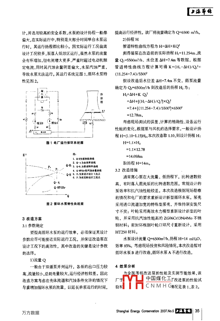 上海節(jié)結(jié)]熱電廠循環(huán)水泵 節(jié)能改造實(shí)踐常州亞能熱電有限公司卞國(guó)強(qiáng)江蘇省特種設(shè)備安全監(jiān)督檢驗(yàn)研究院常州分院岳勇常州工程職業(yè)技術(shù)學(xué)院機(jī)械系黃先平摘要:電廠循環(huán)水泵往往因?qū)嶋H運(yùn)行工況偏離設(shè)計(jì)工況較遠(yuǎn)而落入低效區(qū)。根據(jù)實(shí)際情況,選擇合適的設(shè)計(jì)參數(shù)對(duì)循環(huán)水泵進(jìn)行技術(shù)改造,使設(shè)計(jì)工況接近實(shí)際所需的運(yùn)行工況,取得明顯的增容、節(jié)電效果。關(guān)鍵詞:循環(huán)水泵參數(shù)確定技術(shù)改造Energy Saving Renovation Practice of the Circulation Pumps inThermoelectricity ManufacturersBy Bian Guo-qiang Yue Yong Huang xian- pingAbstract: the circulation pumps in thermoelectricity manufacturers are accustomed torun in the working condition of lower eficiency because of the difference between thedesigning condition and working condition. Based on the local condition, the authorchooses the proper design parameters for circulation pumps technology renovation in orderto close the gap between designing condition and requiring condition. Such methodswould improve system redundancy and energy saving effect.Keywords: circulation pumps, design parameters confirmaion, technology renovation1引言實(shí)際單循泵運(yùn)行時(shí),流量5500m2/h,揚(yáng)程=某熱電廠50MW機(jī)組配套的32SA-19A型循11.254mH2O,電動(dòng)機(jī)耗功420.577kW ,泵運(yùn)行效率環(huán)水泵由上海凱士比水泵廠制造,設(shè)計(jì)流量500043.57%。 為提高循環(huán)水泵的經(jīng)濟(jì)性,該廠對(duì)循環(huán)水泵m2/h ,設(shè)計(jì)揚(yáng)程26mH2O,轉(zhuǎn)速730r/min,配套電動(dòng)進(jìn)行了技術(shù)改造,取得了理想的效果。機(jī)450kW,效率90%。該設(shè)備投運(yùn)初始,因電動(dòng)機(jī)超電流而無(wú)法運(yùn)行,只能通過(guò)車削葉輪降低水泵出力2改造原因.才使得電動(dòng)機(jī)正常運(yùn)行,但水泵實(shí)際運(yùn)行效率很低。通常,單臺(tái)機(jī)組循環(huán)水泵按二臺(tái)泵并列運(yùn)行設(shè)作者簡(jiǎn)介:卞國(guó)強(qiáng)(1974-).男,工程師;1997年中國(guó)礦業(yè)大學(xué)熱能動(dòng)力專業(yè)中國(guó)煤化士管理工作。岳勇(1971- ),男,鍋爐、壓力容器.壓力菅道檢驗(yàn)師,高級(jí)工程9:TYHC NMH G業(yè)畢業(yè),從事鍋爐定期栓驗(yàn)及安裝監(jiān)檢工作。3號(hào)級(jí)H日Shanghai Energy Consevation 2007 No.5上海茚售計(jì),并選用較高的安全系數(shù),水泵的設(shè)計(jì)揚(yáng)程一-般都提高運(yùn)行經(jīng)濟(jì)性。 該廠將流量確定為Q=6500 m/h。偏大,在實(shí)際運(yùn)行中,特別是大部分時(shí)間單臺(tái)水泵運(yùn)2)揚(yáng)程H行時(shí),其運(yùn)行揚(yáng)程都比較小。因?qū)嶋H運(yùn)行I祝偏離管道特性曲線方程為H=AH+KQ2設(shè)計(jì)工況較多,泵落人低效區(qū)運(yùn)行,雖然水泵的流量測(cè)得循泵在改造前的實(shí)際揚(yáng)程H=11.254m、流會(huì)有所增加,但電流增大更多,嚴(yán)重時(shí)超過(guò)電動(dòng)機(jī)額量Q.=5500m2/h、水位差A(yù)H=7.4m等數(shù)據(jù),根據(jù)定電流,同時(shí)其汽蝕余量明顯偏大,水泵汽蝕嚴(yán)重,管道特性曲線方程計(jì)算可得K=(H-0H)/Q?=導(dǎo)致水泵無(wú)法運(yùn)行。其運(yùn)行系統(tǒng)見圖1,循環(huán)水泵特(11.254-7.4/500性見圖2。假設(shè)改造后水位差A(yù)H=7.4m不變,循泵流量確定為Qz=6500m/h則改造后的揚(yáng)程H2為:H2=AH+K Q2塔=AH+[(H(-0H)/Q?xQ2=7.4+(11.254-7.4>/55007*65002=12.78m,循系B中循教A中的考慮現(xiàn)場(chǎng)測(cè)試的誤差、計(jì)算的精確性、設(shè)備運(yùn)行性能的變化,,根據(jù)泵與風(fēng)機(jī)的選擇要求,-般設(shè)計(jì)揚(yáng)程H=(1.10~1.15)H2,本次改造取1.10, 則設(shè)計(jì)揚(yáng)程H:圍1電廠運(yùn)行循環(huán)系統(tǒng)圍H=1,1XH2=1.1x12.78H+=14.058m1. 04HI為泵揚(yáng)程曲線2. 0n為氯效率曲線取揚(yáng)程H=14m。QH 3. QH:為管道特件曲線4. -NPSHr系汽蝕余曩曲絏3.2改造措施5. Po 為聚設(shè)計(jì)適行1.況點(diǎn)”6. P.為桌實(shí)際運(yùn)行工況點(diǎn)通常離心泵在大流量、低揚(yáng)程下,比轉(zhuǎn)速數(shù)較Q- η高,有時(shí)落人混流泵的比轉(zhuǎn)速數(shù)范圍。常規(guī)設(shè)計(jì)的Q NPSIHr泵效率和抗汽蝕性能較差。本次改造根據(jù)現(xiàn)場(chǎng)勘察的情況和電廠的要求重新設(shè)計(jì)新型循環(huán)水泵。泵殼圍2循環(huán)水泵特性曲線圉采用進(jìn)口流道加寬的特殊型泵殼,并維持原安裝尺寸不變;葉輪采用高效水力模型重新設(shè)計(jì)新型的葉3改造方案輪,并采用抗汽蝕性能高的ZG06Cr13Ni4Mo不銹3.1參數(shù)確定鋼材料:密封環(huán)根據(jù)葉輪口環(huán)尺寸重新設(shè)計(jì),采用要提高循環(huán)水泵的運(yùn)行效率,必須保證其設(shè)計(jì)HT250材料。參數(shù)應(yīng)盡可能接近實(shí)際運(yùn)行工況,并保證改造泵在水泵設(shè)計(jì)流量Q=6500m/h,揚(yáng)程H=14 mH2O, .設(shè)計(jì)工況下的高效性,其中改造的關(guān)鍵是設(shè)計(jì)參數(shù)效率85%??紤]現(xiàn)場(chǎng)投資和風(fēng)險(xiǎn)情況,本次改造暫對(duì)的選擇。循環(huán)水泵B進(jìn)行改造,循環(huán)水泵A不進(jìn)行改造。1)流量Q一般由于雙循泵并列運(yùn)行,各泵的出口壓力較4效果分析高,流量較小,總耗電量較大,運(yùn)行經(jīng)濟(jì)性較