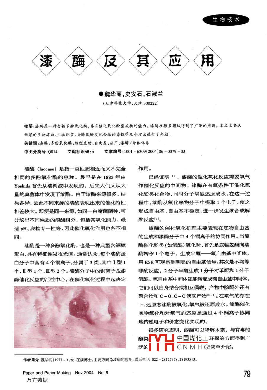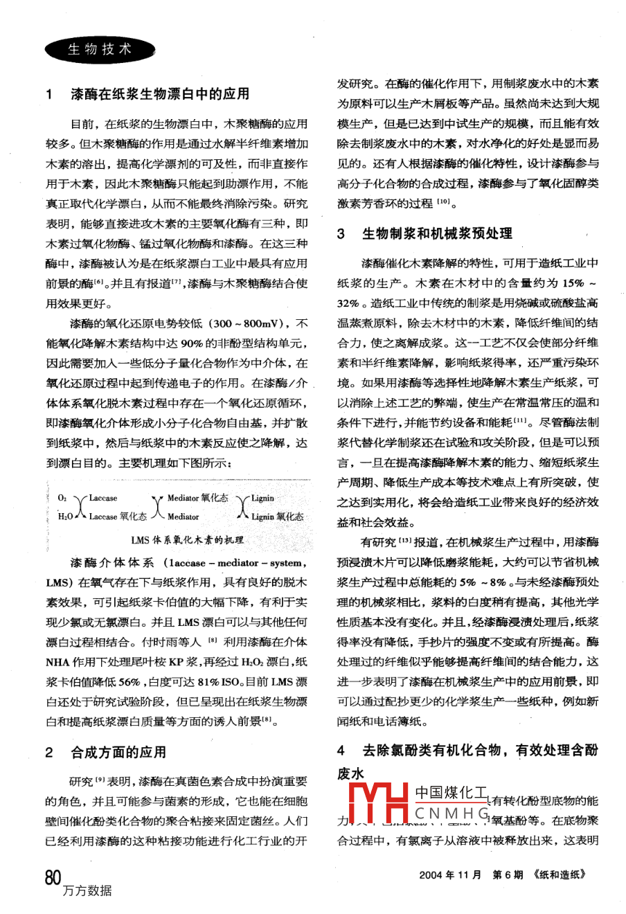 生物技術漆>〈酶〉〈及〉其〈應〉〈用●魏華麗,史安石,石淑蘭(天津科技大學,天津300222)摘要:漆酶是一種含銅多酚氧化酶,具有催化氧化酚型底物的能力。漆酶在很多領域得到了廣泛的應用。本文主要從紙漿的生物漂白、生物制漿、去除氯酚類化合物的毒性等幾個方面進行了介紹。關鍵詞;漆酶;多酚氧化酶;酚型底物;自由基;應用;漆酶/介體體系中圖分類號:Q814文獻標識碼:A文章編號:1001-6309(2004)06-0079-03漆酶( laccase)是指一類性質相近而又不完全作用相同的多酚氧化酶的總稱。最早是在1883年由已經證明m,漆酶的催化氧化反應需要氧氣Yoshida首先從漆樹液中發(fā)現的,后來人們又從大作催化反應的中間物。漆酶在有氧條件下催化氧量的真菌體中發(fā)現了漆酶。由于漆酶來源很多,結化酚類化合物,同時分子氧被還原成水,在這一過構各異,因此不同來源的漆酶表現出來的催化特性程中,漆酶從氧化底物分子中提取1個電子,使之相差較大。即便是同一來源,如同一白腐菌菌種,可形成自由基,自由基不穩(wěn)定,進一步發(fā)生聚合或解分泌出不同性質的漆酶組分,包括其氧化能力、最聚反應)適pH、底物專一性等,因此催化氧化作用也各不相漆酶的催化氧化機理主要表現在底物自由基同的生成和漆酶分子中4個銅離子的協(xié)同作用。當漆漆酶是一種多酚氧化酶,也是一種典型含銅糖酶催化酚類(如氫醌)氧化時,首先是底物氫醌向漆蛋白,具有特征性吸收光譜。通常認為,每個漆酶蛋酶轉移1個電子,生成半醌—氧自由基中間體,白分子中含有4個銅離子,分屬于3類,其中I型1用ESR可觀察到明顯的自由基信號。其次是不均等個,Ⅱ型1個,Ⅲ型2個。漆酶分子中的銅離子是漆非酶反應,2分子半醌生成1分子對苯醌和1分子酶催化反應的活性中心,在催化氧化過程中起決定氫醌。氧自由基中間體還能轉變成碳自由基中間體它們可以自身結合或相互偶聯,產物中除醌外還有聚合物和C-O、C-C偶聯產物3-5。在氧氣的存在下,還原態(tài)漆酶被氧化氧氣被還原成水。漆酶催化底物氧化和對氧氣的還原是通過4個銅離子協(xié)同地傳遞電子和價態(tài)變化實現的。很多研究表明,漆酶可以降解木素,與有毒的酚類中國煤化工環(huán)保等方面得到泛的CNMHG簡單介紹。作者簡介:魏華麗(1977-),女,在讀博士,主要方向為漆酶的應用聯系電話:022-2817575828193513Paper and Paper Making Nov 200479生物技術1漆酶在紙漿生物漂白中的應用發(fā)研究。在酶的催化作用下,用制漿廢水中的木素為原料可以生產木屑板等產品。雖然尚未達到大規(guī)目前,在紙漿的生物漂白中,木聚糖酶的應用模生產,但是已達到中試生產的規(guī)模,而且能有效較多。但木聚糖酶的作用是通過水解半纖維素增加除去制漿廢水中的木素,對水凈化的好處是顯而易木素的溶出,提高化學漂劑的可及性,而非直接作見的。還有人根據漆酶的催化特性,設計漆酶參與用于木素,因此木聚糖酶只能起到助漂作用,不能高分子化合物的合成過程,漆酶參與了氧化固醇類真正取代化學漂白,從而不能最終消除污染。研究激素芳香環(huán)的過程10。表明,能夠直接進攻木素的主要氧化酶有三種,即3生物制漿和機械漿預處理木素過氧化物酶、錳過氧化物酶和漆酶。在這三種酶中,漆酶被認為是在紙漿漂白工業(yè)中最具有應用漆酶催化木素降解的特性,可用于造紙工業(yè)中前景的酶6并且有報道,漆酶與木聚糖酶結合使紙漿的生產。木素在木材中的含量約為15%用效果更好。32%。造紙工業(yè)中傳統(tǒng)的制漿是用燒堿或硫酸鹽高漆酶的氧化還原電勢較低(300~800mV),不溫蒸煮原料,除去木材中的木素,降低纖維間的結能氧化降解木素結構中達90%的非酚型結構單元,合力,使之離解成漿。這一工藝不僅會使部分纖維因此需要加入一些低分子量化合物作為中介體,在素和半纖維素降解,影響紙漿得率,還嚴重污染環(huán)氧化還原過程中起到傳遞電子的作用。在漆酶/介境。如果用漆酶等選擇性地降解木素生產紙漿,可體體系氧化脫木素過程中存在一個氧化還原循環(huán),以消除上述工藝的弊端,使生產在常溫常壓的溫和即漆酶氧化介體形成小分子化合物自由基,并擴散條件下進行,并能節(jié)約設備和能耗(。盡管酶法制到紙漿中,然后與紙漿中的木素反應使之降解,達漿代替化學制漿還在試驗和攻關階段,但是可以預到漂白目的。主要機理如下圖所示言,一旦在提高漆酶降解木素的能力、縮短紙漿生產周期、降低生產成本等技術難點上有所突破,使LaccaseMediator氧化態(tài) LIgnin之達到實用化,將會給造紙工業(yè)帶來良好的經濟效HO人 Laccase氧化態(tài)人 MediateLignin 2氧化態(tài)益和社會效益。LMS體系氧化木素的機理有研究報道,在機械漿生產過程中,用漆酶漆酶介體體系(1 accase- mediator- system,預浸漬木片可以降低磨漿能耗,大約可以節(jié)省機械LMS)在氧氣存在下與紙漿作用,具有良好的脫木漿生產過程中總能耗的5%~8%。與未經漆酶預處素效果,可引起紙漿卡伯值的大幅下降,有利于實理的機械漿相比,漿料的白度稍有提高,其他光學現少氯或無氯漂白。并且LMS漂白可以與其他任何性質基本沒有變化。并且,經漆酶浸漬處理后,紙漿漂白過程相結合。付時雨等人利用漆酶在介體得率沒有降低,手抄片的強度不變或有所提高。酶NHA作用下處理尾葉桉KP漿,再經過HO2漂白,紙?zhí)幚磉^的纖維