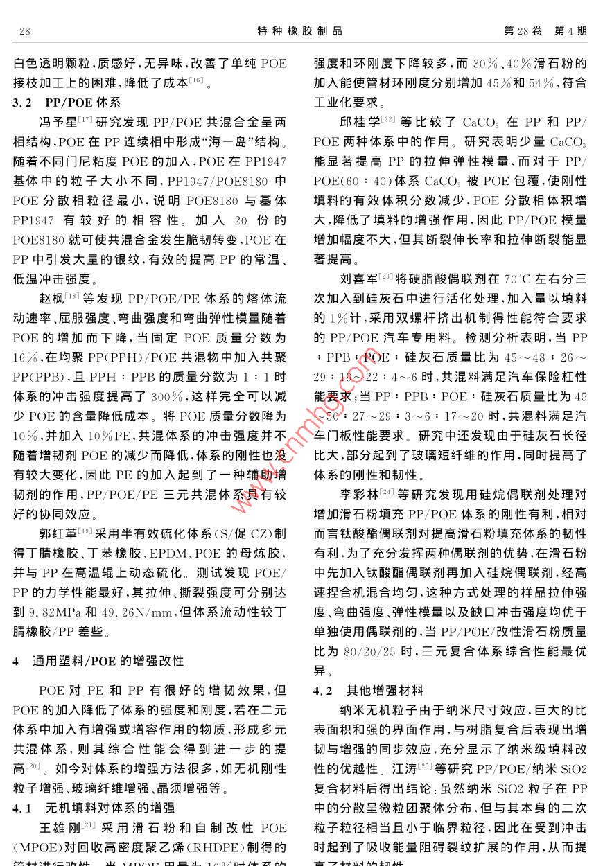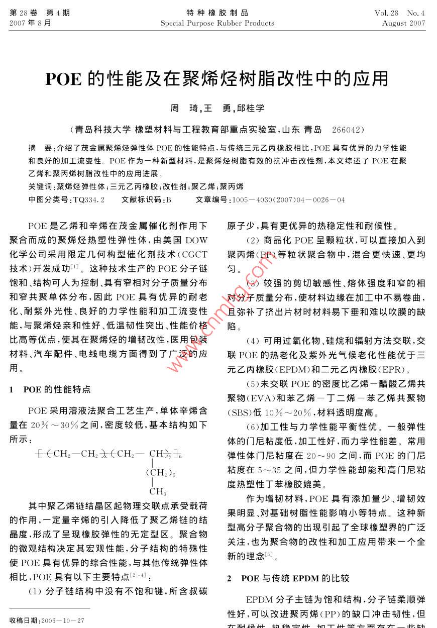 第28卷第4期特種橡膠制品Vol. 28 No. 42007年8月Special Purpose Rubber ProductsAugust 2007POE的性能及在聚烯烴樹脂改性中的應(yīng)用周琦,王勇,邱桂學(xué)(青島科技大學(xué)橡塑材料與工程教育部重點實驗室,山東青島266042)摘要:介紹了 茂金屬聚烯烴彈性體POE的性能特點,與傳統(tǒng)三元乙丙橡膠相比,POE具有優(yōu)異的力學(xué)性能和良好的加工流變性。POE作為一種新型材料,是聚烯烴樹脂有效的抗沖擊改性劑,本文綜述了POE在聚乙烯和聚丙烯樹脂改性中的應(yīng)用進展。關(guān)鍵詞:聚烯烴彈性體;三元乙丙橡膠;改性劑;聚乙烯;聚丙烯中圖分類號:TQ334.2文獻標識碼:B文章編號:1005 - 4030(2007)04 - 0026- 04POE是乙烯和辛烯在茂金屬催化劑作用下原子少,具有更優(yōu)異的熱穩(wěn)定性和耐候性。聚合而成的聚烯烴熱塑性彈性體,由美國DOW(2)商品化POE呈顆粒狀,可以直接加入到化學(xué)公司采用限定幾何構(gòu)型催化劑技術(shù)(CGCT聚丙烯(PP)等粒狀聚合物中,混合更快速、更均技術(shù))開發(fā)成功口。這種技術(shù)生產(chǎn)的POE分子鏈勻。飽和、結(jié)構(gòu)可人為控制、具有窄相對分子質(zhì)量分布(3)較強的剪切敏感性、熔體強度和窄的相和窄共聚單體分布,因此POE具有優(yōu)異的耐老對分子質(zhì)量分布,使材料邊緣在加工中不易卷曲,化.耐紫外光性、良好的力學(xué)性能和加工流變性且彌補了擠出片材時材料易下垂和難以吹膜的缺能,與聚烯烴親和性好、低溫韌性突出、性能價格陷。比高等優(yōu)點,使其在聚烯烴的增韌改性,醫(yī)用包裝(4)可用過氧化物、硅烷和輻射方法交聯(lián),交材料、汽車配件、電線電纜方面得到了廣泛的應(yīng)聯(lián)POE的熱老化及紫外光氣候老化性能優(yōu)于三用。元乙丙橡膠(EPDM)和二元乙丙橡膠(EPR)。(5)未交聯(lián)POE的密度比乙烯一醋酸乙烯共1POE的性能特點聚物(EVA)和苯乙烯一丁二烯一苯乙烯共聚物POE采用溶液法聚合工藝生產(chǎn),單體辛烯含(SBS)低10%~ 20%,材料透明度高。量在20%~30%之間,密度較低,基本結(jié)構(gòu)如下(6)加工性與力學(xué)性能平衡性優(yōu)。-般彈性所示:體的門尼粘度低,加工性好,而力學(xué)性能差。常用∈∈CH2- CH2X∈CH2- CH分玉彈性體門尼粘度在20~90之間,而POE的門尼(CH2)s粘度在5~35之間,但力學(xué)性能卻能和高門尼粘度熱塑性丁苯橡膠媲美。CH3其中聚乙烯鏈結(jié)晶區(qū)起物理交聯(lián)點承受載荷作為增韌材料,POE具有添加量少、增韌效的作用,一定量辛烯的引入降低了聚乙烯鏈的結(jié)果明顯、對基礎(chǔ)樹脂性能影響小等特點。這種新晶度,形成了呈現(xiàn)橡膠彈性的無定型區(qū)。聚合物.型高分子聚合物的出現(xiàn)引起了全球橡塑界的廣泛的微觀結(jié)構(gòu)決定其宏觀性能,分子結(jié)構(gòu)的特殊性關(guān)注,也為聚合物的改性和加工應(yīng)用帶來一個全使POE具有優(yōu)異的綜合性能,與其他傳統(tǒng)彈性體新的理念[5]。相比,POE具有以下主要特點[2~4]:2POE與傳統(tǒng)EPDM的比較(1)分子鏈結(jié)構(gòu)中沒有不飽和鍵,所含叔碳EPDM分子主鏈為飽和結(jié)構(gòu),分子鏈柔順彈性好,可以改進聚丙烯(PP)的缺口沖擊韌性,但收稿日期:2006-10-27.作者簡介:周琦(1982-).女 ,在讀碩士研究生,主要研究茂金屬在耐候性、熱穩(wěn)定性、加工性等方面存在一些缺聚烯烴彈理體的改性及應(yīng)用。陷。而POE改性PP不僅可以克服EPDM增韌2007年周琦等POE的性能及在聚烯烴樹脂改性中的應(yīng)用27PP的不足,還賦予PP更高的韌性、高透明性等3POE在聚烯烴樹脂改性中的應(yīng)用特點。張金柱[2]研究指出,在相同的混煉和注塑條件下,無論PP的熔融流動速率(MFR)如何變.POE作為一種新型的增韌改性劑,最大應(yīng)用化,其低溫(-30"C)沖擊能均是POE>EPDM>在塑料制品上。由于POE的內(nèi)聚能較小,其表觀EPR,特別是當(dāng)使用高MFR(≥20)的PP時,EP-切變粘度對溫度的敏感性接近聚烯烴樹脂,與聚.DM和EPR改性的PP均已變脆,而POE改性的烯烴樹脂共混更容易得到較小的彈性體粒徑和較PP仍保持相當(dāng)?shù)捻g性。這樣在生產(chǎn)上可使用高窄的粒徑分布,增韌改性效果較為顯著。在汽車流動性PP,既避免了以前使用高MFR增韌劑時保險杠、擋板、模壓件、管件、織物涂層等制件.上得大幅降低體系沖擊強度的不足,又能縮短成型周到了應(yīng)用,可與EPR、軟聚氯乙烯、EVA.苯乙烯.期節(jié)省能耗。嵌段共聚物競爭11]。POE用作PP的抗沖擊改性劑,具有明顯的3.1 PE/POE 體系優(yōu)勢,其主要原因有以下幾點:首先,由于POE的近年來,木塑復(fù)合材料因其成本低、質(zhì)量輕、側(cè)乙基長于EPDM的側(cè)甲基.在分子鏈間起到一機械性能好等優(yōu)點受到普遍關(guān)注。但熱塑性塑料種聯(lián)結(jié)、緩沖作用,減少銀紋因受力發(fā)展成裂紋,在填充木粉后變脆,限制了木塑復(fù)合材料的應(yīng)用其增韌效果優(yōu)于EPDM[6]。其次,長鏈支化結(jié)構(gòu)和推廣。李蘭杰[121 等采用廢木粉填充高密度聚改進了POE的加工流變性能,使POE具有較強.乙烯(HDPE)制備木塑復(fù)合材料,用茂金屬聚乙的剪切敏感性和低的熔體彈性,所以在高溫剪切烯(mPESP1520)和POE分別對復(fù)合材料進行改作用下POE分散相比EPDM分散相更容易被拉性。在兩者用量小于12%時增韌效果相差不大,長、破裂,從而在PP母體中分散得更好,抗沖擊但用量大于12%時,用POE增韌的復(f