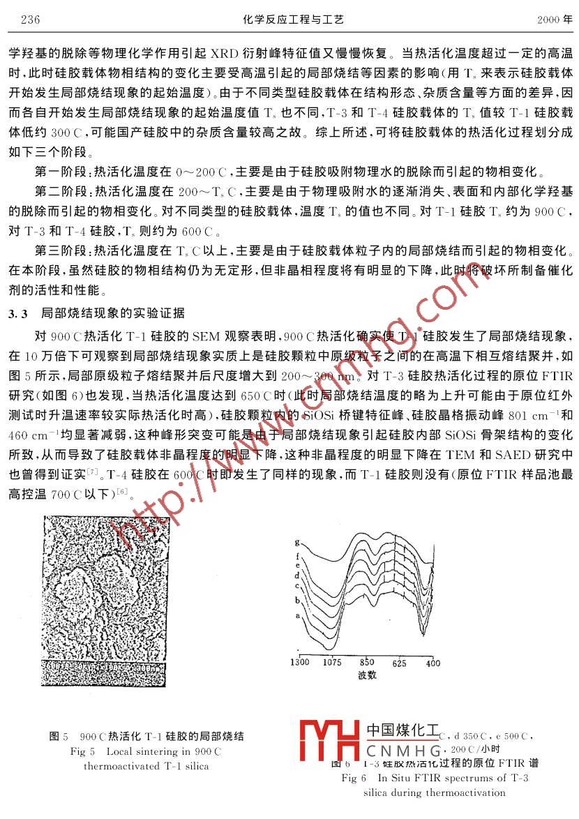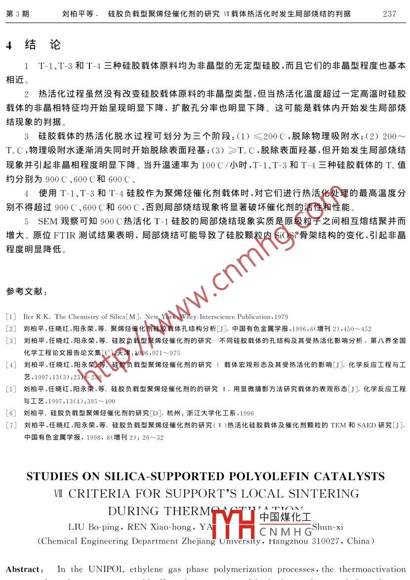 第16卷第3期化學(xué)反應(yīng)工程與工藝16,No32000年9月Chemical Reaction Engineering and TechnologySept, 2000文章編號(hào):1001-7631(2000)03-0233-06硅膠負(fù)載型聚烯烴催化劑的研究Ⅶ載體熱活化時(shí)發(fā)生局部燒結(jié)的判據(jù)劉柏平,任曉紅,陽(yáng)永榮,戎順熙(浙江大學(xué)化工系聯(lián)合化學(xué)反應(yīng)工程研究所,浙江杭州310027)摘要:硅膠載體熱活化過(guò)程中的局部燒結(jié)現(xiàn)象對(duì)催化劑的活性和性能有較大的破壞作用。本文利用ⅹRDSEM和原位FIIR等手段對(duì)三種熱活化硅膠載體進(jìn)行了研究。研究表明,T-1、T-3和T-4三種硅膠載體發(fā)生局部燒結(jié)現(xiàn)象的起始溫度T、值約分別為9ωθ℃、600℃和6ωθ℃(升溫速率100℃小時(shí)),局部燒結(jié)現(xiàn)象將引起硅膠載體非晶程度下降,擴(kuò)散孔分率下降。SEM觀察到了ρθ0℃熱活化T-1硅膠中的局部燒結(jié)現(xiàn)象,其實(shí)質(zhì)是原級(jí)粒子之間相互熔結(jié)聚并而增大。原位紅外結(jié)果則表明,局部燒結(jié)可能導(dǎo)致了硅膠顆粒內(nèi)部 SiSI骨架結(jié)構(gòu)的變化關(guān)鍵詞:聚烯烴催化劑載體;硅膠熱活化;局部燒結(jié)中圖分類號(hào):TQ314.24-2文獻(xiàn)標(biāo)識(shí)碼:A1前言近年來(lái), UNIPOI氣相聚乙烯工藝由于其自身明顯的優(yōu)勢(shì)而在世界聚乙烯工業(yè)的發(fā)展中占據(jù)了主導(dǎo)地位,該工藝中使用的負(fù)載型催化劑載體材料主要為無(wú)定形硅膠。用作聚乙烯催化劑載體的硅膠,必須經(jīng)過(guò)一定溫度下的熱活化過(guò)程才能用于催化劑的制備。通過(guò)熱活化,一方面脫除物理吸附水另一方面脫除一部分表面羥基以調(diào)節(jié)表面羥基密度用于負(fù)載催化劑活性組分。但熱活化也會(huì)對(duì)載體的物理結(jié)構(gòu)形態(tài)產(chǎn)生影響-S,尤其當(dāng)熱活化溫度升高到一定程度時(shí)會(huì)導(dǎo)致硅膠局部燒結(jié)現(xiàn)象的發(fā)生,局部燒結(jié)將對(duì)催化劑的活性和性能產(chǎn)生較大的破壞作用,但文獻(xiàn)中對(duì)這一現(xiàn)象的硏究報(bào)道很少,本文使用XRD、SEM和原位FTIR等手段對(duì)硅膠載體熱活化過(guò)程中的局部燒結(jié)現(xiàn)象進(jìn)行了研究,得出了一些局部燒結(jié)現(xiàn)象發(fā)生的判據(jù)與規(guī)律。2實(shí)驗(yàn)部分2.1原材料實(shí)驗(yàn)中使用的原材料及其規(guī)格請(qǐng)參見(jiàn)文獻(xiàn)[5]2.2實(shí)驗(yàn)方法V凵中國(guó)煤化工2.2.1載體硅膠的熱活化CNMHG硅膠載體的熱活化過(guò)程(升溫速率為100C/小時(shí))請(qǐng)參見(jiàn)文獻(xiàn)[4]。收稿日期:1998-10-30;修訂1999-07-21作者簡(jiǎn)介:劉柏平(1966),男,博士基金項(xiàng)目:國(guó)家自然科學(xué)基金項(xiàng)目(No.29706010)和中國(guó)石化總公司基金項(xiàng)目(X598038)234化學(xué)反應(yīng)工程與工藝2000年2.2.2X射線衍射(XRD)方法ⅹRD是研究物質(zhì)物相結(jié)構(gòu)特征的主要手段。對(duì)載體及其熱活化樣品的XRD研究,可考察載體的物相結(jié)構(gòu)受熱活化影響的變化規(guī)律(A)實(shí)驗(yàn)儀器日本理學(xué)( Rigaku)D/MAX一Ⅲ-B全自動(dòng)X射線衍射儀。用CuK。輻射或FeK。輻射,功率1.2kw至1.6kw用石墨單色器濾波或在入射線束中加№i濾波方法除去Ka輻射,用定時(shí)階梯掃描方式收集數(shù)據(jù),階寬0.02°,時(shí)間2秒至20秒,20為70°,掃描速度:2°/min。對(duì)CuKa,λ=0.1542nm,對(duì)于FeKa,λ=0.1937nm。(B)制樣方法用膠泥將載樣框片的一面平整地密封。將硅膠樣品均勻地在框片的平板形框體中灑滿一層,然后用潔凈的玻璃將樣品壓緊壓平為確保樣品在測(cè)試過(guò)程中不至于疏松脫落,壓緊前可在樣品中滴入幾滴惰性溶劑如甲苯等。C)操作方法將載樣框片裝入Ⅹ射線衍射儀上的樣品臺(tái),即可啟動(dòng)儀器進(jìn)行衍射實(shí)驗(yàn)2.3SEM觀察及原位FTIR測(cè)試SEM方法請(qǐng)參見(jiàn)本系列之Ⅵ,原位FTIR測(cè)試請(qǐng)參見(jiàn)文獻(xiàn)[6]。3結(jié)果及討論T-3原料硅膠3.1不同類型原料硅膠的物相結(jié)構(gòu)T4原料硅膠負(fù)載型乙烯聚合催化劑所使用的載體要求必須是無(wú)定形硅膠即非晶型的硅膠。圖1所示是T-1、T-3和T-4三種原料硅膠的ⅩRD衍射曲線。這三條曲線均呈現(xiàn)為饅T-1原料硅膠頭峰,為典型的非晶型物相結(jié)構(gòu)特征。由此,可以得岀這樣的結(jié)論即這三種原料硅膠載體均為無(wú)定形硅膠。對(duì)表110中所給出的這三種原料硅膠的XRD曲線饅頭峰的特征值進(jìn)行比較可知,峰的衍射角位、凈峰面積、積分寬和半寬高等特征值都非常接近,亦進(jìn)一步說(shuō)明了三種原料硅膠載體Fig1 X-ray diffraction diagrams of raw silicas的非晶程度比較相近。表1原料硅膠載體XRD衍射峰旳特征值比較Table 1 Characteristic numbers of raw silicas X-ray diffraction diagrams原料硅膠類型衍射峰角位()凈峰面積峰的積分寬峰的半寬高1693568.2357.1718.3737.569V凵中國(guó)煤化工3.2熱活化對(duì)硅膠物相結(jié)構(gòu)的影響CNMHG圖2所示是T-1硅膠在不同的活化溫度下的XRD衍射曲線。六條曲線均為典型的饅頭峰,所以它們?nèi)允欠蔷臀锵嘟Y(jié)構(gòu)。這說(shuō)明在θ~9ωθ℃溫度范圍內(nèi)對(duì)T-1硅膠載體的熱活化沒(méi)有改變硅膠載體的非晶相結(jié)構(gòu)類型。T-3和T-4硅膠經(jīng)過(guò)600C、800C的熱活化后的XRD曲線也均呈