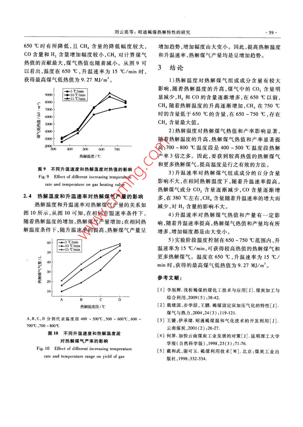 第21卷第1期礦冶Vol. 21, No. 12012年3月mining metallurgyMarch 2012章編號(hào):10057854(2012)01-005604昭通褐煤熱解特性的研究劉云亮陳雯沈強(qiáng)華陰樹標(biāo)何云龍王勇(昆明理工大學(xué)冶金與能源工程學(xué)院,昆明650093)摘要:針對(duì)昭通褐煤進(jìn)行熱解實(shí)驗(yàn)研究,得到了升溫速率和熱解溫度對(duì)褐煤熱解煤氣成分、煤氣熱值和產(chǎn)氣率的影響規(guī)律。結(jié)果表明:隨著熱解溫度的升高煤氣中的CO2含量明顯減少,H2和CO的含量逐漸增多,CH4的含量先增加后減少,煤氣熱值和煤氣產(chǎn)率提高;同熱解溫度下,隨著升溫速率提高煤氣中的CO2含量逐漸減少,CO含量逐漸增多,CH4含量逐漸減少,對(duì)H2含量的影響不大,熱解煤氣熱值和產(chǎn)量均有所增多,增加幅度都是由大變小。實(shí)驗(yàn)階段獲得的最高熱值工藝條件為;熱解溫度是650℃,升溫速率是15℃/min,煤氣低熱值為927MJ/m3。關(guān)鍵詞:褐煤;熱解;熱解煤氣;熱值中圖分類號(hào):TQs34文獻(xiàn)標(biāo)識(shí)碼:Ado:10.3969/Jisn.10057854.2012.01.016STUDY ON PYROLYSIS CHARACTER OF LIGNITE IN ZHAOTONGLIU Yun-liang CHEN Wen ShEN Qiang-hua YIN Shu-biao HE Yun-Long WANG YongFaculty of Metallurgical and Energy Engineering, Kunming University of Scienceand Technology, 650093 Kunming, China)ABSTRACT: Accroding to the pyrolysis experimental study of Zhaotong Lignite, the effecting regulation betweentemperature and increasing rate to lignite pyrolysis gas composition, gas heating value and yield of gas is obtained.The results show that CO, content of gas reduces dramatically with the increasing of pyrolysis temperature, and content of CO and H, increasing gradually, the content of CH, decreasing after increasing for a while, and the gas heat-ing value and the gas yield increasing accordingly. At the same temperature, with the rise of temperature increas-ing, the contents of CO, and CH, reducegradually, content of CO increases, and Gas heating value and yield of gasincrease as well, and there is no big influence to the content of H,. In the test the process conditions of the maxi-mum heating value obtained is as following: pyrolysis temperature 650C, temperature increasing rate15C/min andthe low heating value is 9. 27MJ/mKEY WORDS: lignite; pyrolysis; pyrolysis gas; heating value我國(guó)褐煤資源豐富,占全國(guó)煤炭?jī)?chǔ)量的13%,有得到高效應(yīng)用。近年來,由于國(guó)民經(jīng)濟(jì)快速發(fā)展,在我國(guó)煤炭資源中占有重要地位,主要分布于內(nèi)蒙對(duì)能源需求不斷增加,同時(shí)國(guó)際原油價(jià)格節(jié)節(jié)攀升,古東部、黑龍江東部和云南東部,褐煤煤化程度低,褐煤的合理和有效利用問題顯得日益重要和突屬于低階煤,具有發(fā)熱值低,水分、揮發(fā)分高,易風(fēng)出口12)。煤的熱解是各種煤加工工藝的基礎(chǔ),因此,化、碎裂、氧化自燃,熱穩(wěn)定性差等特點(diǎn),長(zhǎng)期以來沒本文針對(duì)褐煤熱解方面進(jìn)行研究,對(duì)褐煤的加工和有效利用有著重要意義。收稿日期:2011-09-15基金項(xiàng)目:國(guó)家科技型中小企業(yè)技術(shù)創(chuàng)新基金項(xiàng)目1實(shí)驗(yàn)部分(10c26215305108)作者簡(jiǎn)介:劉云亮,在讀碩士研究生,研究方向?yàn)橛猩饘僖睙挕?.1實(shí)驗(yàn)煤樣通訊作者:陳雯,教授,chenwen63@126.com云南省昭通地區(qū)蘊(yùn)藏著我國(guó)南方最大的褐煤資劉云亮等:昭通褐煤熱解特性的研究57源,已探明儲(chǔ)量達(dá)80多億t。昭通褐煤煤田具有煤層厚、埋藏淺、易剝易采(90%以上剝采比小于2)儲(chǔ)量集中;煤化度低,化學(xué)活性好,揮發(fā)分高,加熱后揮發(fā)分易于析出;還有水分、灰分高,低灰熔點(diǎn),穩(wěn)定性差等特點(diǎn)3。本次熱解實(shí)驗(yàn)選用云南省昭通新采褐煤,其工業(yè)分析結(jié)果如表1所示,灰分分析見表2表1煤樣的工業(yè)分析結(jié)果Table 1 Proximate analysis results of lignite熱解溫度/℃項(xiàng)目Md數(shù)值/%53.624.3556.7629.9圖2升溫速率為5℃/min時(shí)熱解溫度對(duì)煤氣成分的影響表2灰分成分分析結(jié)果Fig 2 Effect of temperature on gas composition at 5C/minTable 2 Ash composition analysis results of ligniteO, CaO含量/%37.1415.7810.7914.614.001.301.2實(shí)驗(yàn)裝置和方法本實(shí)驗(yàn)的試驗(yàn)裝置見圖1。電偶600200熱解溫度/℃氣體流量計(jì)圖3升溫速率為10℃/min時(shí)熱解溫度焦油集瓶對(duì)煤氣成分的影響溫控器Fig 3 Effect of temperature on gas composition at 10 C/min圖1試驗(yàn)裝置圖Fig. 1 The diagram of test equipment50如圖1所示,熱解爐為管式爐,采用電加熱,熱電偶和數(shù)字顯示溫度控制器進(jìn)行溫控,用氣體流量計(jì)計(jì)量熱解煤氣氣量,產(chǎn)生的熱解煤氣送檢測(cè)部門用氣相色譜儀測(cè)定煤氣成分。實(shí)驗(yàn)前,進(jìn)行褐煤外水分脫除預(yù)處理,取煤樣在40℃以下自然干燥,直到質(zhì)量恒定不變?yōu)橹?除去外水分。實(shí)驗(yàn)時(shí),每次實(shí)500700驗(yàn)取已脫外水煤樣1000g,人爐粒度為0~10mm熱解溫度/℃分別以5℃/min、10℃/min和15℃/min的升溫速率升溫至750℃,恒溫30min。圖4升溫速率為15℃/min時(shí)熱解溫度對(duì)煤氣成分的影響2實(shí)驗(yàn)結(jié)果分析和討論Fig 4 Effect of temperature on gas composition at 15 C/min2.1熱解溫度對(duì)熱解煤氣成分的影響上,在550~600℃,煤氣成分CO2,H2和CO含量相熱解溫度控制在350~750℃,實(shí)驗(yàn)結(jié)果如圖差不大,分別存在H2和CO與CO2含量的交點(diǎn),在2,3,4所示。熱解溫