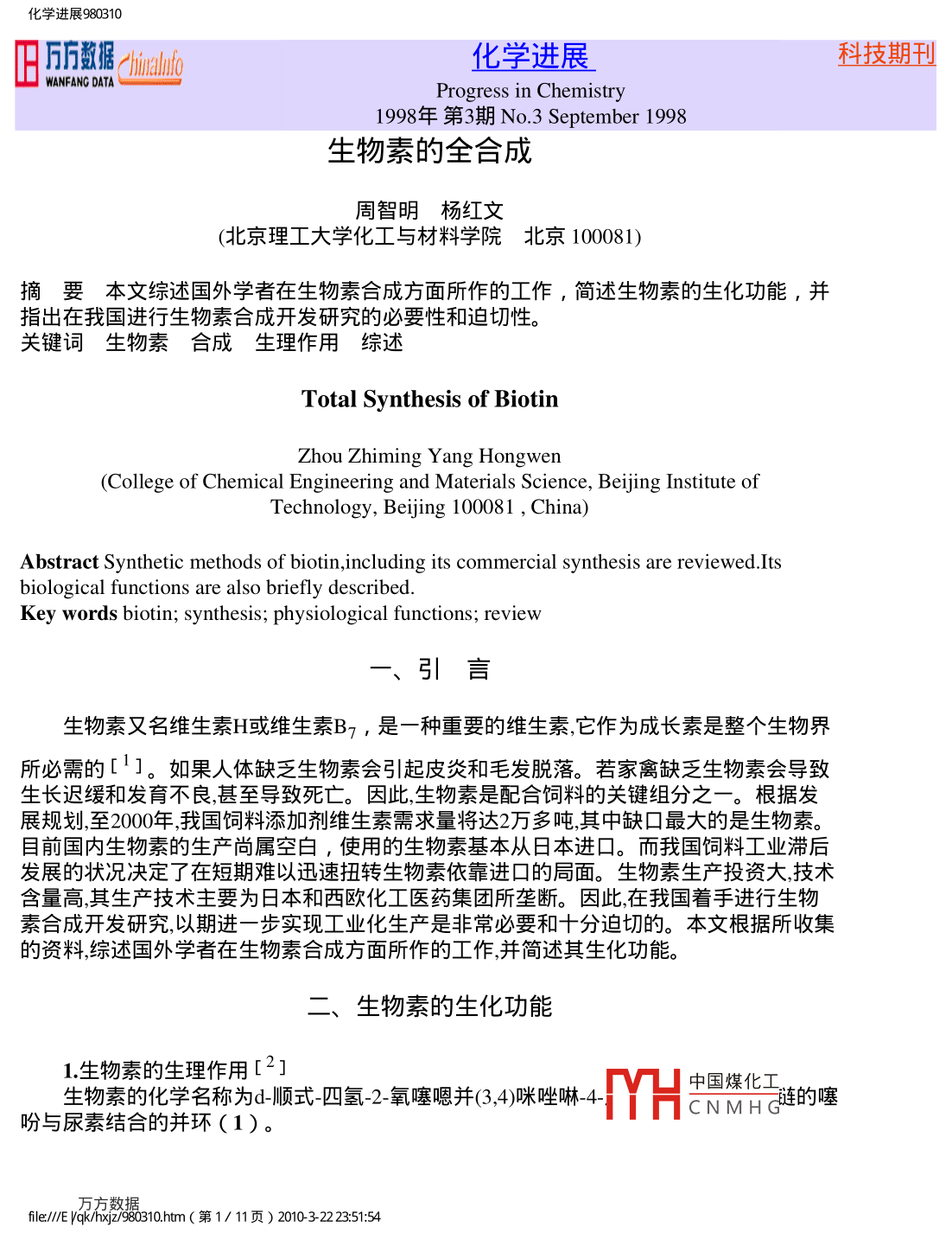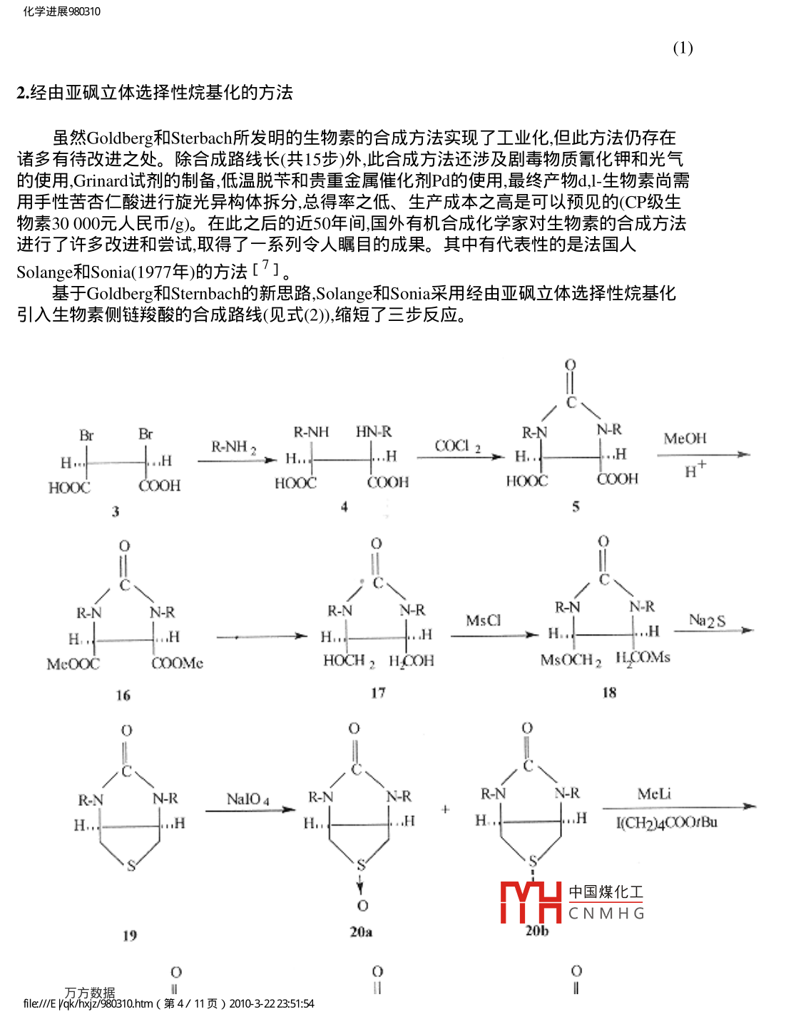 化學(xué)進展980310Ahinatlo化學(xué)進展科技期刊WANFANG DATAProgress in Chemistry1998年第3期No.3 September 1998生物素的全合成周智明楊紅文(北京理工大學(xué)化工與材料學(xué)院北京100081),摘要本文綜述國外學(xué)者在生物素合成方面所作的工作,簡述生物素的生化功能,并指出在我國進行生物素合成開發(fā)研究的必要性和迫切性。關(guān)鍵詞生物素合成生理作用綜述Total Synthesis of BiotinZhou Zhiming Yang Hongwen(College of Chemical Engineering and Materials Science, Beijing Institute ofTechnology, Bejjing 100081 , China)Abstract Synthetic methods of biotin,including its commercial synthesis are reviewed.Itsbiological functions are also briefly described.Key words biotin; synthesis; physiological functions; review一、引言生物素又名維生素H或維生素By ,是一種重要的維生素,它作為成長素是整個生物界所必需的[1]。如果人體缺乏生物素會引起皮炎和毛發(fā)脫落。若家禽缺乏生物素會導(dǎo)致生長遲緩和發(fā)育不良,甚至導(dǎo)致死亡。因此,生物素是配合飼料的關(guān)鍵組分之一。根據(jù)發(fā)展規(guī)劃,至2000年,我國飼料添加劑維生素需求量將達2萬多噸,其中缺口最大的是生物素。目前國內(nèi)生物素的生產(chǎn)尚屬空白,使用的生物素基本從日本進口。而我國飼料工業(yè)滯后發(fā)展的狀況決定了在短期難以迅速扭轉(zhuǎn)生物素依靠進口的局面。生物素生產(chǎn)投資大,技術(shù)含量高,其生產(chǎn)技術(shù)主要為日本和西歐化工醫(yī)藥集團所壟斷。因此,在我國著手進行生物素合成開發(fā)研究,以期進一步實現(xiàn)工業(yè)化生產(chǎn)是非常必要和十分迫切的。本文根據(jù)所收集的資料綜述國外學(xué)者在生物素合成方面所作的工作,并簡述其生化功能。二、生物素的生化功能1.生物素的生理作用[2]生物素的化學(xué)名稱為d-順式四氫-2-氧噻嗯并(3,4)咪唑啉-4-中國煤化工MHCN MH言漣的噻吩與尿素結(jié)合的并環(huán)(1)。fle/E Vqk/nxjZ/980310.htm(第1/ 11頁) 2010-3-22 23:51:54化學(xué)進展980310O羧化反應(yīng)性基團HNNHHCH2 Sm (CH2)4COOH,與賴氨酸殘基的ε-氨基結(jié)合成生物胞素生物素是羧化酶的輔基其活化型是通過其羧基與酶活性中心的賴氨酸殘基的ε ~氨基共價結(jié)合成為一種化合物ε -生物素賴氨酸,稱為生物胞素。在羧化作用時,其尿環(huán)上的N★原子可與羧基結(jié)合,參與體內(nèi)固定CO2的羧化反應(yīng),它對糖、脂肪、蛋白質(zhì)和核酸等代謝有重要意義。在脂肪酸合成過程中,作為乙酰輔酶A羧基酶的成分起作用。在葡萄糖合成過程中作為丙酮酸羧基酶的成分起作用。在氨甲酰酶轉(zhuǎn)移、嘌呤合成、糖代謝、色氨酸分解中起作用,并與其他維生素發(fā)生相互作用。2.生物素的功用[3]人體對生物素的需求量較小,但也是必不可缺的。在雞蛋清和牛奶中含有-種抗生物素蛋白,可與生物素結(jié)合成無活性而又不易被吸收的結(jié)合蛋白。因此國外在食用鮮奶中均加入少量生物素添加劑。人體生物素缺乏時,可引起皮炎和毛發(fā)脫落,重則發(fā)生脂肪肝、腎病綜合癥并對免疫系統(tǒng)產(chǎn)生巨大的消極影響。生物素是家禽體內(nèi)主要代謝中所必需的,許多家禽缺乏生物素時通常會發(fā)生表皮病變生物素供應(yīng)不足則會降低家禽的生產(chǎn)性能。近年來大量的研究已經(jīng)證實在種豬飼料中添加生物素會產(chǎn)生有益的作用。在肉雞飼料中添加生物素顯著提高了肉雞的生長速度,并降低了死亡率。在產(chǎn)蛋雞飼料中添加生物素則提高了產(chǎn)蛋率,改善了飼料效率,以較少的投入產(chǎn)生很大的經(jīng)濟效益。此外,微生物培養(yǎng)和發(fā)酵工業(yè)也需一些生 物素作為生長因子,如培養(yǎng)合成賴氨酸的棒狀桿菌需加入生物素。生物素在醫(yī)學(xué)中可作為生化試劑。三、生物素的全合成1.生物素的工業(yè)化生產(chǎn)方法生物素作為天然化合物存在于動物的腎臟、肝臟、蛋黃、牛奶和酵母中,這-點早已被人們所認識,但用人工化學(xué)合成的方法得到生物素還是本世紀中葉的事情。1943年首 先由Harris [4]合成出生物素,1947年再由Baker[5]發(fā)明了新的合成方法。然而,這兩種方法距工業(yè)化生產(chǎn)相差甚遠。兩年后,Goldberg和Sternbach的發(fā)明成功地實現(xiàn)了生物素的規(guī)?;I(yè)生產(chǎn)[6],并獲得美國專利,其合成方法見反應(yīng)式(1)。此方法用二氨基丁二酸內(nèi)消旋體4為起始原料,將4轉(zhuǎn)化為咪唑啉酮-2-順-4,5-二羧酸5,然后生成含硫環(huán)化物8,再由8引入生物素側(cè)鏈,與先前的方法相比中國煤化工種易得的起始原料4中所含的兩個氨基基團的空間排列方式與生物素CHCNMH c相同,為順式構(gòu)型,從而避免了反式異構(gòu)體生物素的生成和分離,而不至于影響總產(chǎn)率,最終得到純d,l-生物素。fle/E Vqk/nxjZ/980310.htm (第2/ 11頁) 2010-3-22 23:51:54化學(xué)進展980310/8COOH3t3rNHR NHRNR SRNRCH=CH一-CH-CH?CH-CH一→CH_CH一+ CH-CHCOOH COOH90 go\o346RNRCH一- C]”, CH-CHCH一CHAcOCH goCCCH2 ,c- (CH2)4OCH3oOH89/OHC -CH一CH一COOHHSCH2C一CH- - CH一CO一(CH2)4OCH37a9aR NRCH- CHCH-CECH2 S= = CH(CH2)4OCH3CH2 CH(CH2)4OCH3CH2 CH (CH2)4OCH3、。/10112HN NHHNCH-CHCH- -CHCHz CH(CH2)4BrCH2 CH(CH2)4CNCH2 CH(CH2)4COOH\57145中國煤化工MYHCNMHGR=CH5日fle/// Vqkn1z98310.htm(第3/ 11頁) 20-222351545化學(xué)進展980310(1)2.經(jīng)由亞砜立體選擇性烷基化的方法雖