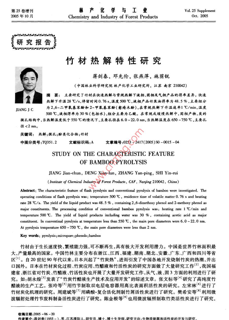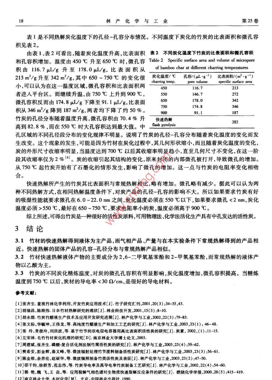 第25卷增刊林產(chǎn)化學(xué)與工業(yè)Vol. 25 Supplement2005年10月Chemistry and Industry of Forest ProductsOct. 2005研究報告竹材熱解特性研究蔣劍春,鄧先倫,張燕萍,施蔭銳(中國林業(yè)科學(xué)研究院林產(chǎn)化學(xué)工業(yè)研究所,江蘇南京210042).摘要:主要研究了竹材在快速熱解與常規(guī)熱解下液相、固相及氣相產(chǎn)品的得率差異??焖?,熱解下升溫28 C/s,停留時間0.76s,溫度500C,液相產(chǎn)品竹焦油得率為48.5 %,主要組分JIANG JC為2,6-二甲氧基苯酚和2-甲氧基苯酚(愈瘡木酚),在常規(guī)熱解下升溫速率1 C/min,溫度500C ,液相得率為30 %(包括水),組分主要為乙酸。在常規(guī)或緩慢熱解中,固相產(chǎn)物,炭的微孔結(jié)構(gòu)中,當(dāng)熱解溫度低于550 C的情況下,主要孔徑在6.0-22.0 nm,當(dāng)熱解溫度在650 ~750C,主要孔.徑<2 nm。關(guān)鍵詞:熱解;微孔;酚類化合 物;竹材中圖分類號:TQ351.2文獻標(biāo)識碼:A文章編號:0253 - 2417(2005)S0 -0015 -04STUDY ON THE CHARACTERISTIC FEATUREOF BAMBOO PYROLYSISJIANG Jian-chun, DENG Xian-lun, ZHANG Yan-ping, SHI Yin-rui( Insitute of Chemical Industry of Forest Products, CAF, Nanjing 210042, China)Abstract: The characteristic feature of flash pyrolysis and conventional pyrolysis of barmboo were investigaled. Theoperating conditions of flash pyrolysis was: temperature 500 C, residence time of volatile matter 0.76 s and heatingrate 28 C/s. The yield of the liquid product was 48. 5 %,containing 2 ,6-dimethoxy phenol and 2-methoxy phenol asmajor constituents. The processing condition of conventional bamboo pyrolysis was: heating rate 1 C/min andtemperature 500C. The yield of liquid products including water was 30 %,containing acetic acid as majorconstituent. In conventinal pyrolysis at temperature less than 550 C, the main pore diameters were 6.0 - 22.0 nm.At pyrolysis temperature 650 - 750 C, the main pore diameters were less than 2 nm.Key words: pyrolysis ; micropore ;phenols ;bamboo竹材由于生長速度快,繁殖能力強,可不斷再生,具有極大開發(fā)利用潛力。中國是世界竹林面積最大,產(chǎn)量最高的國家。中國竹林主要分布在浙江、江西、福建、湖南、湖北、安徽、廣東、廣西和四川等省區(qū)”。自20世紀90年代以來,日本興起了“竹炭熱”,進而引發(fā)了中國各地開發(fā)燒制竹炭的熱潮,并出口國外。日本在竹材炭化過程、竹炭應(yīng)用、竹醋液和竹活性炭的研究方面做了大量研究工作2) ,我國福建省、浙江省對竹炭、竹醋液竹活性炭也開展了大量開發(fā)研究工作,從氣、液、固3方面的利用進行了研究。如:胡永煌(3]發(fā)表了“竹炭竹醋液生產(chǎn)技術(shù)及應(yīng)用開發(fā)"的綜述文章。張文標(biāo)等[4]研究了高純度竹醋液的生產(chǎn)工藝。張玲等[5]用竹節(jié)制取雙電層電容器用高比表面積活性炭的研究。左宋林(6]進行了竹材炭化機理的研究。周建斌等[7)用磷酸-復(fù)合活化劑制竹屑活性炭進行了研究。樊希安等[8]利用微波輻射處理竹節(jié)廢料制備活性炭進行了研究。陳金根等[9]也用微波輻照制取竹類活性炭進行了研究,收稿日期:2005 -06 -20作者簡介.蔣創(chuàng)春(1955- )。男江蘇溧陽人研究員、博十,博十生導(dǎo)師研究方向,牛物質(zhì)能源和活性炭的開發(fā)與研究。16林產(chǎn)化學(xué)與工業(yè)第25卷.邵千鈞等[10]對竹炭的導(dǎo)電率和制備進行了研究,本文作者主要研究竹材快速熱解和常規(guī)熱解條件,對熱解氣、液、固產(chǎn)品的影響特性,為竹材的熱解轉(zhuǎn)化利用進行探索性研究。1實驗裝置及原料1.1實驗裝置生5}98常規(guī)熱解裝置由干餾釜、電加熱爐、冷凝器、液體接收231叮器、氣體收集器、溫度控制器和熱電偶組成(圖略);快速熱1上解裝置見圖1。1.2 實驗原料及儀器1.氣體收集氣囊gas-pocket; 2.冰浴ice-bath :實驗用原料為林產(chǎn)化學(xué)工業(yè)研究所內(nèi)3年生的孝順竹,3. 吸收瓶absorption bottle;4. 玻璃纖維gless經(jīng)氣干、烘干。竹桿截成10 cm長,作為常規(guī)熱解用,竹屑用fiber ; 5.石英反應(yīng)管quartz reaction tube;作快速熱解原料。所用儀器為美國Agilent 氣相色譜-質(zhì)譜6. 電爐保溫層insulating layer of electric聯(lián)用儀。日本AS -703孔徑-孔容比表面積測定儀。furnace; 7.熱電偶thermel c∞ouple; 8.N, 進口1.3 實驗方法entrance of N,: 9.電爐electric furnace ;1.3.1常規(guī)熱解 干餾釜內(nèi)裝干餾竹材原料 200 ~300g,10. 裝樣器saple cr:1推桿push rod升溫速率1 C/ min,最終熱解溫度在450 ~500C。干餾釜圖1快速熱解裝置后接--水冷凝器,收集竹材液相產(chǎn)品,最后收集未冷凝熱解Fig. 1 Equipments for flash pyrolysis氣體。液相產(chǎn)品在室溫自然條件下存放- -周,上層為水溶性部分(竹醋液),下層為竹焦油。1.3.2快速熱解采用內(nèi)徑為 8 mm石英管,加熱區(qū)體積為8.8 mL。樣品量為經(jīng)恒重后的竹屑5 mg,用推桿將樣品推入石英管反應(yīng)器內(nèi),實驗中升溫速率為28 C/s ,熱解氣在爐中停留時間為0. 76 s,熱解終點溫度為550C。熱解反應(yīng)后,將玻璃纖維截留下的油狀物用吸收器內(nèi)吸收液(四氫呋喃)洗脫,再用少量純四氫呋喃洗滌玻璃纖維,合并后,在室溫下濃縮至- -定濃度 ,用氣相色譜法,定量四氫呋喃與可凝性物質(zhì)的量。1.3.3電導(dǎo)率的測定方法 稱取1 g (稱準至0. 01 g)預(yù)處理過的活性炭試樣加入250 mL具塞磨口錐形瓶中,加入蒸餾水100 mL,將其置于攪拌器上,在常溫下中速( 150 r/ min)攪拌80 min,過濾萃取液,棄去前30 mL左右,收