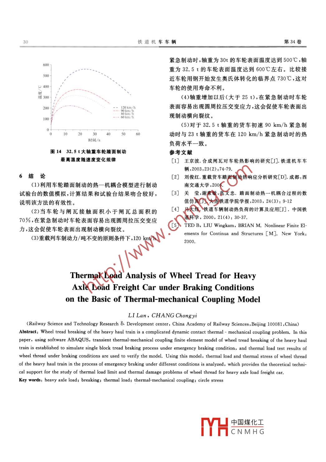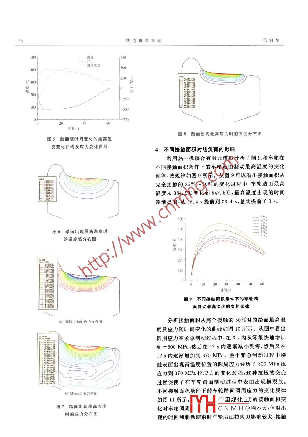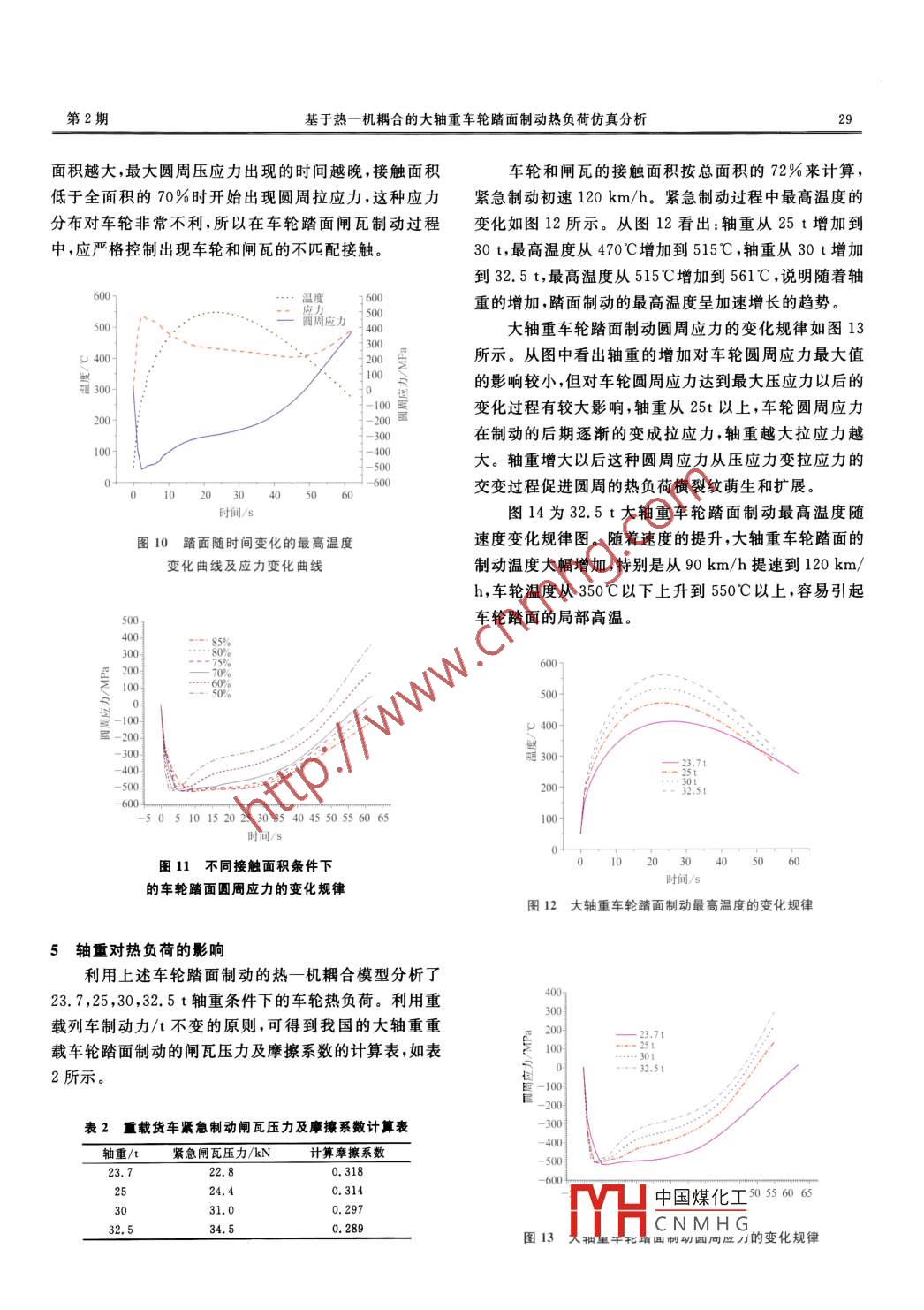 第34卷第2期鐵道機(jī)車車Vol 34 No. 22014年4月RAILWAY LOCOMOTIVE & CARApr.2014文章編號(hào):1008-7842(2014)02-0025-06基于熱一機(jī)耦合的大軸重車輪踏面制動(dòng)熱負(fù)荷仿真分析李蘭,常崇義(中國(guó)鐵道科學(xué)研究院鐵道科學(xué)技術(shù)研究發(fā)展中心,北京100081)摘要重載列車車輪踏面制動(dòng)是…個(gè)復(fù)雜的動(dòng)態(tài)接觸熱一機(jī)耦合問(wèn)題。文章利用有限元分析軟件 ABAQUS建立了重載車輪踏面制動(dòng)的瞬態(tài)熱一機(jī)耦合有限元模型,對(duì)單閘瓦踏面制動(dòng)過(guò)程進(jìn)行了緊急制動(dòng)工況的數(shù)值仿真并利用重載貨車車輪制動(dòng)熱負(fù)荷試驗(yàn)結(jié)果對(duì)模型進(jìn)行驗(yàn)證。利用該模型分析了不同工況下重載車輪緊急制動(dòng)過(guò)程中的熱負(fù)荷及熱應(yīng)力情況,為研究大軸重車輪踏面制動(dòng)熱負(fù)荷極限和熱損傷問(wèn)題提供了理論技術(shù)支持關(guān)鍵詞大軸重;制動(dòng);熱負(fù)荷;熱一機(jī)耦合;圓周應(yīng)力中圖分類號(hào):U272文獻(xiàn)標(biāo)志碼:Adoi:10.3969/.issn.1008-7842.2014.02.06我國(guó)重載貨運(yùn)列車正朝著快速大軸重的方向發(fā)展。形和應(yīng)力分布對(duì)熱傳導(dǎo)的影響,以及瞬態(tài)溫度對(duì)結(jié)構(gòu)材在貨車提速、軸重增加以后,列車的動(dòng)能急劇增加,制動(dòng)料的影響。車輪踏面在制動(dòng)過(guò)程中,車輪產(chǎn)生變形的同時(shí)所產(chǎn)生的熱量也大大增加。我國(guó)的重載列車主要采時(shí)還伴隨著溫度的變化。準(zhǔn)確分析溫度和應(yīng)力變化不用車輪踏面制動(dòng)的形式,在緊急制動(dòng)停車時(shí),由動(dòng)能轉(zhuǎn)應(yīng)把溫度場(chǎng)的求解和應(yīng)力場(chǎng)的分析分解開(kāi)來(lái),因?yàn)槌藫Q成的熱能幾乎全部被摩擦副所吸收。高摩合成閘瓦溫度變化對(duì)結(jié)構(gòu)變形和材料性質(zhì)產(chǎn)生影響外,結(jié)構(gòu)變形是重載及提速貨車配套制動(dòng)技術(shù)之一,由于合成閘瓦導(dǎo)也會(huì)反過(guò)來(lái)改變熱邊界條件,進(jìn)而影響溫度變化。溫度熱性差,因此使用合成閘瓦同采用鑄鐵閘瓦時(shí)相比,車與位移兩種不同場(chǎng)變量之間存在很強(qiáng)的相互作用輪在制動(dòng)過(guò)程中要吸收更多的熱量,從而更易受到熱損完全的熱一機(jī)耦合有限元模型則可以考慮結(jié)構(gòu)變形和傷。2003年王京波使用MARC有限元軟件建立快速貨車車輪二維有限元模型,采用數(shù)值和試驗(yàn)方法對(duì)合成影響應(yīng)力分布對(duì)熱傳導(dǎo)的影響,以及瞬態(tài)溫度對(duì)結(jié)構(gòu)材料的閘瓦對(duì)車輪的熱影響進(jìn)行了研究。2006年西南交通大學(xué)劉俊紅采用三維模型分析了重載車輪的溫度場(chǎng)和對(duì)于熱彈性變形的材料本構(gòu)關(guān)系為應(yīng)力場(chǎng)21。但以往的這些車輪熱負(fù)荷計(jì)算初始條件都如a+DE(1)在25t軸重以下,一般也沒(méi)有考慮熱載荷和機(jī)械載荷相其中,0=T-T,T為當(dāng)前絕對(duì)溫度,T。為初始絕對(duì)溫互作用的影響。近年來(lái)的實(shí)踐表明,隨著軸重及速度的度。提高,車輪由于制動(dòng)產(chǎn)生損傷的比例大大增加。在貨物a=(1,1,10,0,0)列車提速到120km/h,軸重從現(xiàn)在的25t增加到27t,0代表了溫度變化;D為彈性常數(shù);E為應(yīng)變常數(shù)。甚至32.5t時(shí),緊急制動(dòng)工況下,在規(guī)定的制動(dòng)距離內(nèi)β為溫度應(yīng)力模量停車,所產(chǎn)生的制動(dòng)熱負(fù)荷能否滿足車輪不失效的要=E2/(1-2y)求,以及對(duì)車輪安全性的影響是急需研究和解決的問(wèn)E為材料的楊氏模量;a為熱膨脹系數(shù);γ為泊桑題比1車輪踏面制動(dòng)的熱一機(jī)耦合有限元理論熱傳導(dǎo)的基本能量平衡方程為在車輪踏面制動(dòng)時(shí),車輪的溫度場(chǎng)和熱應(yīng)力場(chǎng)屬于(ac+Bk。-|hd)ddr-rdo=0兩種不同性質(zhì)的物理場(chǎng),相關(guān)的計(jì)算涉及到對(duì)這兩種物理場(chǎng)的耦合。耦合分析方法分為直接耦合法和間接耦(4)合法。傳統(tǒng)的熱一機(jī)分析采用間接耦合分析方法,對(duì)于其中,c比熱容,q是物體邊界面上法向的熱流密度,r結(jié)構(gòu)或物體先進(jìn)行熱傳導(dǎo)分析,然后將熱傳導(dǎo)的結(jié)果作為物體內(nèi)部的熱源密度。為邊界條件再進(jìn)行應(yīng)力分析,這種分析無(wú)法考慮結(jié)構(gòu)變中國(guó)煤化工*鐵道部科技項(xiàng)目(」2012J09)CNMHG李蘭(1980-)女,助理研究員(收稿日期:2013-08-28)26鐵道機(jī)車車輛第34卷通過(guò)物體的熱流密度(通過(guò)單位面積的熱流量)是KL由傅里葉定律控制L-M-E△」L△0△p+△g(t-△)h=-kv6(5)其中k為熱傳導(dǎo)系數(shù);h為熱流密度。其中,0≤ε≤1(21)TPea為熱一機(jī)耦合過(guò)程的機(jī)械能,在傳統(tǒng)的熱一這里采用更新拉格朗日方法求解熱一機(jī)耦合問(wèn)題。機(jī)非耦合分析中被忽略。溫度變化<