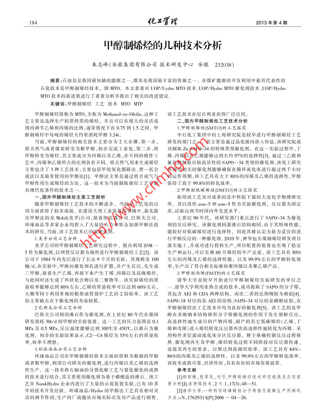 184化工管理2013年第4期.甲醇制烯烴的幾種技術(shù)分析朱志峰(安徽集團(tuán)有限公司技術(shù)研發(fā)中心安徽232038)摘要:石油是是我國最短缺的能源之一,煤炭是我國最豐富的資源之--。在煤礦能源的開發(fā)利用中最具代表性的石化技術(shù)是甲醇制烯烴技術(shù),即MTO。本文著重對(duì)UOP/Uydro MTO技術(shù).UOP/Hydro MTO催化劑技術(shù)、U0OP/ HydroMTO技術(shù)的新進(jìn)展進(jìn)行了著重分析并提出了相關(guān)的改進(jìn)建議。關(guān)鍵詞:甲醇制烯烴工藝技術(shù)MTO MTP甲醇制烯烴簡(jiǎn)稱為MTO,全稱為Methanol--to--Olein。這種工該工藝技術(shù)在尼日利亞獲得廣泛應(yīng)用。藝主要是選擇生產(chǎn)輕質(zhì)性質(zhì)的烯烴,并且可以在很大的靈活范二、國內(nèi)甲醇制烯烴工藝技術(shù)分析圍內(nèi)調(diào)節(jié)乙烯和丙烯的比例,通常情況下在0.75到1.5之間。甲1.甲醇制烯烴(SMTO)的工藝探究醇制烯烴中每噸的烯烴大約要消耗甲醇3.24t。中石化工集團(tuán)中的上海研究院是較早進(jìn)行甲醇制烯烴工藝當(dāng)前,甲醇制烯烴的相關(guān)技術(shù)主要分為2大步驟,第一步,研發(fā)的部門之--。其主要是通過晶化液內(nèi)添人鋅鹽,該研究院成將天然氣或者煤炭轉(zhuǎn)變?yōu)榇旨状?初步完成工業(yè)化,第二步,將功制取 Zn SAP0-34的特殊類型催化劑,在這一實(shí)驗(yàn)過程中,丁甲醇轉(zhuǎn)變?yōu)橄N,其主要成分為丙烯以及乙烯,在不同的操作工烯、丙烯以及乙烯能夠達(dá)到大約97%的選擇性[3]。通過三乙胺和藝中,丙烯和乙烯所占的比例各有不同。將天然氣用來生成烯烴氟化物制取出較高活性的SAP0-34類型的催化劑。該化工研究主要包含了3種工藝技術(shù),主要包括甲烷氧化偶聯(lián)法、費(fèi)-托合所利用相關(guān)的催化劑能夠確保在循環(huán)流化床進(jìn)行超過兩千小時(shí)成法以及最常使用的甲醇法[]。甲醇法主要是通過將合成氣與的運(yùn)作周期,該工藝具有大于80%的丙烯及乙烯的選擇性,甲醇甲醇作用生成烯烴的方法,這一技術(shù)為當(dāng)前制取烯烴工藝中最保持 了高于99.8%的轉(zhuǎn)化效率。具現(xiàn)代化條件的技術(shù)之-一。2.甲醇制低碳烯烴(DMTO)的工藝探究一、國外甲醇制烯烴主要工藝探析取得該工藝突出成果的是中科院下屬的大連化學(xué)物理研究隨著甲醇制烯烴工藝技術(shù)的不斷進(jìn)步,當(dāng)前在工藝化的應(yīng)所。 其以改性zsm -5和zsm- -5作為實(shí)驗(yàn)催化劑,反應(yīng)器為固定用方面獲得了較多成就。在建設(shè)大型工業(yè)裝置的領(lǐng)域中,最先提床,試驗(yàn)達(dá)到當(dāng)時(shí)國內(nèi)外先進(jìn)水平出甲醇法的是Mobil(美乳)公司,接著埃克森公司、巴斯夫公司、上世紀(jì) 90年代,該研究部門重點(diǎn)進(jìn)行了SAP0- -34為催化環(huán)球油品等多家企業(yè)均投入了大量的人力和資金加強(qiáng)甲醇法技劑的反應(yīng)研究。該催化劑同菱沸石結(jié)構(gòu)相同,由于其特殊性能,術(shù)的研究,當(dāng)前,該工藝技術(shù)已經(jīng)逐漸成熟。能較好對(duì)低碳烯烴進(jìn)行選擇性,因此其被認(rèn)定為最為適宜的進(jìn)1.美孚公司工藝分析行甲醇反應(yīng)的-.種催化劑。2010年,神華包頭煤制烯烴研發(fā)項(xiàng)目美孚公司的甲醇制烯烴工藝研究過程中,提出利用ZSM一落 實(shí)施工,并成功進(jìn)行投料生產(chǎn),項(xiàng)目配置的裝置也實(shí)現(xiàn)了穩(wěn)定5作為催化劑,以列管反應(yīng)器為場(chǎng)所進(jìn)行甲醇制烯烴工藝[2]。該生產(chǎn)和運(yùn)行,可以實(shí)現(xiàn)60萬烯烴的年產(chǎn)總量,該工藝具有80%公司于1984 年內(nèi)先后進(jìn)行了長(zhǎng)達(dá)9個(gè)月的實(shí)驗(yàn),其規(guī)模是100左右的丙烯 及乙烯的選擇性能,以及99.9%左右的甲醇轉(zhuǎn)化效桶/d,在實(shí)驗(yàn)中,甲醇向催化劑孔進(jìn)行擴(kuò)散,并產(chǎn)生反應(yīng),先生成率,生產(chǎn)出了符合相關(guān)標(biāo)準(zhǔn)的聚丙烯以及聚乙烯產(chǎn)品。二甲醚,接著生產(chǎn)乙烯,再接下來產(chǎn)生丁烯、丙烯以及高級(jí)烯烴,3.甲醇制丙烯(FMTP)的工藝探究與此同時(shí)還生成了環(huán)狀化合物以及二聚物等。該實(shí)驗(yàn)烯烴的質(zhì)清華大學(xué)是較早開始進(jìn)行甲醇制烯烴實(shí)驗(yàn)研發(fā)的單位之量收率能夠達(dá)到80%左右,乙烯的質(zhì)量收率可以達(dá)到60%左右,清華大學(xué)利用水熱合成的技術(shù),成功提取了SAP0的分子篩,大概等同于利用常規(guī)的粗柴油管裂爐工藝的2倍收率,該工藝其包含AEI和CHA兩種結(jié)構(gòu),而次二者的比例則較為相似[4]。的主要缺點(diǎn)在于催化劑的壽命較低。SAP0-18對(duì)應(yīng)的是AEI的結(jié)構(gòu),SAP0-34對(duì)應(yīng)的是磷酸硅鋁,在2.巴斯夫公司工藝分析甲醇制烯烴法工藝技術(shù)中均為良好的催化劑[5]。該工藝的是甲巴斯夫公司利用沸石作為催化劑,在上世紀(jì)80年代在德國醇 在多級(jí)納米結(jié)構(gòu)擇形分子篩催化劑的作用下發(fā)生裂解反應(yīng),研發(fā)消耗30u/d的甲醇的實(shí)驗(yàn)裝置,這一工藝的壓力范圍是0.1高 選擇性地生成目的產(chǎn)物丙烯,副產(chǎn)的其它低碳烯烴(乙烯、丁MPa至0.5MPa,反應(yīng)溫度能夠達(dá)到300C至450C,以沸石為催烯和戊烯)進(jìn)人烯烴轉(zhuǎn)化反應(yīng)器再次高選擇性地轉(zhu