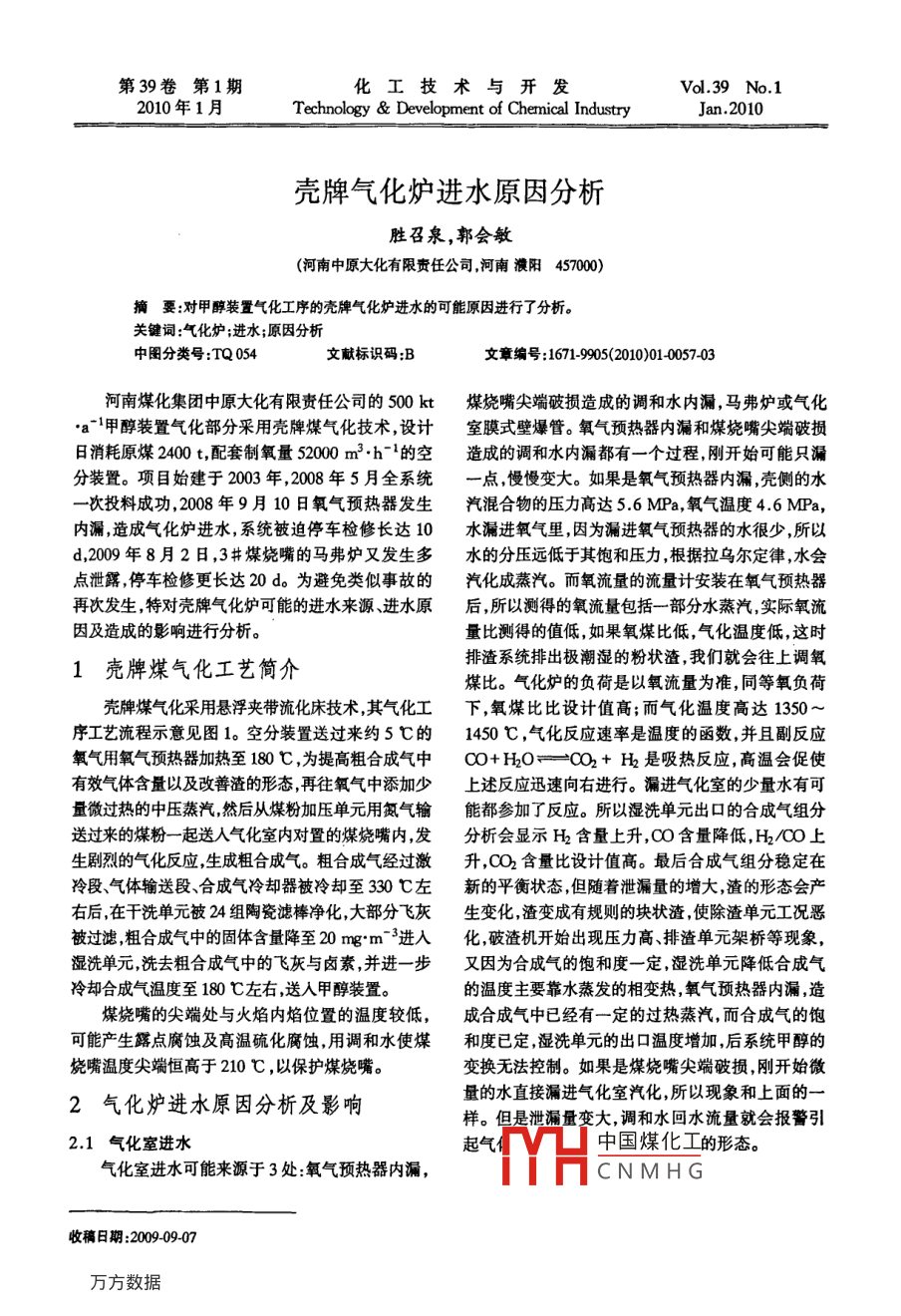.第39卷第1期化工技術與開發(fā)Vol.39 No.12010年1月Technology & Development of Chermical IndustryJan.2010殼牌氣化爐進水原因分析勝召泉,郭會敏(河南中原大化有限責任公司,河南濮陽457000)摘要:對甲 醇裝置氣化工序的殼牌氣化爐進水的可能原因進行了分析。關鍵詞:氣化爐;進水;原因分析中圈分類號:TQ 054文獻標識碼:B文章編號:1671-9905(2010)01-0057-03河南煤化集團中原大化有限責任公司的500 kt煤燒嘴尖端破損造成的調和水內漏,馬弗爐或氣化●a1甲醇裝置氣化部分采用殼牌煤氣化技術,設計室膜式壁爆管。氧氣預熱器內漏和煤燒嘴尖端破損日消耗原煤2400 t,配套制氧量52000 m3.h-'的空造成的調和水內漏都有-一個過程,剛開始可能只漏分裝置。項目始建于2003年,2008年5月全系統(tǒng)一點,慢慢變大。如果是氧氣預熱器內漏,殼側的水-次投料成功,2008年9月10日氧氣預熱器發(fā)生汽混合物的壓力高達5.6 MPa,氧氣溫度4.6 MPa,內漏,造成氣化爐進水,系統(tǒng)被迫停車檢修長達10水漏進氧氣里,因為漏進氧氣預熱器的水很少,所以d,2009年8月2日,3 #煤燒嘴的馬弗爐又發(fā)生多水的分壓遠低于其飽和壓力,根據(jù)拉烏爾定律,水會點泄露,停車檢修更長達20d。為避免類似事故的汽化成蒸汽。而氧流量的流量計安裝在氧氣預熱器再次發(fā)生,特對殼牌氣化爐可能的進水來源、進水原后,所以測得的氧流量包括一部分水蒸汽,實際氧流因及造成的影響進行分析。量比測得的值低,如果氧煤比低,氣化溫度低,這時排渣系統(tǒng)排出極潮濕的粉狀渣,我們就會往上調氧1殼牌煤氣化工藝簡介煤比。氣化爐的負荷是以氧流量為準,同等氧負荷殼牌煤氣化采用懸浮夾帶流化床技術,其氣化工下,氧煤比比設計值高;而氣化溫度高達1350 ~序工藝流程示意見圖1。空分裝置送過來約5 C的1450 C ,氣化反應速率是溫度的函數(shù),并且副反應氧氣用氧氣預熱器加熱至180 C ,為提高粗合成氣中CO+H20= =002+ H2是吸熱反應,高溫會促使有效氣體含量以及改善渣的形態(tài),再往氧氣中添加少上述反應迅速向右進行。漏進氣化室的少量水有可量微過熱的中壓蒸汽,然后從煤粉加壓單元用氮氣輸能都參加了反應。所以濕洗單元出口的合成氣組分送過來的煤粉- -起送人氣化室內對置的煤燒嘴內,發(fā)分析會顯示H2含量上升,C0含量降低,H2/00上生劇烈的氣化反應,生成粗合成氣。粗合成氣經過激升,CO2含量比設計值高。最后合成氣組分穩(wěn)定在冷段、氣體輸送段、合成氣冷卻器被冷卻至330 C左新的平衡狀態(tài),但隨著泄漏量的增大,渣的形態(tài)會產右后,在干洗單元被24組陶瓷濾棒凈化,大部分飛灰生變化,渣變成有規(guī)則的塊狀渣,使除渣單元工況惡被過濾,粗合成氣中的固體含量降至20 mg'm^ 3進入化,破渣機開始出現(xiàn)壓力高、排渣單元架橋等現(xiàn)象,濕洗單元,洗去粗合成氣中的飛灰與鹵素,并進-步又因為合成氣的飽和度-定,濕洗單元降低合成氣冷卻合成氣溫度至180 C左右,送人甲醇裝置。的溫度主要靠水蒸發(fā)的相變熱,氧氣預熱器內漏,造煤燒嘴的尖端處與火焰內焰位置的溫度較低,成合成氣中已經有一定的過熱蒸汽,而合成氣的飽可能產生露點腐蝕及高溫硫化腐蝕,用調和水使煤和度已定,濕洗單元的出口溫度增加,后系統(tǒng)甲醇的饒嘴溫度尖端恒高于210 C ,以保護煤燒嘴。變換無法控制。如果是煤燒嘴尖端破損,剛開始微量的水直接漏進氣化室汽化,所以現(xiàn)象和上面的一2氣化爐進水原因分析及影響樣。但是泄漏量變大,調和水回水流量就會報警引2.1氣化室進水起氣中國煤化工的形態(tài)。氣化室進水可能來源于3處:氧氣預熱器內漏,YHCNMHG收稿日期:2009-09-0758化工技術與開發(fā)第39卷氣體返回段公/混合. 中壓蒸汽過熱器稍微過熱的- 強制鍋過熱器出口測溫點強制鍋爐水中壓蒸汽爐水激冷段空分來的氧氣一-強制鍋|十合成器冷卻器氧氣預熱器|氧氣蒸汽混合氣調和省公|爐水物二斗氣化室強制鍋爐水;強制鍋煤粉加壓單元煤燒嘴調利強制錦爐水出口測溫點馬弗爐水好水水甲醇裝置.出口壁溫測溫點合成氣組分分析灰塵測量點除渣系統(tǒng)濕洗干洗單b-單元元飛灰處理圖1殼牌煤氣化工序工藝流程示意判斷氣化室進水來源的方法是:如果氣化負荷弗爐局部超溫,所以有片狀的漏點。其原因可能是比空分送過來的氧氣流量大,說明氧氣預熱器發(fā)生氣化環(huán)境突然惡化或氣化爐組裝前未清理干凈造成了內漏,其原因可能是設備制造有缺陷,以及氧氣預馬弗爐或膜式壁堵管形成局部過熱,以及煤不好,煤熱器沖壓旁路的限流孔板設計錯誤,或開車時不適與助融劑比例失調,氣化爐的掛渣不好,馬弗爐局部當?shù)囊踉斐裳鯕忸A熱器壓差高,以及熱應力的作溫度超溫。用。其改進措施為調整開車時引氧程序,讓空分先2.2激冷 段或輸送段爆管建立0.5 MPa的氧壓進行置換,等沖壓平衡后,再造成激冷段或輸送段爆管的原因可能有:夾帶緩慢提高到4.6 MPao如果是調和水的回水流量出固體顆粒合成氣的長期、高速沖刷;粘性飛灰造成結現(xiàn)低報警,則可能是煤燒嘴尖端破損造成了調和水垢,使激冷段或輸送段受熱不均以及熱應力作用;分內漏,其原因可能是在開停車過程中氣化爐內的配環(huán)強制循環(huán)水分配不均勻;拉蒙配管堵塞等。如NH4CI. nH2O產生腐蝕以及高溫硫化腐蝕,主要是果是激冷段或輸送段爆管,大量的水、汽混合物將