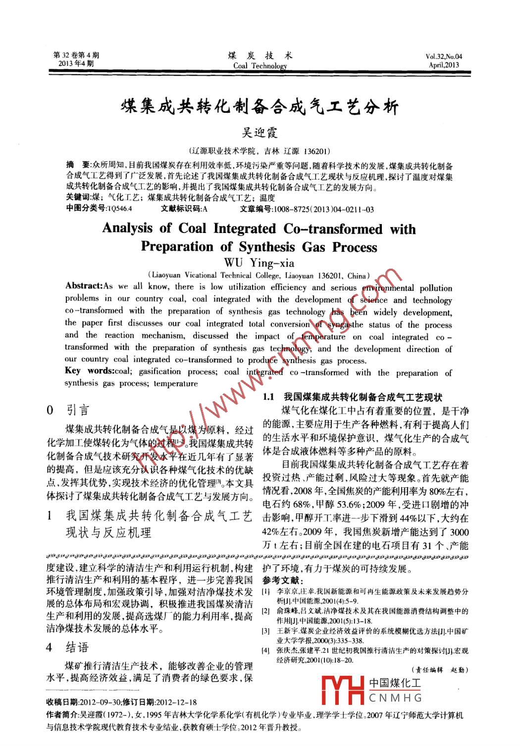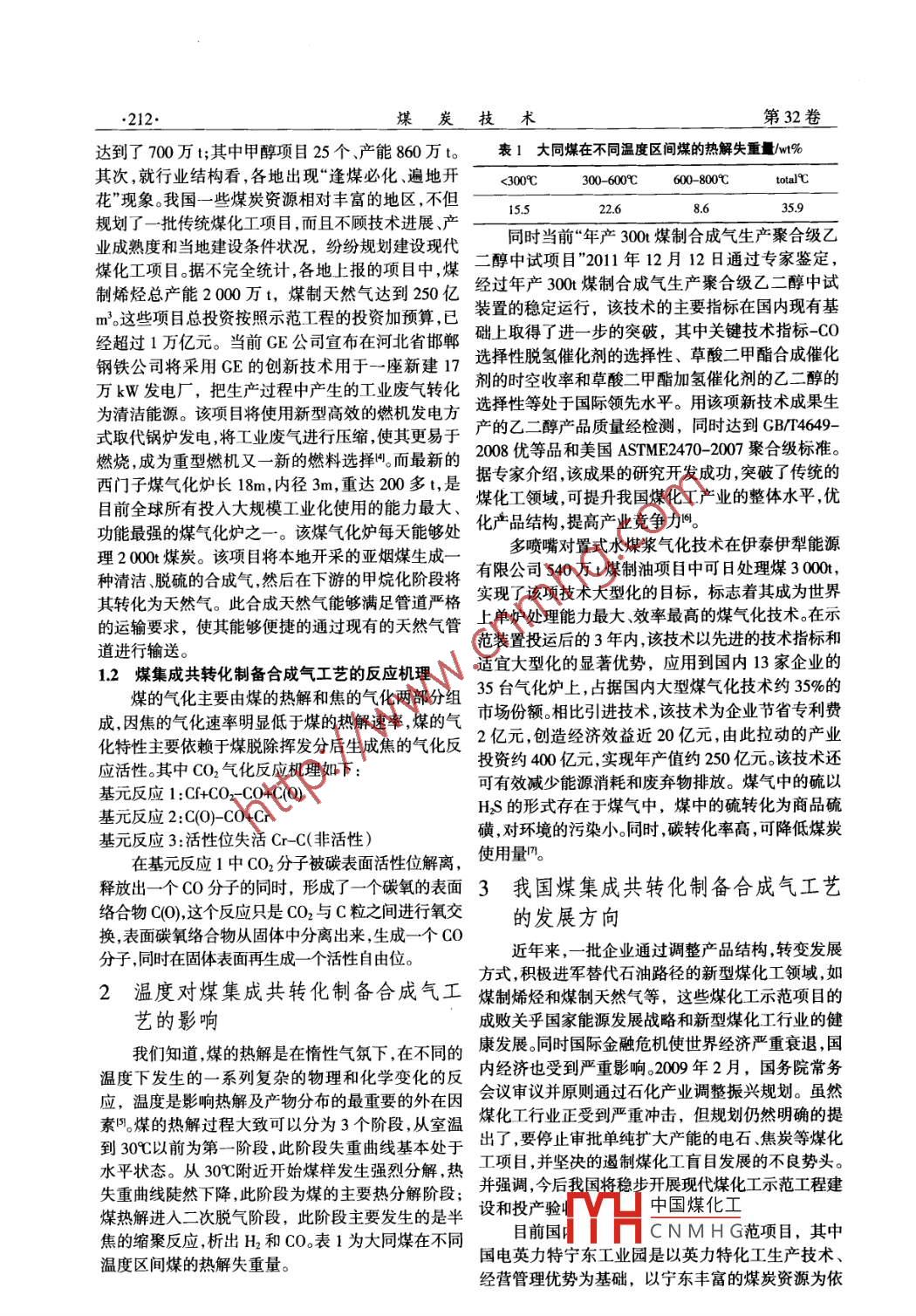 第32卷第4期煤炭技術(shù)Vol 32. No 042013年4期Coal TechnoloApril, 2013煤集成共轉(zhuǎn)化制備合成氣工藝分析吳迎霞(遼源職業(yè)技術(shù)學(xué)院,吉林遼源136201)摘要:眾所周知,目前我國煤炭存在利用效率低環(huán)境污染嚴(yán)重等問題隨著科學(xué)技術(shù)的發(fā)展煤集成共轉(zhuǎn)化制備合成氣工藝得到了廣泛發(fā)展,首先論述了我國煤集成共轉(zhuǎn)化制備合成氣工藝現(xiàn)狀與反應(yīng)機(jī)理,探討了溫度對煤集成共轉(zhuǎn)化制備合成氣工藝的影響,并提出了我國煤集成共轉(zhuǎn)化制備合成氣工藝的發(fā)展方向。關(guān)鍵詞:煤;氣化工藝;煤集成共轉(zhuǎn)化制備合成氣工藝;溫度中圖分類號:105464文獻(xiàn)標(biāo)識碼A文章編號:1008-8725(2013)040211-03Analysis of Coal Integrated Co-transformed withPreparation of Synthesis Gas ProcessWU Ying-xia(Liaoyuan Vicational Technical College, Liaoyuan 136201, China)Abstract: As we all know, there is low utilization efficiency and serious environmental pollutionproblems in our country coal, coal integrated with the development of science and technologyco-transformed with the preparation of synthesis gas technology has been widely developmentthe paper first discusses our coal integrated total conversion of syngasthe status of the processand the reaction mechanism, discussed the impact of temperature on coal integrated cotransformed with the preparation of synthesis gas technology, and the development direction ofour country coal integrated co-transformed to produce synthesis gas processKey words: coal; gasification process; coal integrated co-transformed with the preparation ofsynthesis gas process; temperature11我國煤集成共轉(zhuǎn)化制備合成氣工藝現(xiàn)狀0引言煤氣化在煤化工中占有著重要的位置,是干凈煤集成共轉(zhuǎn)化制備合成氣是以煤為原料,經(jīng)過的能源,主要應(yīng)用于生產(chǎn)各種燃料,有利于提高人們化學(xué)加工使煤轉(zhuǎn)化為氣體的過程2我國煤集成共轉(zhuǎn)的生活水平和環(huán)境保護(hù)意識,煤氣化生產(chǎn)的合成氣化制備合成氣技術(shù)研究開發(fā)水平在近幾年有了顯著體是合成液體燃料等多種產(chǎn)品的原料的提高,但是應(yīng)該充分認(rèn)識各種煤氣化技術(shù)的優(yōu)缺目前我國煤集成共轉(zhuǎn)化制備合成氣工藝存在著點(diǎn)發(fā)揮其優(yōu)勢,實(shí)現(xiàn)技術(shù)經(jīng)濟(jì)的優(yōu)化管理叫本文具投資過熱,產(chǎn)能過剩風(fēng)險過大等現(xiàn)象首先就產(chǎn)能體探討了煤集成共轉(zhuǎn)化制備合成氣工藝與發(fā)展方向。情況看,2008年,全國焦炭的產(chǎn)能利用率為8%左右電石約68%,甲醇536%;2009年,受進(jìn)口劇增的沖1我國煤集成共轉(zhuǎn)化制備合成氣工藝擊影響,甲醇開工率進(jìn)一步下滑到4%以下,大約在現(xiàn)狀與反應(yīng)機(jī)理42%左右。2009年,我國焦炭新增產(chǎn)能達(dá)到了3000萬t左右;目前全國在建的電石項(xiàng)目有31個、產(chǎn)能度建設(shè),建立科學(xué)的清潔生產(chǎn)和利用運(yùn)行機(jī)制,構(gòu)建護(hù)了環(huán)境,有力于煤炭的可持續(xù)發(fā)展。推行清潔生產(chǎn)和利用的基本程序,進(jìn)一步完善我國參考文獻(xiàn)環(huán)境管理制度,加強(qiáng)政策引導(dǎo),加強(qiáng)對潔凈煤技術(shù)發(fā)叫李京京,莊幸我國新能源和可冉生能源政策及未來發(fā)展趨勢分展的總體布局和宏觀協(xié)調(diào),積極推進(jìn)我國煤炭清潔生產(chǎn)和利用的發(fā)展,提高選煤廠的能力利用率,提高2俞珠峰呂文斌潔凈煤技術(shù)及其在我國能源消費(fèi)結(jié)構(gòu)調(diào)整中的作用中國能源20015:13-18潔凈煤技術(shù)發(fā)展的總體水平。3]王新字煤炭企業(yè)經(jīng)濟(jì)效益評價的系統(tǒng)模糊優(yōu)選方法J中國礦4結(jié)語業(yè)大學(xué)學(xué)報20003)335-384張慶杰張建平21世紀(jì)初我國推行清潔生產(chǎn)的對策探討宏觀煤礦推行清潔生產(chǎn)技術(shù),能夠改善企業(yè)的管理經(jīng)濟(jì)研究2001(10:18-20(責(zé)任編輯趙勤)水平,提高經(jīng)濟(jì)效益,滿足了消費(fèi)者的綠色要求,保H中國煤化工收稿日期2012-09-30修訂日期2012-12-18CNMHG作者簡介:吳迎霞(1972-),女,1995年吉林大學(xué)化學(xué)系化學(xué)(有機(jī)化學(xué))專業(yè)畢業(yè),理學(xué)學(xué)士學(xué)位。2007年遼寧師范大學(xué)計算機(jī)與信息技術(shù)學(xué)院現(xiàn)代教育技術(shù)專業(yè)結(jié)業(yè),獲教育碩士學(xué)位2012年晉升教授。212煤炭技術(shù)第32卷達(dá)到了700萬t;其中甲醇項(xiàng)目25個、產(chǎn)能860萬t。表1大同煤在不同溫度區(qū)間煤的熱解失重量w%其次,就行業(yè)結(jié)構(gòu)看,各地出現(xiàn)“逢煤必化、遍地開<300℃300-600℃600-800℃total℃花”現(xiàn)象。我國一些煤炭資源相對豐富的地區(qū),不但15.522.68.635.9規(guī)劃了一批傳統(tǒng)煤化工項(xiàng)目,而且不顧技術(shù)進(jìn)展、產(chǎn)同時當(dāng)前“年產(chǎn)300煤制合成氣生產(chǎn)聚合級乙煤化工項(xiàng)目據(jù)不完全統(tǒng)計,各地上報的項(xiàng)目中煤二醇中試項(xiàng)目"201年12月12日通過專家鑒定制烯烴總產(chǎn)能200t,煤制天然氣達(dá)到250億經(jīng)過年產(chǎn)300煤某制合成氣生產(chǎn)聚合級乙二醇中試m這些項(xiàng)目總投資按照示范工程的投資加預(yù)算,已裝置的穩(wěn)定運(yùn)行,該技術(shù)的主要指標(biāo)在國內(nèi)現(xiàn)有