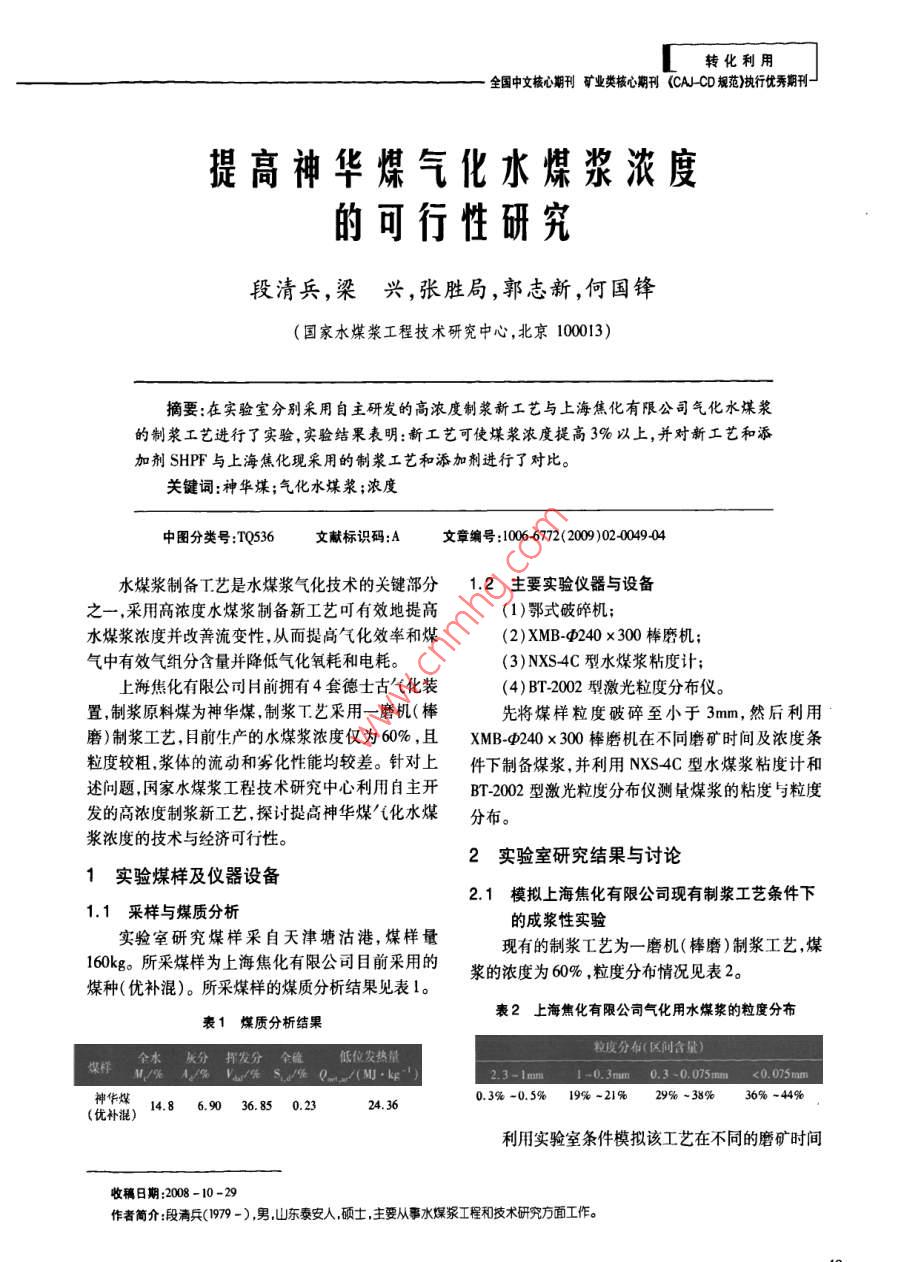 提高神華煤氣化水煤漿濃度的可行性研究