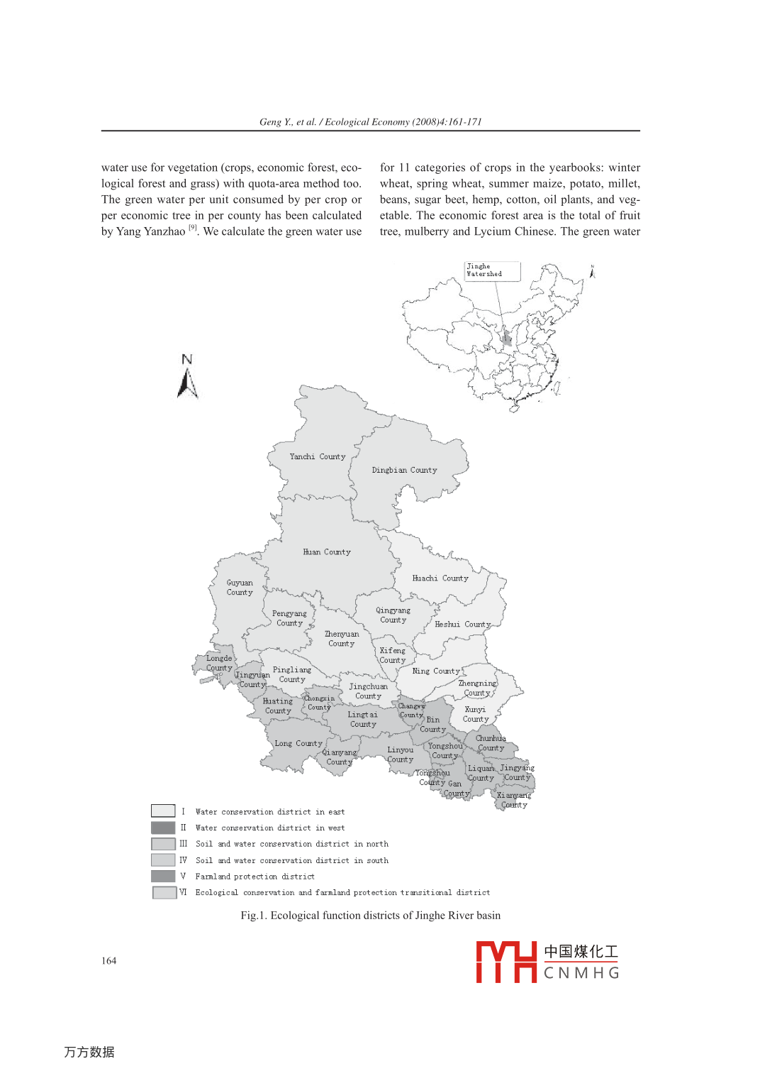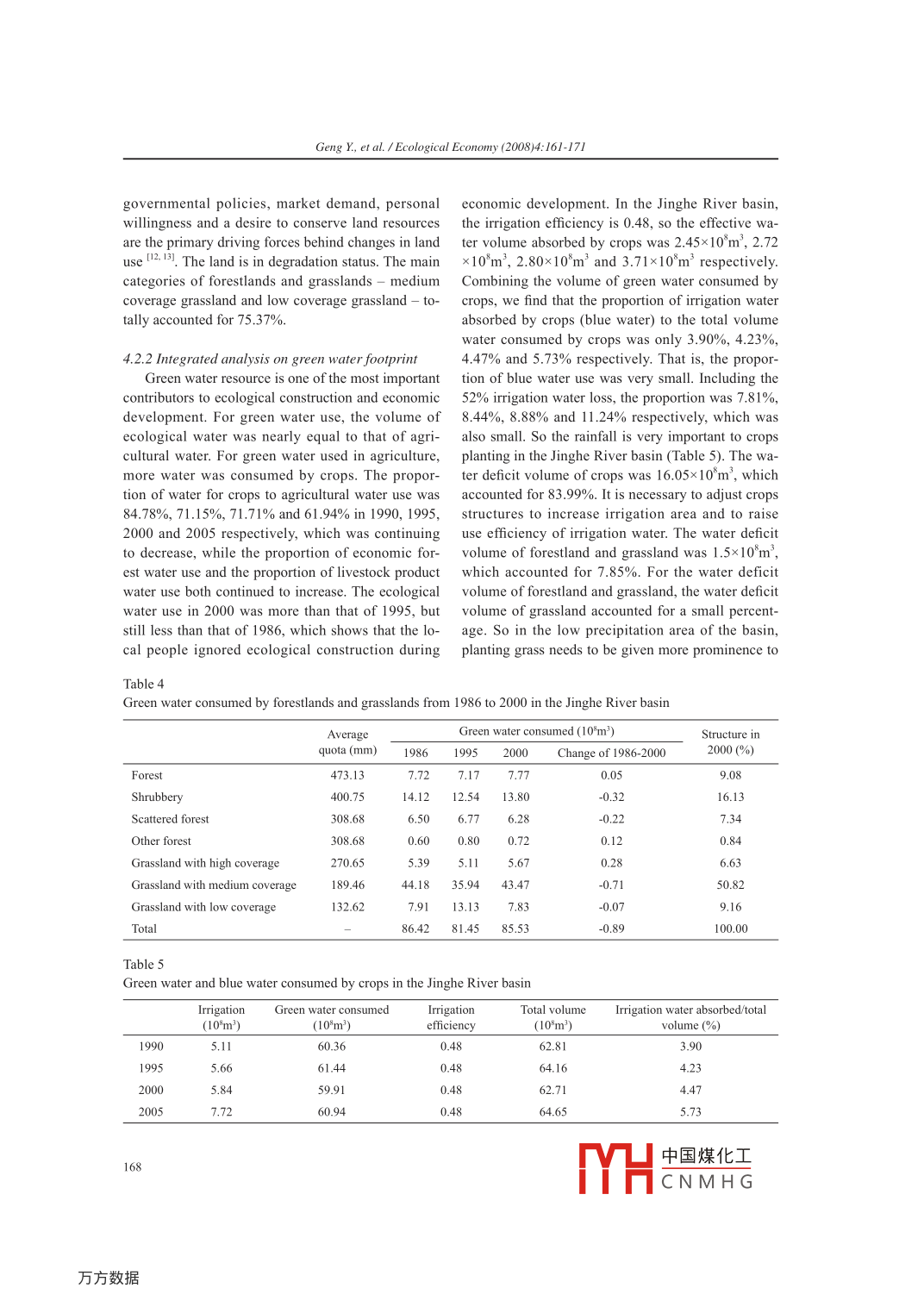 Ecological Economy (2008)4:161-171) Empirical StudyA dynamic analysis of water footprint of Jinghe River basinGeng Yanhui 1.2, Min Qingwen 1 *, Cheng Shengkui,Wan Xin 3,Yang Yanzhao'1. Institute of Geographic Sciences and Natural Resources Research, Chinese Academy of Sciences, Beijing 100101, P. R. China2. Graduate School, Chinese Academy of Sciences, Beijing 100039, P. R. China3. Lanzhou Climate Center; Lanzhou 730020, P. R. ChinaAbstract: Water footprint in a region is defined as the volume of water needed for the production of goods andservices consumed by the local people. Ecosystem services are a kind of important services, so ecological wateruse is one necessary component in water footprint Water footprint is divided into green water footprint and bluewater footprint but the former one is often ignored. In this paper water footprint includes blue water needed by ag-ricultural irigation, industrial and domestic water demand, and green water needed by crops, economic forests,livestock products, forestlands and grasslands. The study calculates the footprint of the Jinghe River basin in 1990,1995, 2000 and 2005 with quarto methods. Results of research show that water footprints reached 164.1x10*m',175.69x 10*m2' and 178.45x10*m' respectively in 1990, 1995 and 2000 including that of ecological water use, butreached 77.68x10'm', 94.24x10'm',, 92.92x10'm' and I11.36x10*m2 respectively excluding that of ecological wateruse. Green water footprint is much more than blue water footprint; thereby; green water plays an important role ineconomic development and ecological construction. The dynamic change of water footprints shows that blue wateruse increases rapidly and that the ecological water use is occupied by economic and domestic water use. The changealso shows that water use is transferred from primary industry to secondary industry. In primary industry, it is trans-ferred from crops farming to forestry and animal agriculture. The factors impelling the change include developmentanticipation on economy, government policies, redjustment of the industrial structure, population growth, the raiseof urbanization level, and structural change of consumption, low level of water-saving and poor ability of waste wa-ter treatment. With blue water use per unit, green water use per unit, blue water use structure and green water usestructure, we analyzed the difference of the six ecological function districts of the Jinghe River basin. Future ecologi-cal construction may infuence on blue water use of District V and District VI at middle and lower reaches. At lastsome suggestions cre given for effective water resource use.Keywords: Water footprint; Blue water; Green water; Dynamic change; Inftuencing factors; Jinghe River basin1. Introductiondirect use of rainfall and soil water originating frominfiltrated rainwater. It is useful to build comprehen-Water availability in arid and semi-arid areas may sive databases on water use and water deficit, and webe the main constraint to poverty alleviation, public call the database water footprint. In 2002, the waterhealth, economic development and environmental footprint concept was introduced. The water footprintimprovement ". In such areas, freshwater supply is of an area is defined as the total volume of freshwaterthreatened by local consumption patterns resultingthat is used to produce goods and service consumedfrom both agricultural and urban use (21. Agriculturalby the people of the area. Not all goods and servicesuse consumes the largest proportion of freshwater consumed in one particular area are produced in theneeds”. At the same time urban freshwater use is same area, and the water footprint can be divided intoincreasing in magnitude and complexity 4. On theof two parts: uses of local and outside water resourcesother hand, more researches are focused more on the. The water footprint of an area is a water use in-use of surface water and ground water than on the dicator related to goods and service consumption andconsumption style. Apart from the water requirement,Received Aug.24, 2007; Accepted Nov. 28, 2007it can show that the regional consumption would in-* Corresponding author. E-mail address: minqw@igsnrr.ac.cnfluence natural water resource and environment. TheAutor: Geng Yanhui (1977-), female, PhD candidate, special-form and development of the water footprint conceptized in resource ecology and regional development.is an analogue of the ecological footprint concept.中國煤化工161MHCNMH G.Geng Y, et al. / Ecological Economy (2008)4:161-171Whereas the ecological footprint denotes the area for agricultural use (mainly used by crops, economic(hm) needed to sustain a population, the water foot-print represents the water volume (cubic meters per mestic use (rural and urban domestic water use) andyear) consumed. Water footprint can be divided into ecological use (mainly used by forestland and grass-blue water footprint and green water footprint.“Greenland) in 1990, 1995, 2000 and 2005 respectively. Thewater" and“blue water”are two different types of ecological water use in 2005 was not calculated forwater source.“Green water use”is quantitatively area data of forestland and grassland in 2005 was notdefined in the current papers as the volume of water got. Data of forestland and grassland in 1990 was nottaken up by plants from the soil insofar it concerms got either, so we took data in 1986 as that in 1990.soil water originating from infiltrated rainwater.“Blue The purpose of this paper is to compare water usewater use”refers to the water taken up by plants from patterns in different times in the Jinghe River basinthe soil insofar it concerns infiltrated irrigation water in northwestern China through calculation of water7. More generally, we can take water use originating footprint. At the same time, we specially ask two re-from rainwater as“green water”, and take water use lated questions for comparison: (1) Which social andorigina